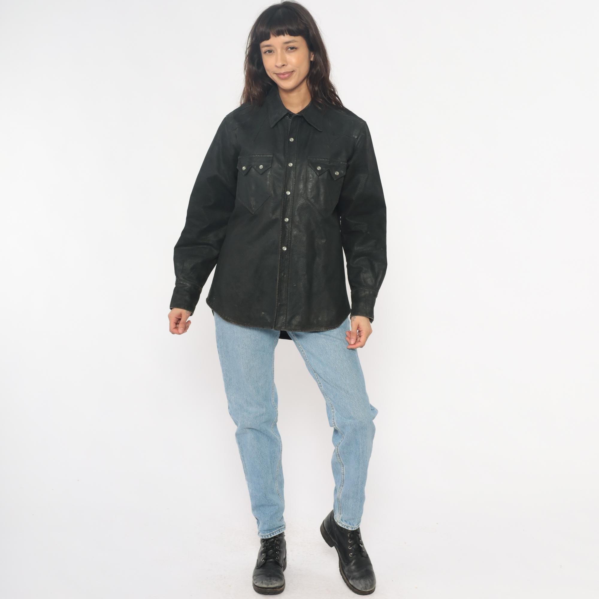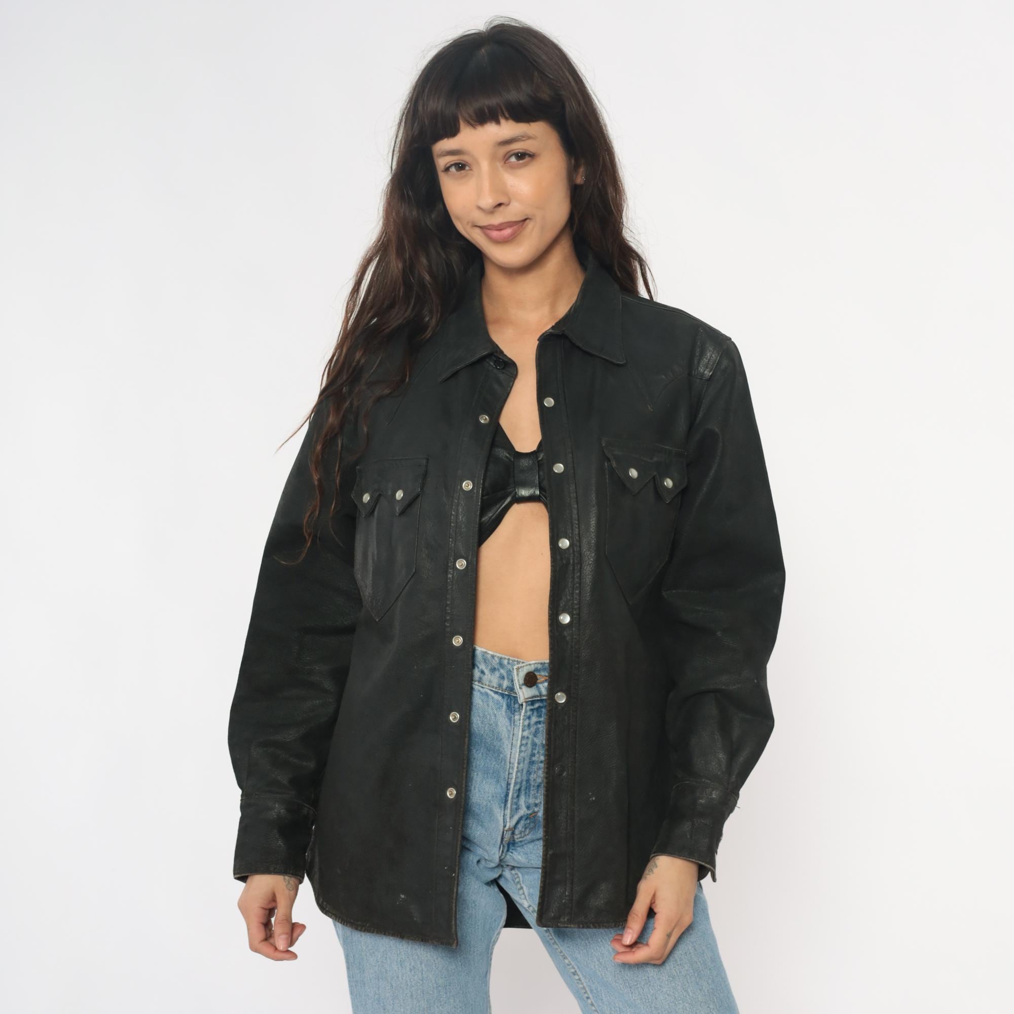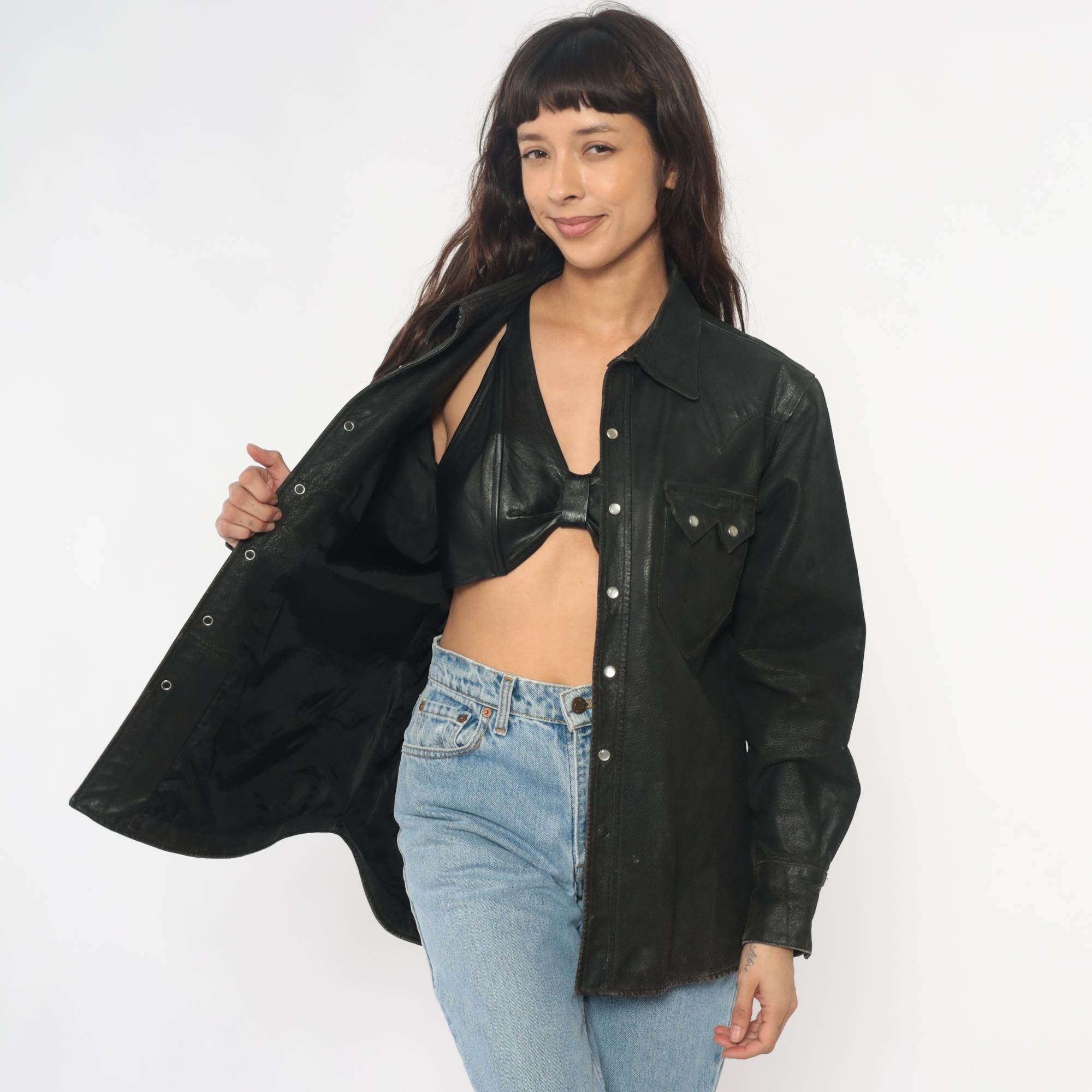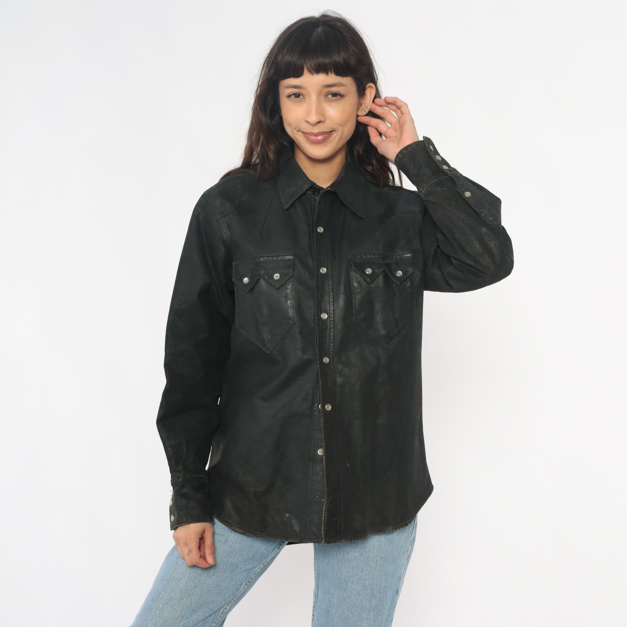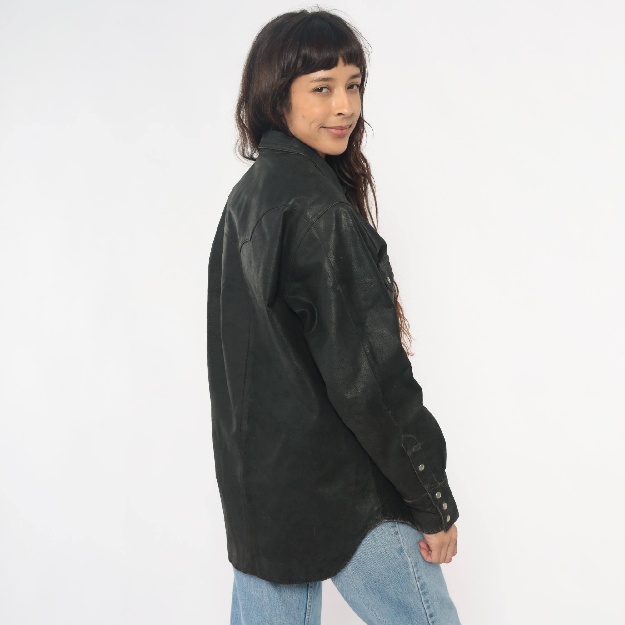 90s black leather Western shirt from neyries clothing with pointed yoke detailing across shoulders and back, snap front closure with silver snaps. Two chest pockets with pointed flaps and snap closures, pointed collar, long sleeves with snap cuffs.