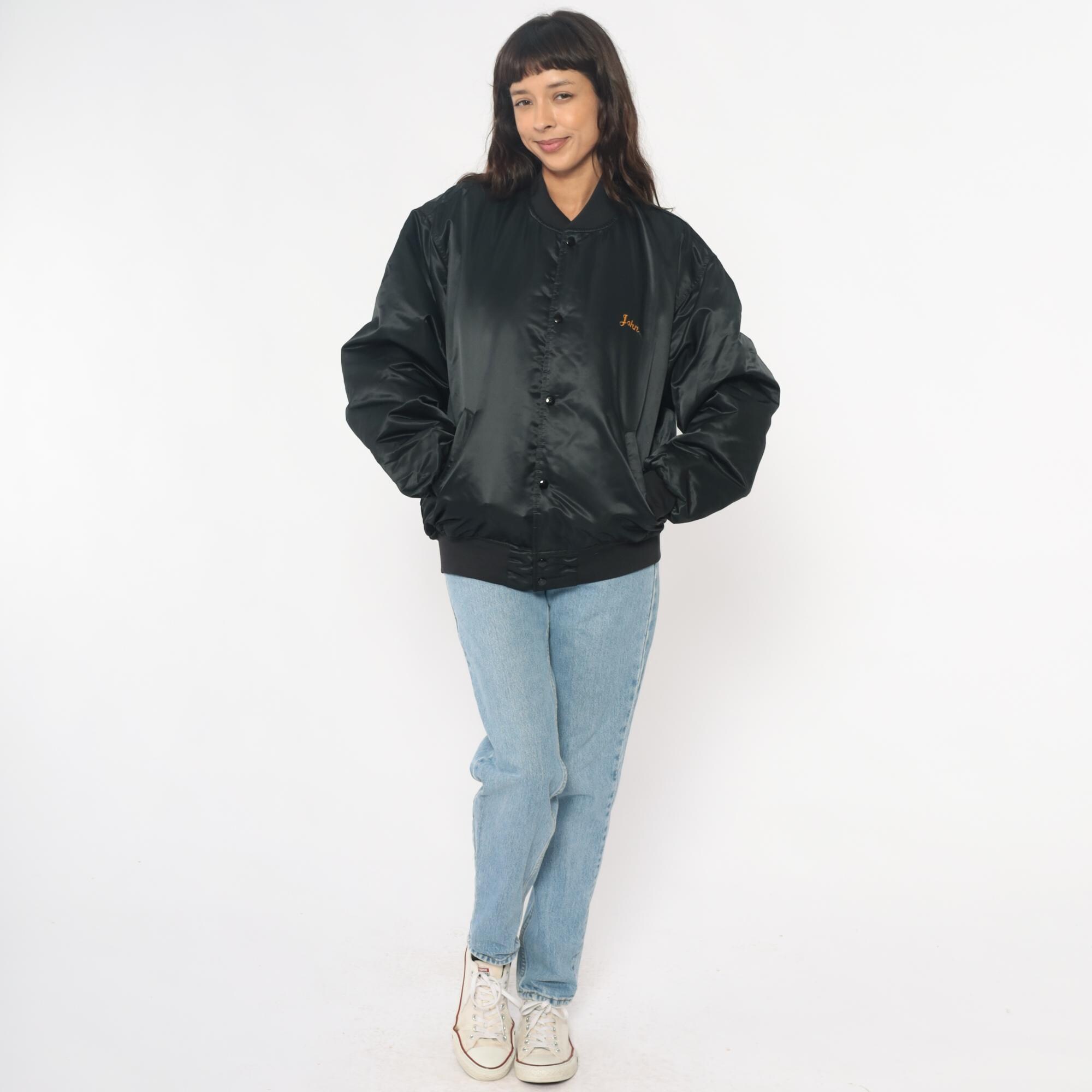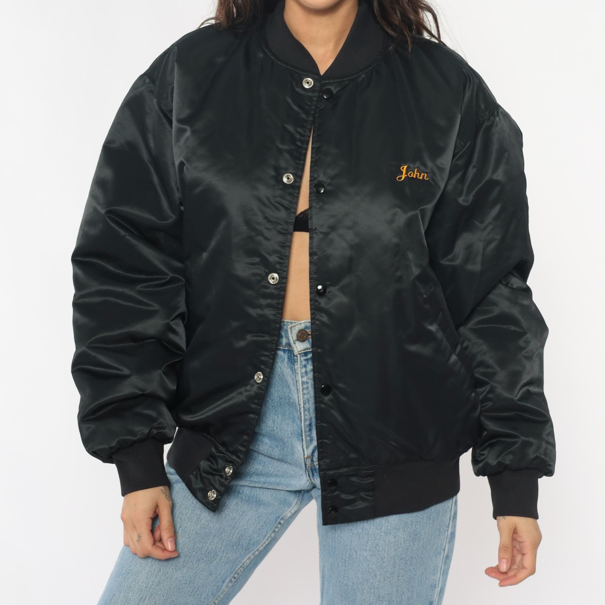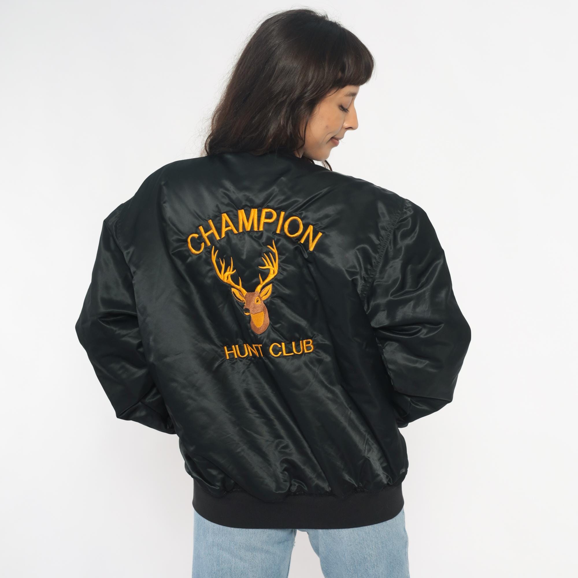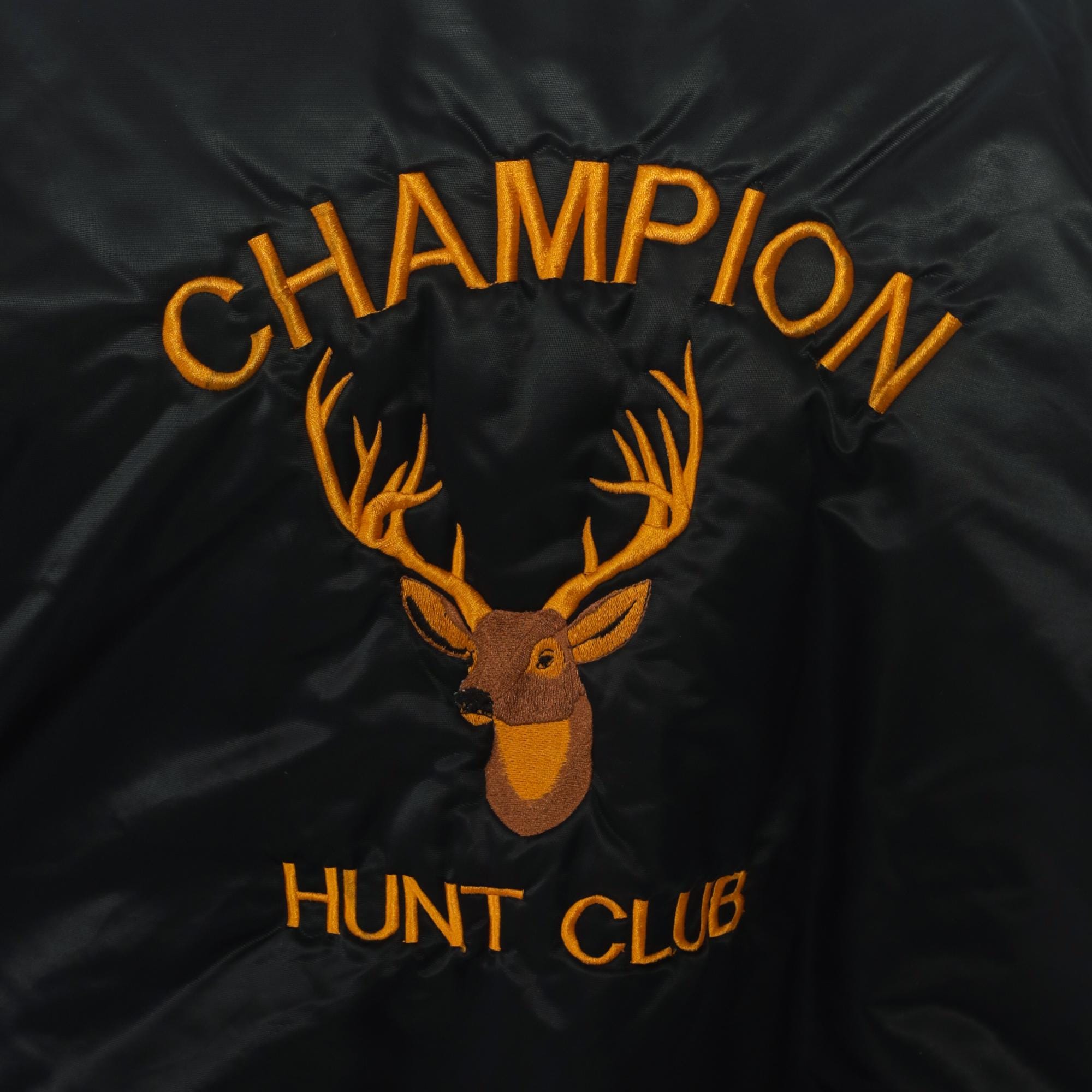 90s black satin bomber jacket from game with large embroidered "CHAMPION HUNT CLUB" and deer head design on back, "John" embroidered script on left chest in orange thread. Snap button closure down front, ribbed knit collar, cuffs, and waistband, side pockets.