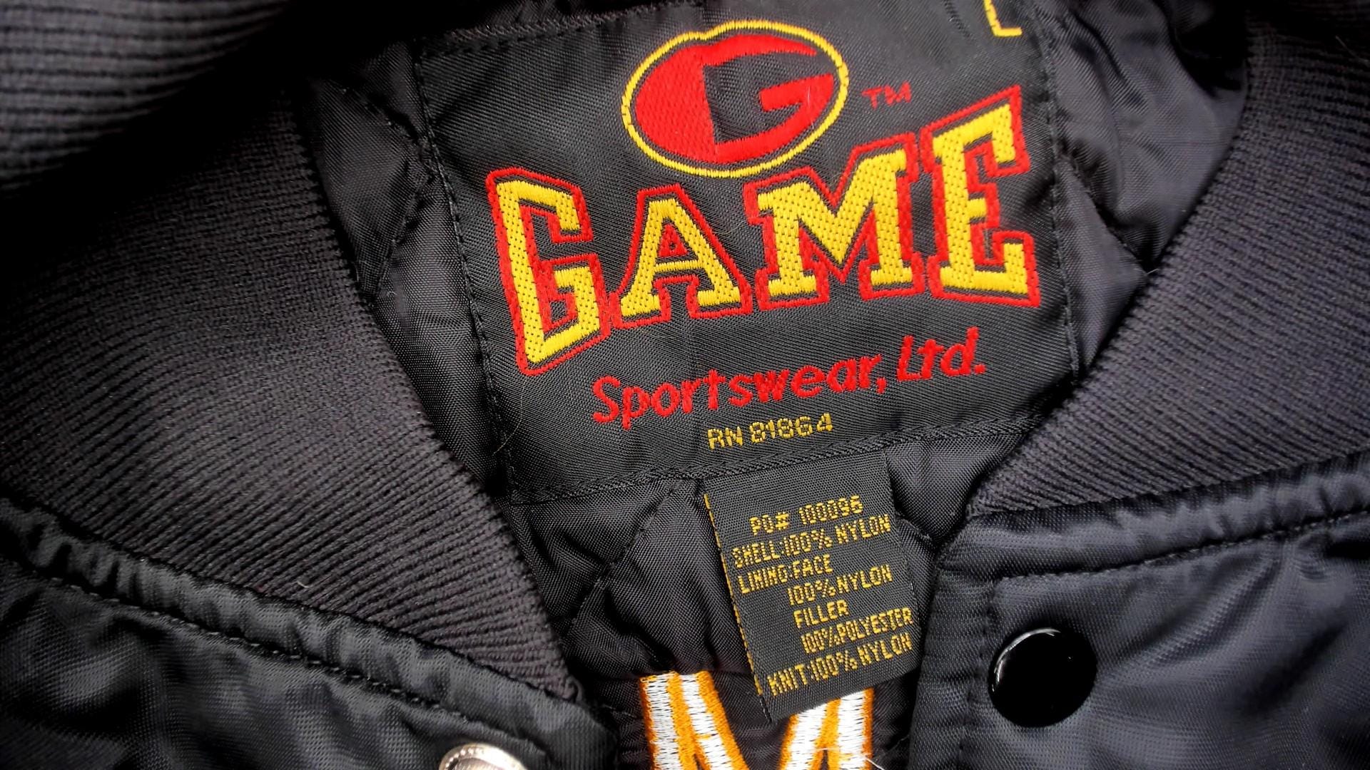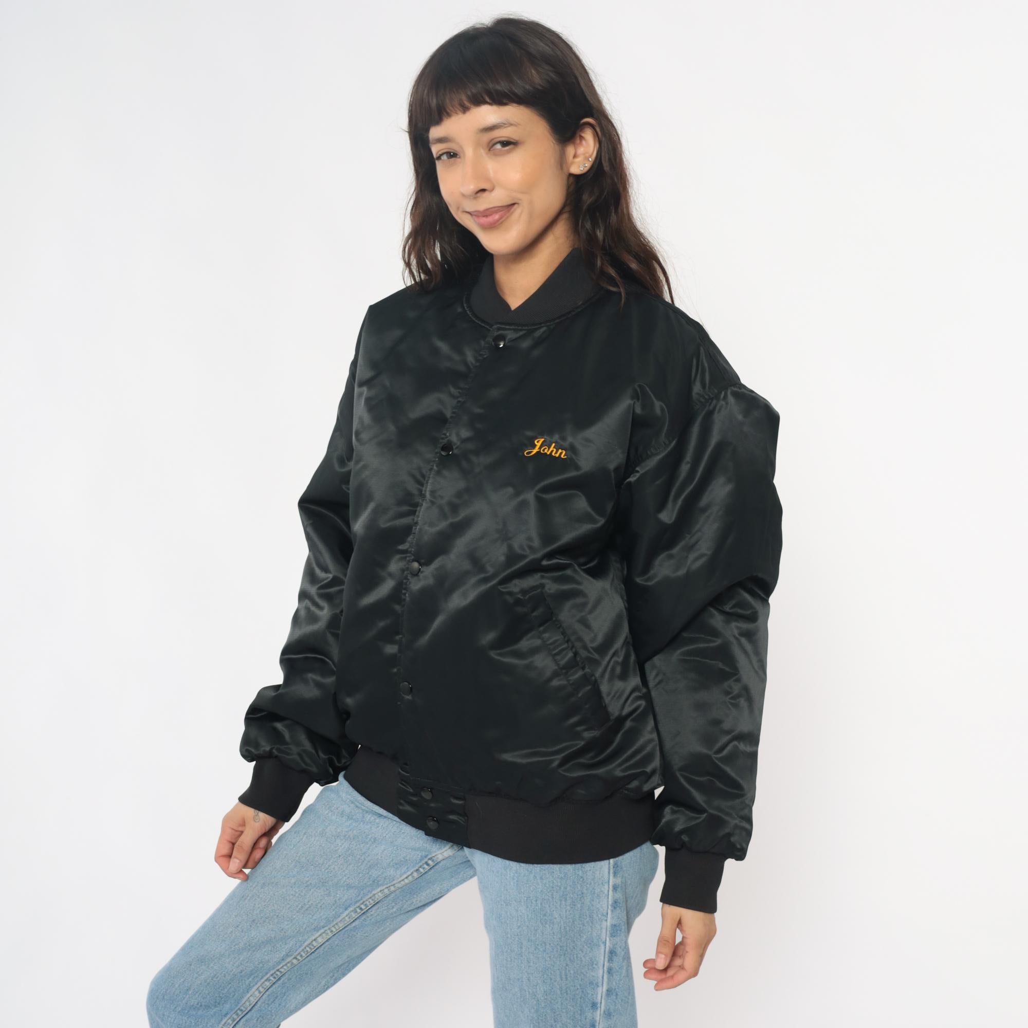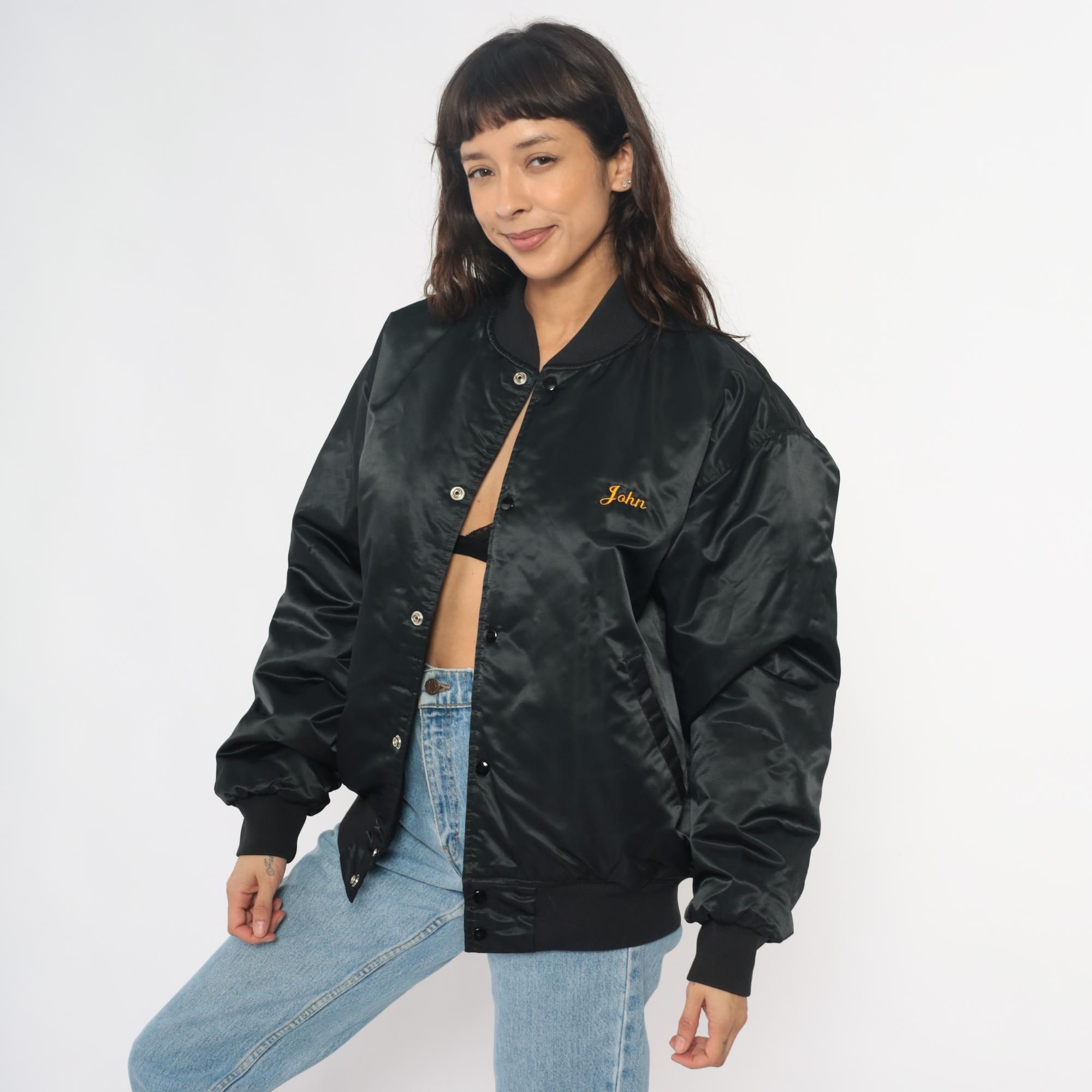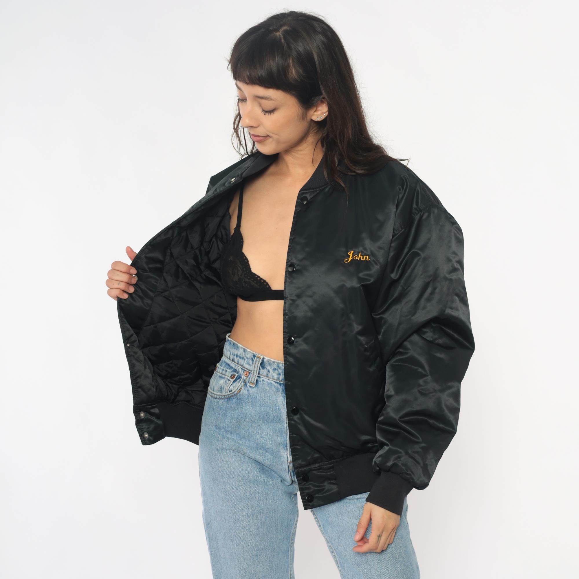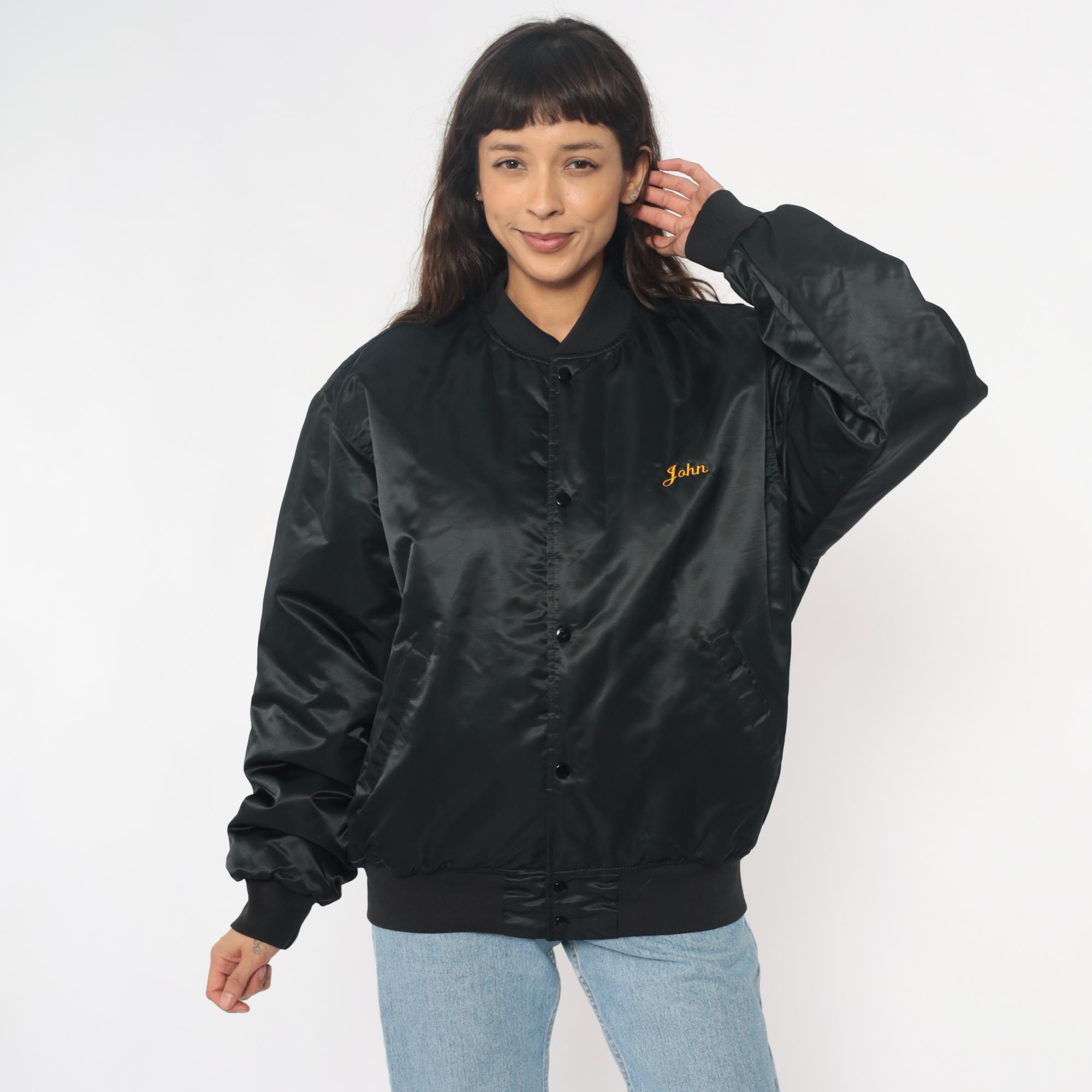 90s black satin bomber jacket from game with large embroidered "CHAMPION HUNT CLUB" and deer head design on back, "John" embroidered script on left chest in orange thread. Snap button closure down front, ribbed knit collar, cuffs, and waistband, side pockets.