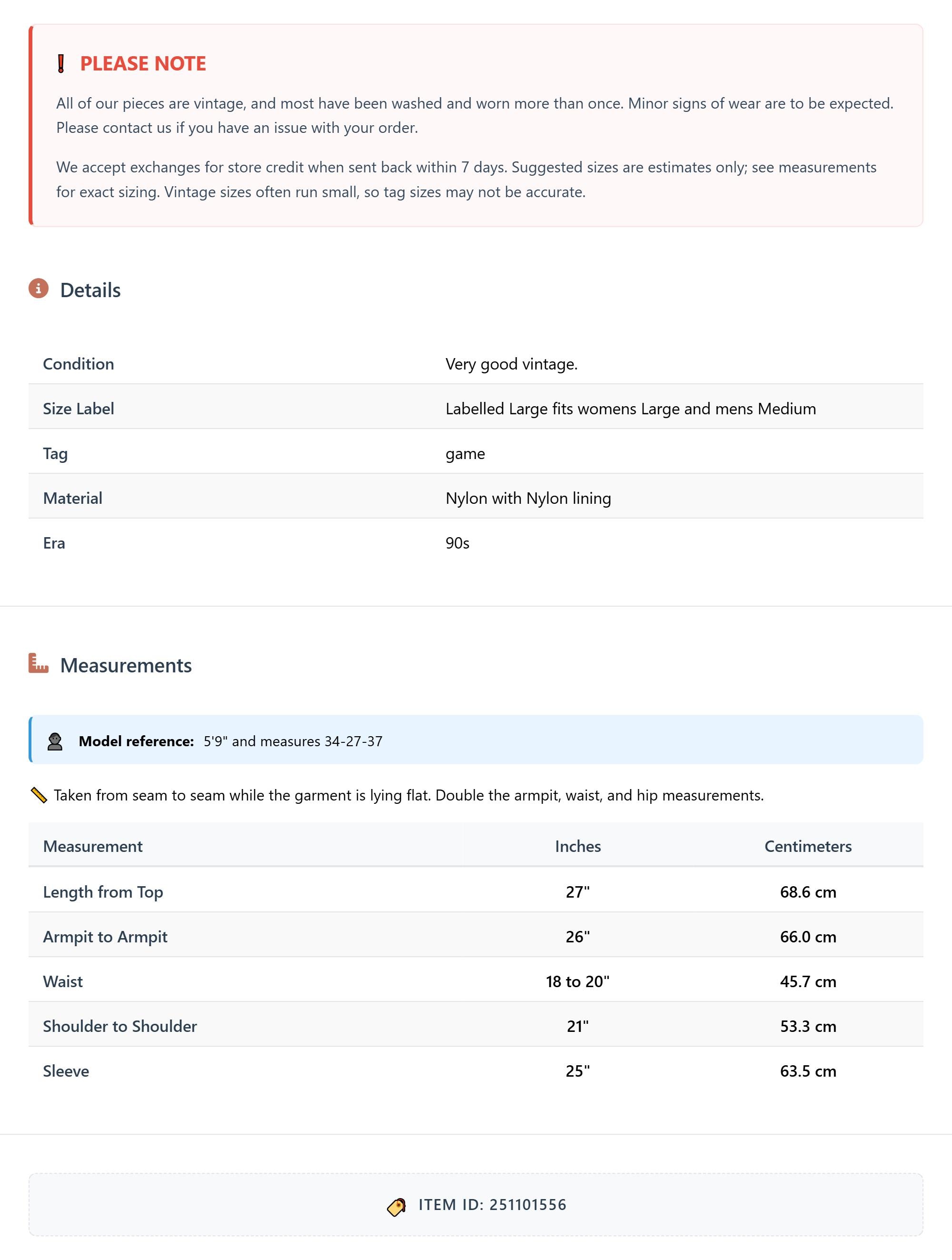 All of our pieces are vintage, and most have been washed and worn more than once. Minor signs of wear are to be expected. Please contact us if you have an issue with your order. We accept exchanges for store credit when sent back within 7 days.