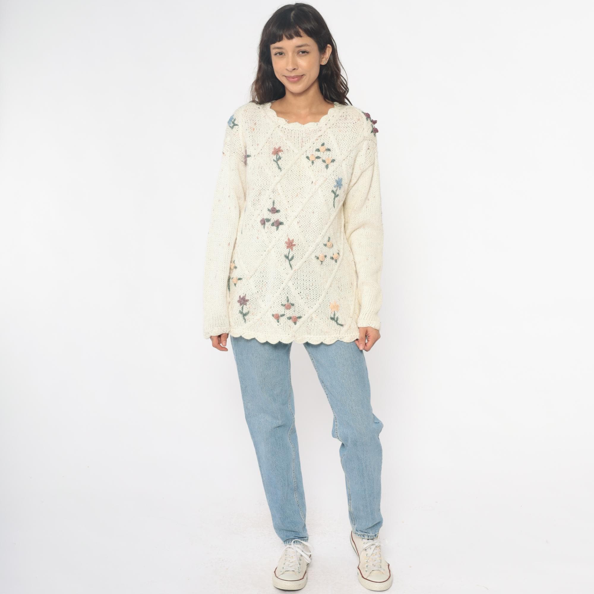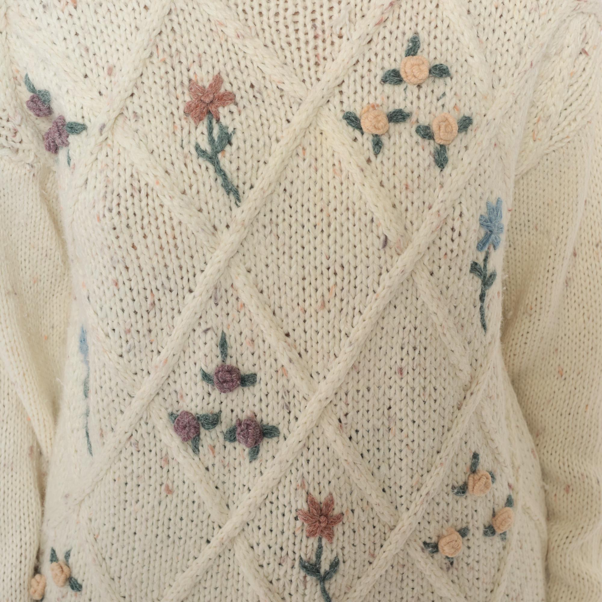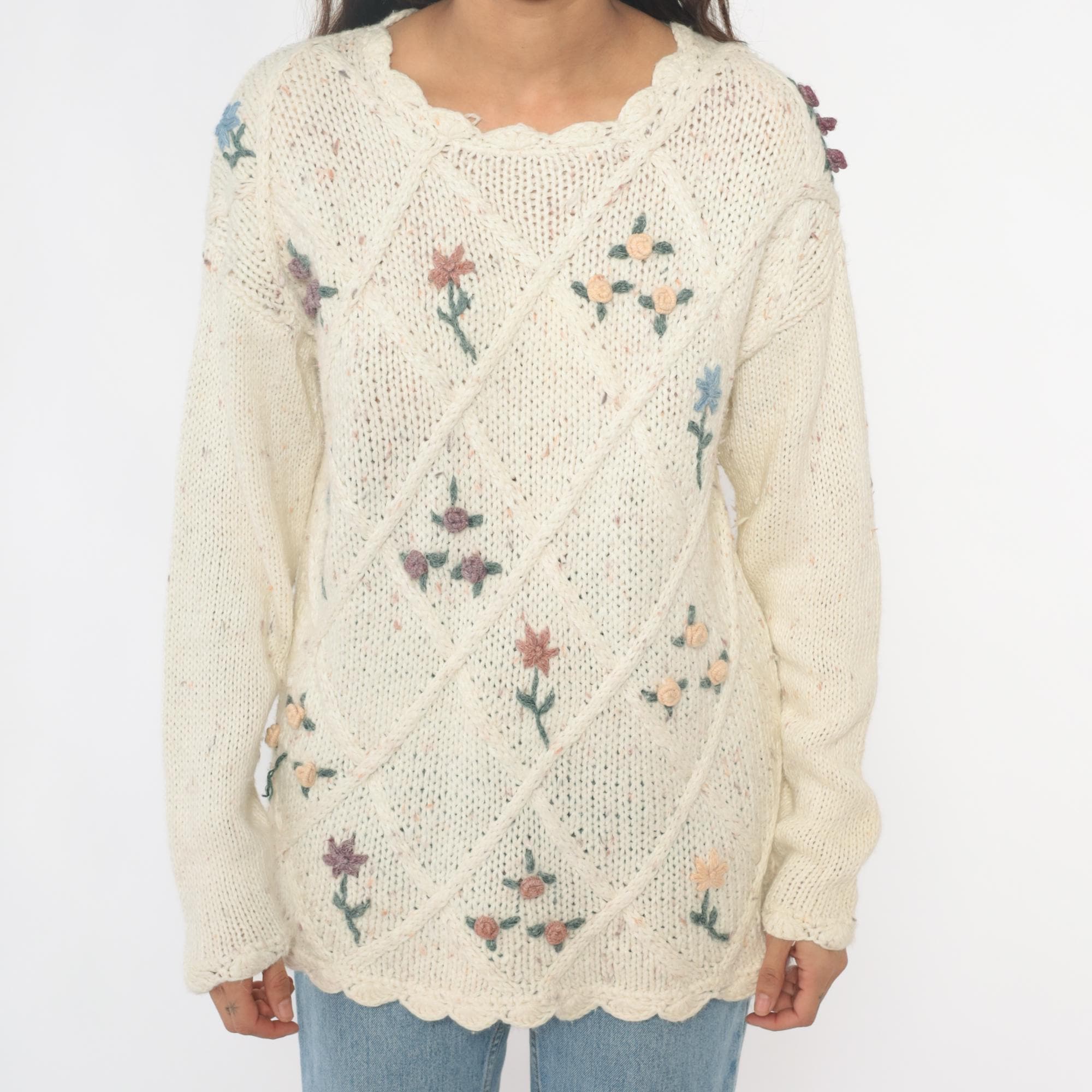 90s cream cable knit sweater from needles and yarn with embroidered floral details throughout. Purple, blue, and pink flowers scattered across the front, scalloped trim at neckline and hem.
