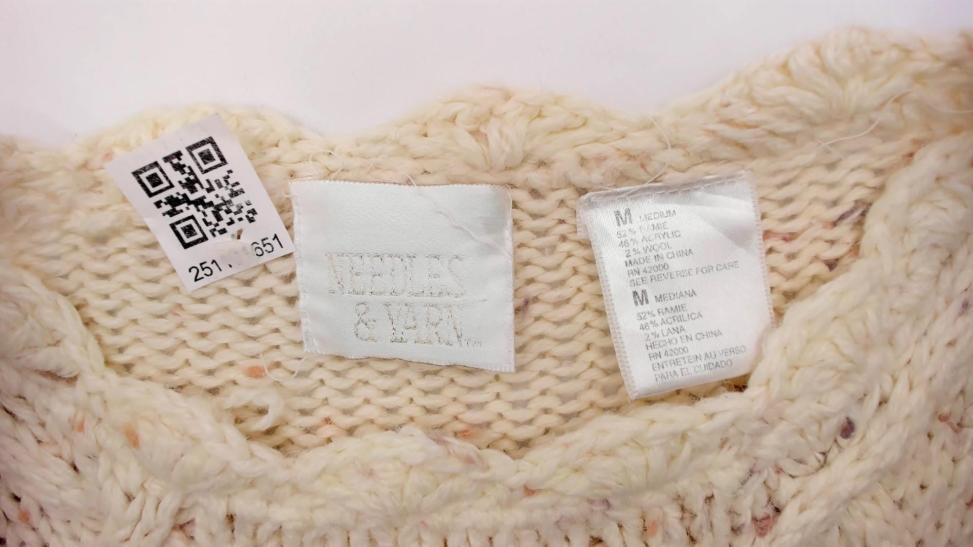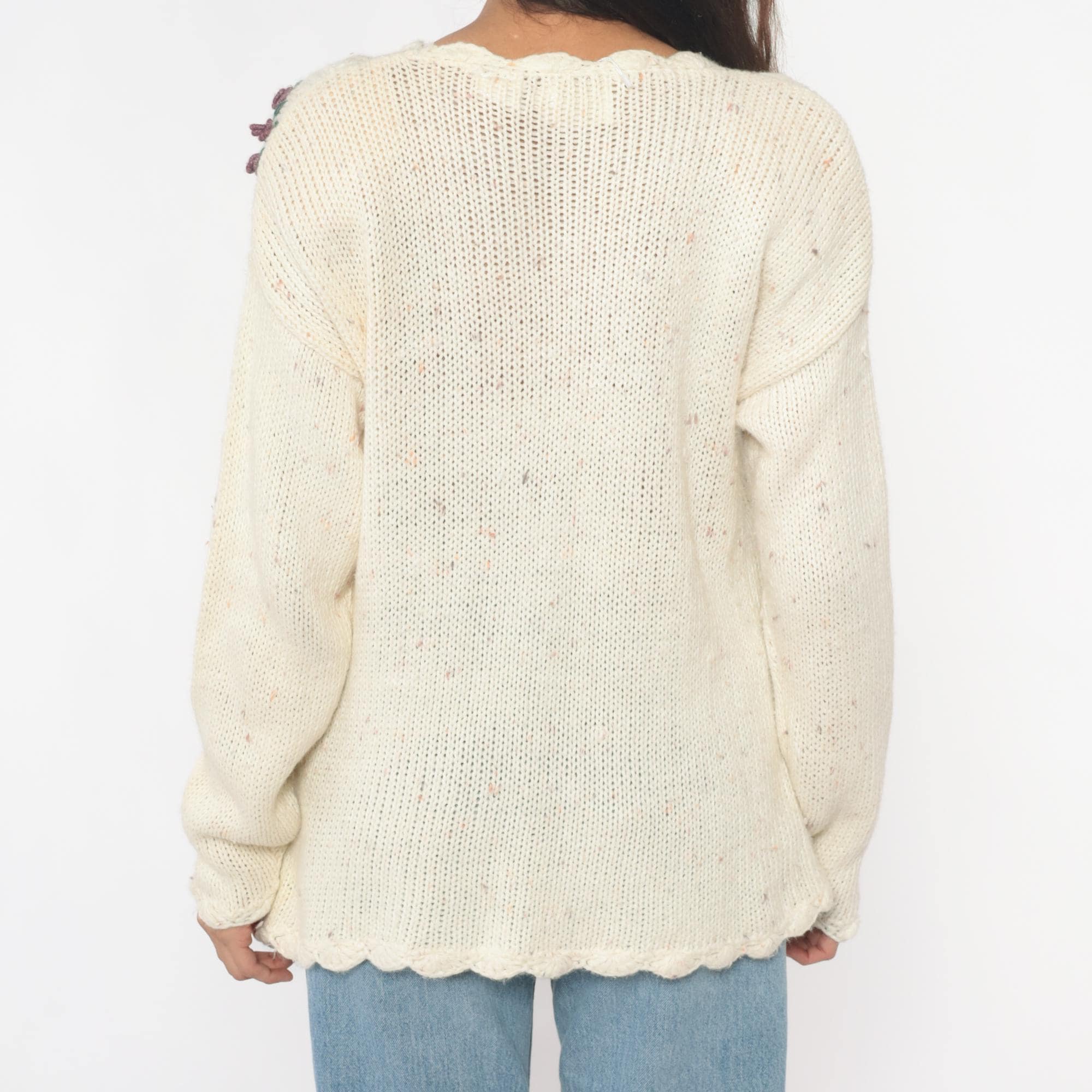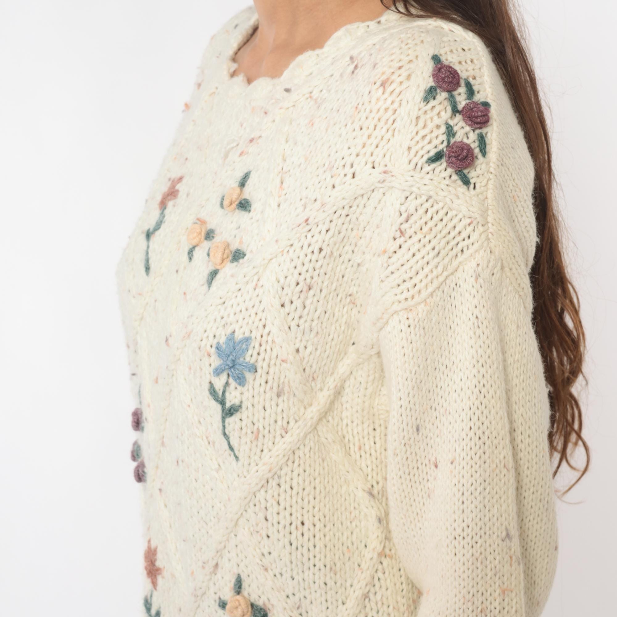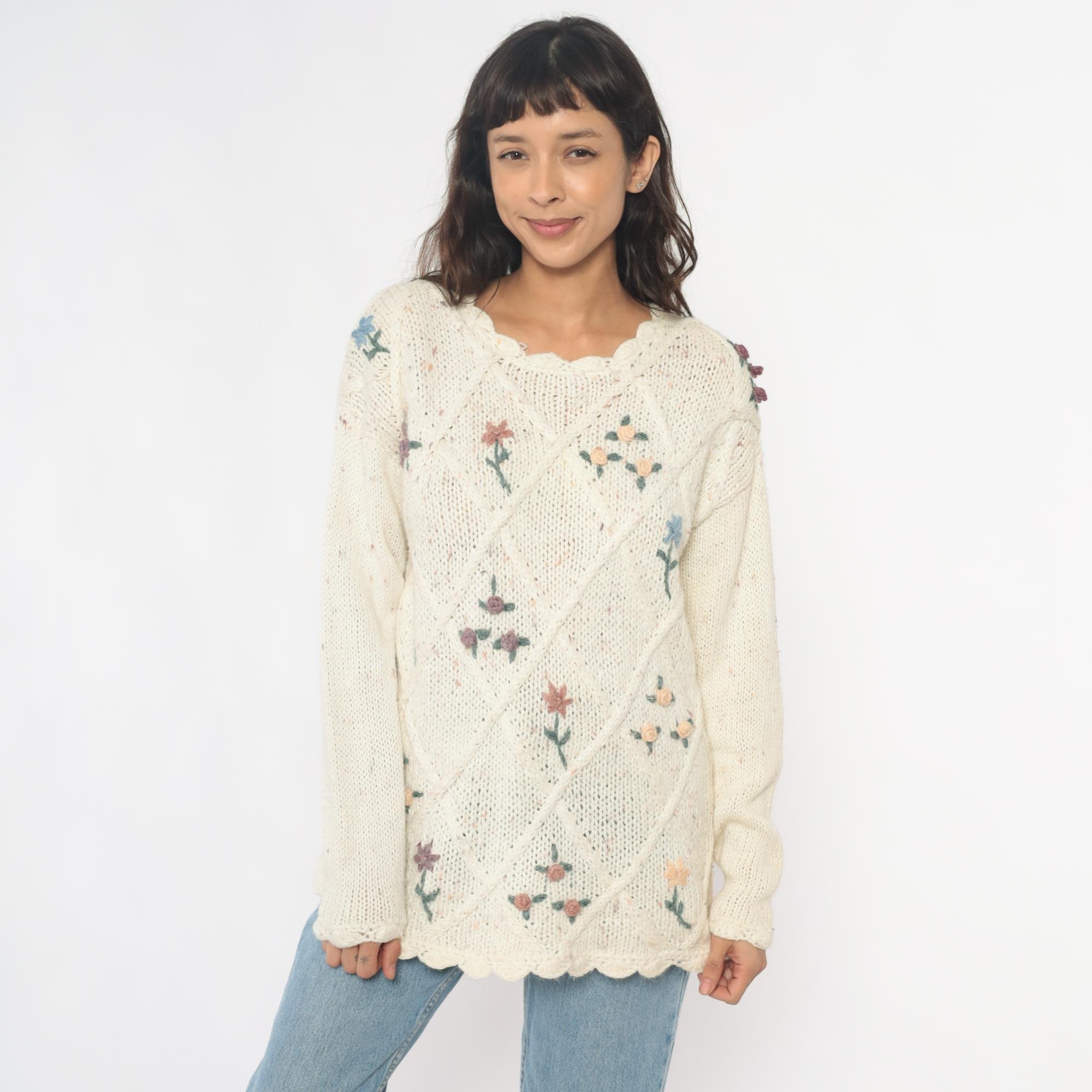 90s cream cable knit sweater from needles and yarn with embroidered floral details throughout. Purple, blue, and pink flowers scattered across the front, scalloped trim at neckline and hem.