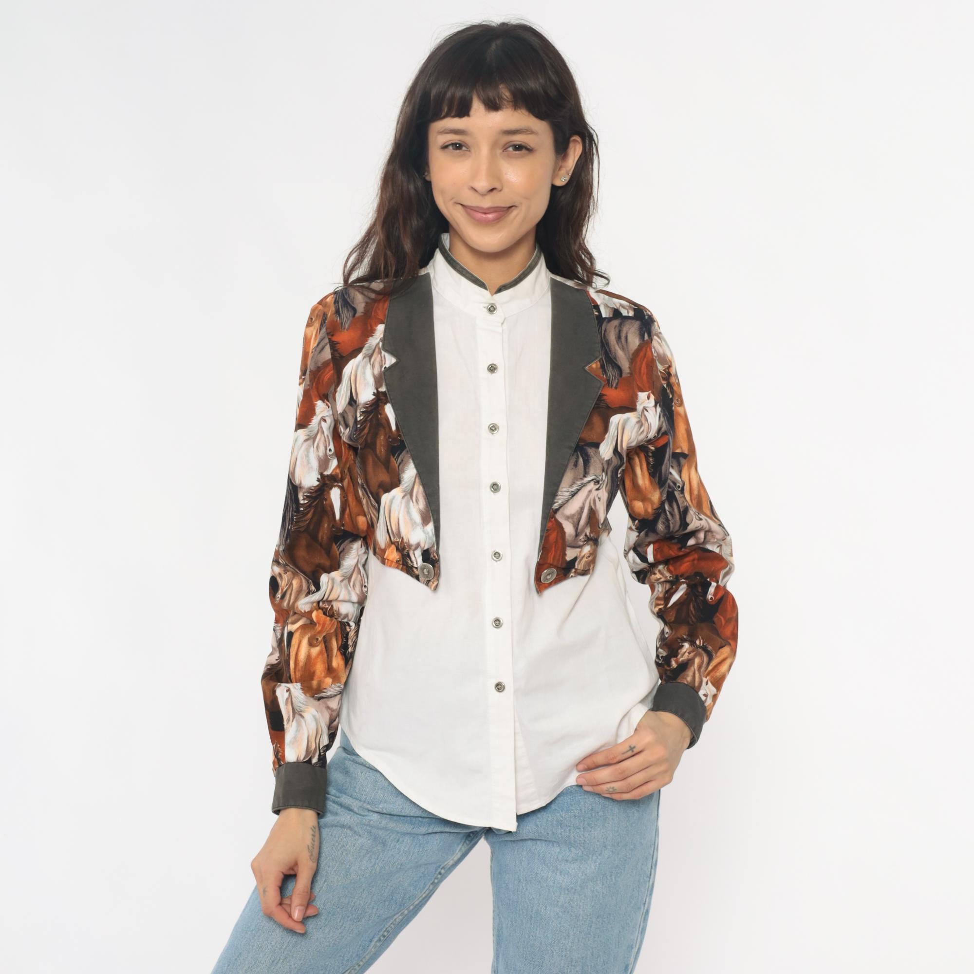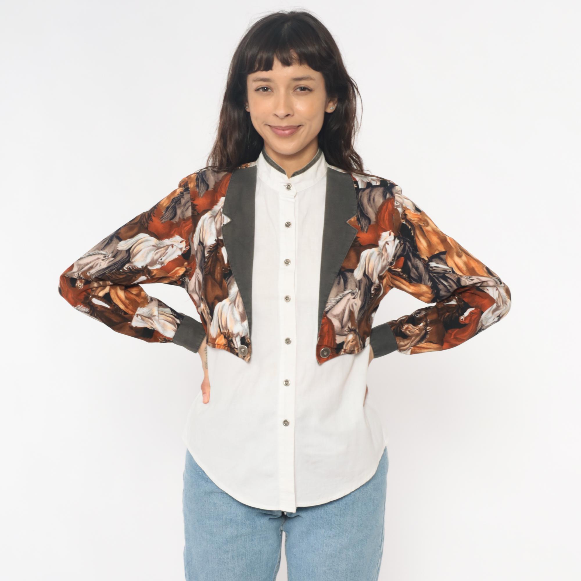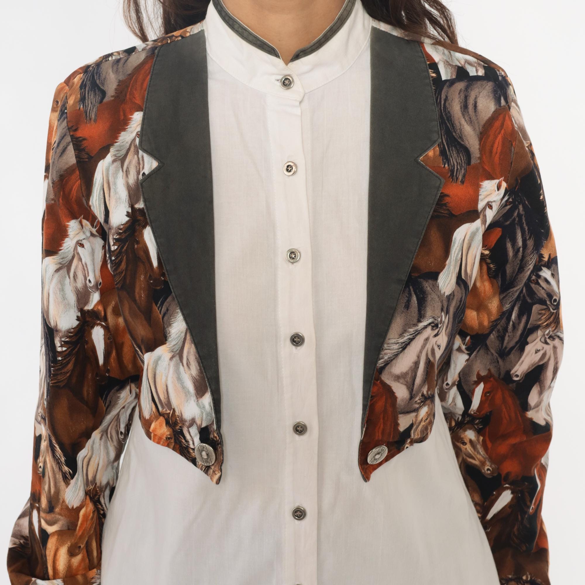 90s button-front shirt from roughrider with realistic horse print sleeves and yoke in brown, tan, black, and white. Solid white front panel, dark olive collar and cuffs. Long sleeves with button closure down the front.