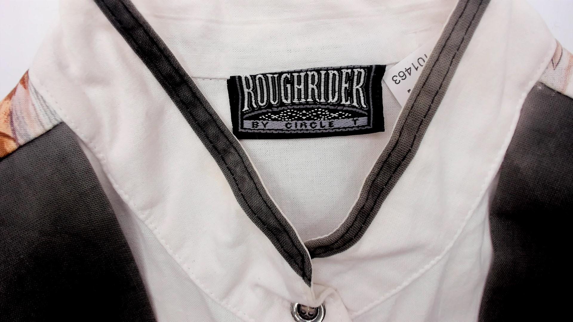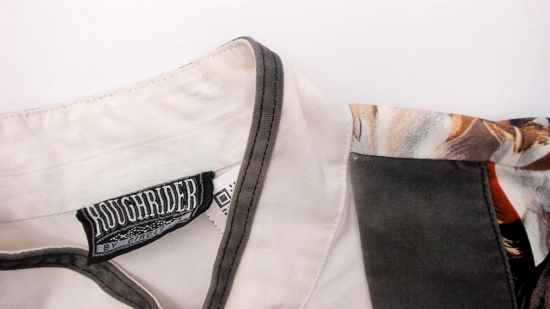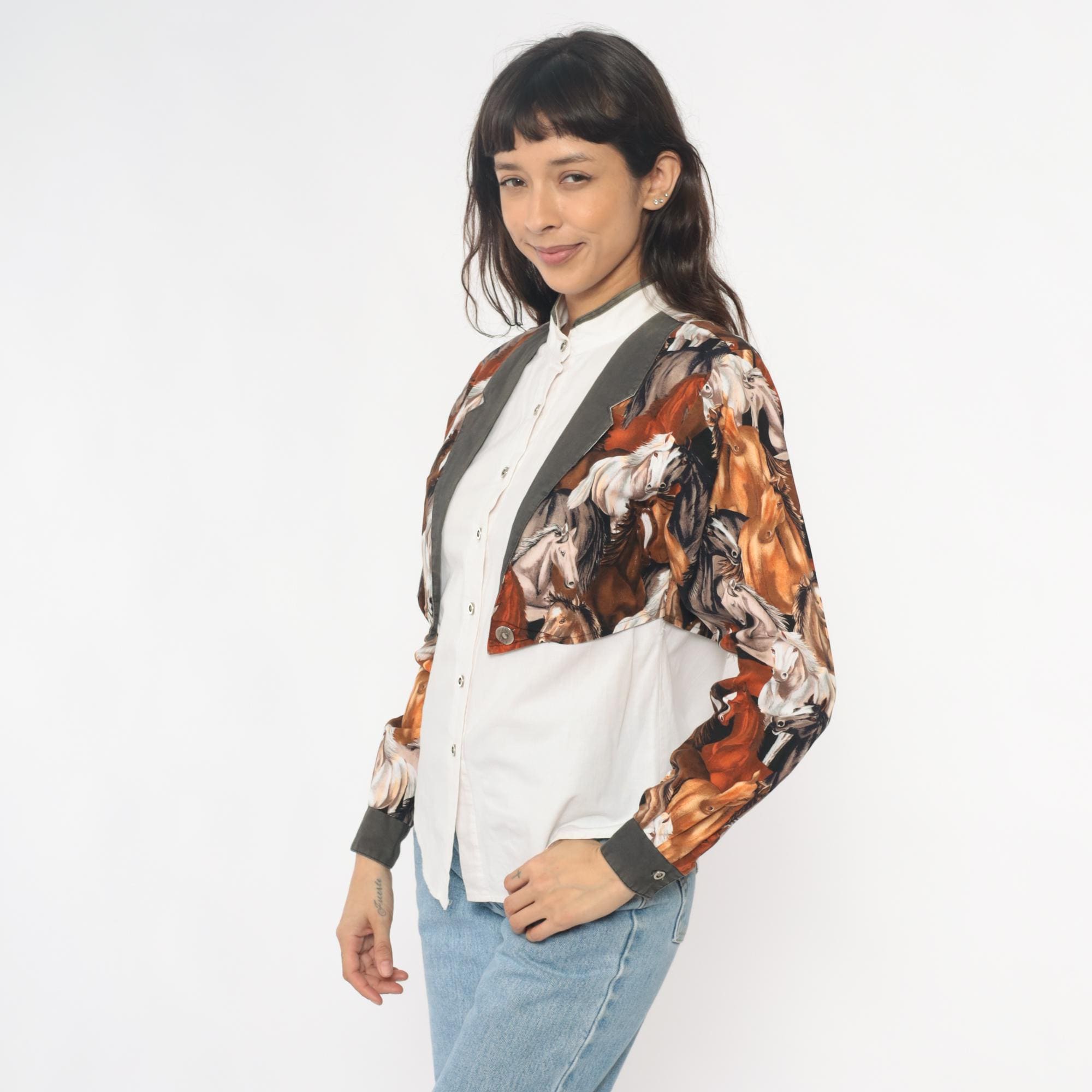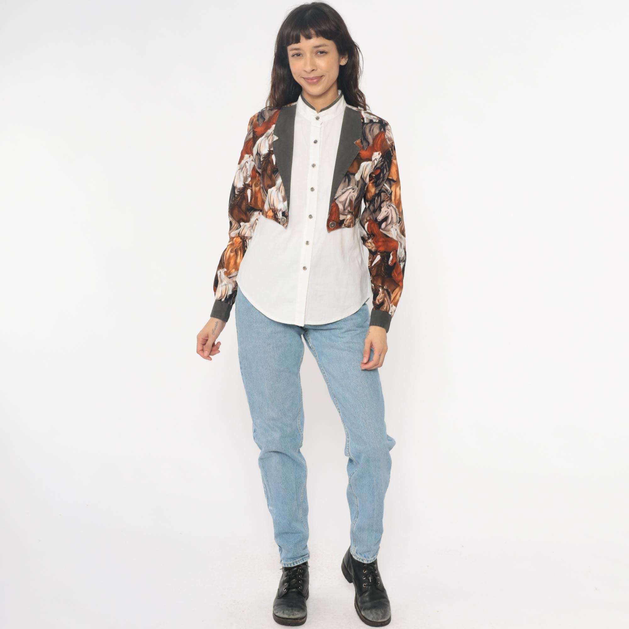 90s button-front shirt from roughrider with realistic horse print sleeves and yoke in brown, tan, black, and white. Solid white front panel, dark olive collar and cuffs. Long sleeves with button closure down the front.