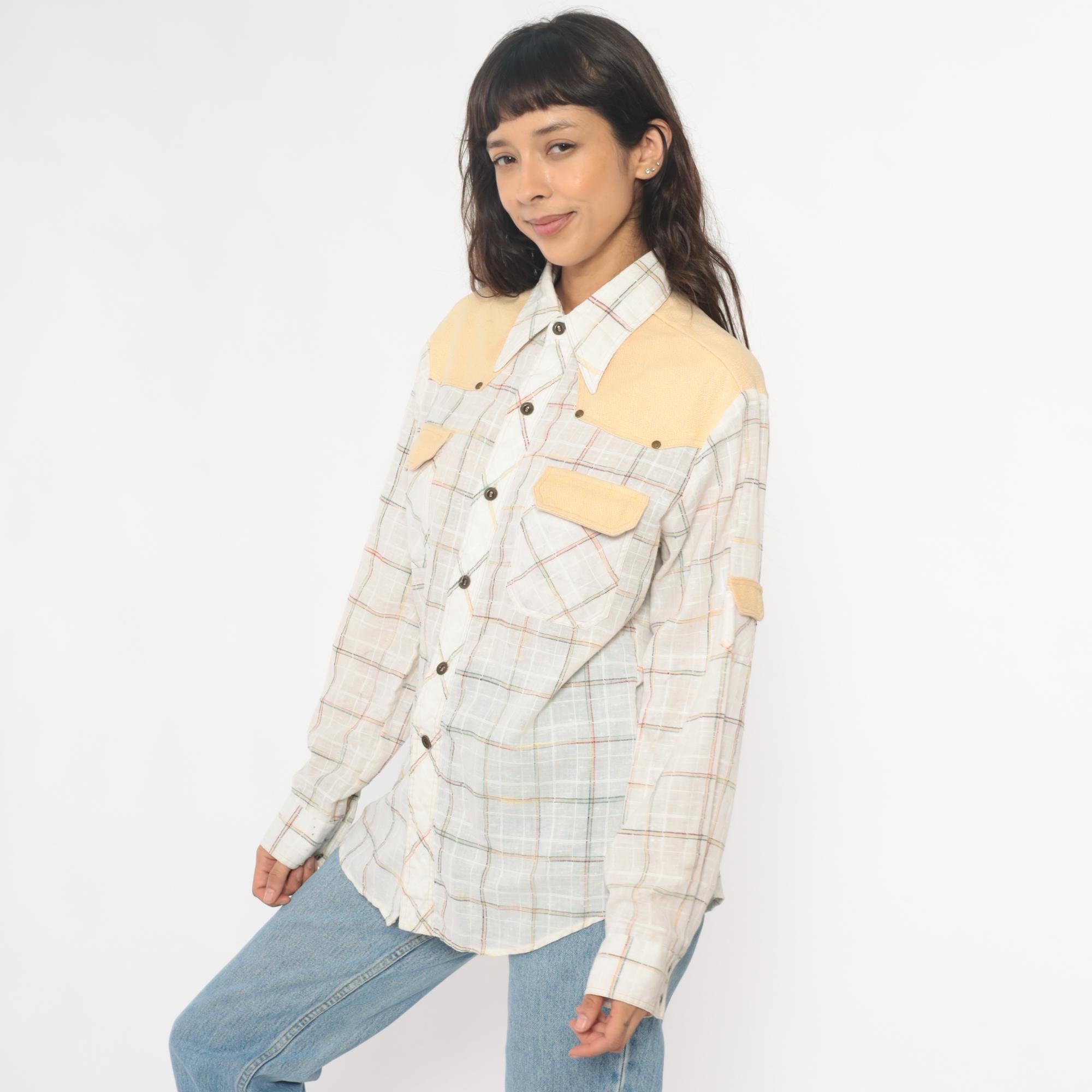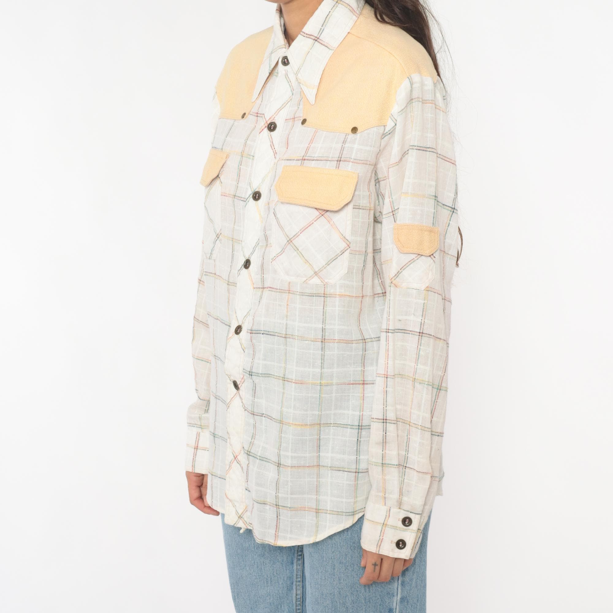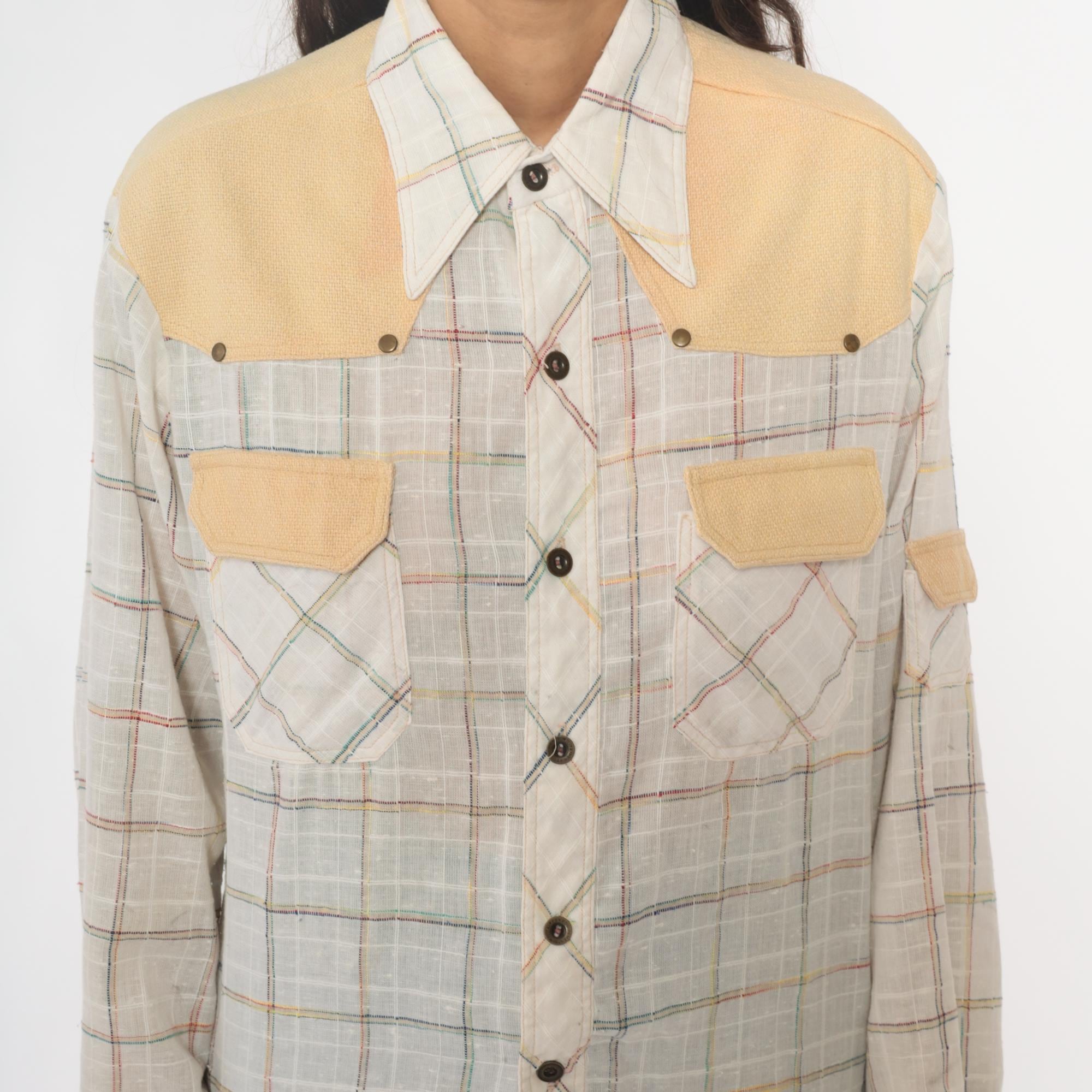 70s plaid shirt from kennington with solid peach yoke across shoulders, matching chest pocket flaps, and elbow patches. Cream base fabric with pastel plaid in pink, blue, yellow, and green lines. Pointed collar, button front closure, long sleeves with button cuffs, two chest pockets with button flaps.