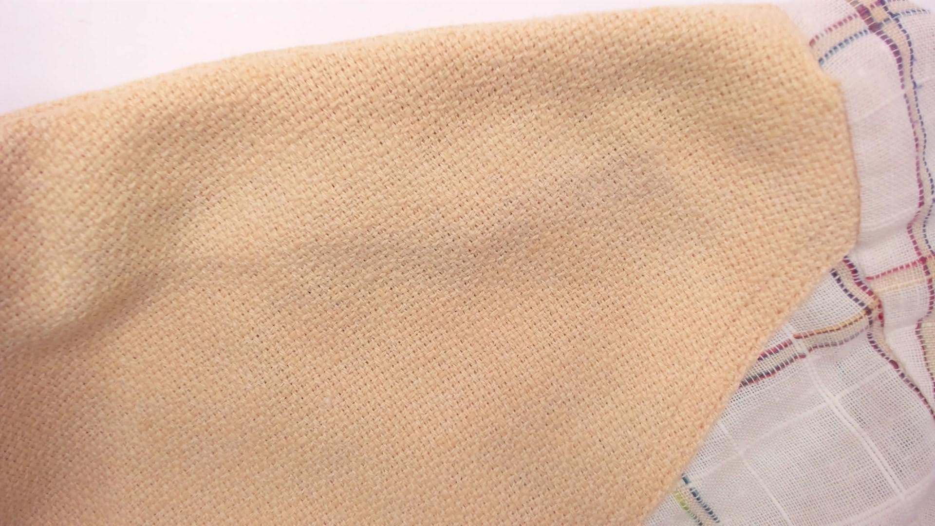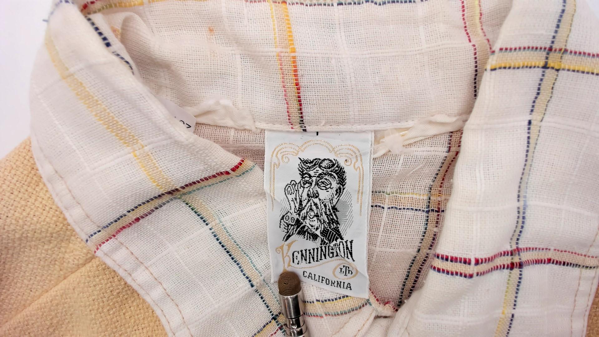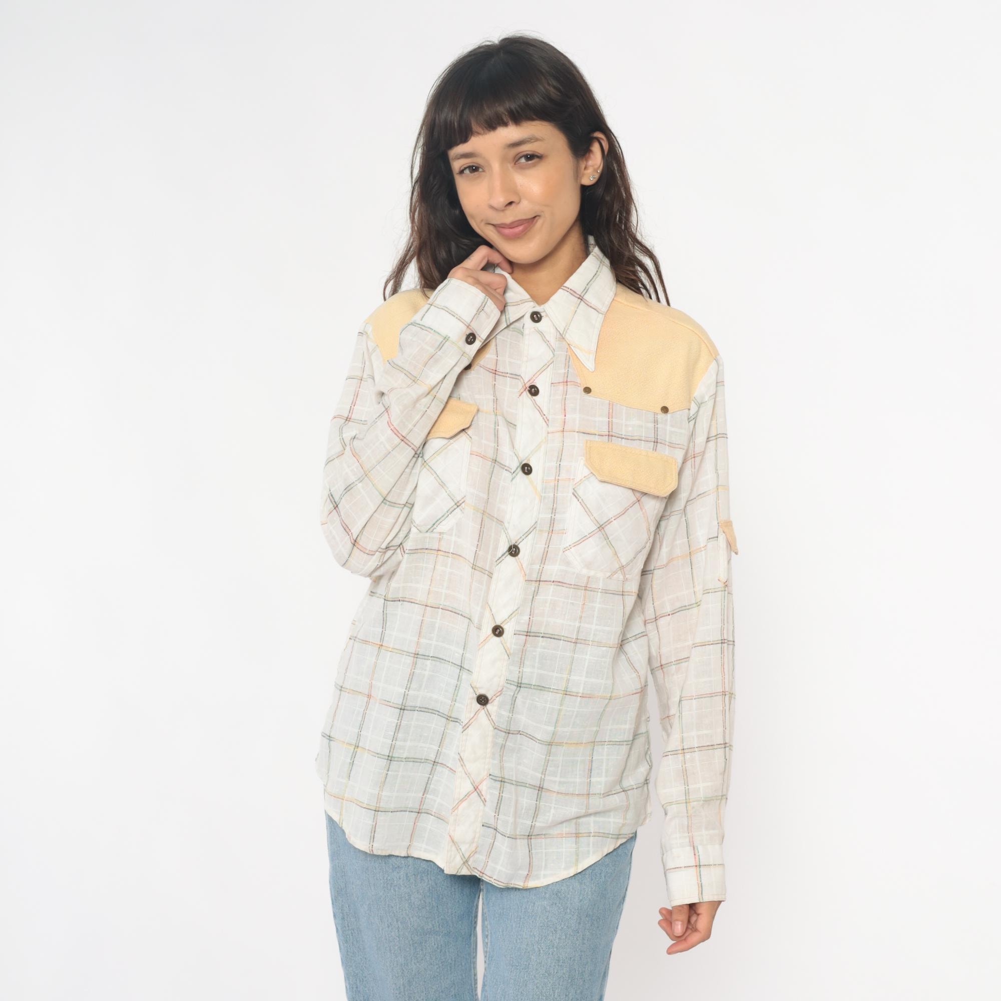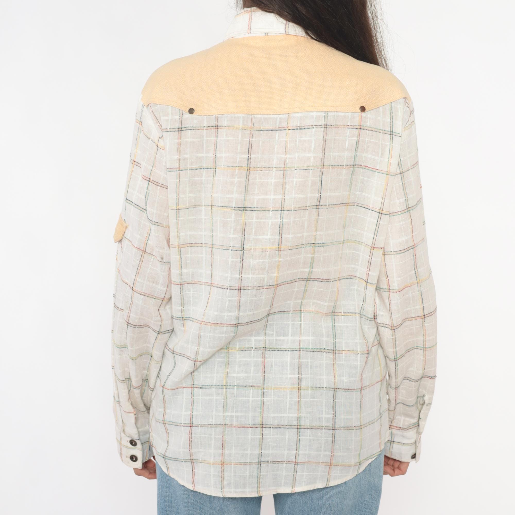 70s plaid shirt from kennington with solid peach yoke across shoulders, matching chest pocket flaps, and elbow patches. Cream base fabric with pastel plaid in pink, blue, yellow, and green lines. Pointed collar, button front closure, long sleeves with button cuffs, two chest pockets with button flaps.