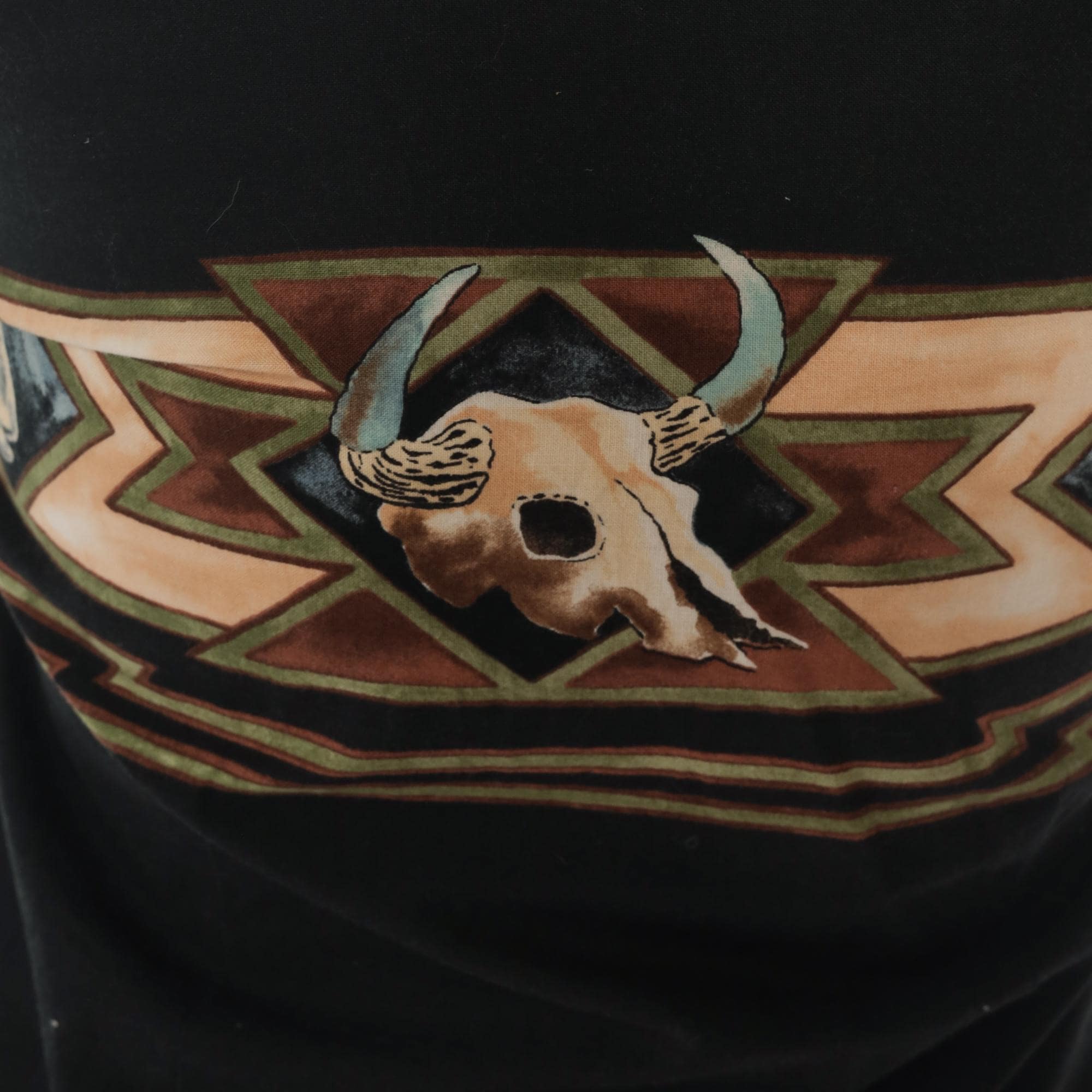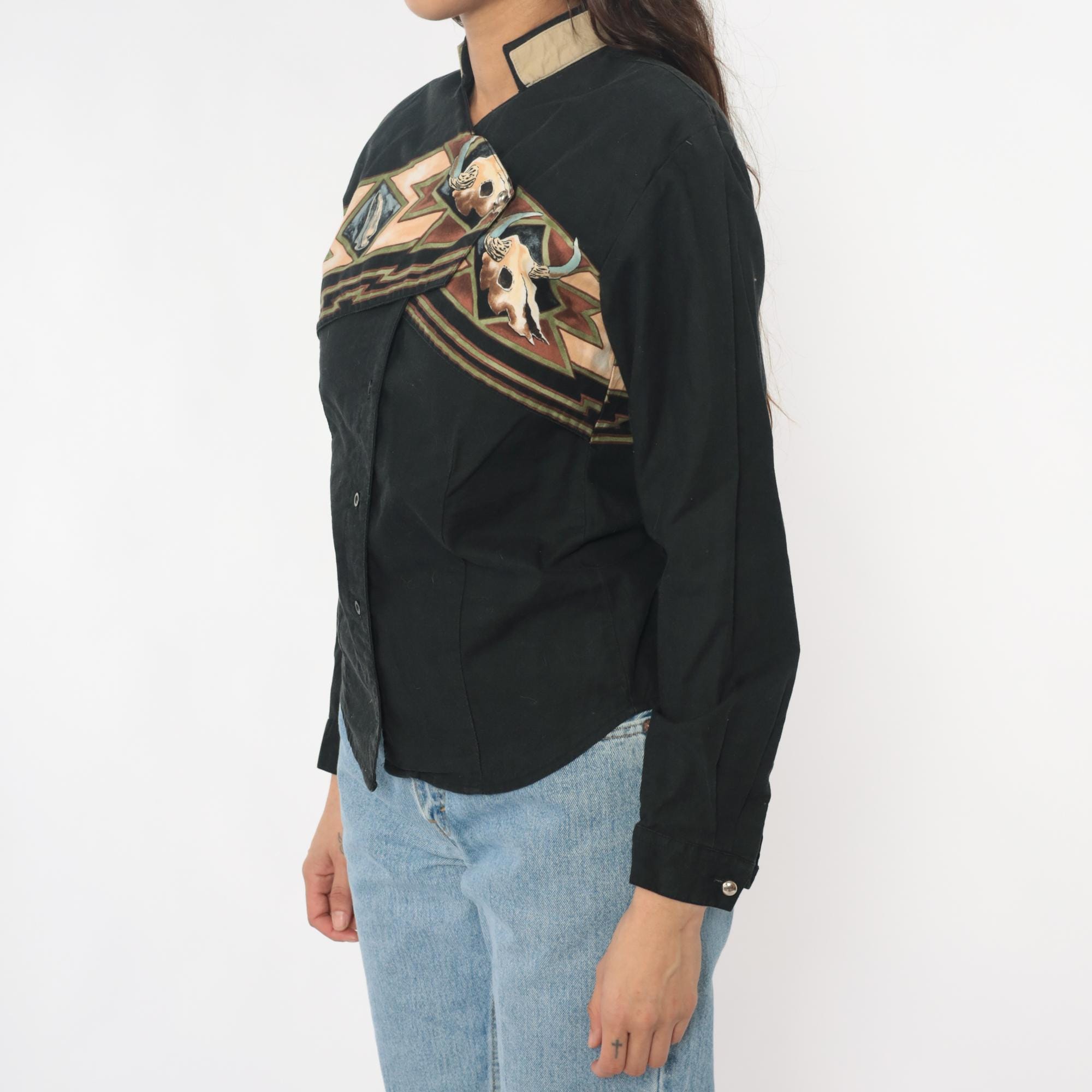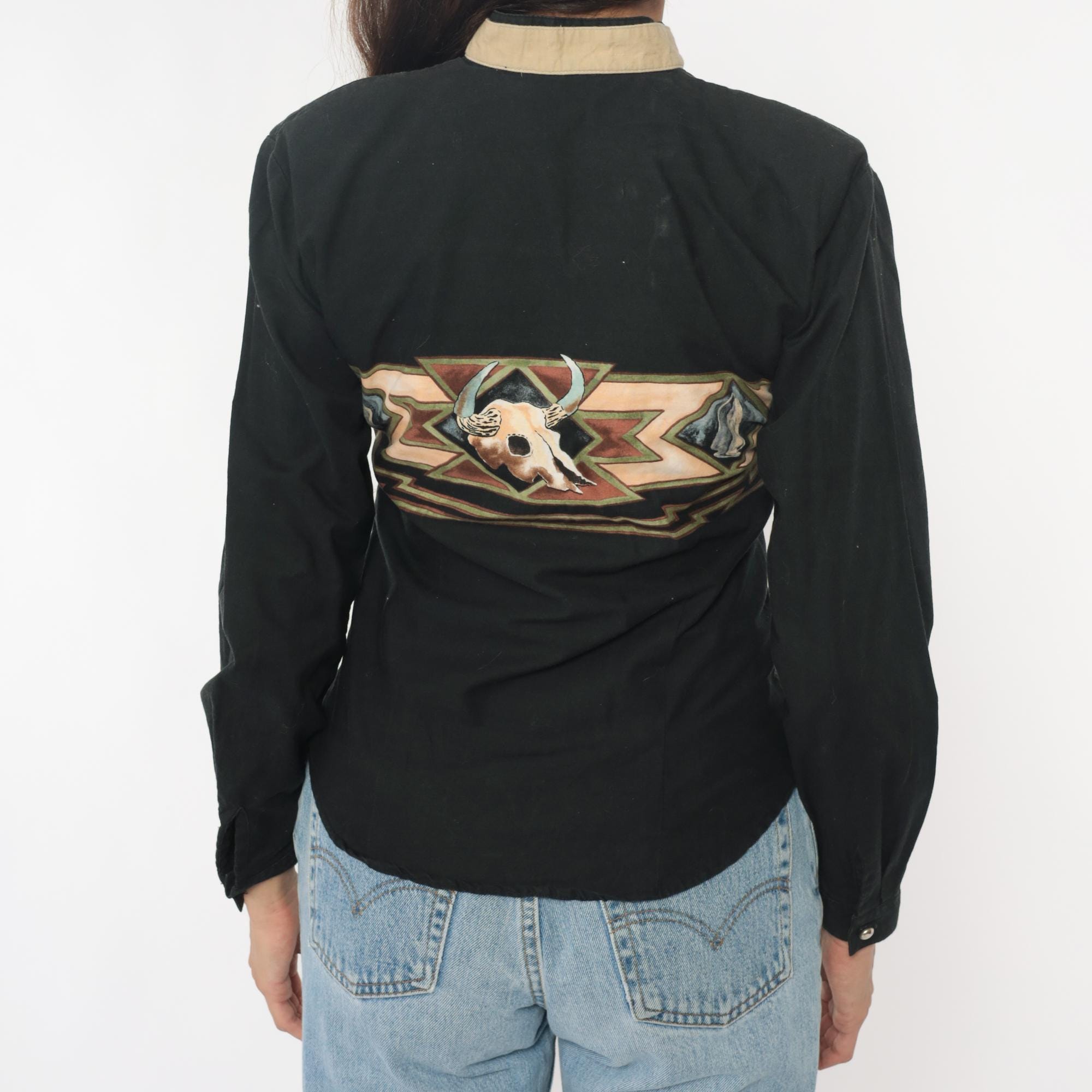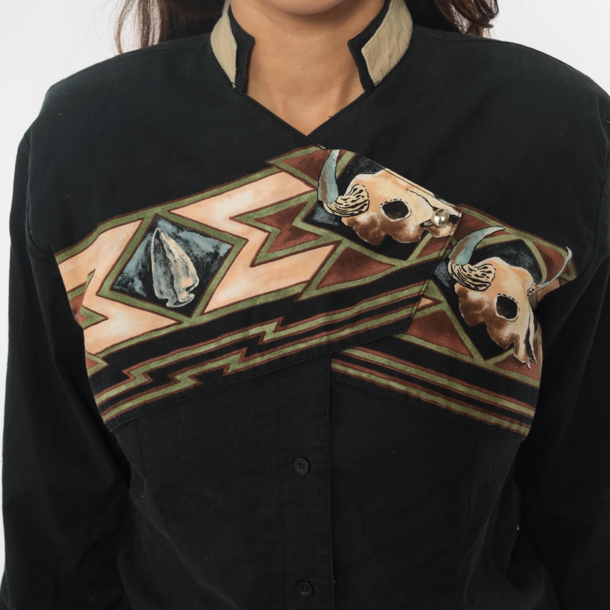 90s black western shirt from Roper with southwestern appliqué design across chest and back featuring buffalo skull motifs and geometric zigzag patterns in tan, brown, rust, blue, and green. Button front closure, long sleeves, contrast tan collar.
