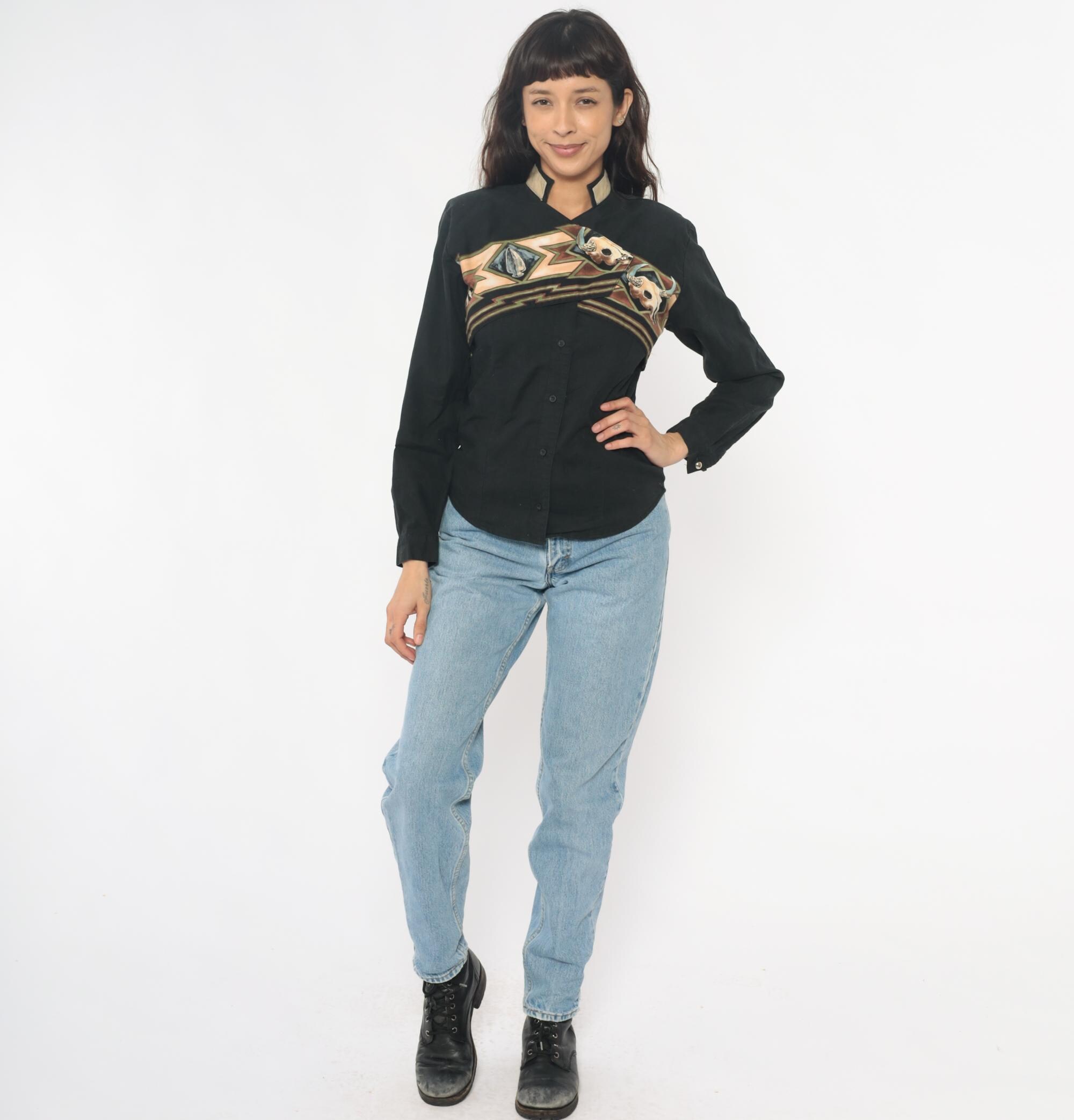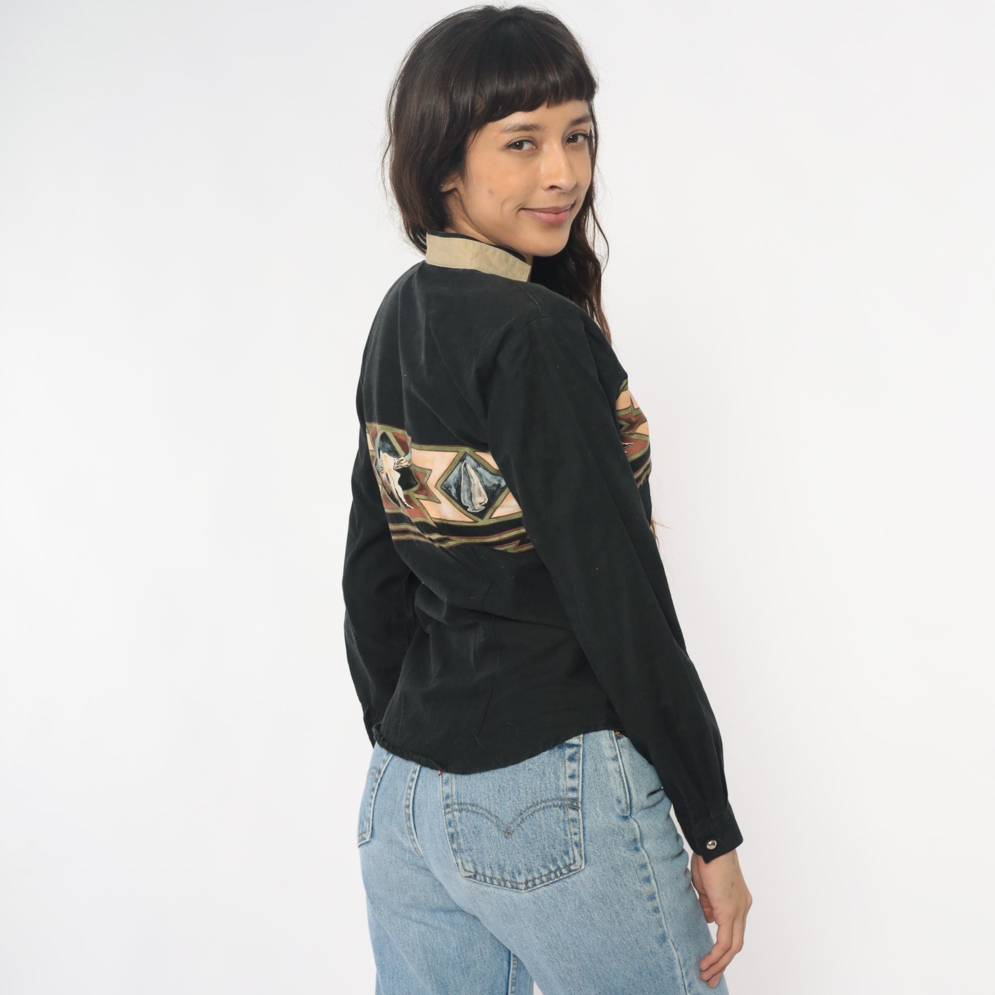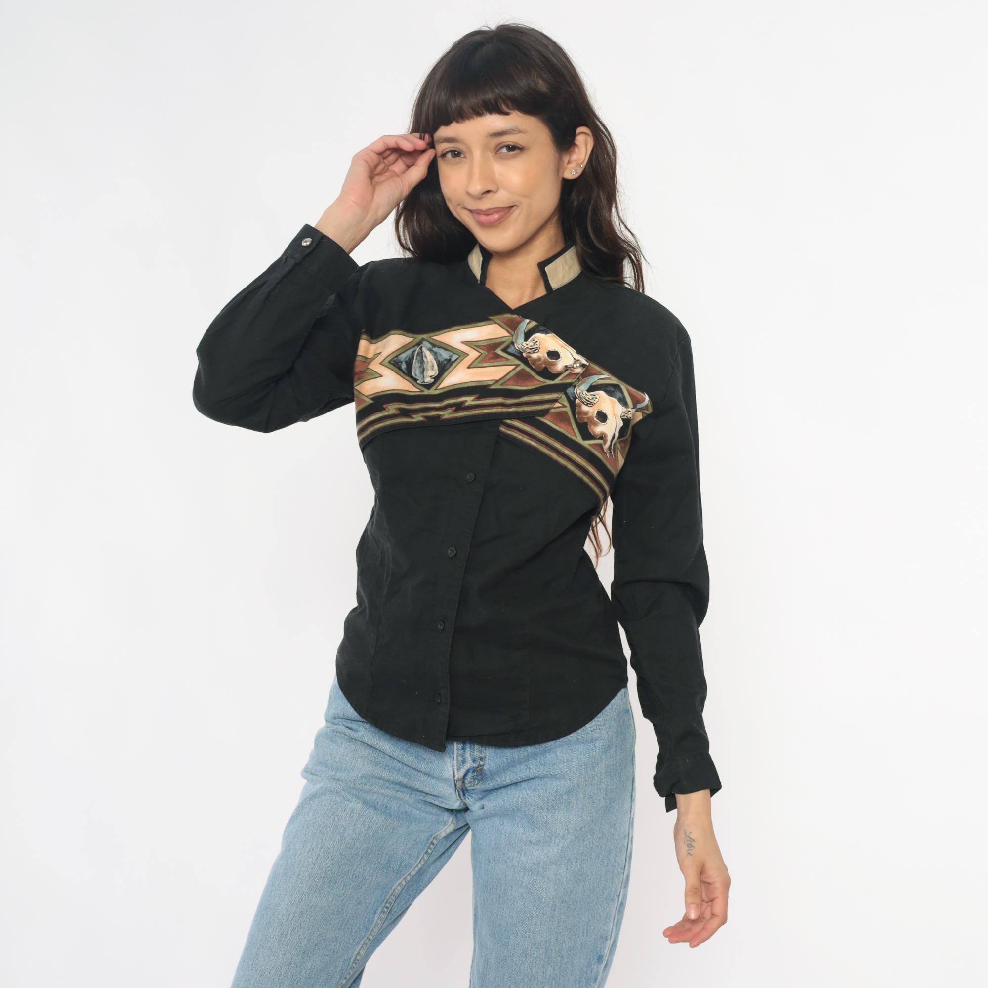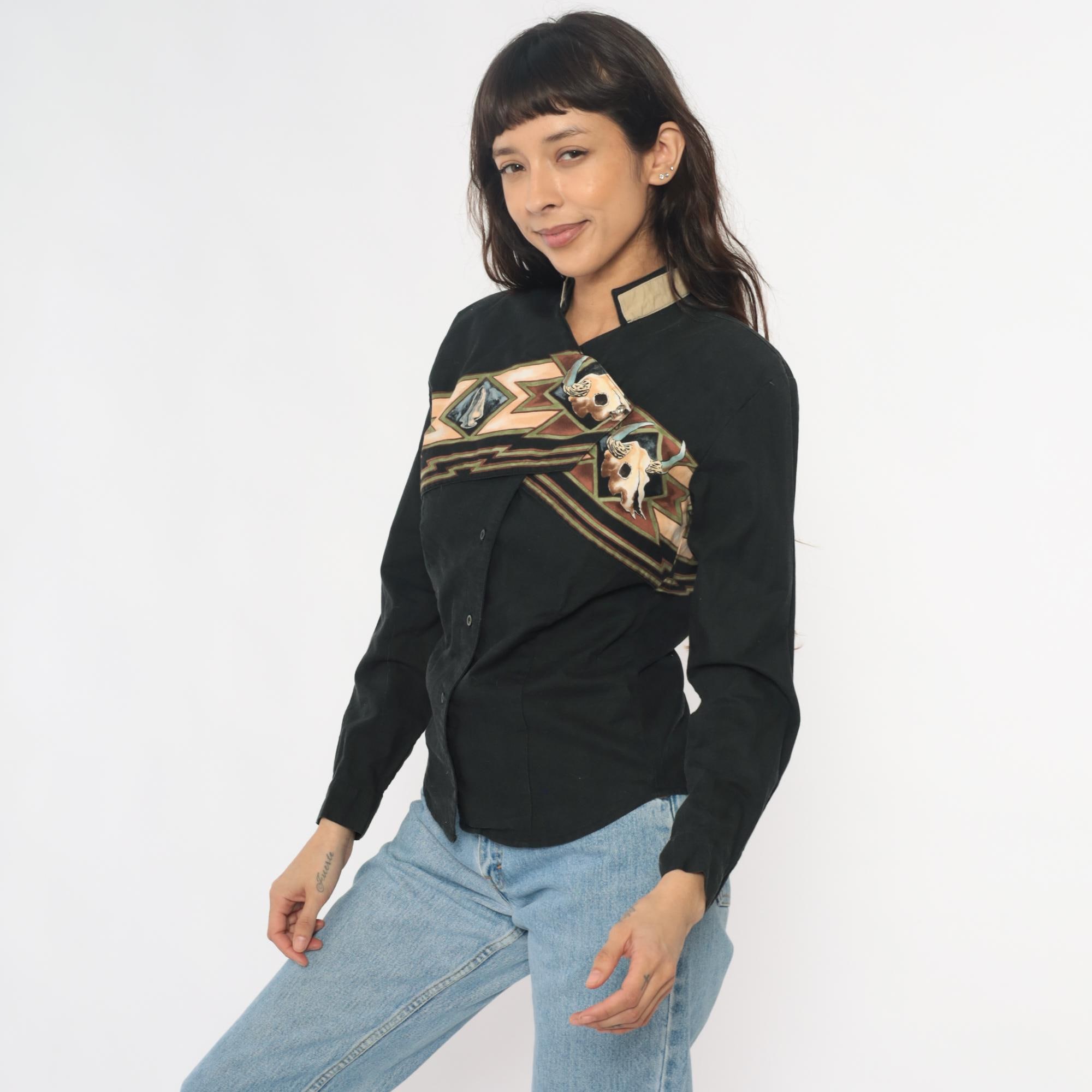 90s black western shirt from Roper with southwestern appliqué design across chest and back featuring buffalo skull motifs and geometric zigzag patterns in tan, brown, rust, blue, and green. Button front closure, long sleeves, contrast tan collar.