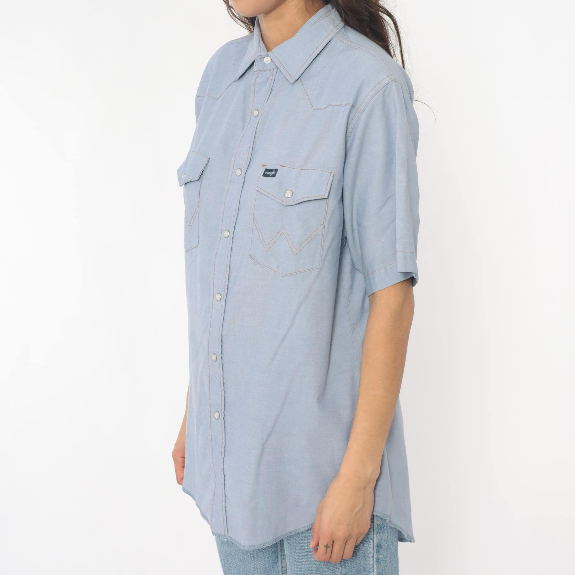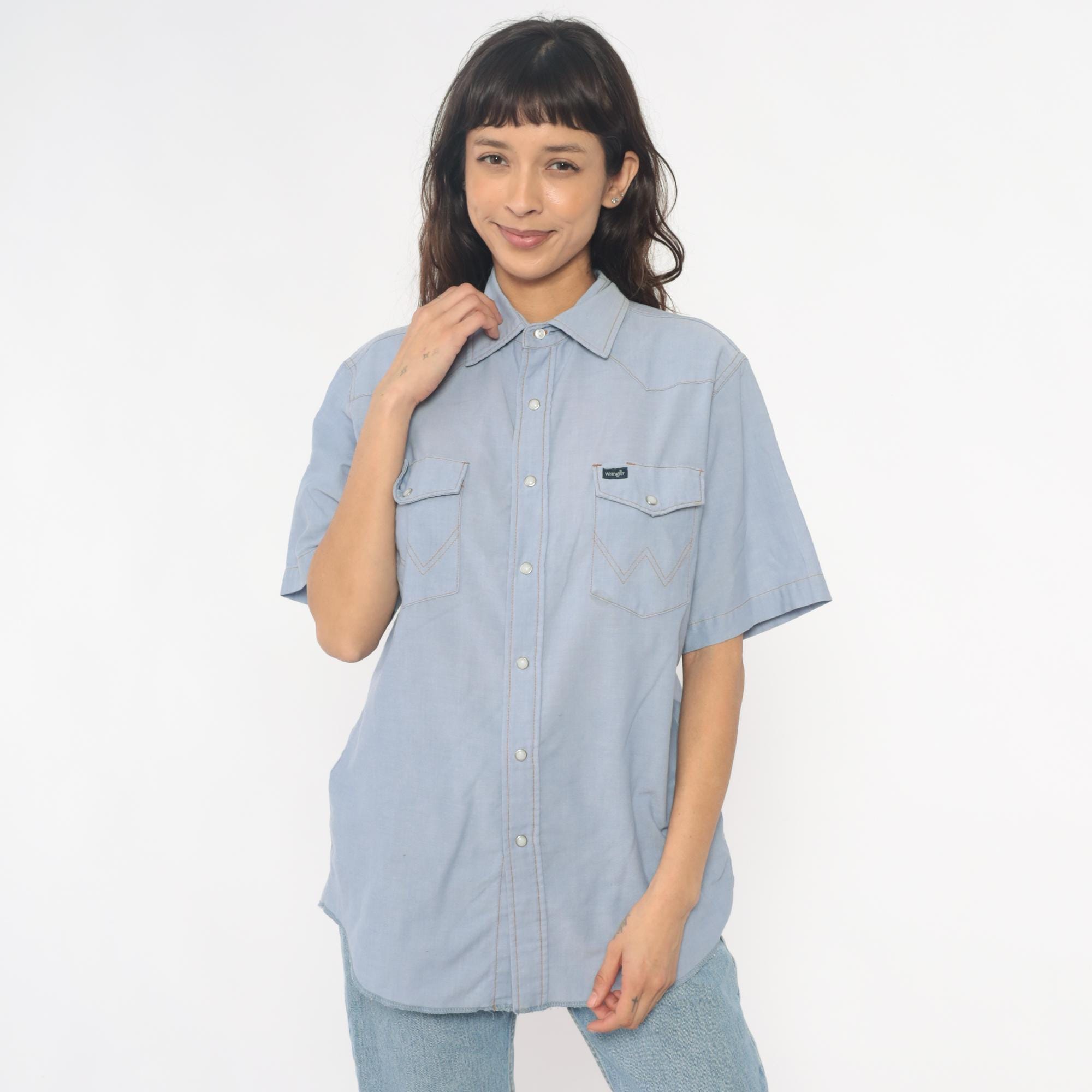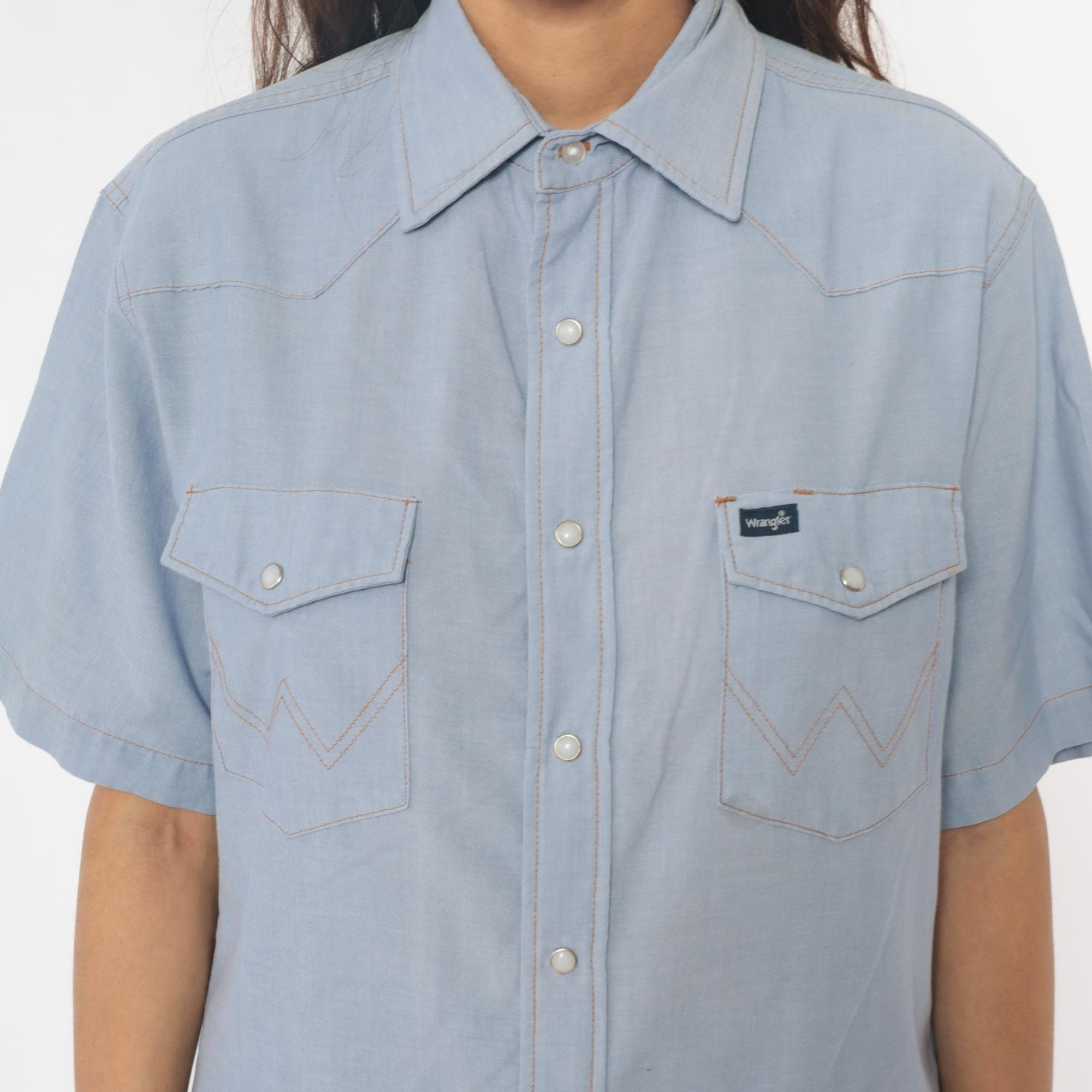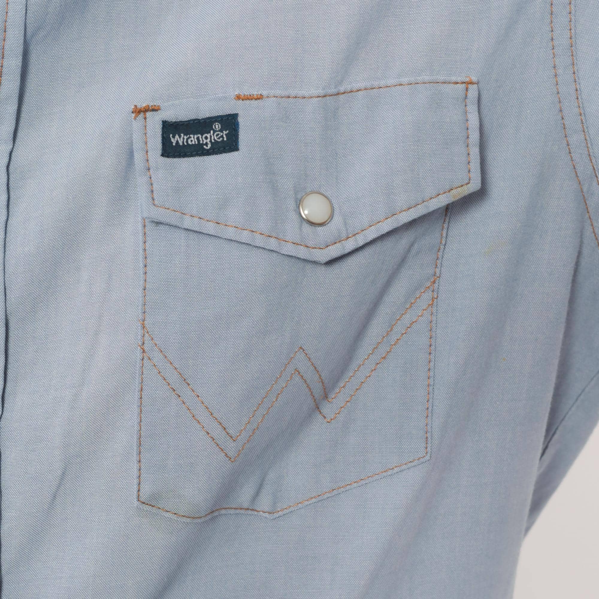 80s pale blue western shirt from Wrangler with pearl snap front closure and two chest pockets with snap flaps. Pointed yoke across shoulders and back, short sleeves, W-shaped decorative stitching on pocket corners.
