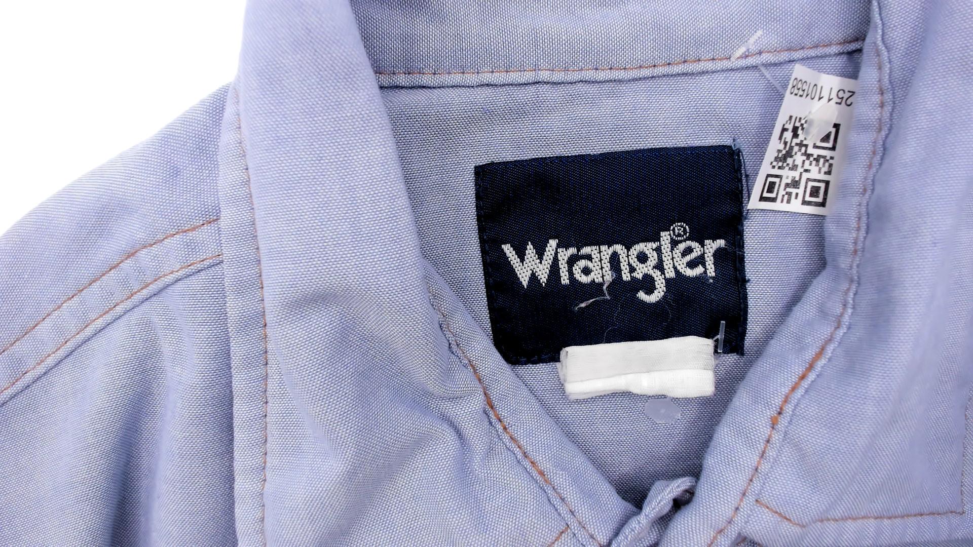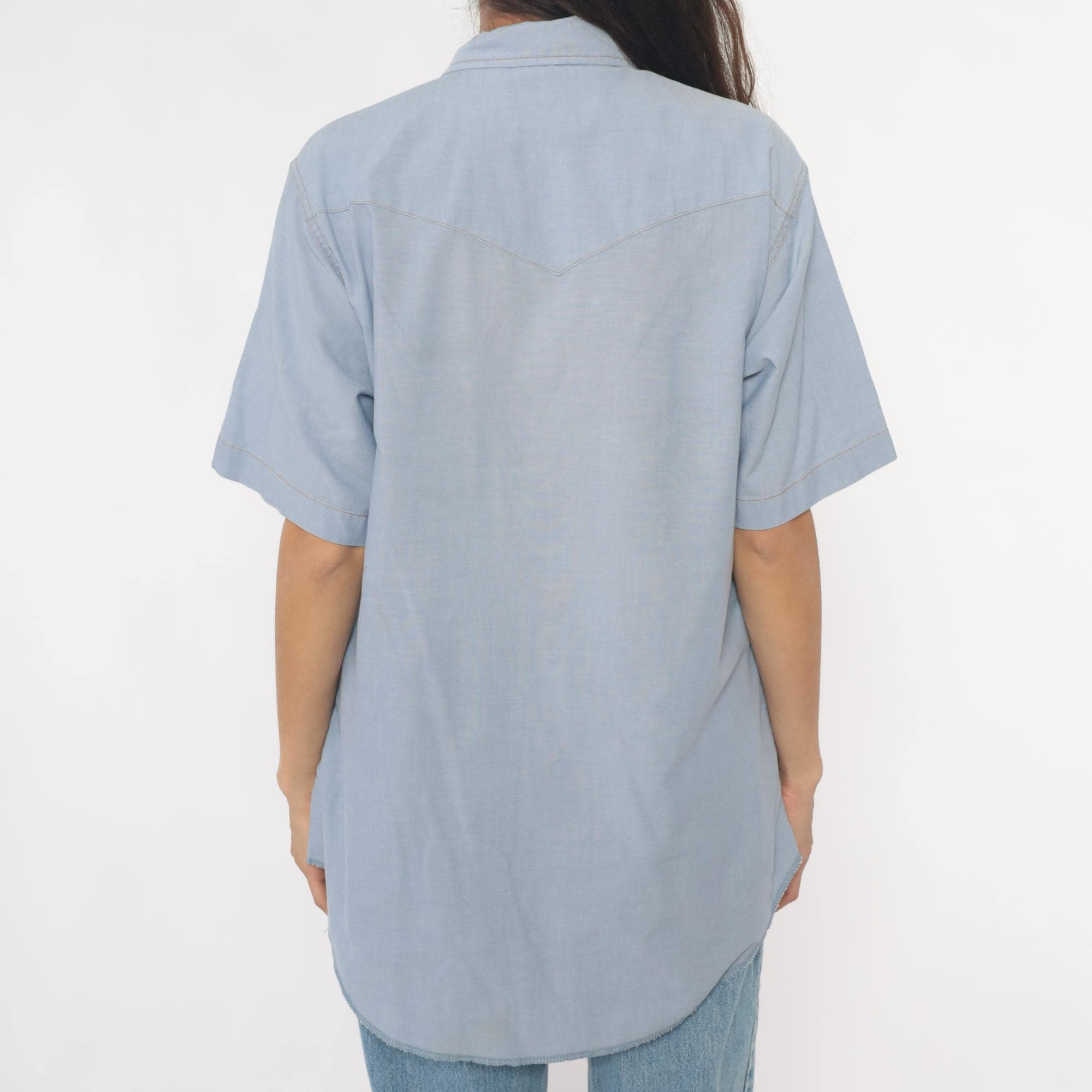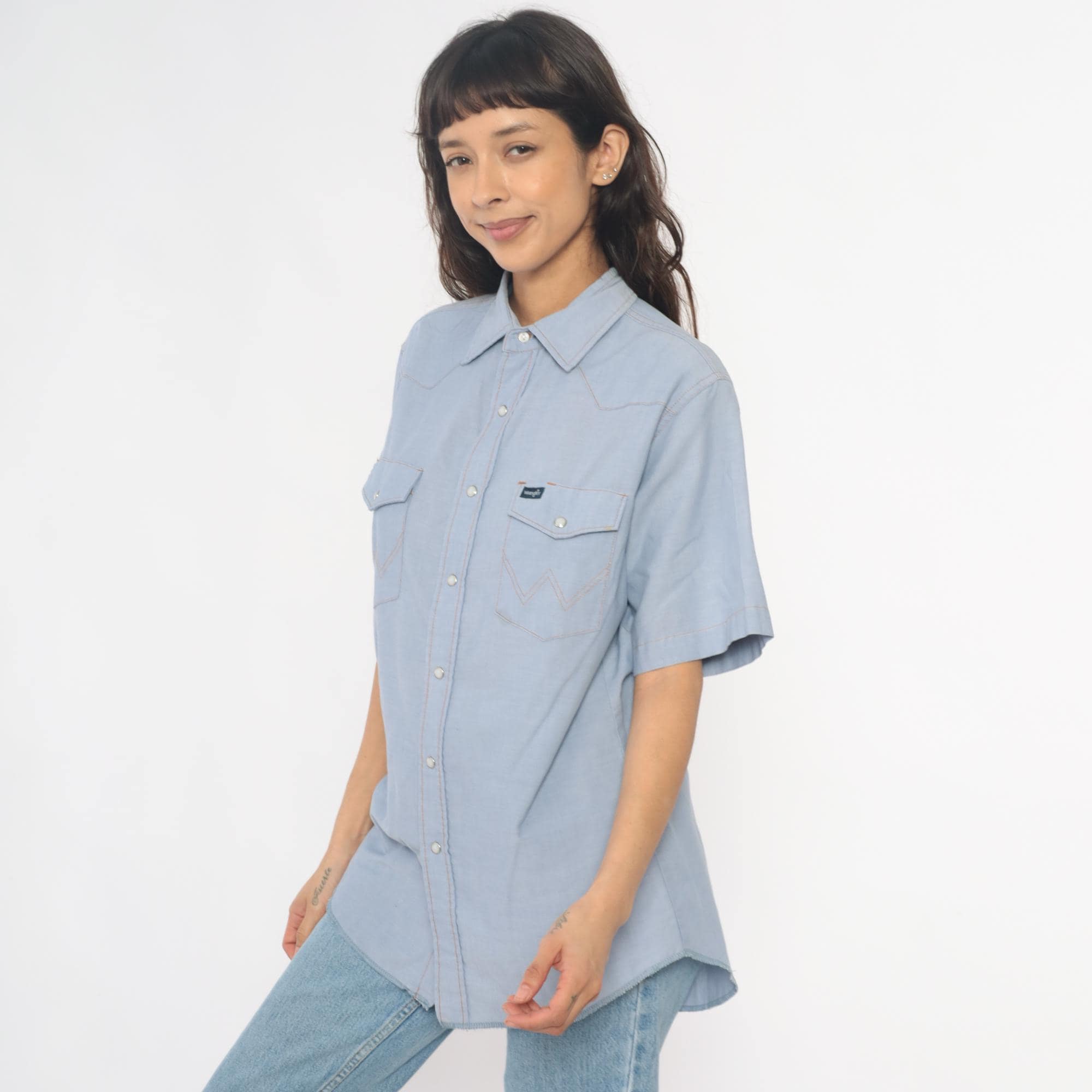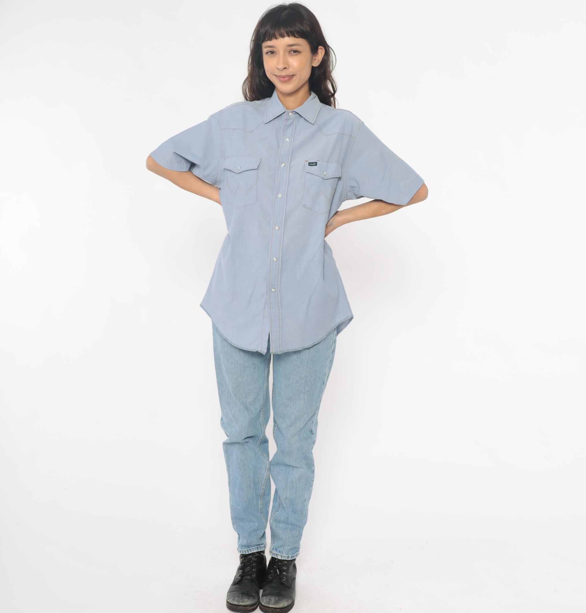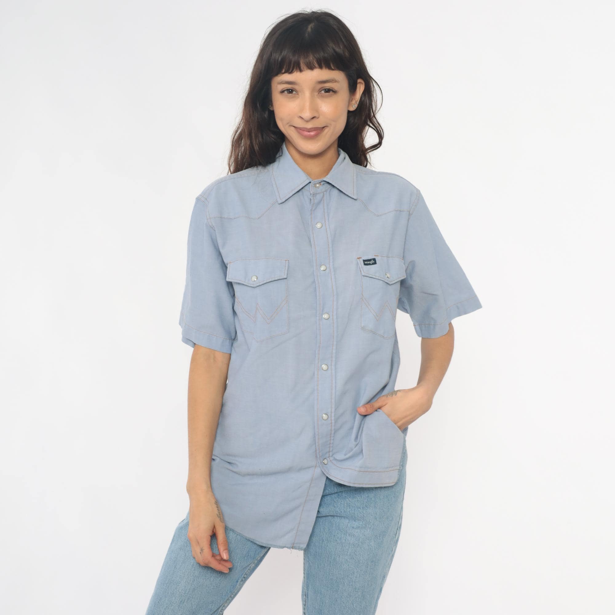 80s pale blue western shirt from Wrangler with pearl snap front closure and two chest pockets with snap flaps. Pointed yoke across shoulders and back, short sleeves, W-shaped decorative stitching on pocket corners.