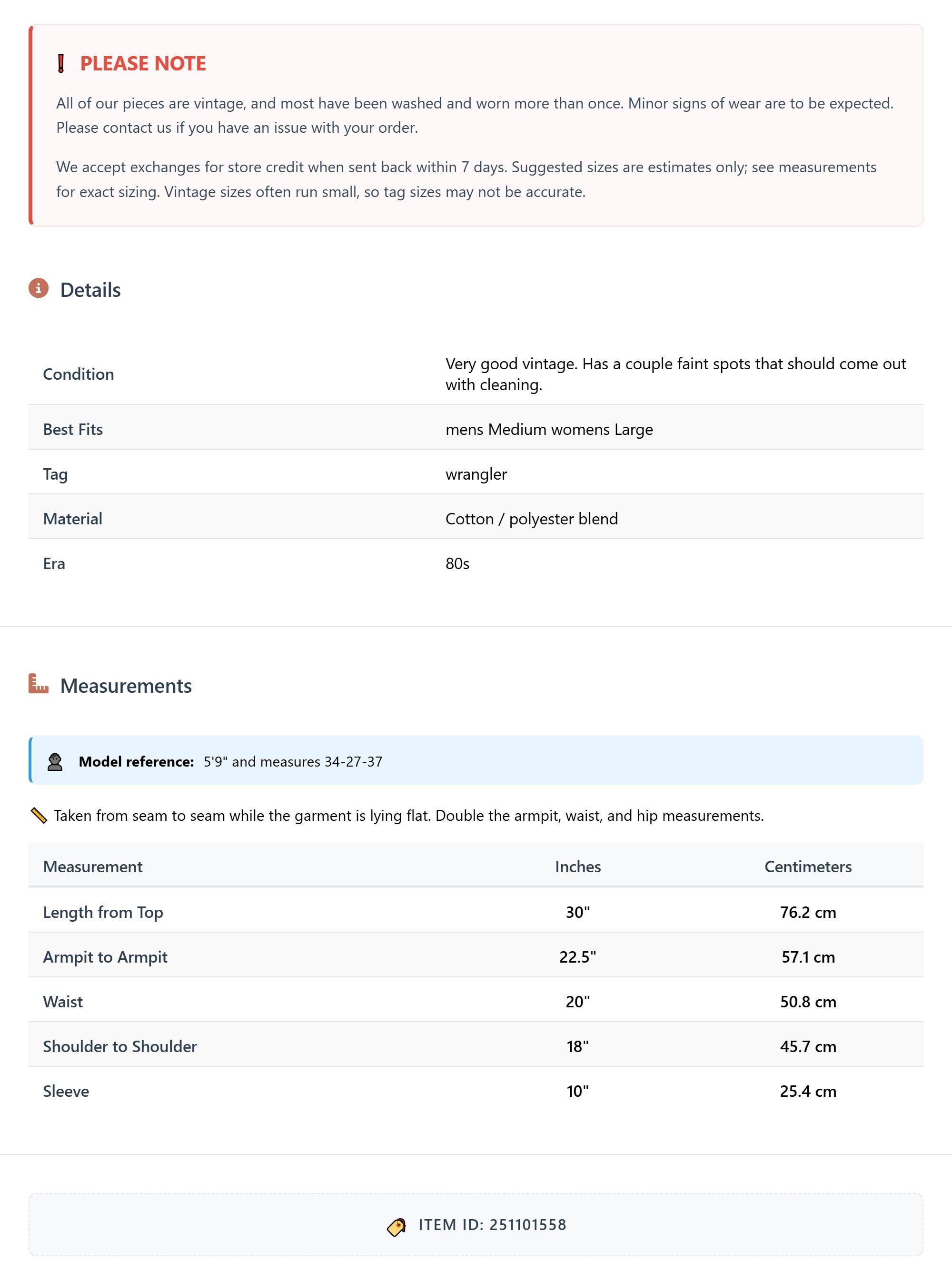 All of our pieces are vintage, and most have been washed and worn more than once. Minor signs of wear are to be expected. Please contact us if you have an issue with your order. We accept exchanges for store credit when sent back within 7 days.