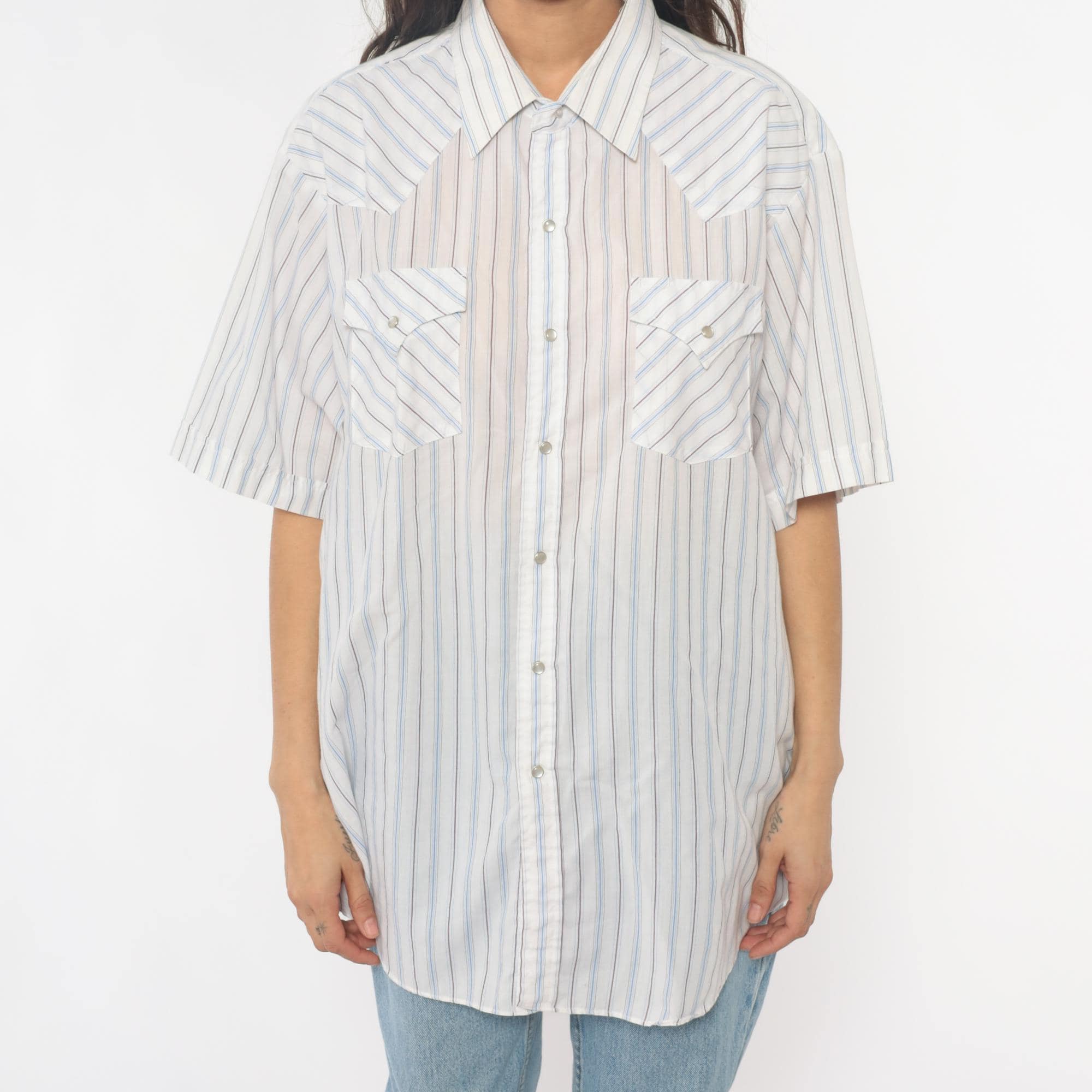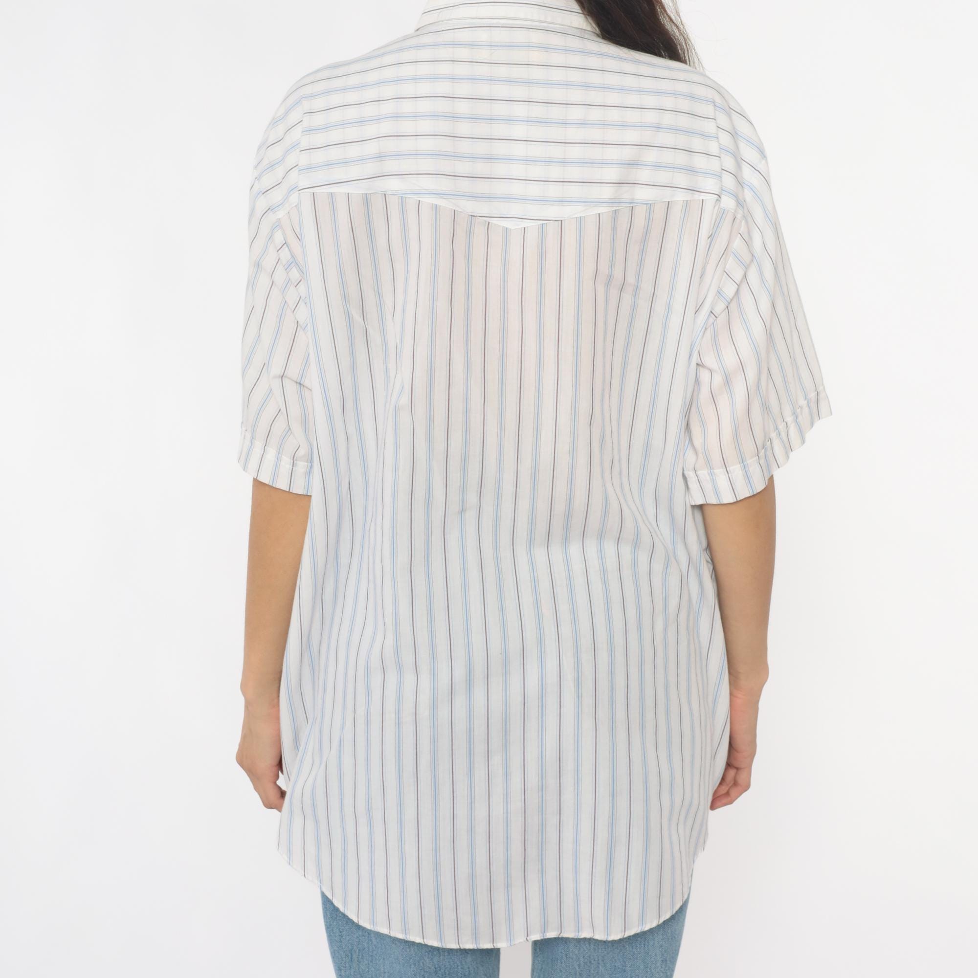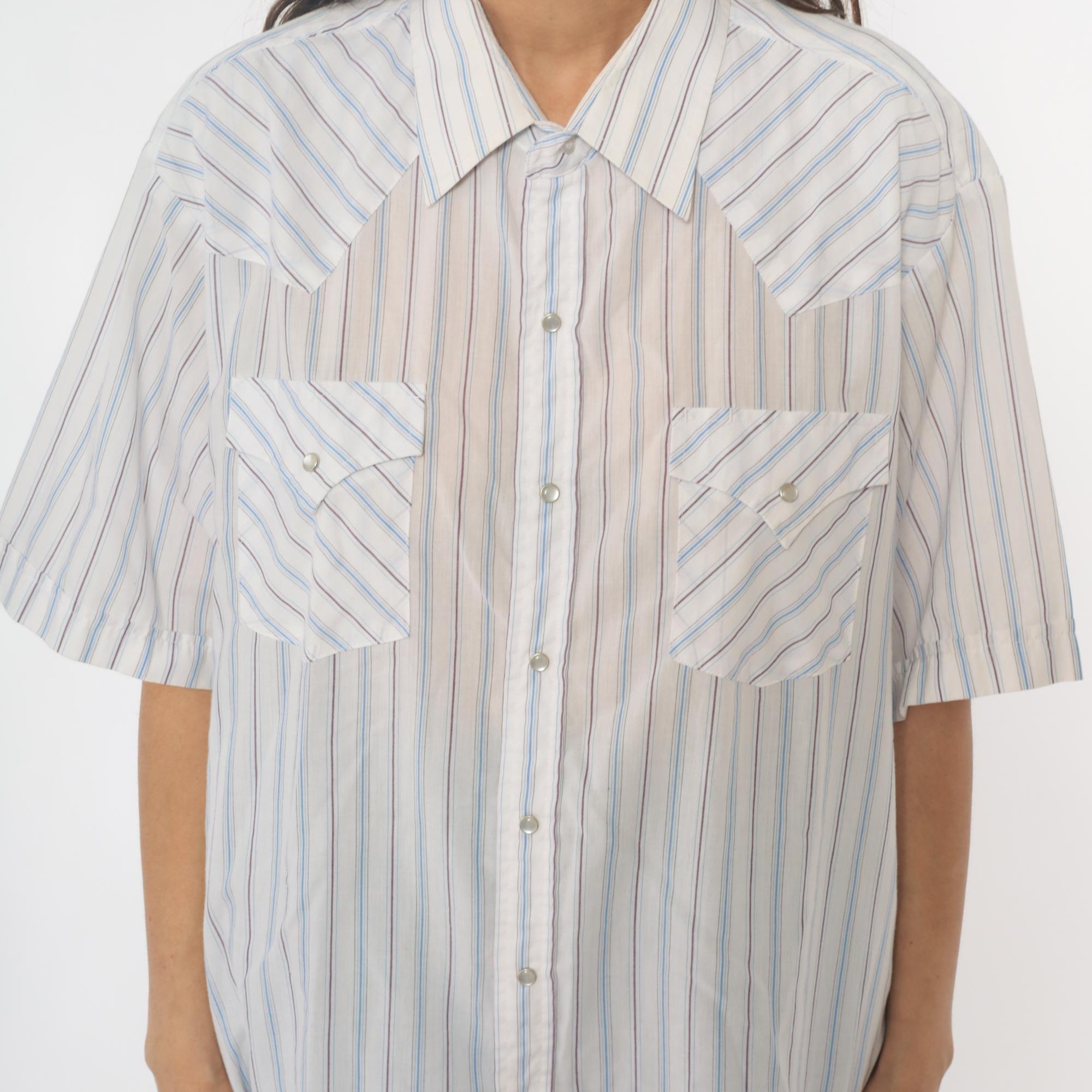 90s striped western shirt from Ely Cattleman with white base and thin blue and brown vertical stripes throughout. Button front closure with pointed collar, short sleeves, two diagonal chest pockets with button flaps.