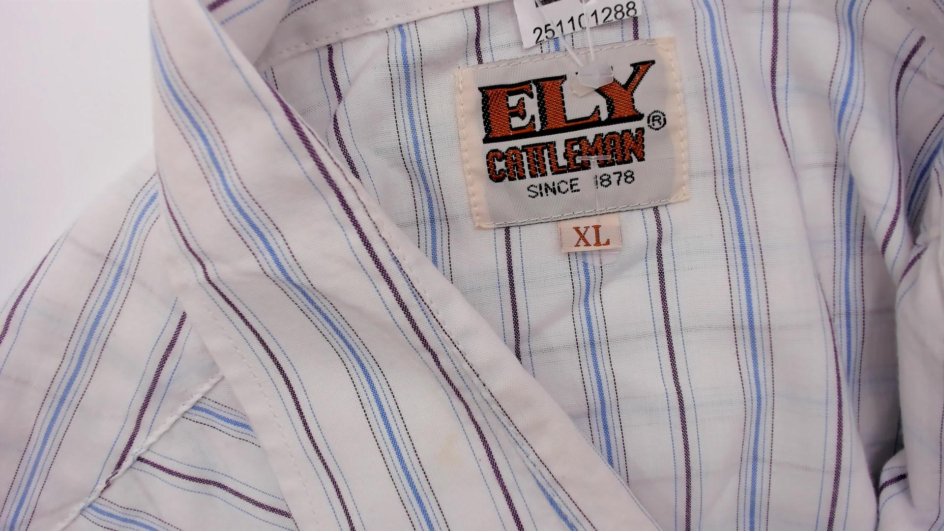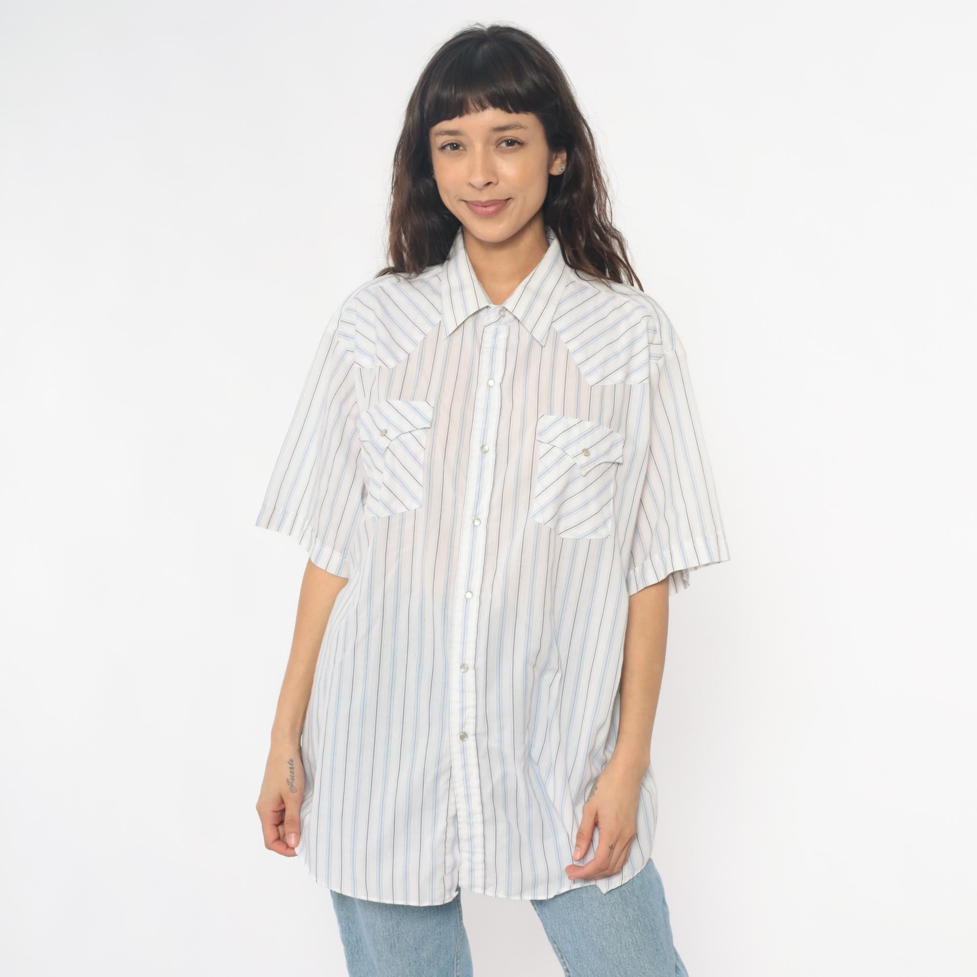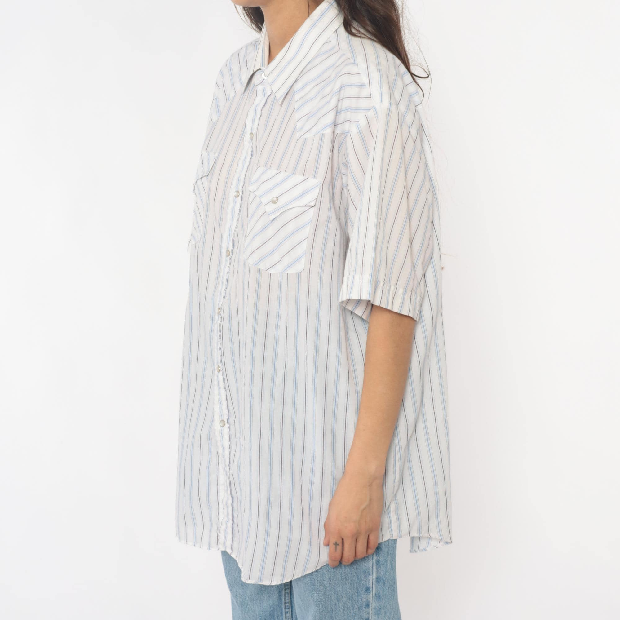 90s striped western shirt from Ely Cattleman with white base and thin blue and brown vertical stripes throughout. Button front closure with pointed collar, short sleeves, two diagonal chest pockets with button flaps.