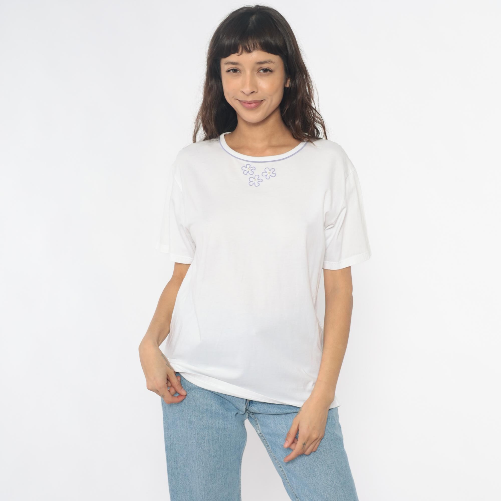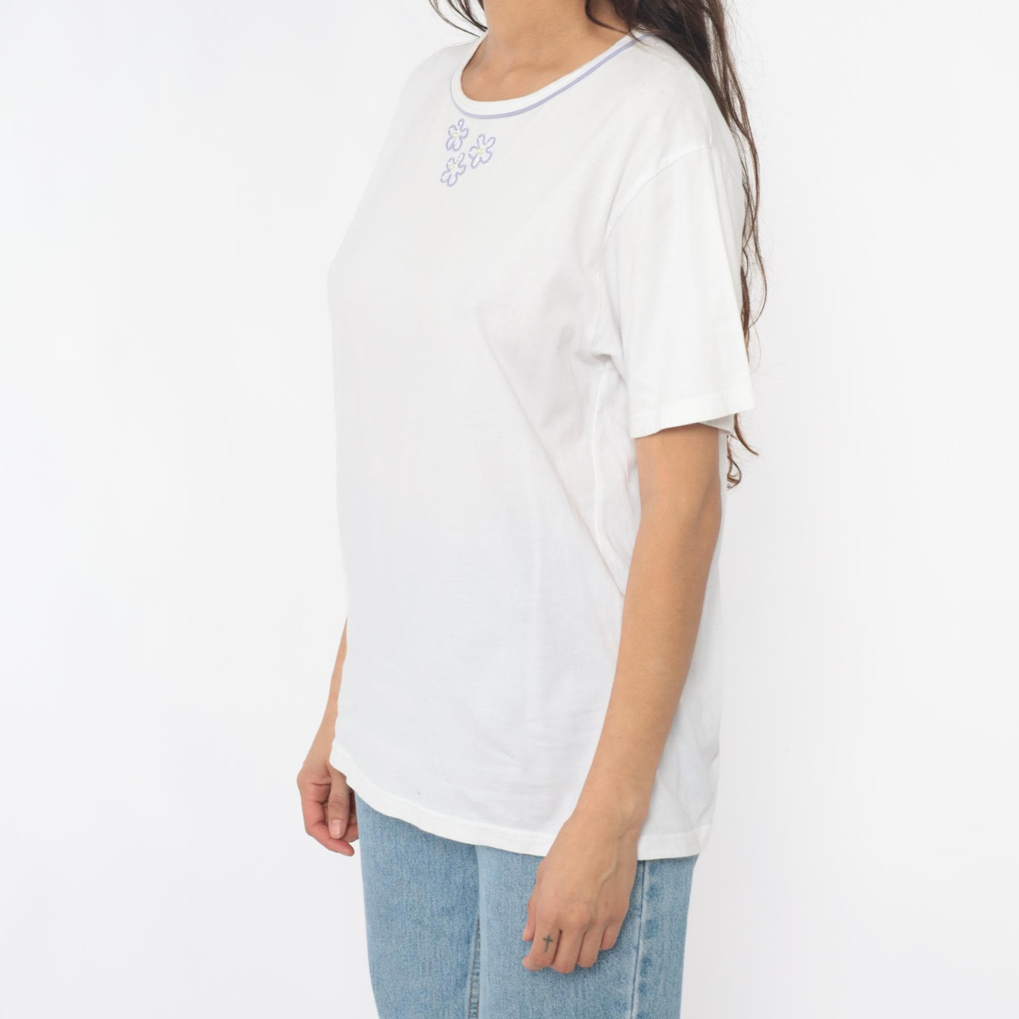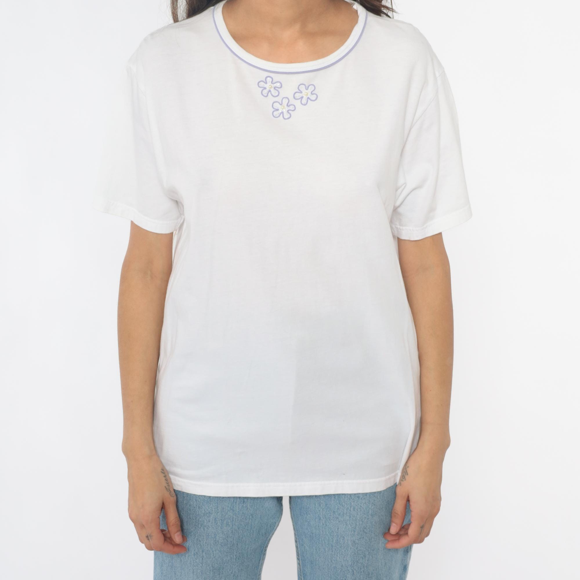 90s white t-shirt with three embroidered flowers on the chest in purple outline with pearl-like yellow centers. Purple trim along the crew neckline. Short sleeves with rolled hems.