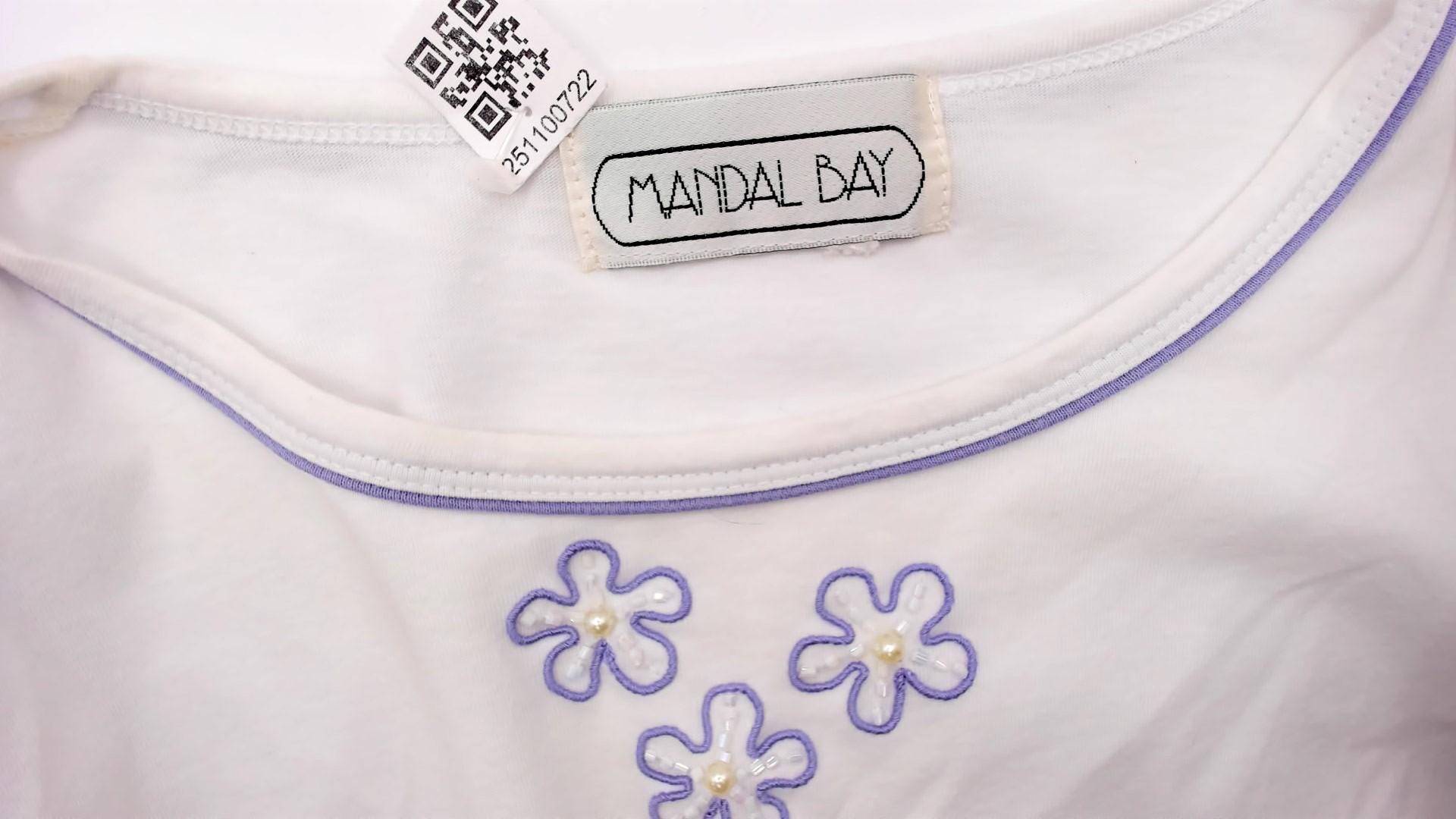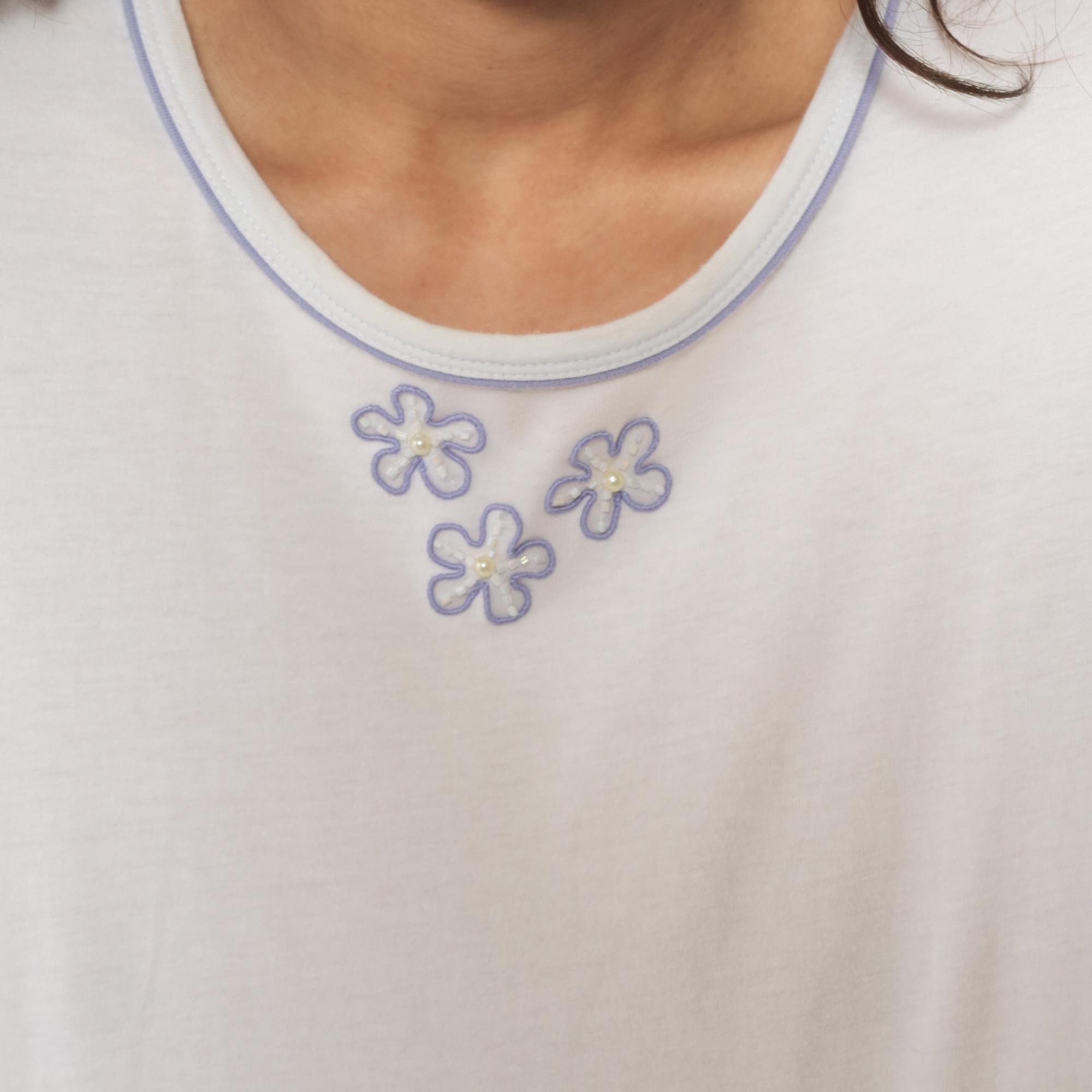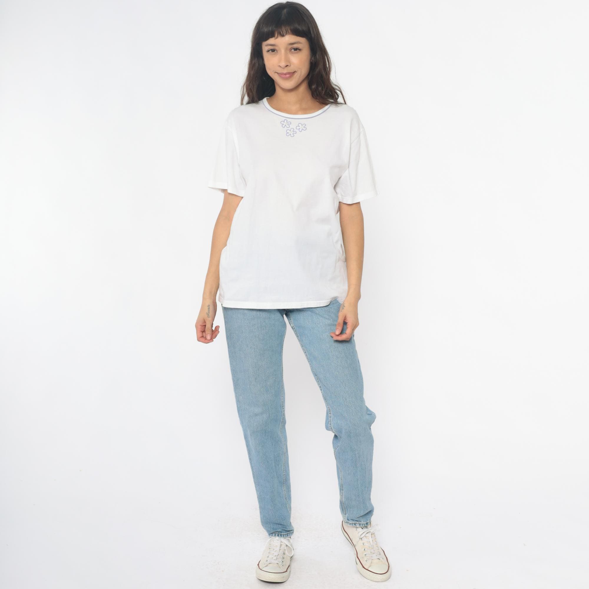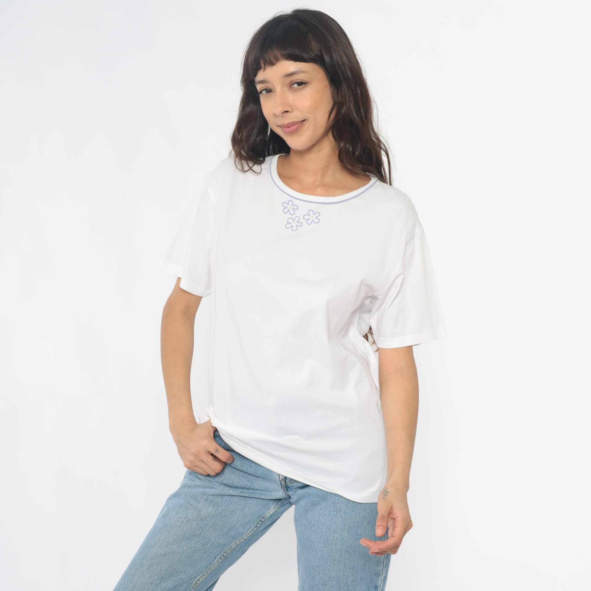 90s white t-shirt with three embroidered flowers on the chest in purple outline with pearl-like yellow centers. Purple trim along the crew neckline. Short sleeves with rolled hems.