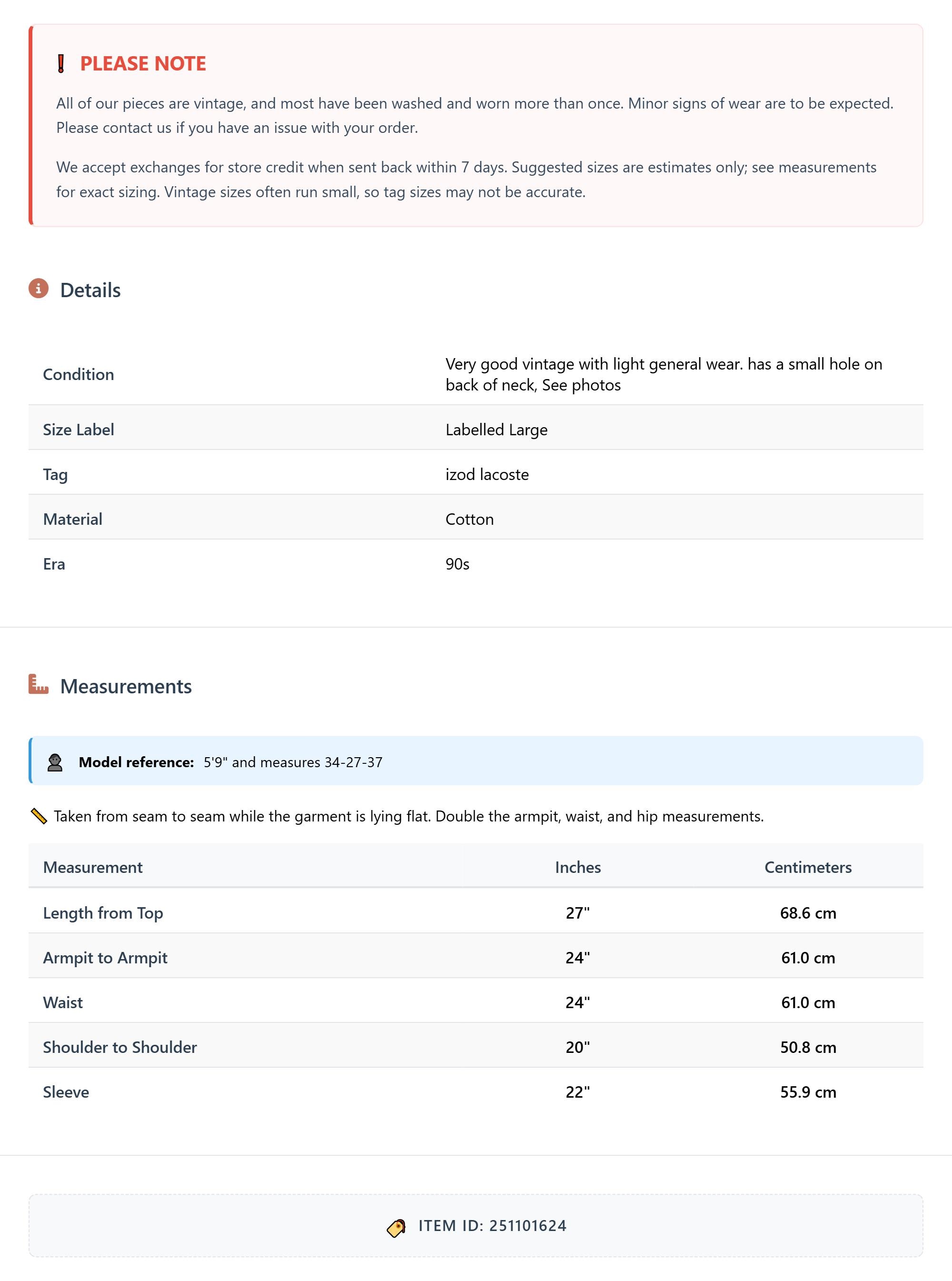 All of our pieces are vintage, and most have been washed and worn more than once. Minor signs of wear are to be expected. Please contact us if you have an issue with your order. We accept exchanges for store credit when sent back within 7 days.