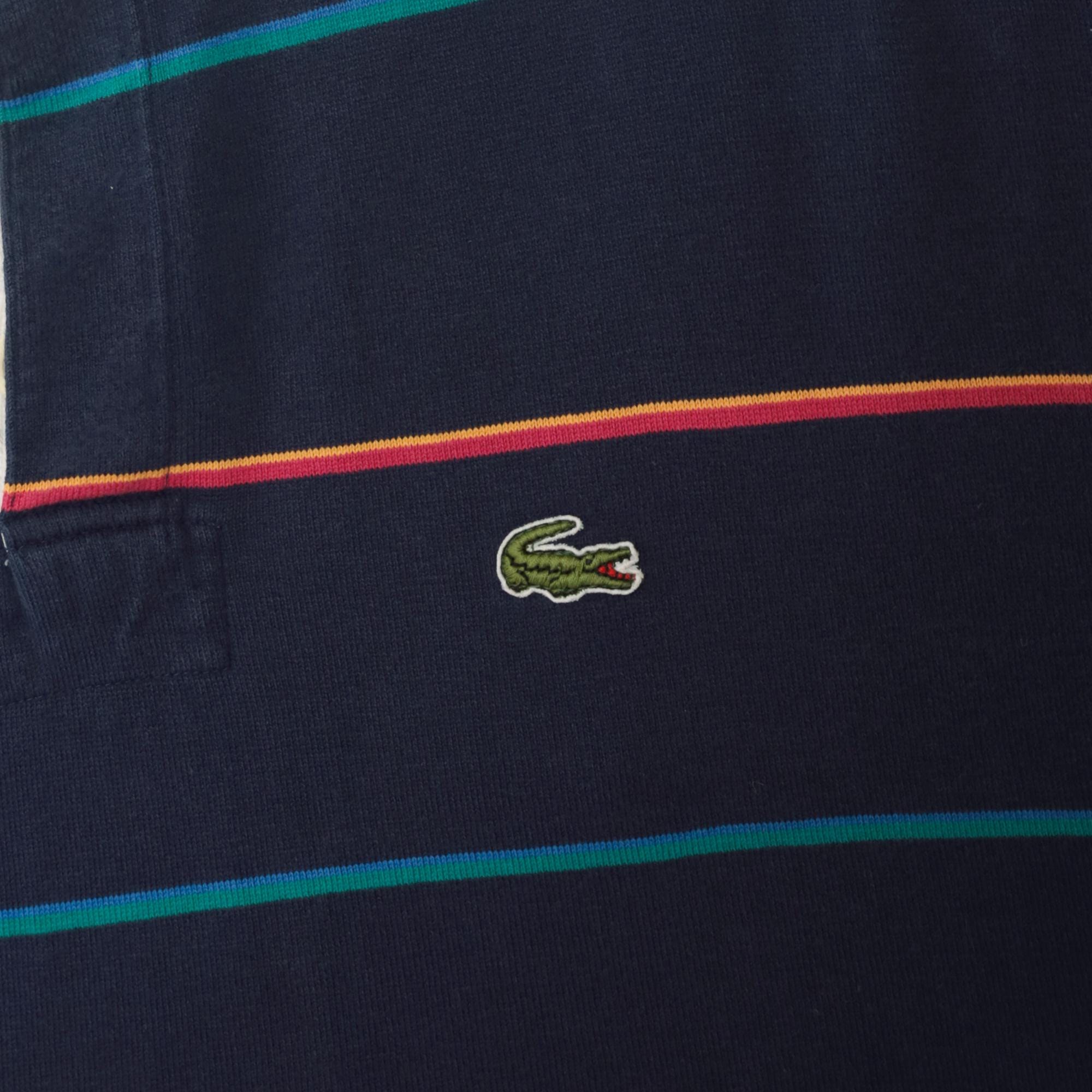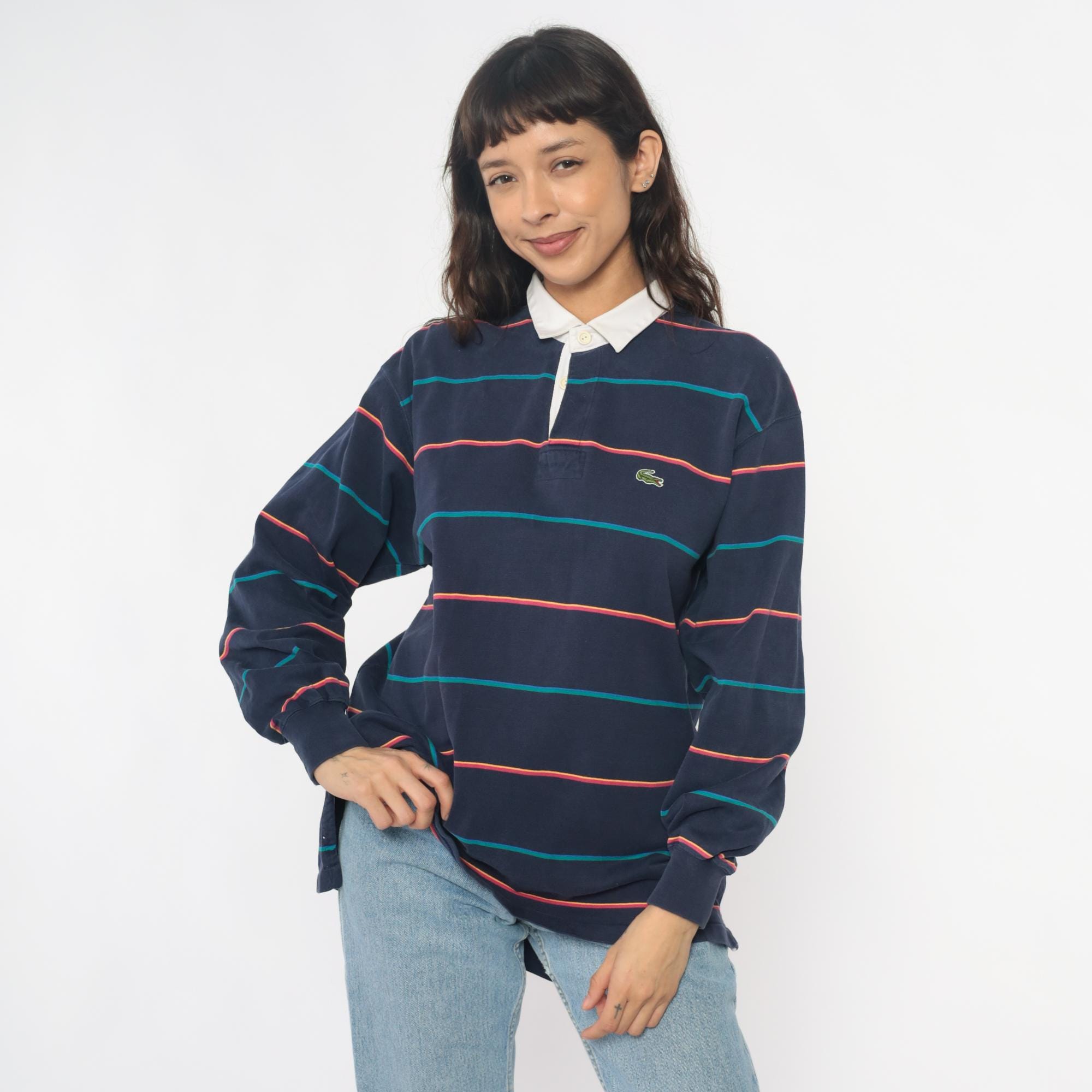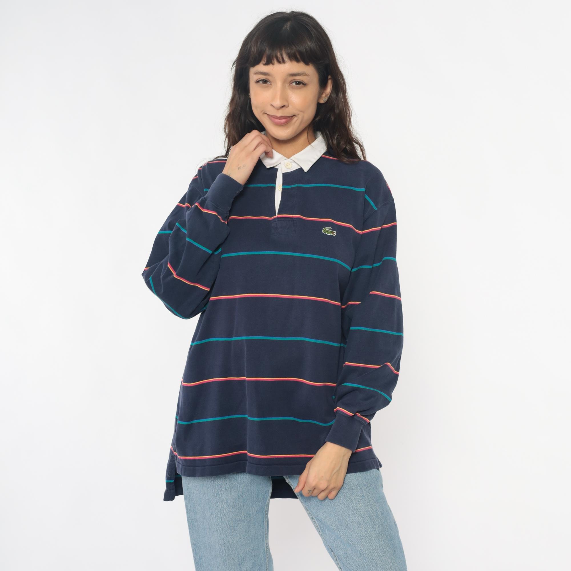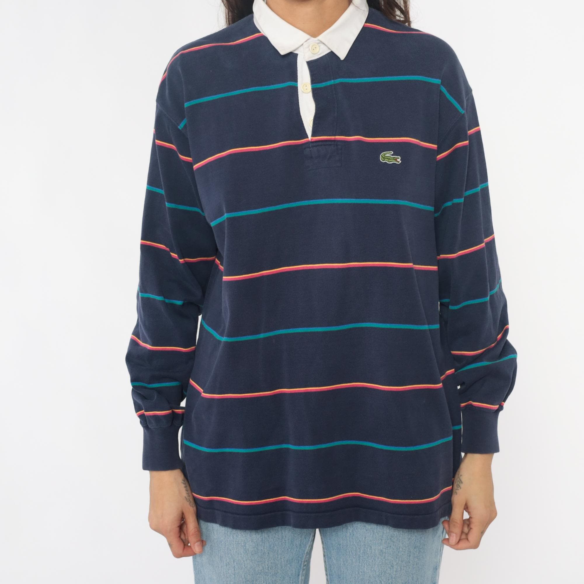 90s navy blue striped rugby shirt from izod lacoste with white contrast collar and partial button placket. Horizontal stripes in coral and teal across the body, embroidered crocodile logo on left chest. Long sleeves with ribbed cuffs, ribbed collar and cuffs.