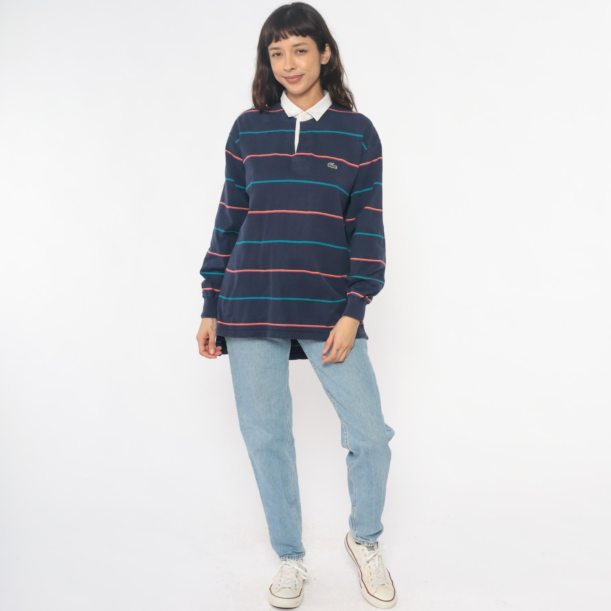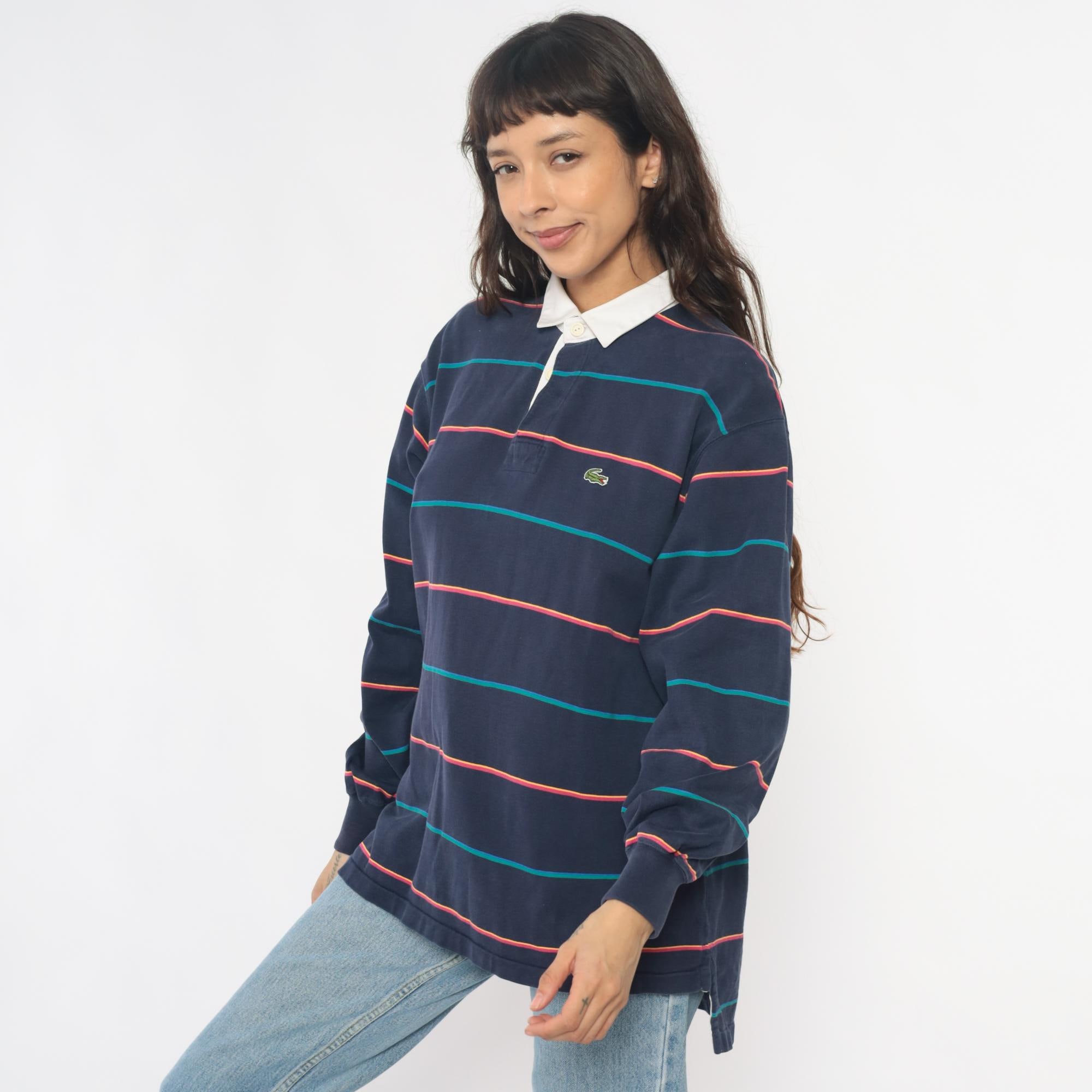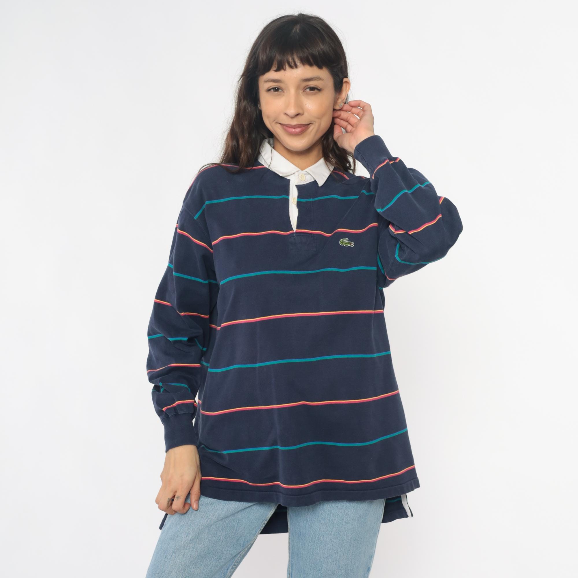 90s navy blue striped rugby shirt from izod lacoste with white contrast collar and partial button placket. Horizontal stripes in coral and teal across the body, embroidered crocodile logo on left chest. Long sleeves with ribbed cuffs, ribbed collar and cuffs.