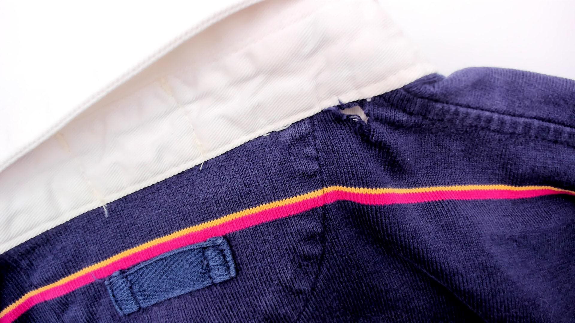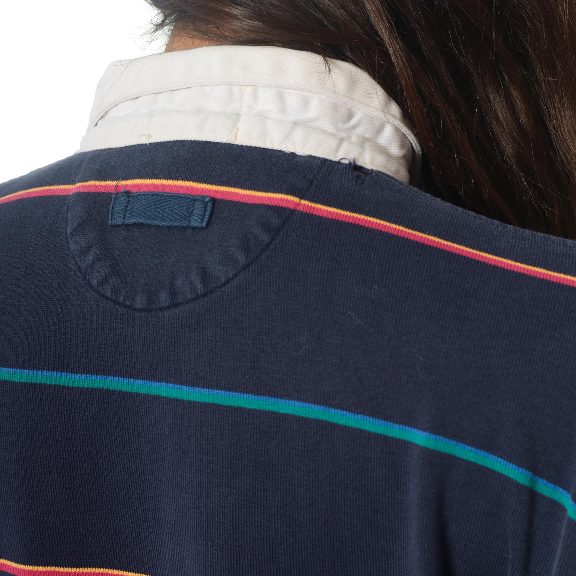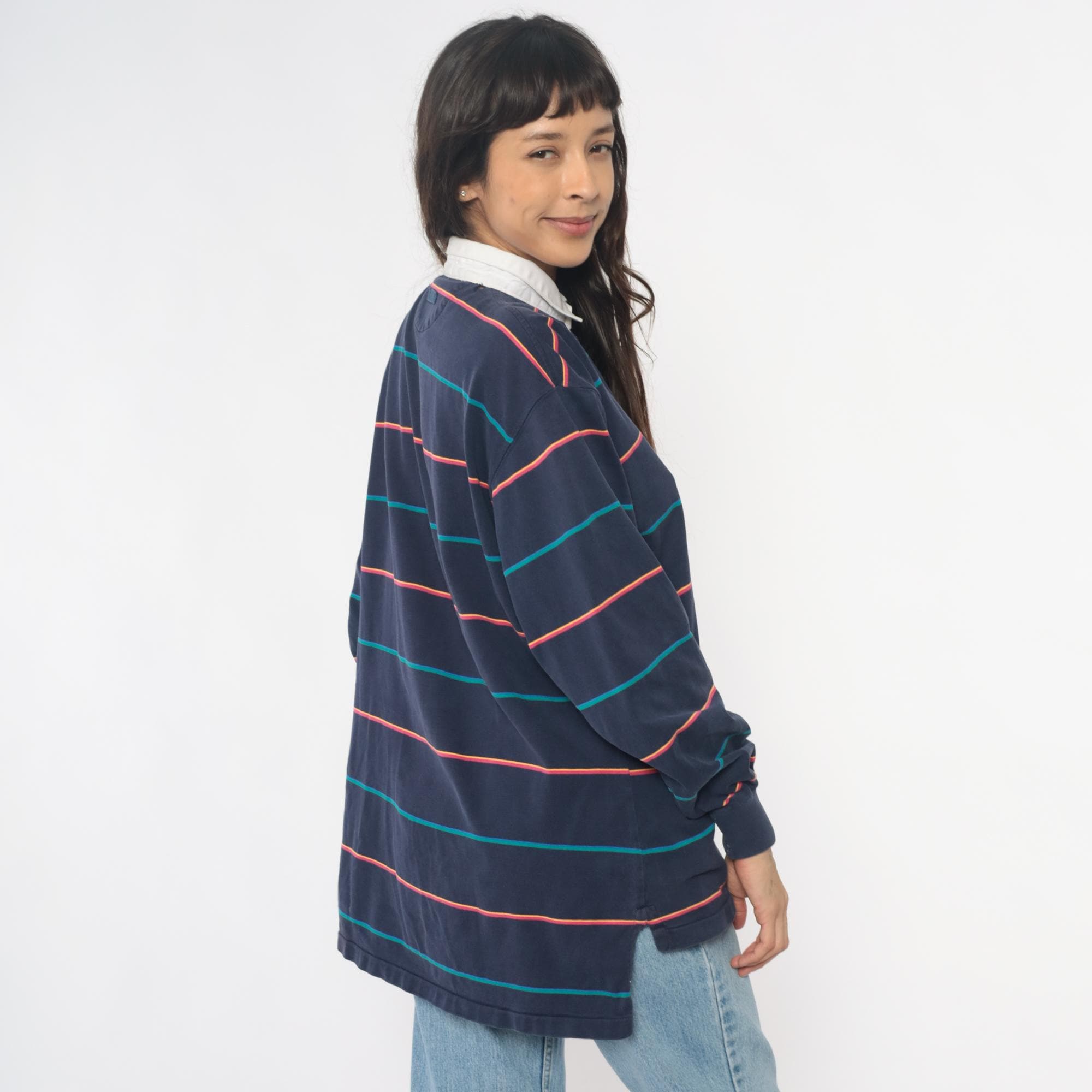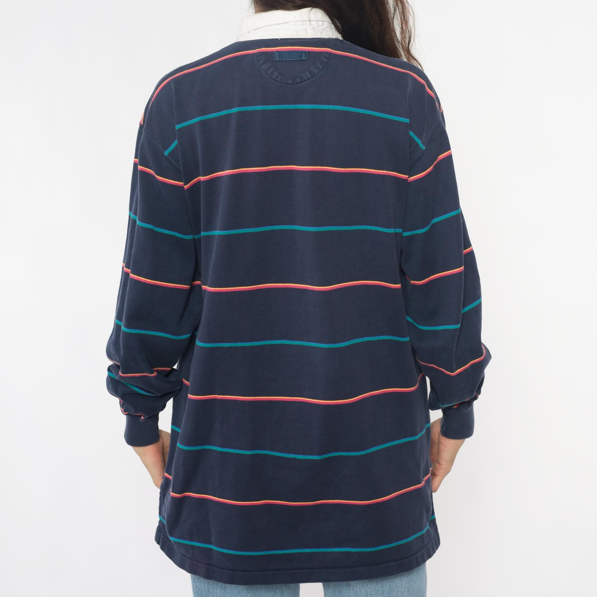 90s navy blue striped rugby shirt from izod lacoste with white contrast collar and partial button placket. Horizontal stripes in coral and teal across the body, embroidered crocodile logo on left chest. Long sleeves with ribbed cuffs, ribbed collar and cuffs.