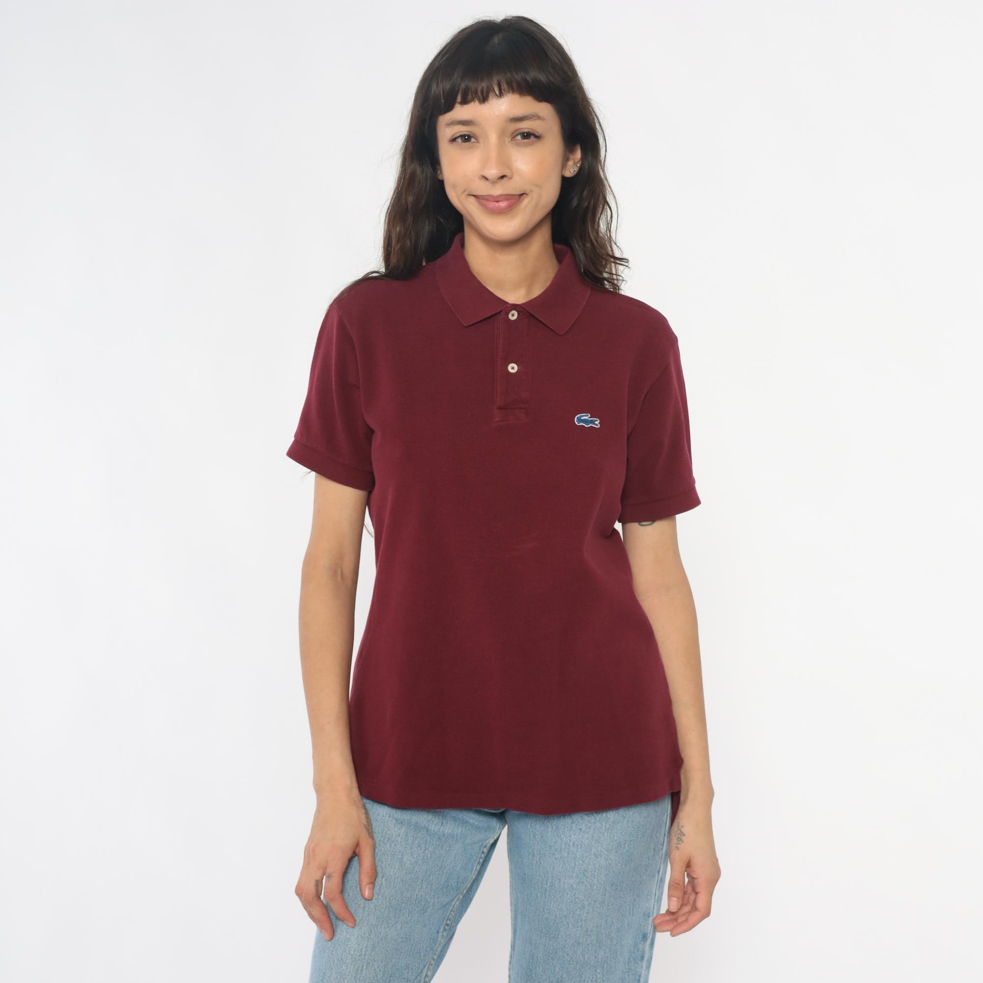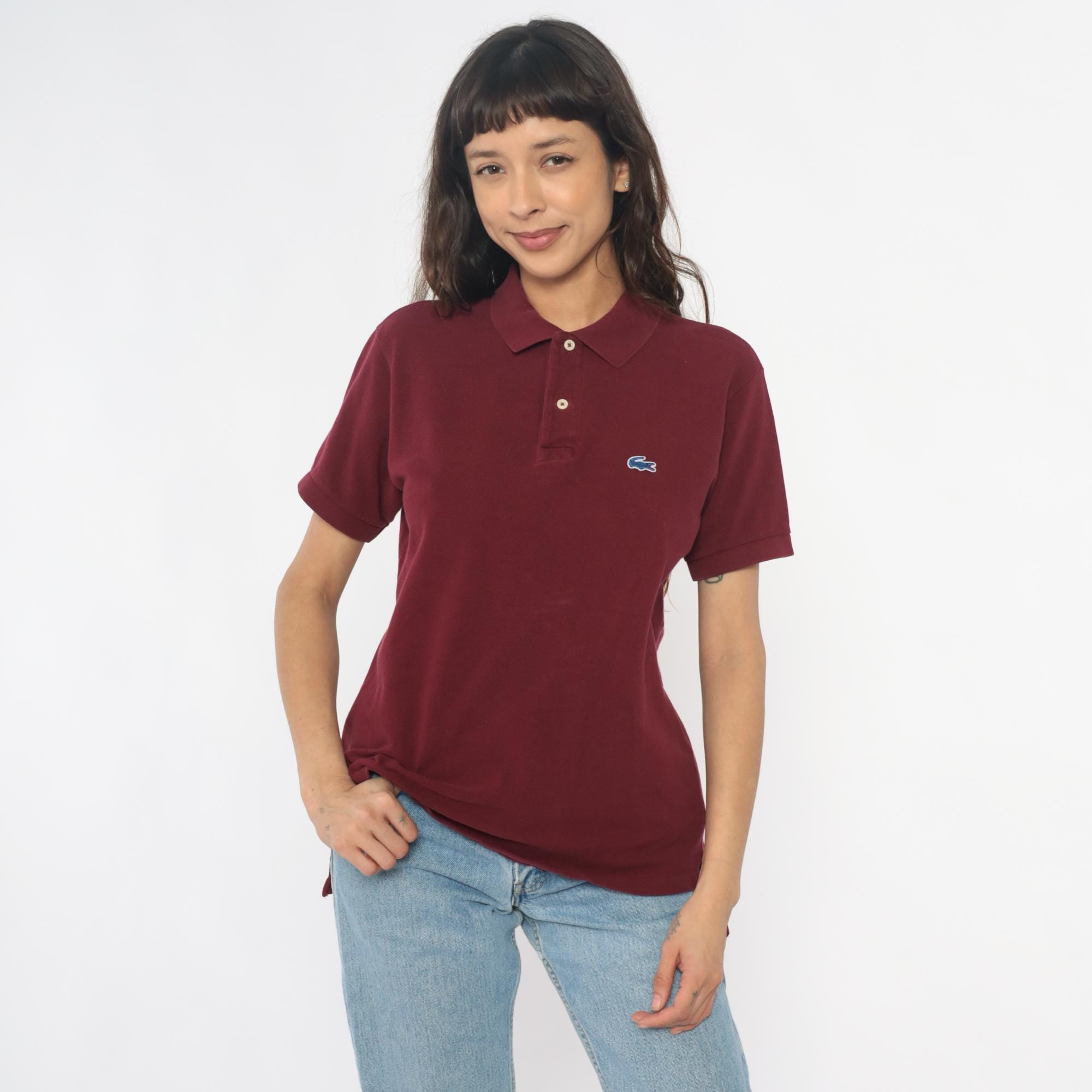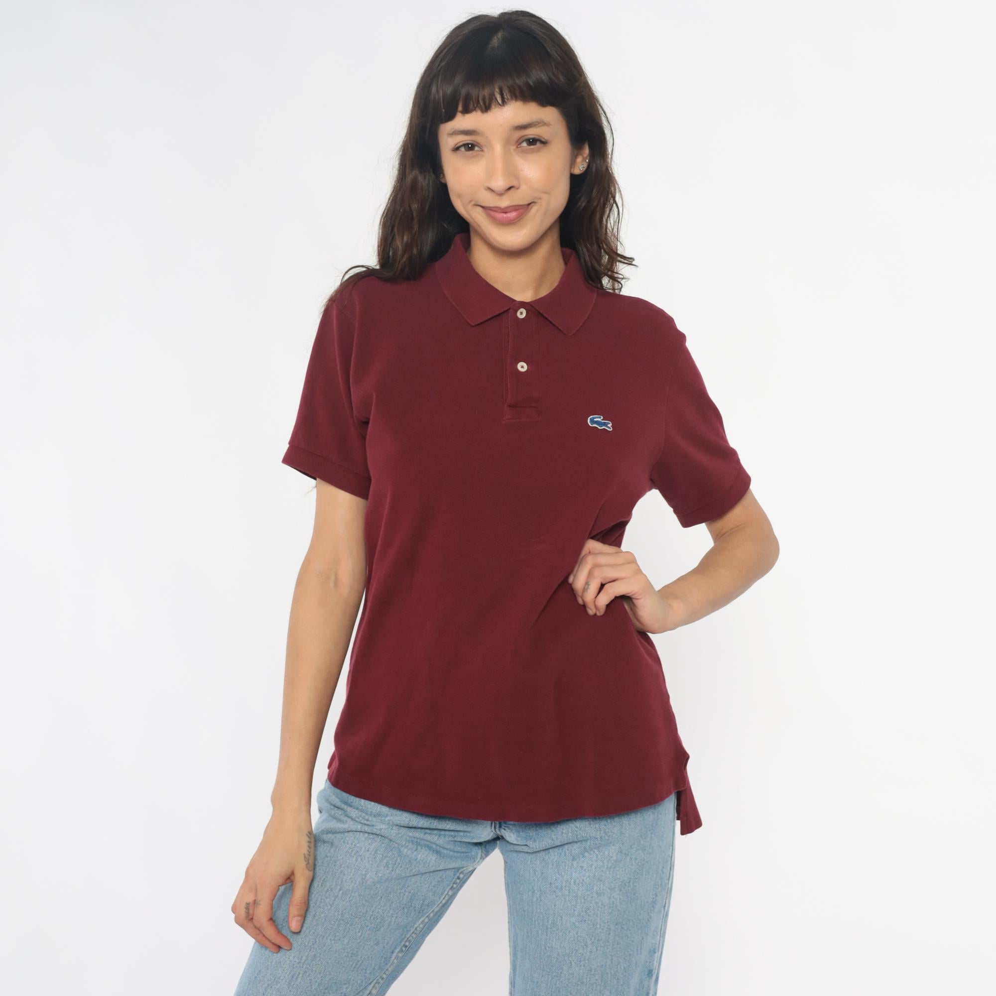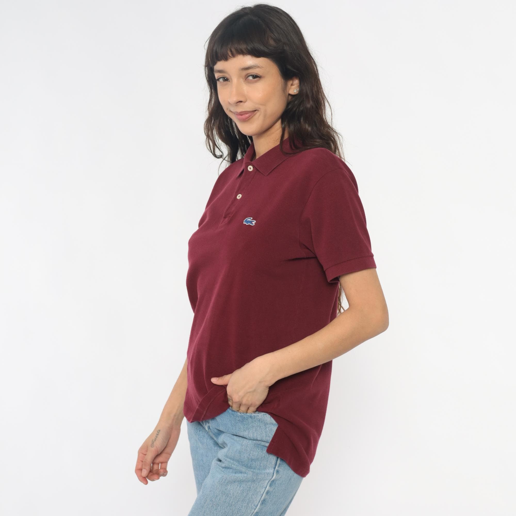 80s burgundy polo shirt from Izod Lacoste with embroidered crocodile logo on left chest. Two-button placket, ribbed collar and cuffs, short sleeves.