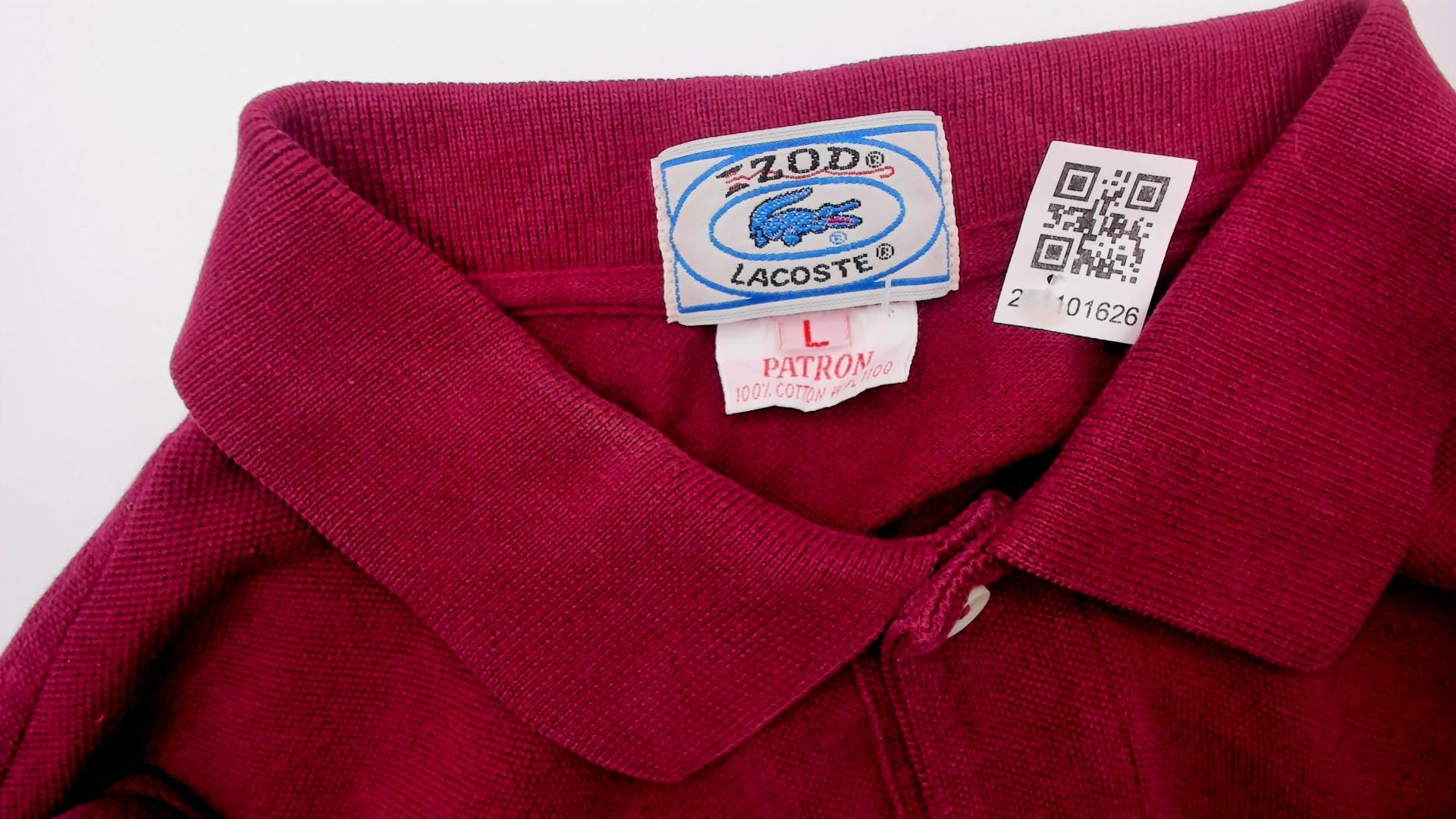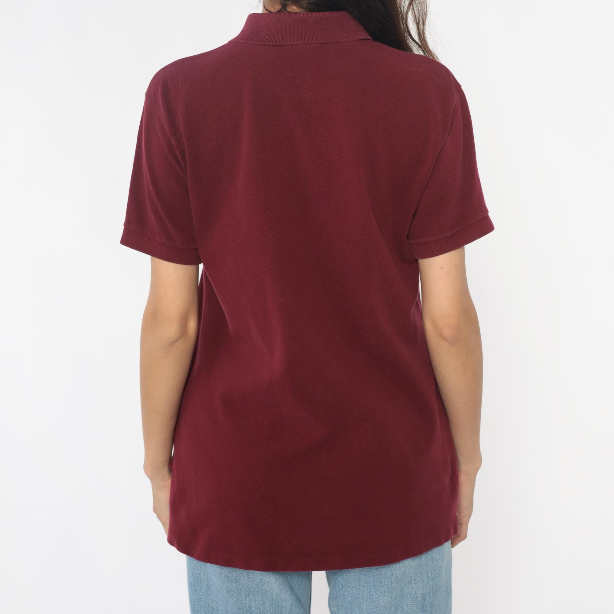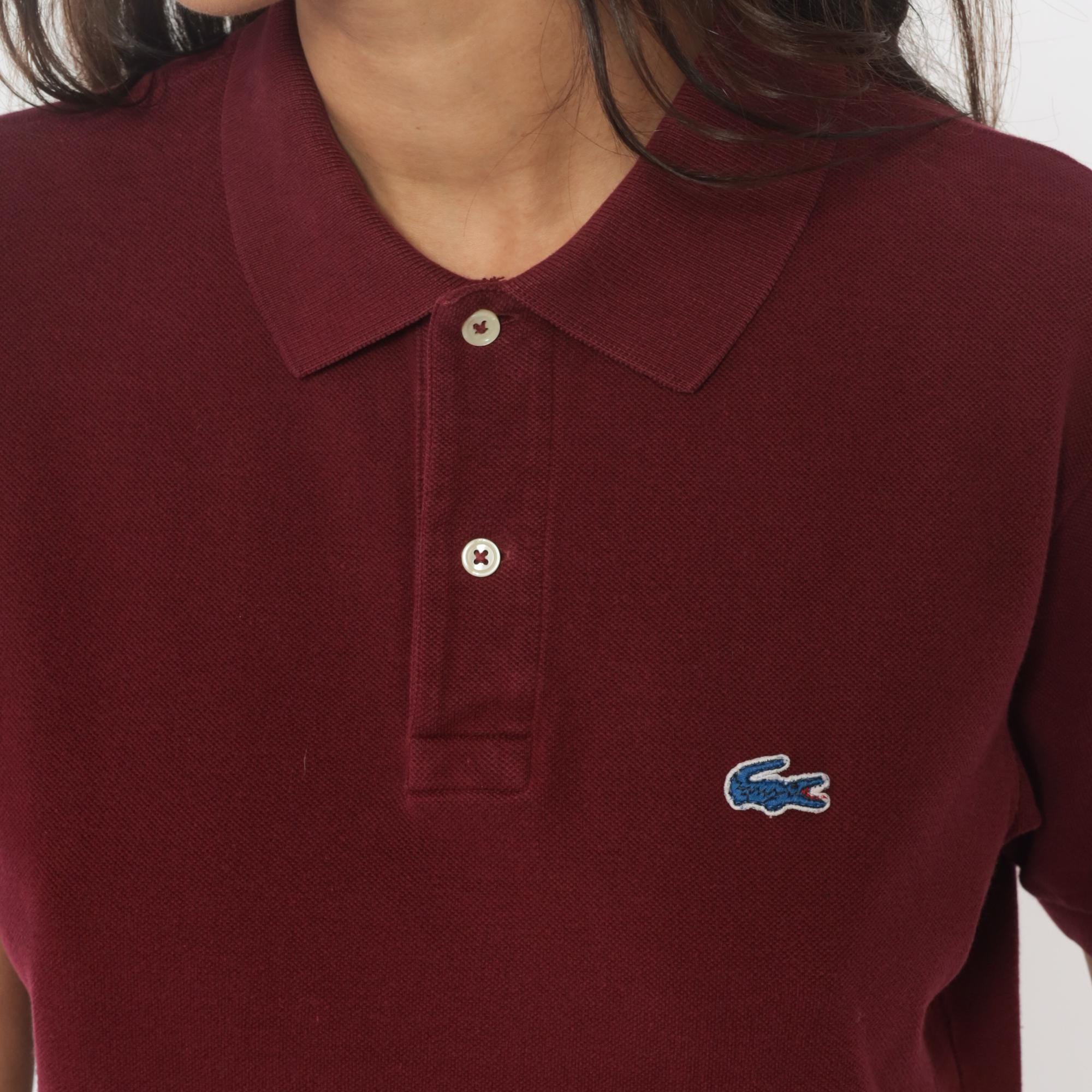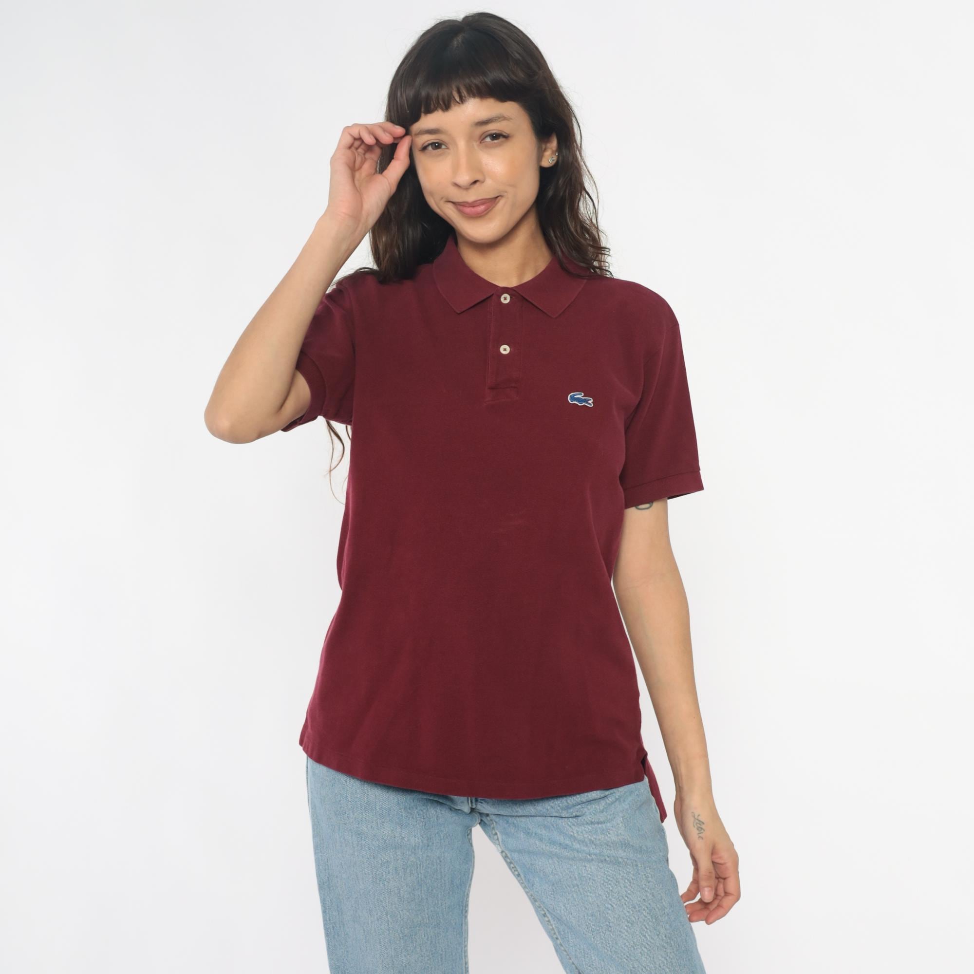 80s burgundy polo shirt from Izod Lacoste with embroidered crocodile logo on left chest. Two-button placket, ribbed collar and cuffs, short sleeves.