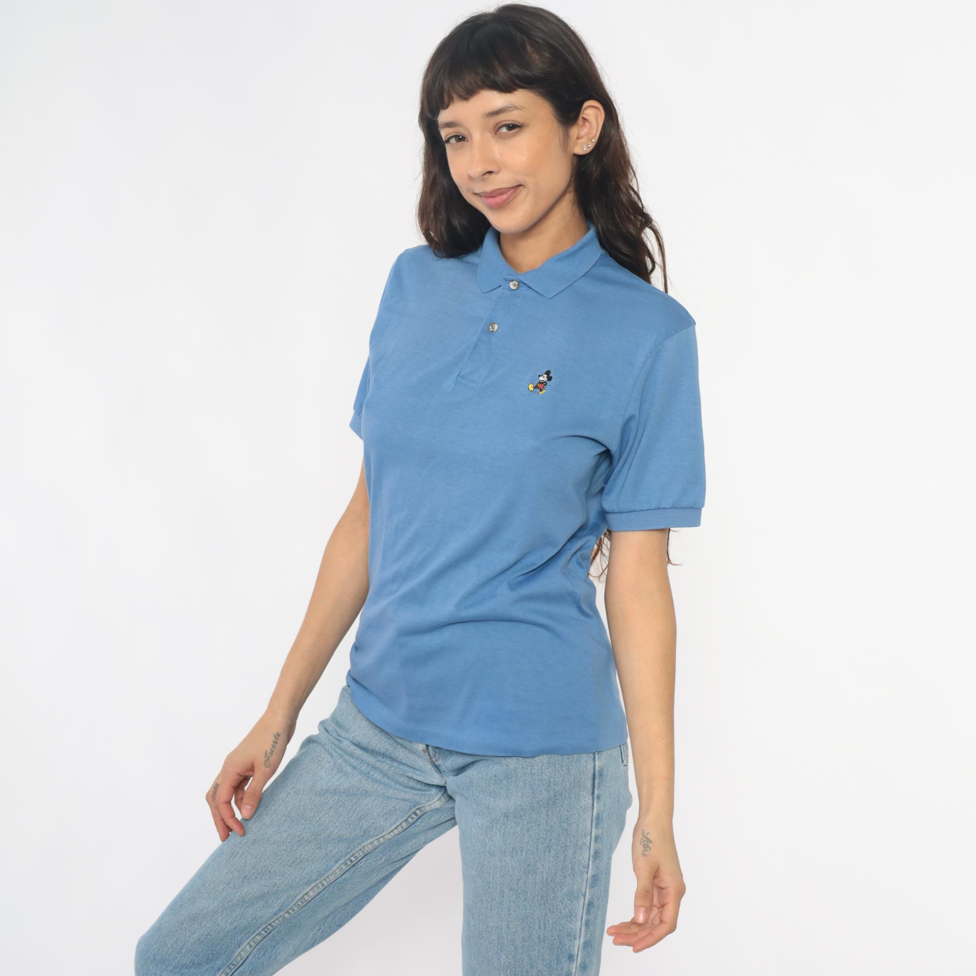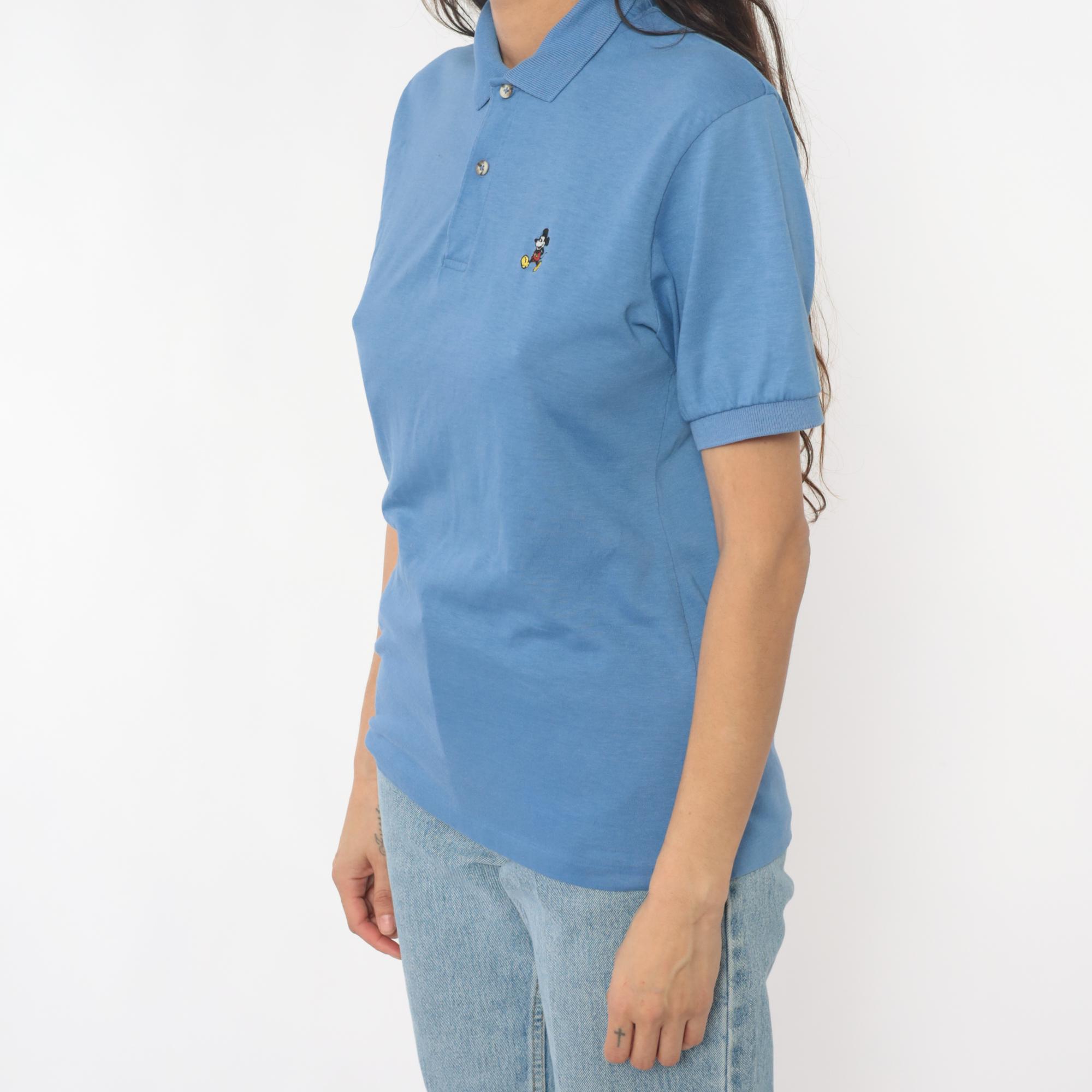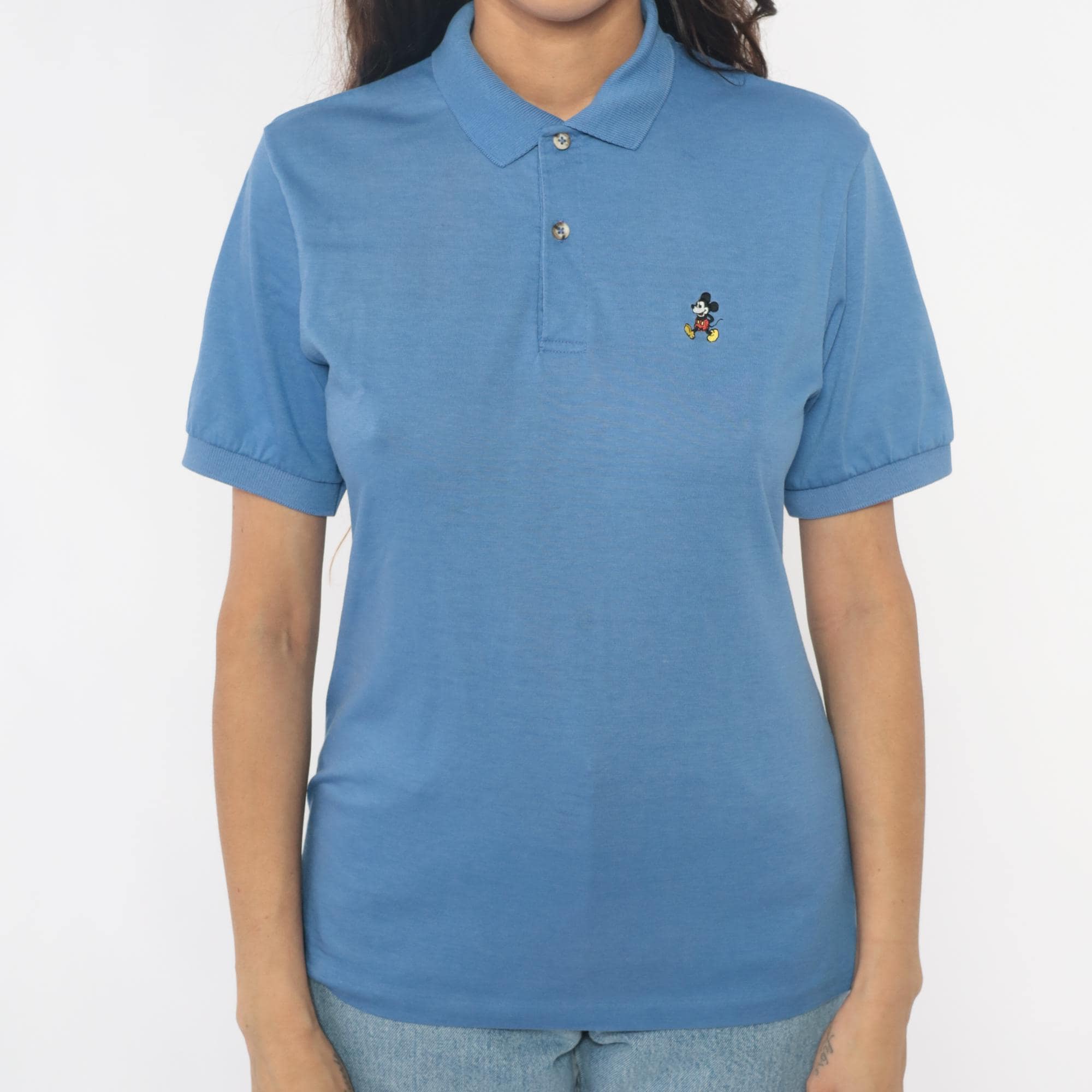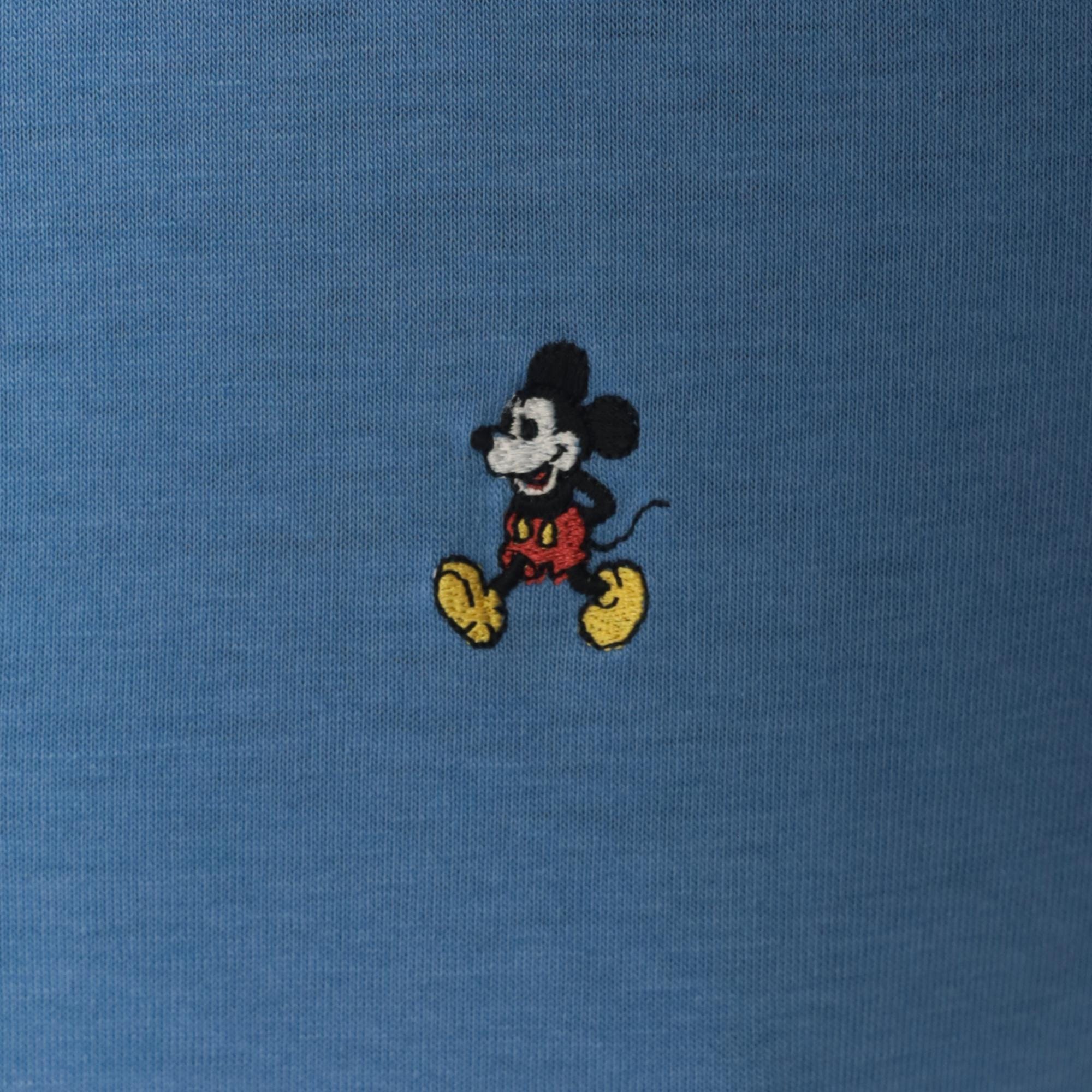 80s cornflower blue polo shirt with embroidered Mickey Mouse logo on the left chest. Collar with two-button placket, short sleeves with rolled cuffs.