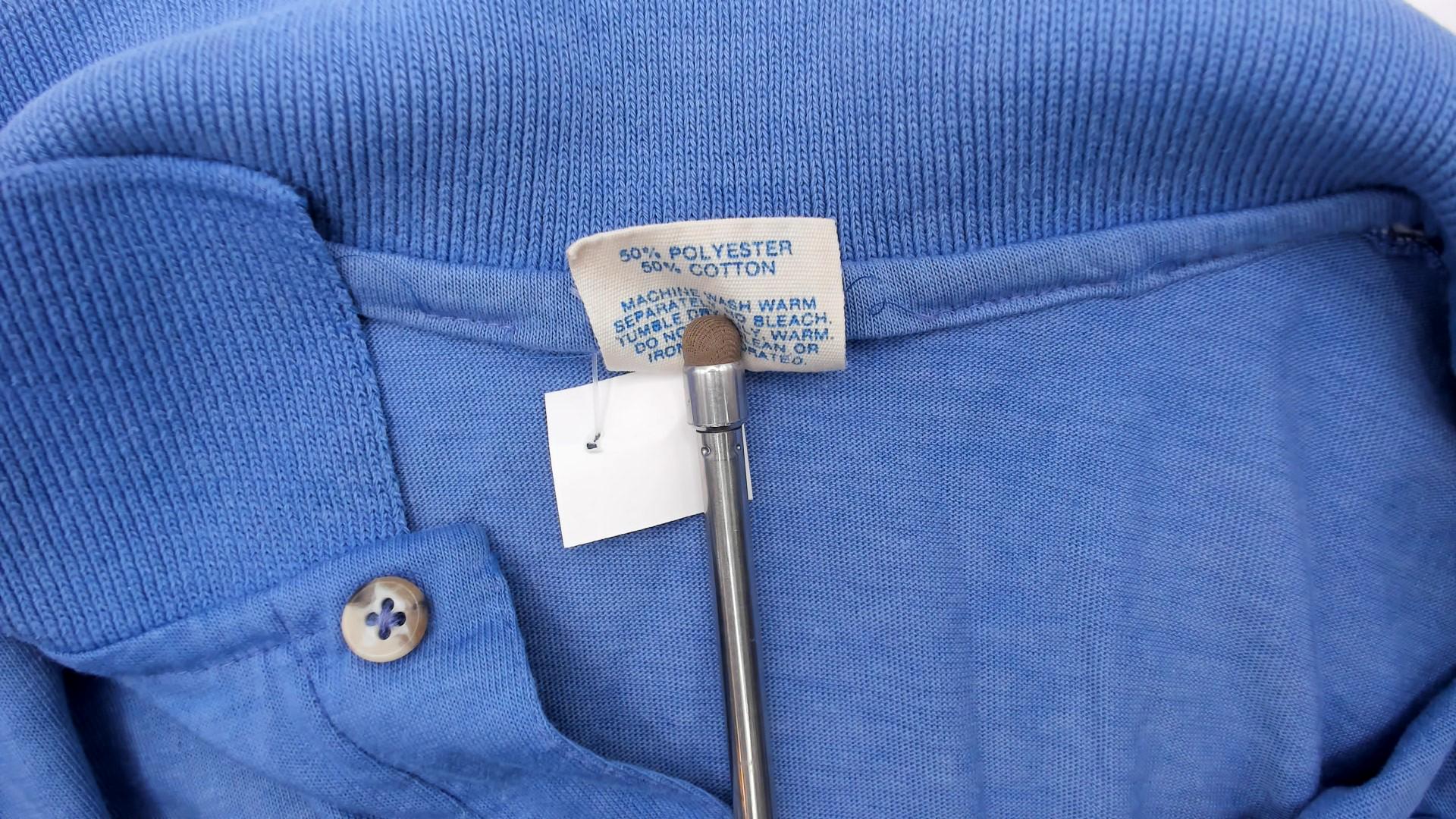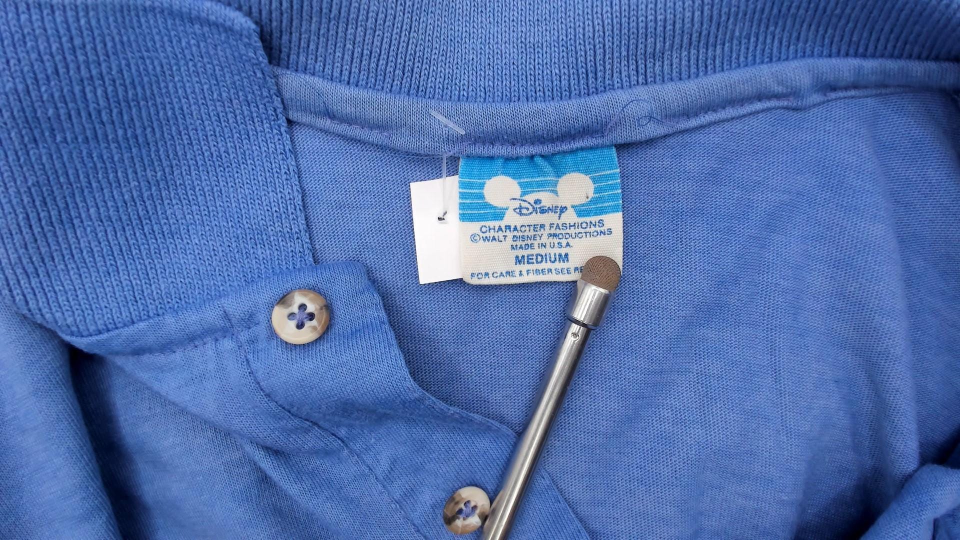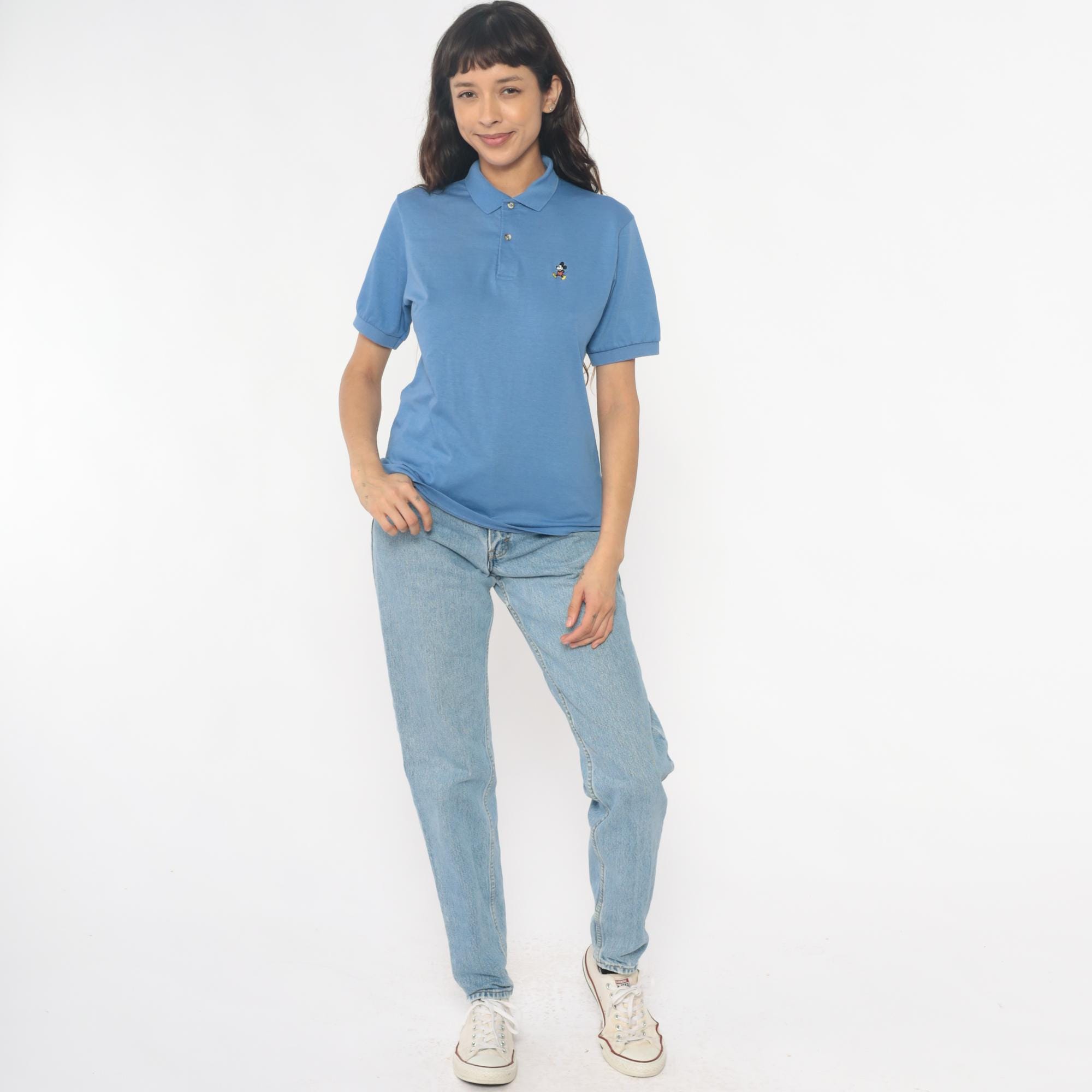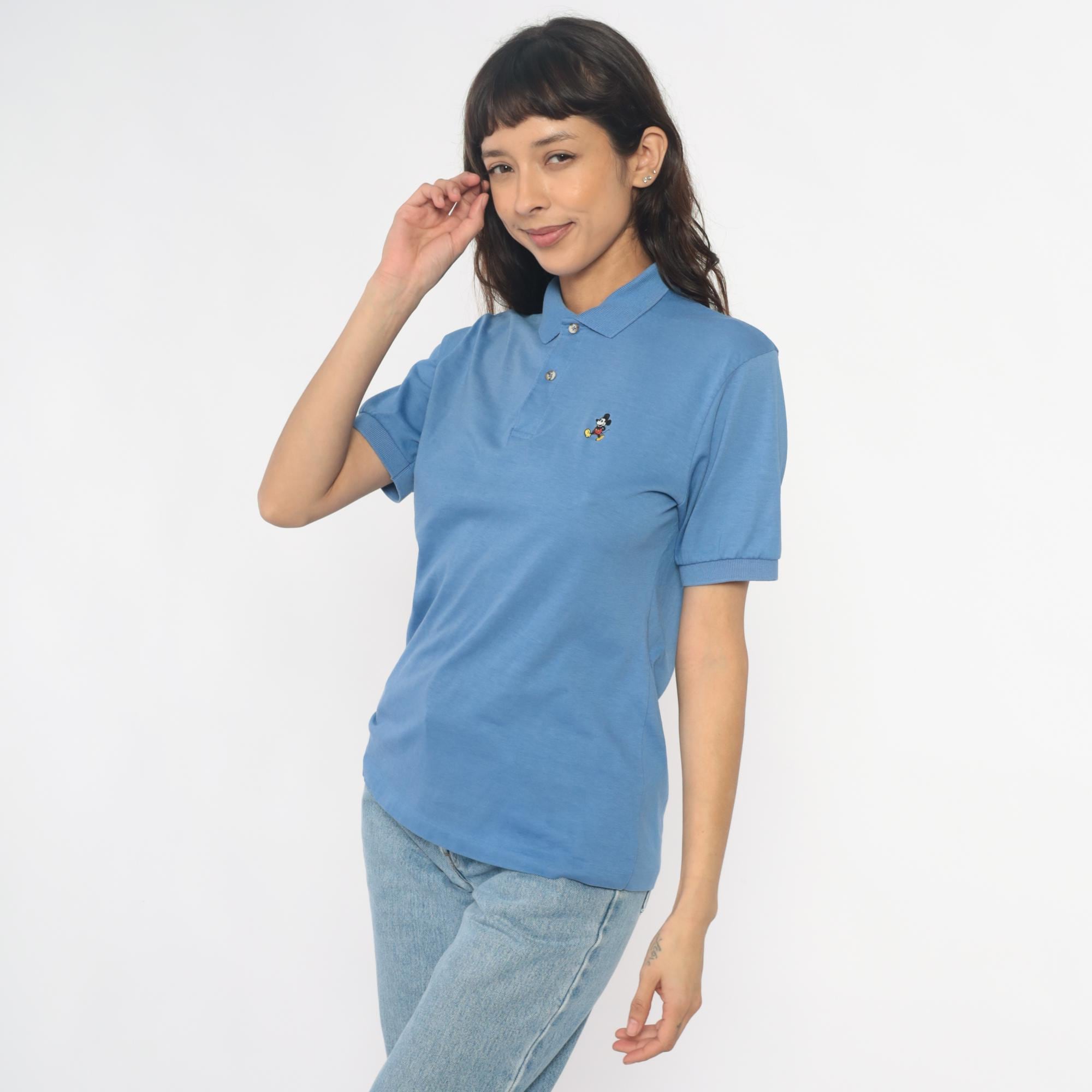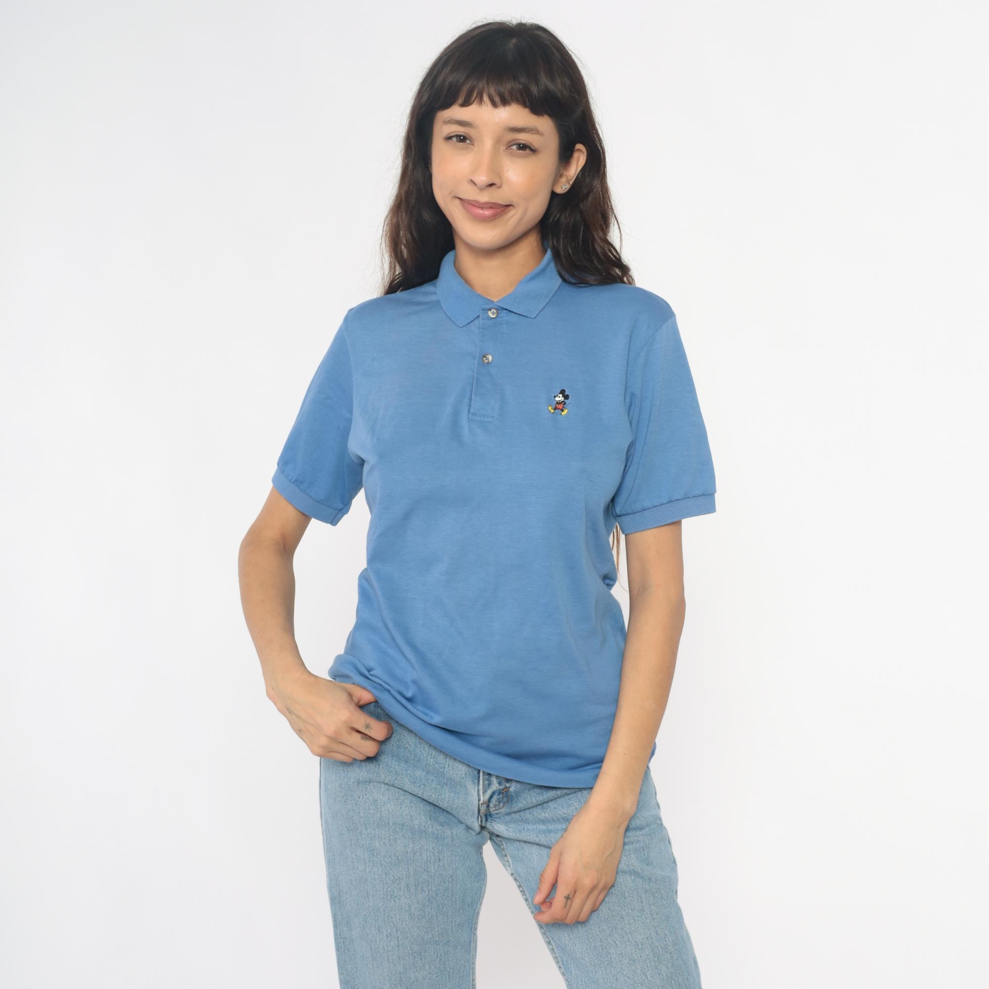 80s cornflower blue polo shirt with embroidered Mickey Mouse logo on the left chest. Collar with two-button placket, short sleeves with rolled cuffs.