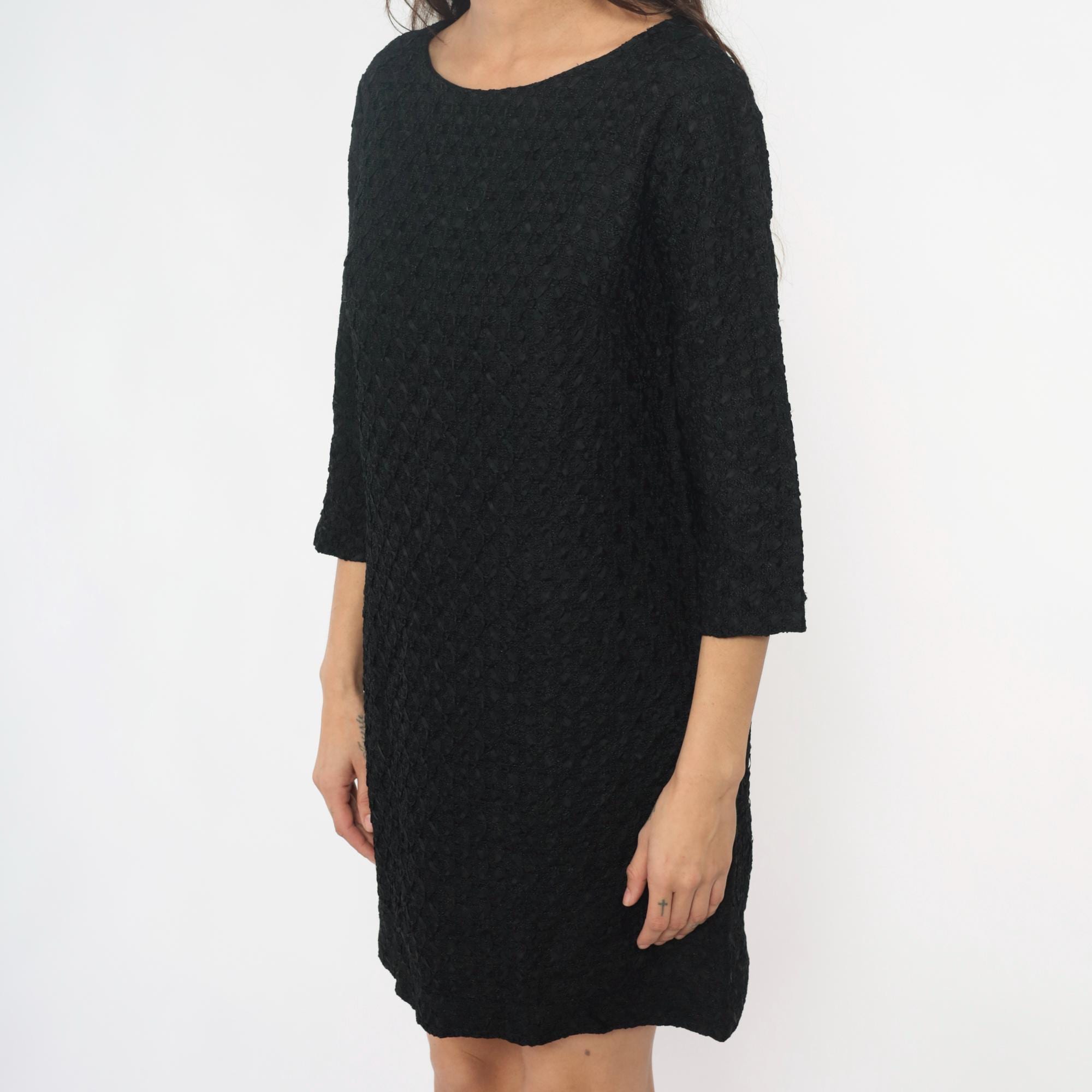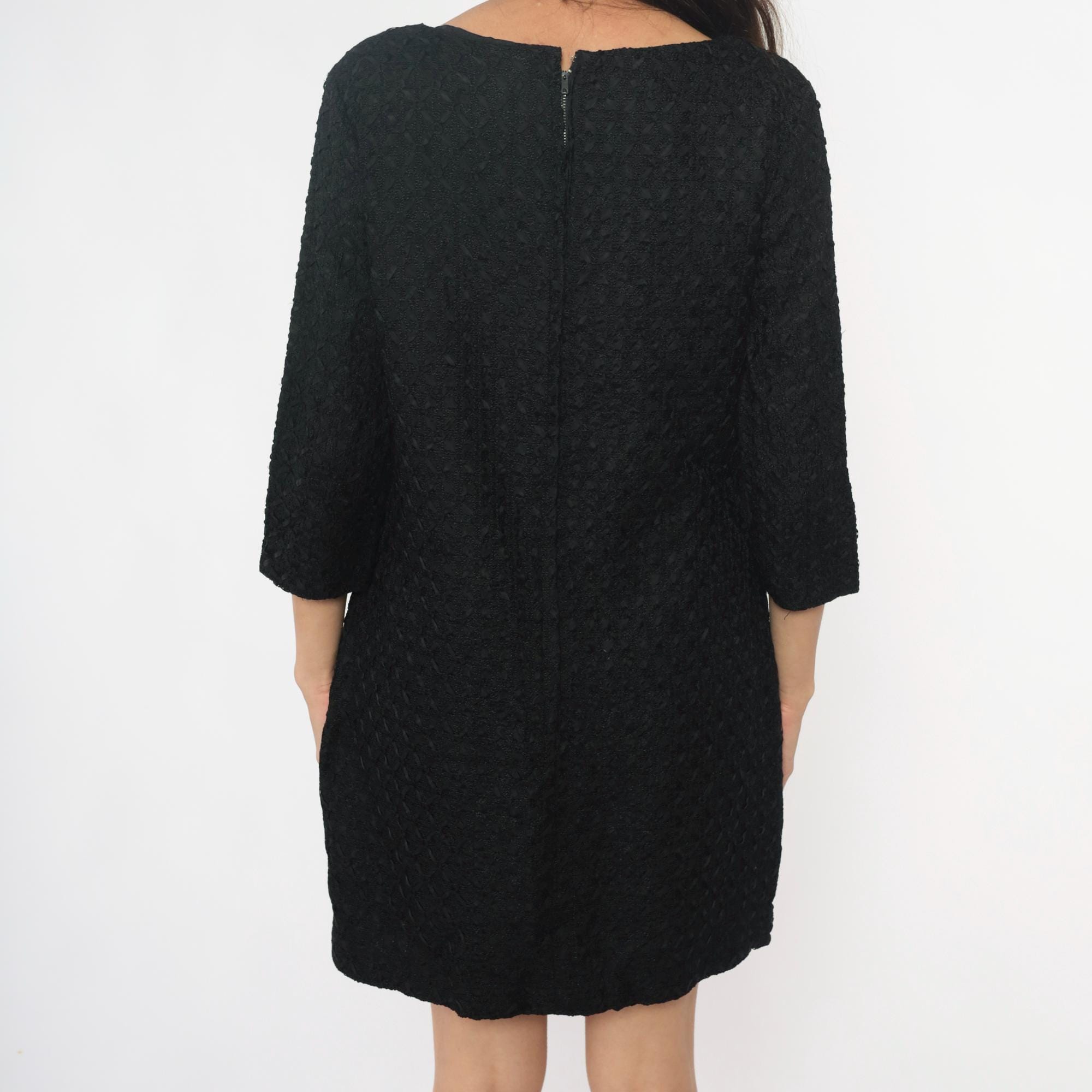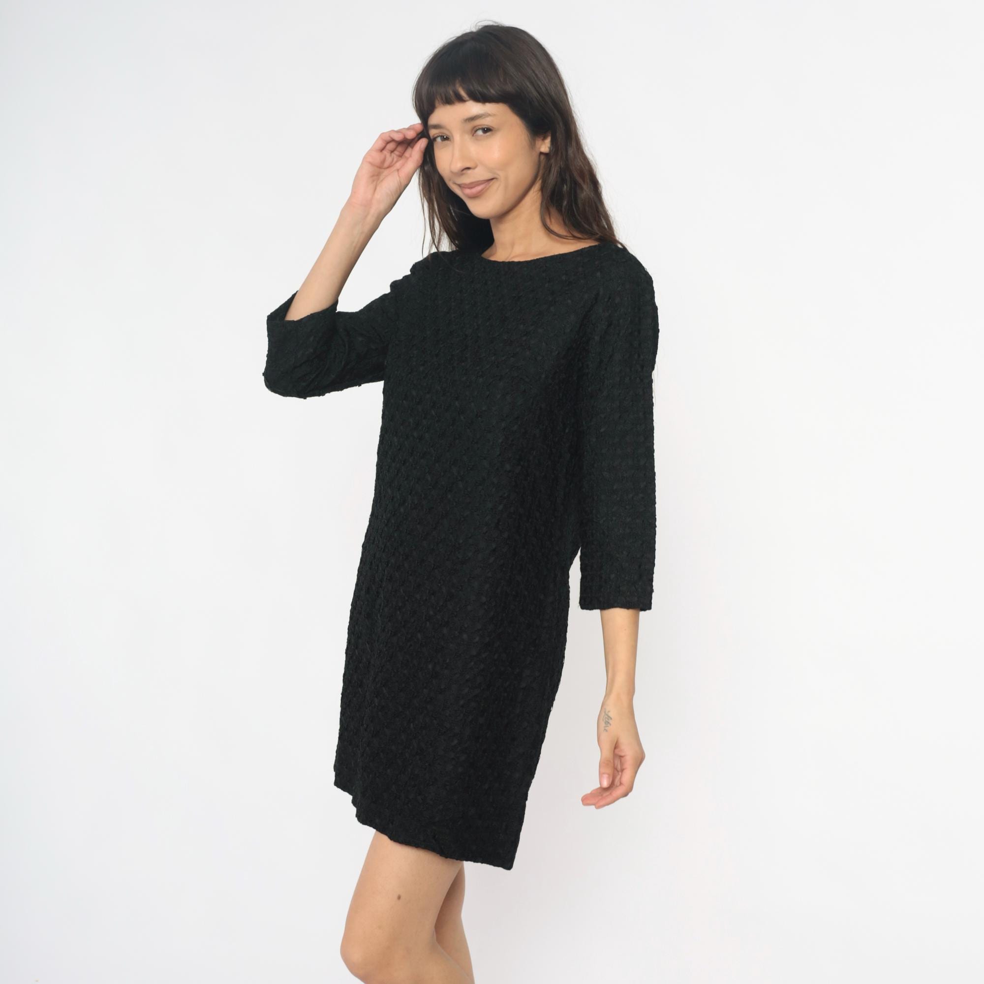 60s black shift dress in textured boucle-style fabric with allover loop texture. Boat neckline, three-quarter length sleeves, straight boxy silhouette.