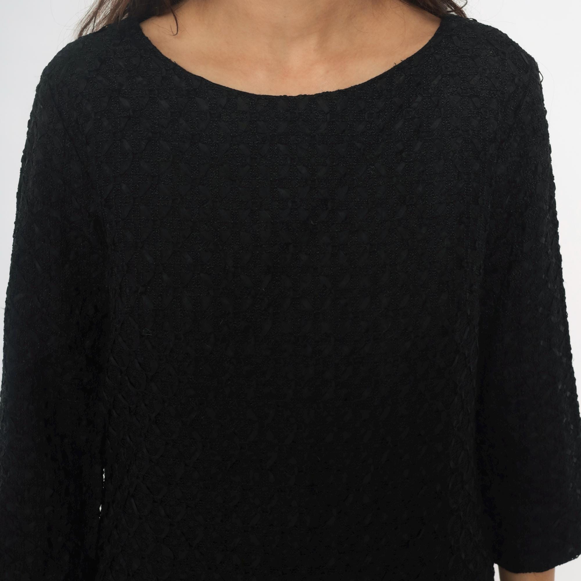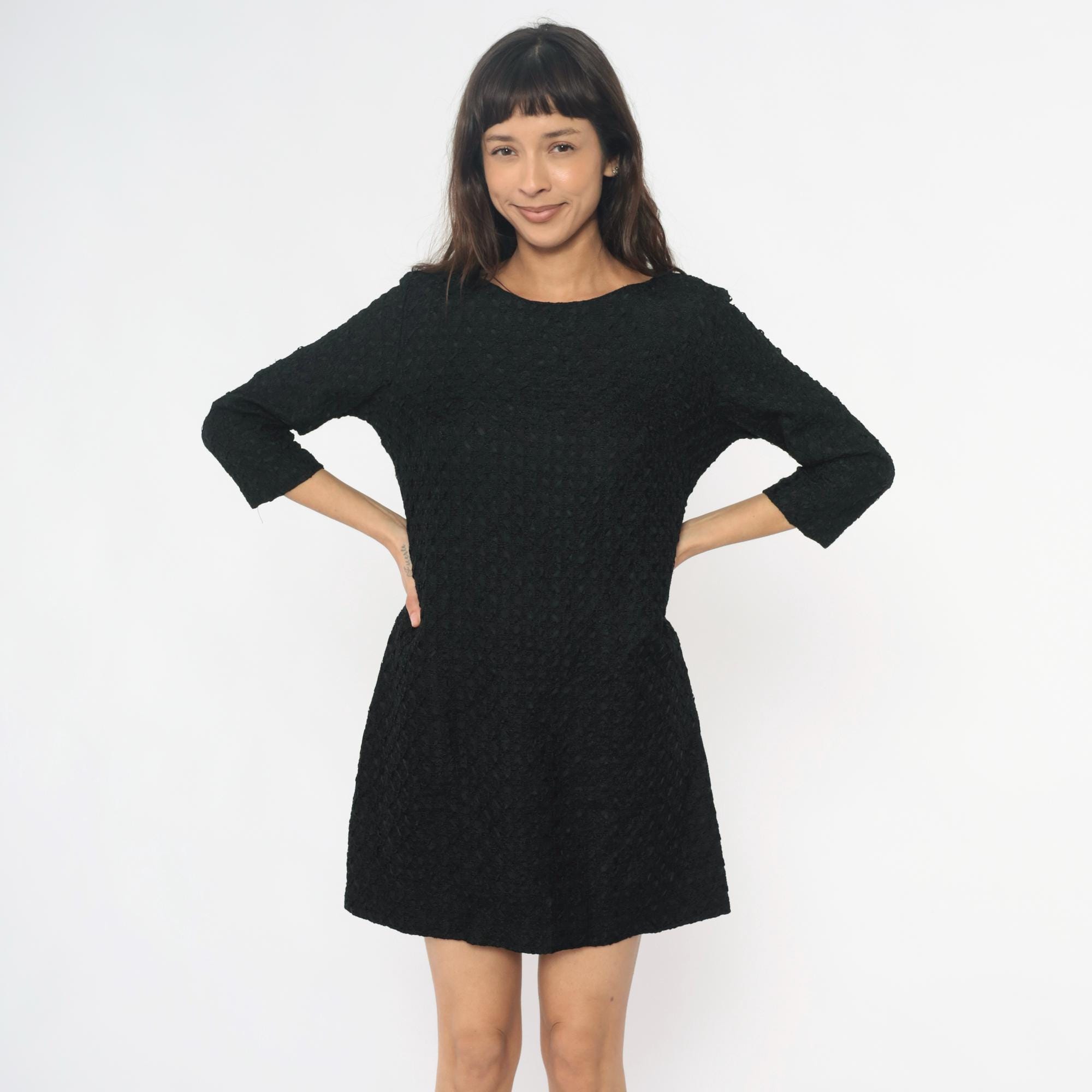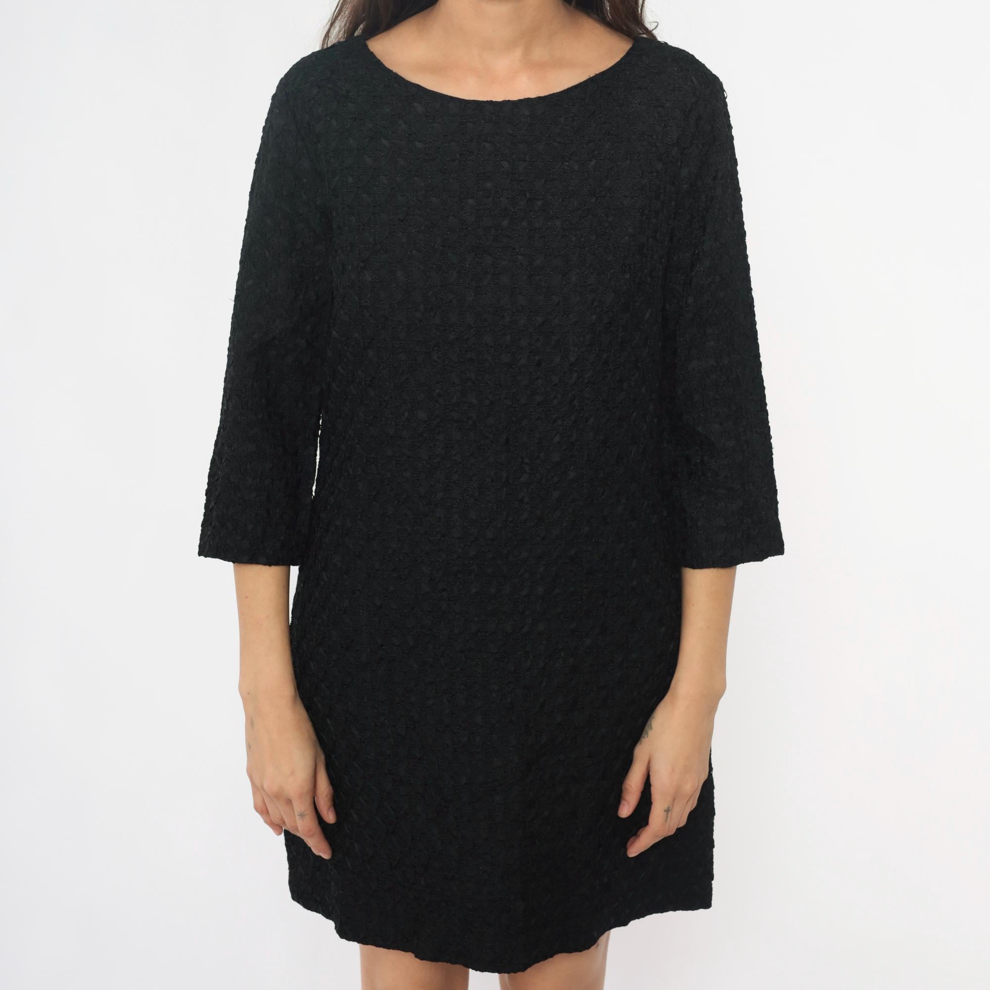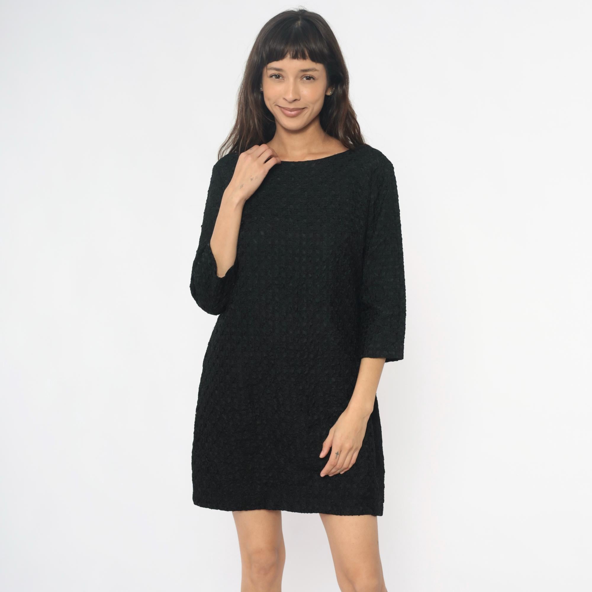 60s black shift dress in textured boucle-style fabric with allover loop texture. Boat neckline, three-quarter length sleeves, straight boxy silhouette.