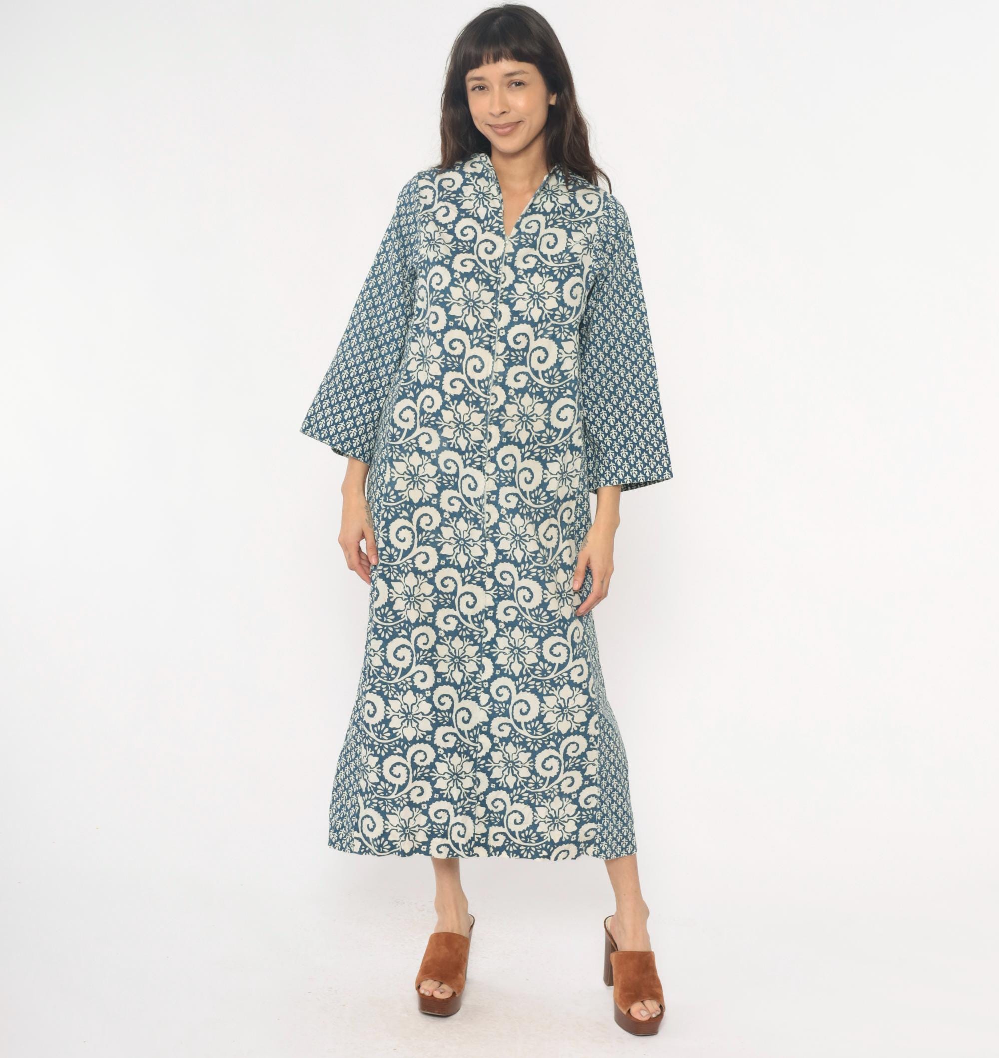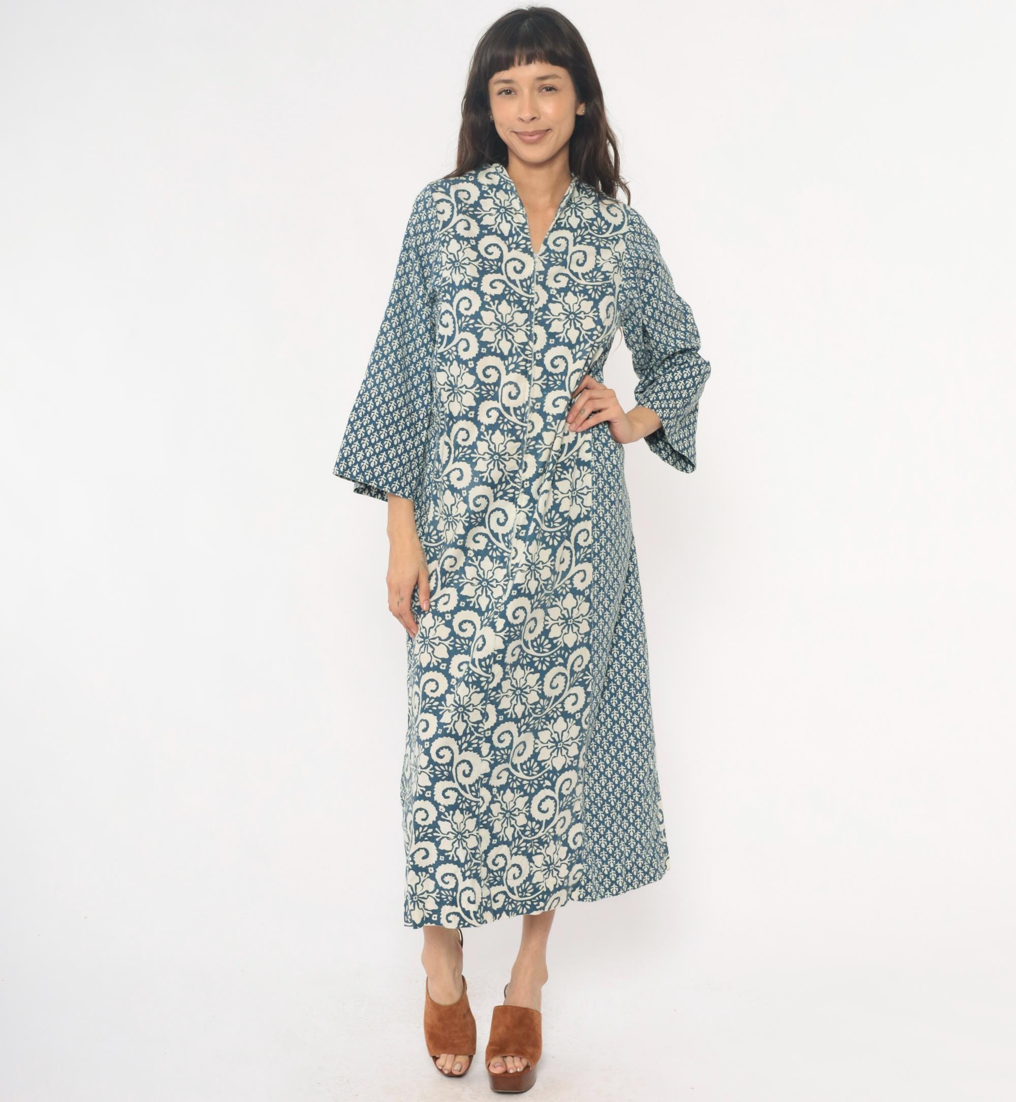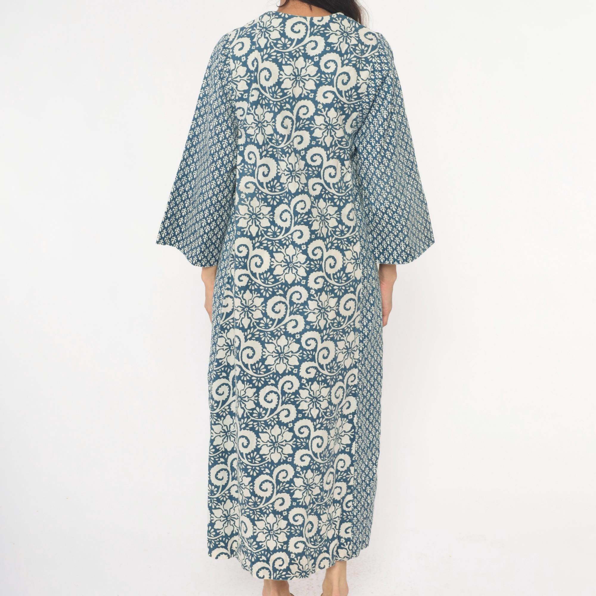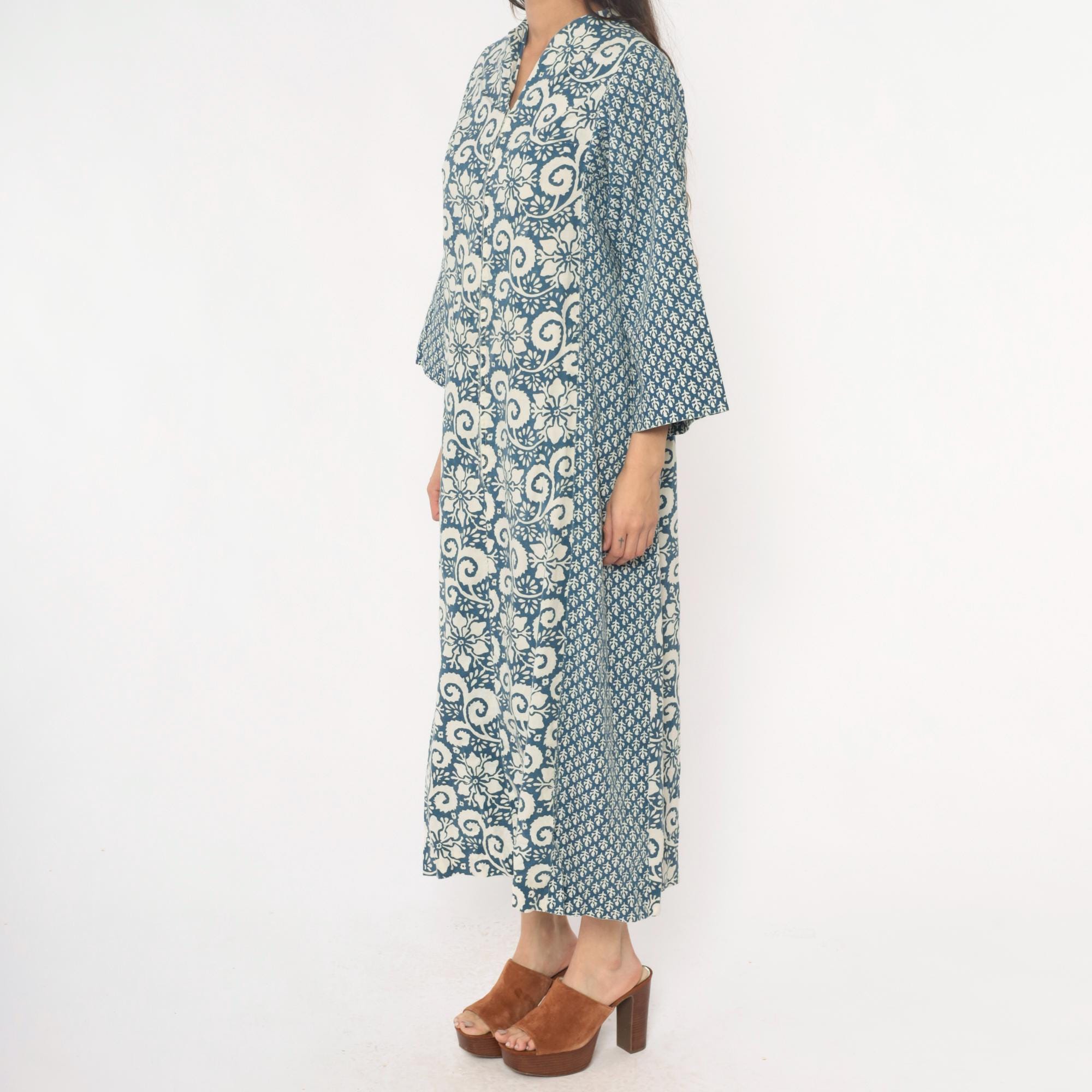 70s blue and cream floral maxi dress with mixed print design, large floral motif down the center panel and smaller geometric print on sleeves and side panels. V-neckline with notched collar, button front closure, three-quarter sleeves.