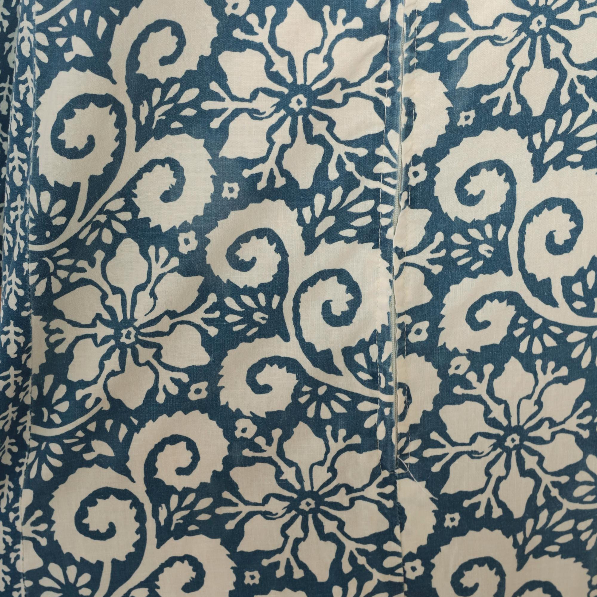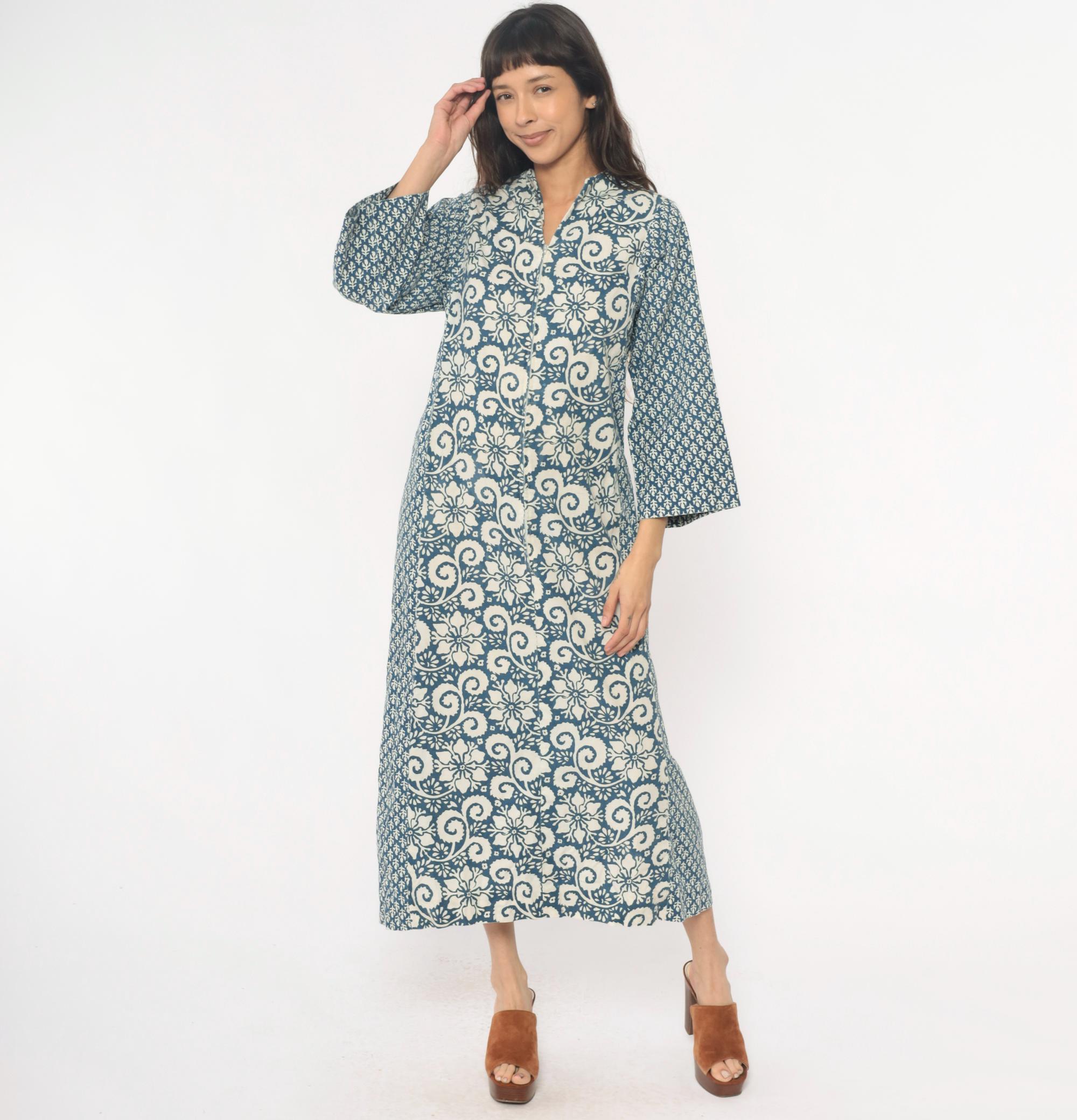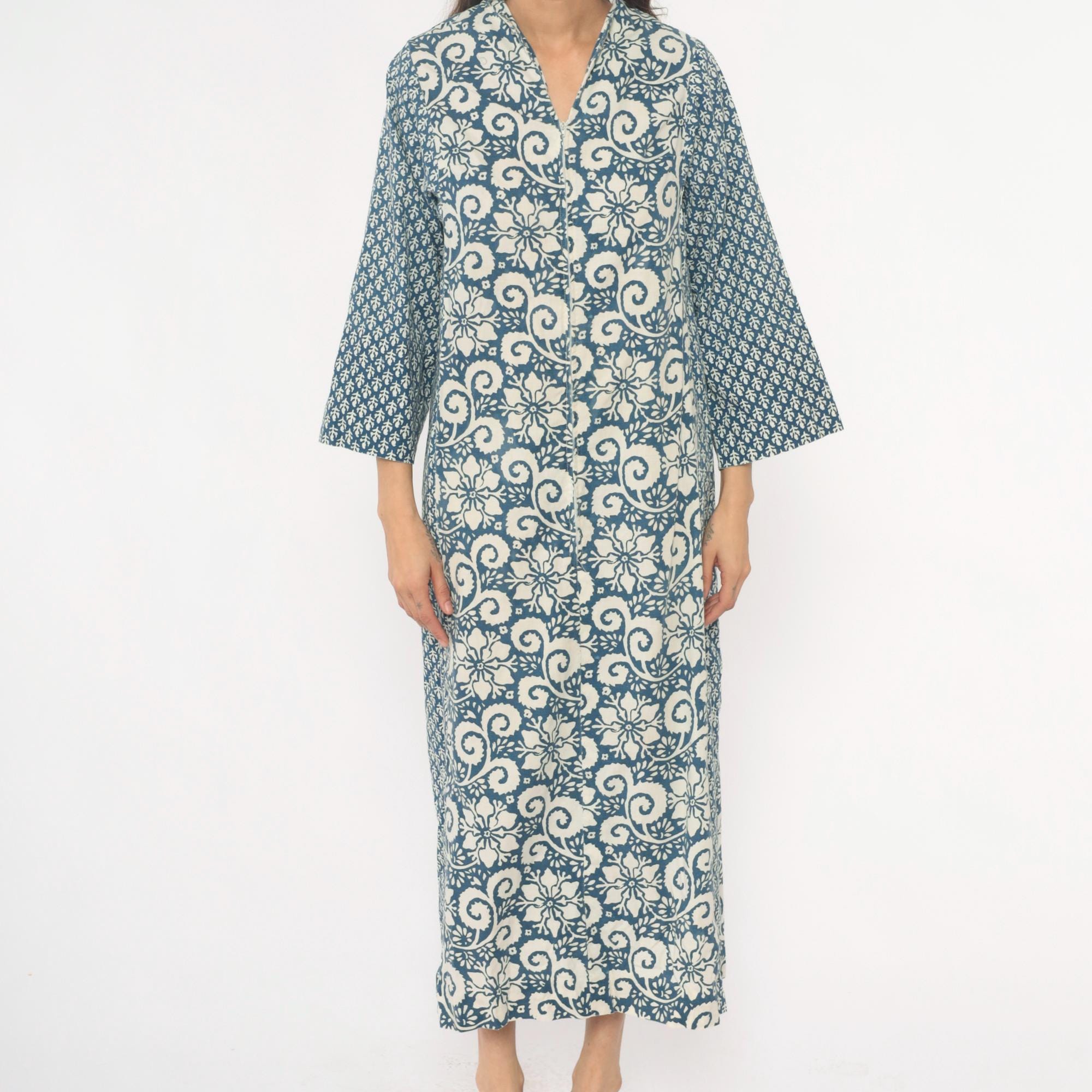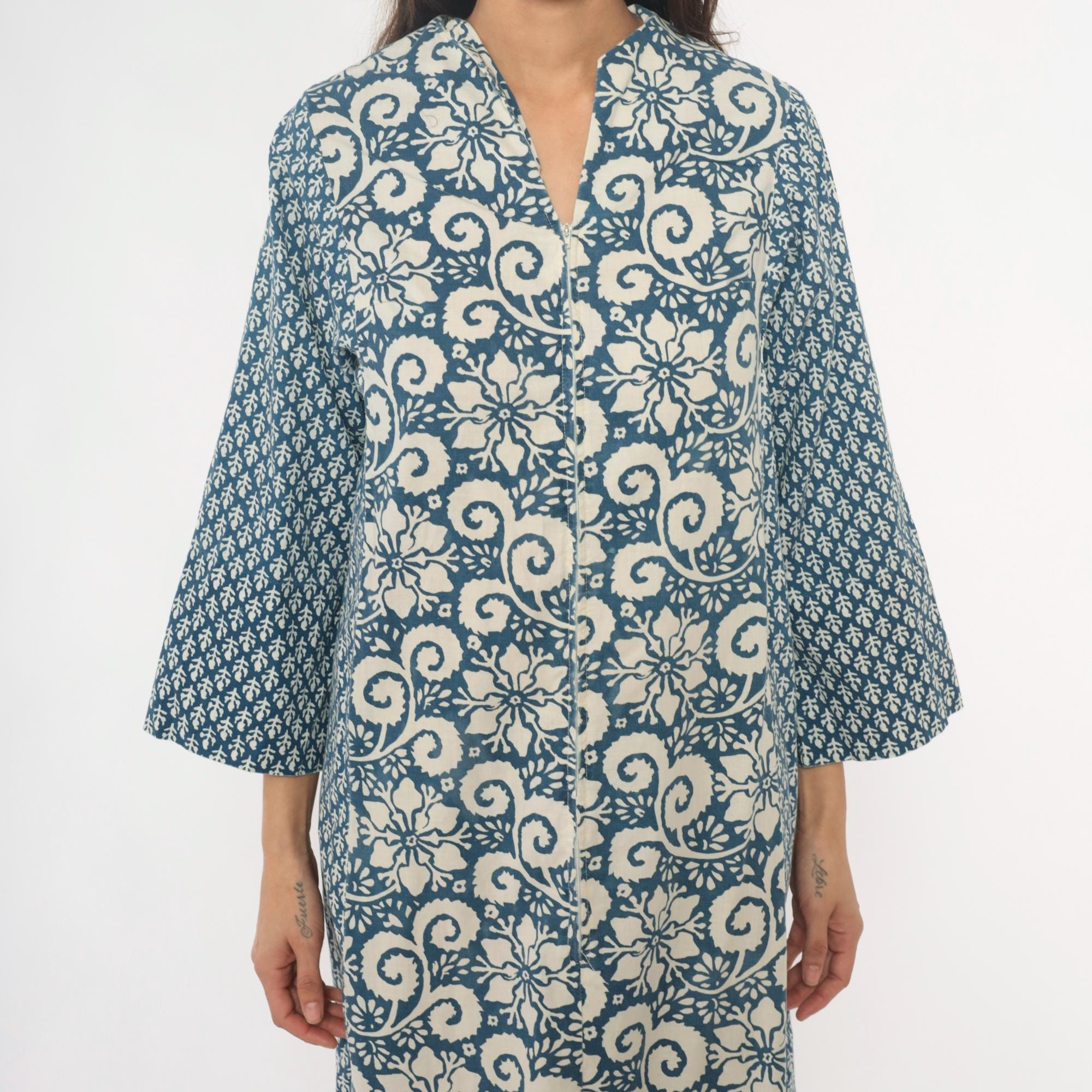 70s blue and cream floral maxi dress with mixed print design, large floral motif down the center panel and smaller geometric print on sleeves and side panels. V-neckline with notched collar, button front closure, three-quarter sleeves.