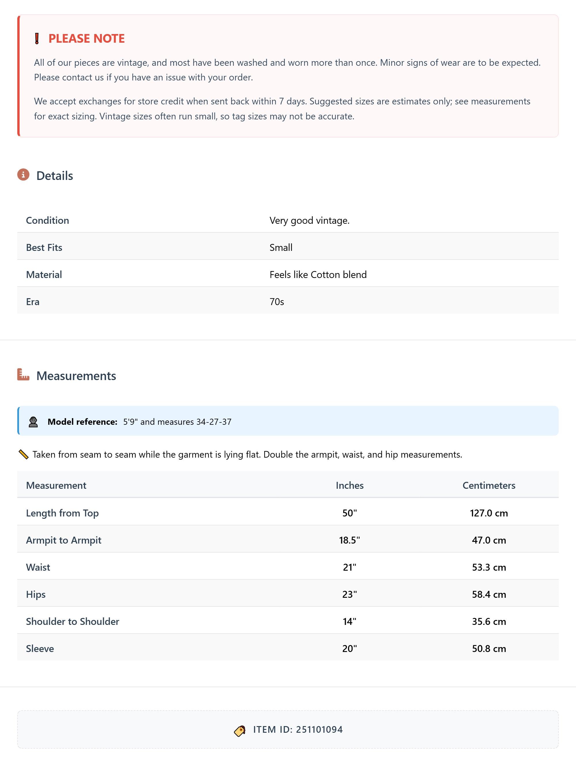 All of our pieces are vintage, and most have been washed and worn more than once. Minor signs of wear are to be expected. Please contact us if you have an issue with your order. We accept exchanges for store credit when sent back within 7 days.