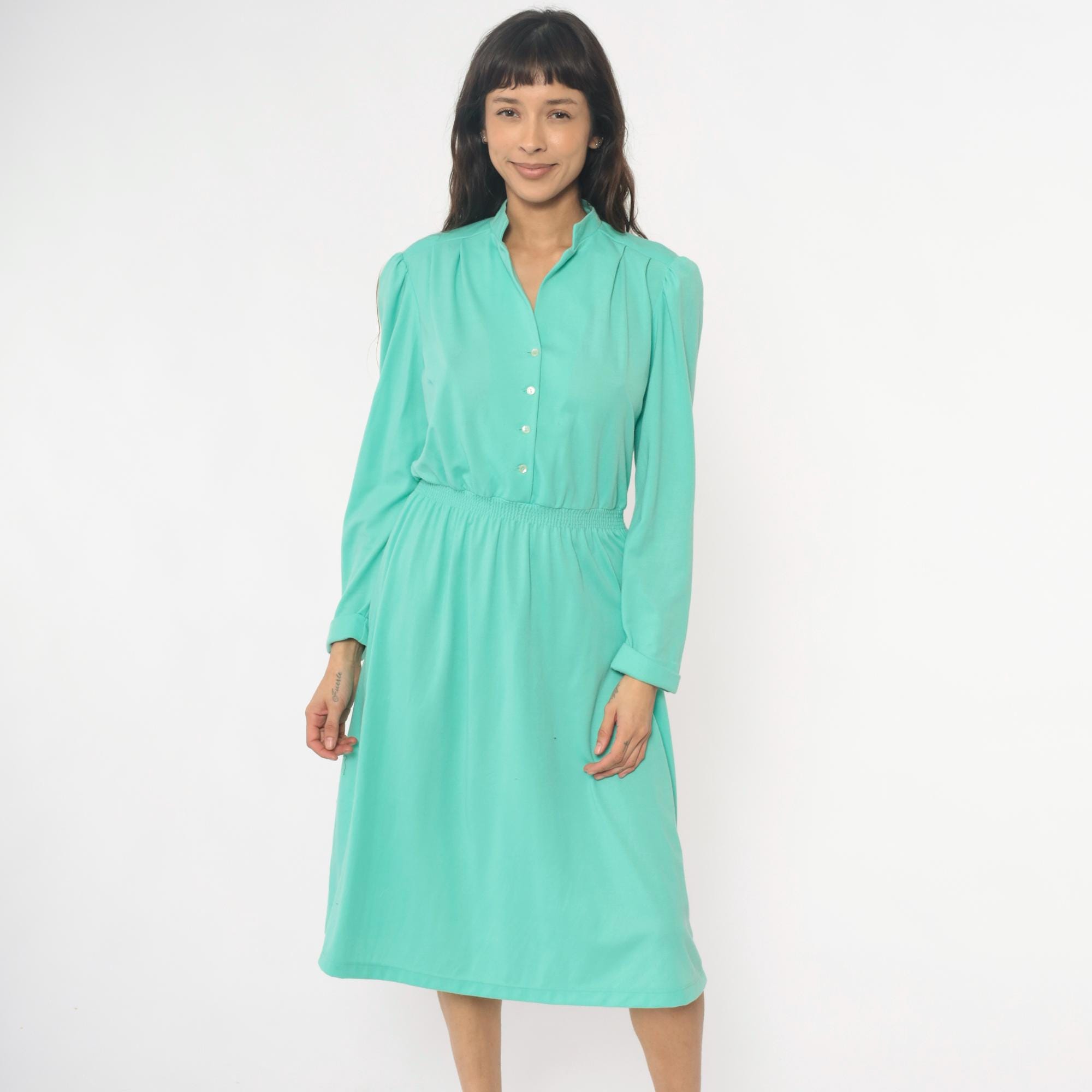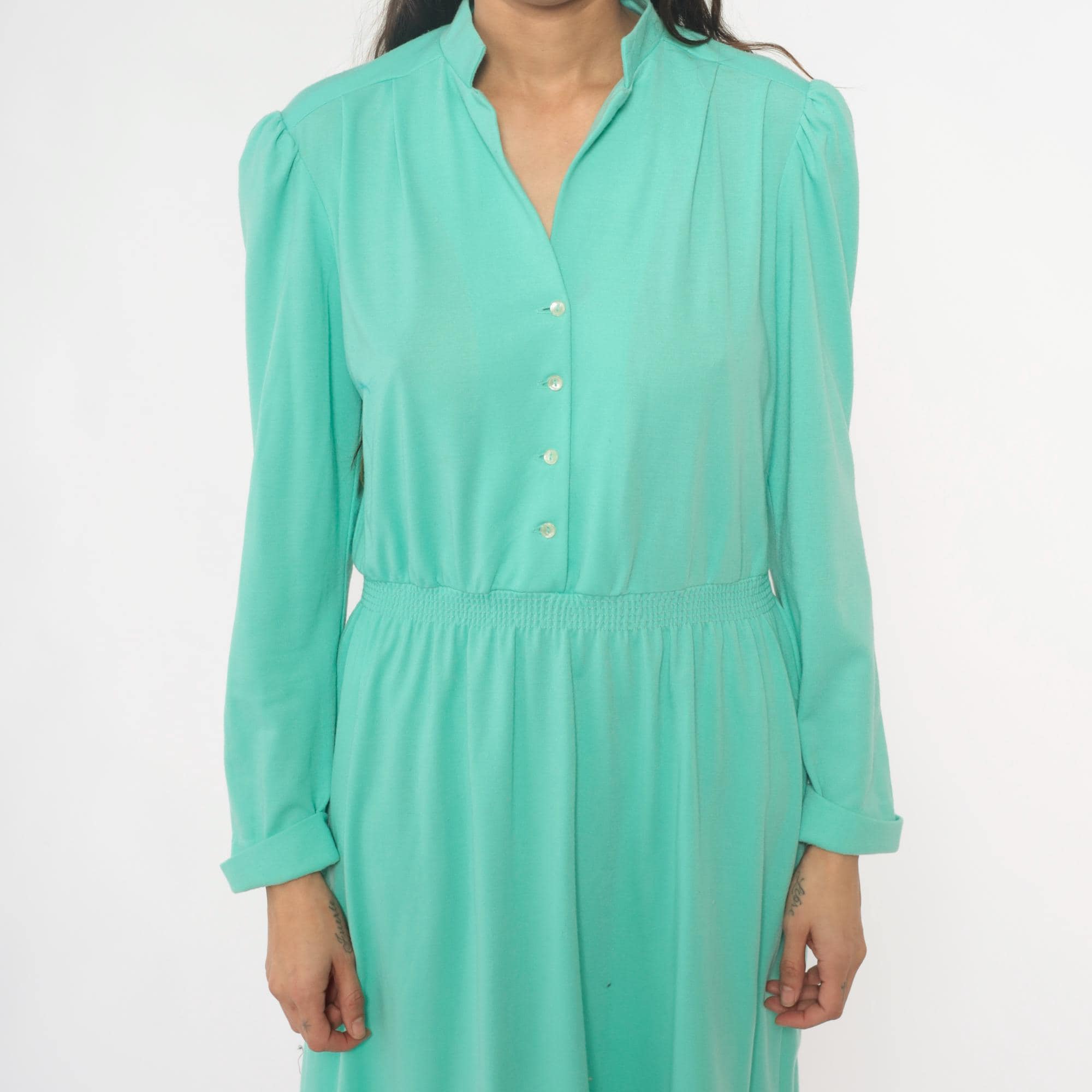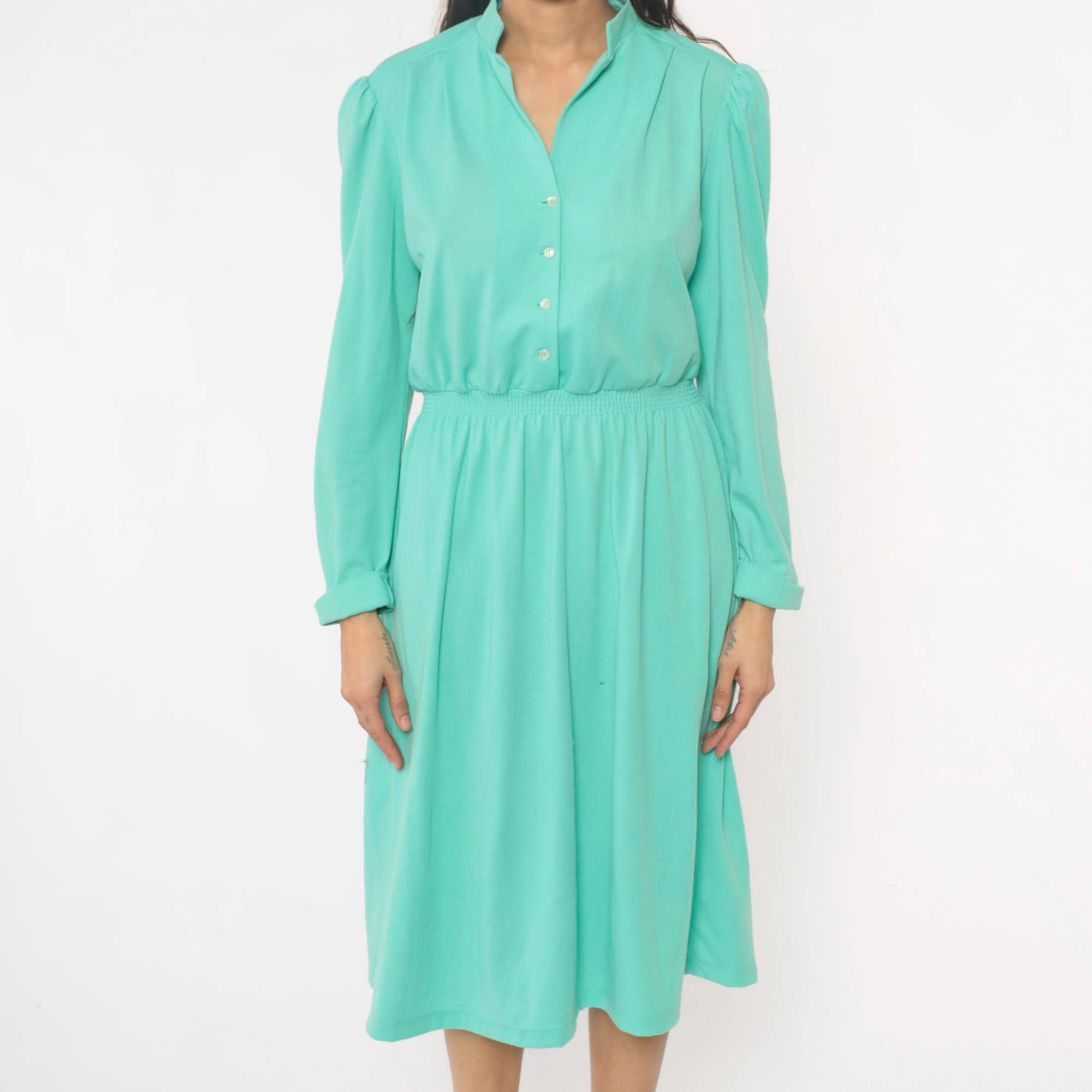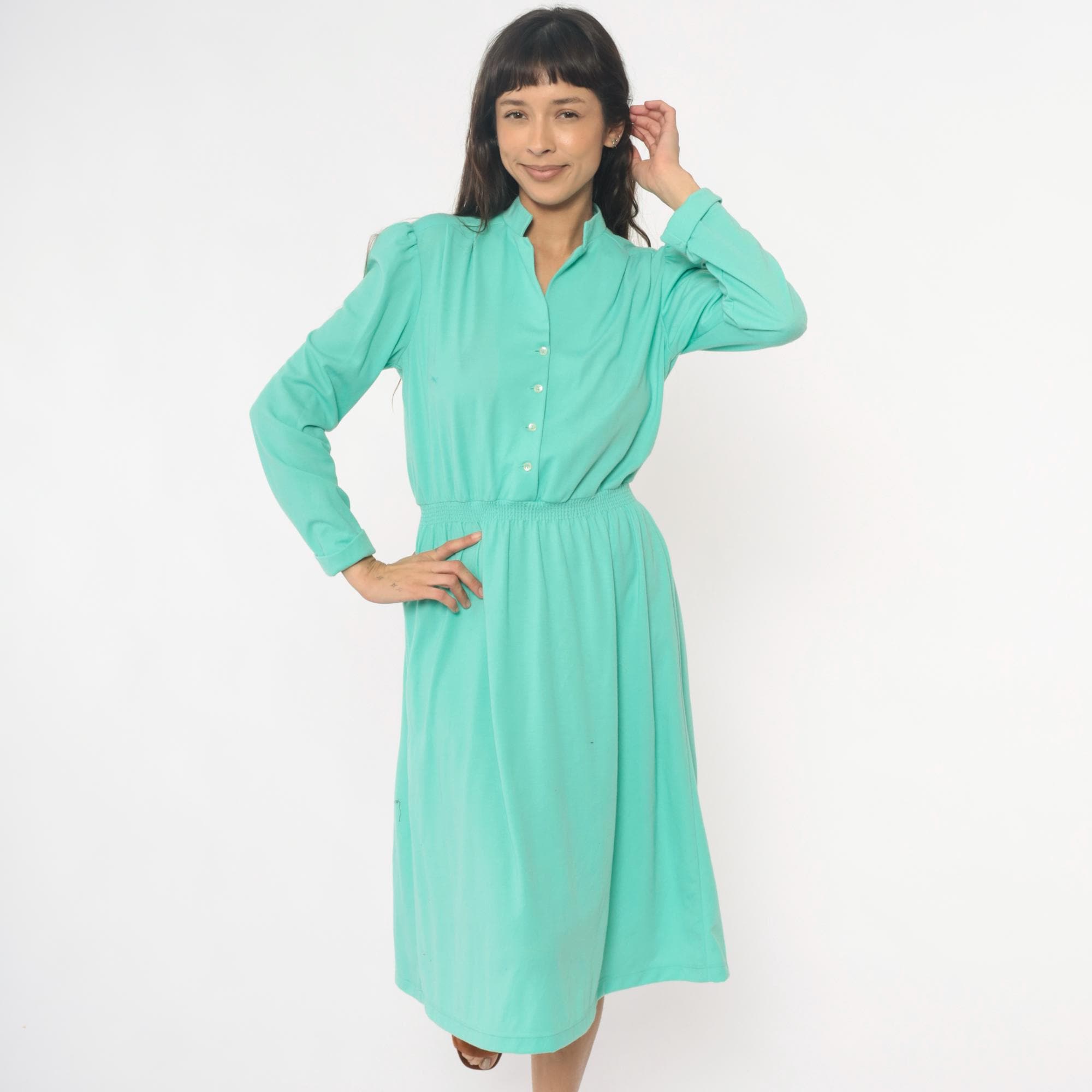 80s mint green shirtdress from lehigh with notched collar, button front closure, and long sleeves. Elastic gathered waistband between bodice and knee-length skirt, puffed shoulder detail.