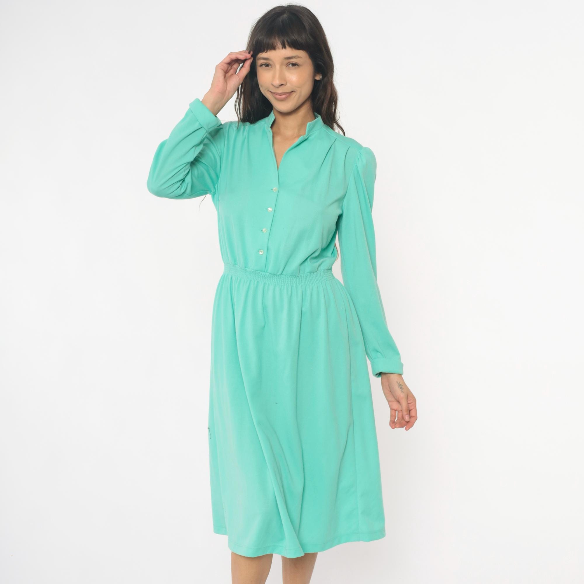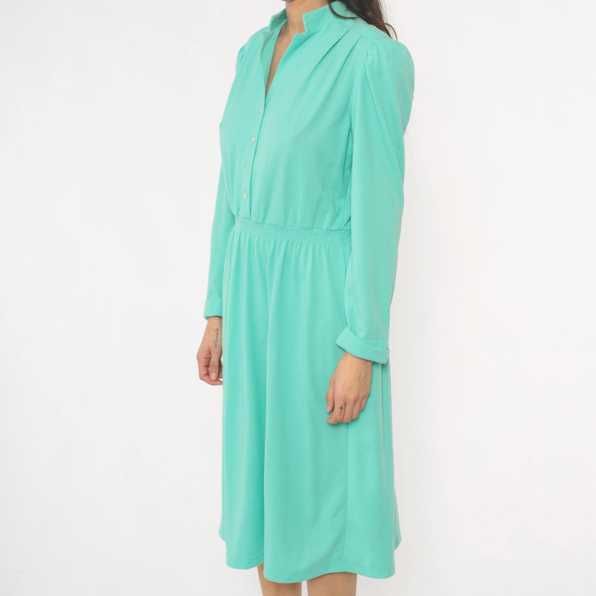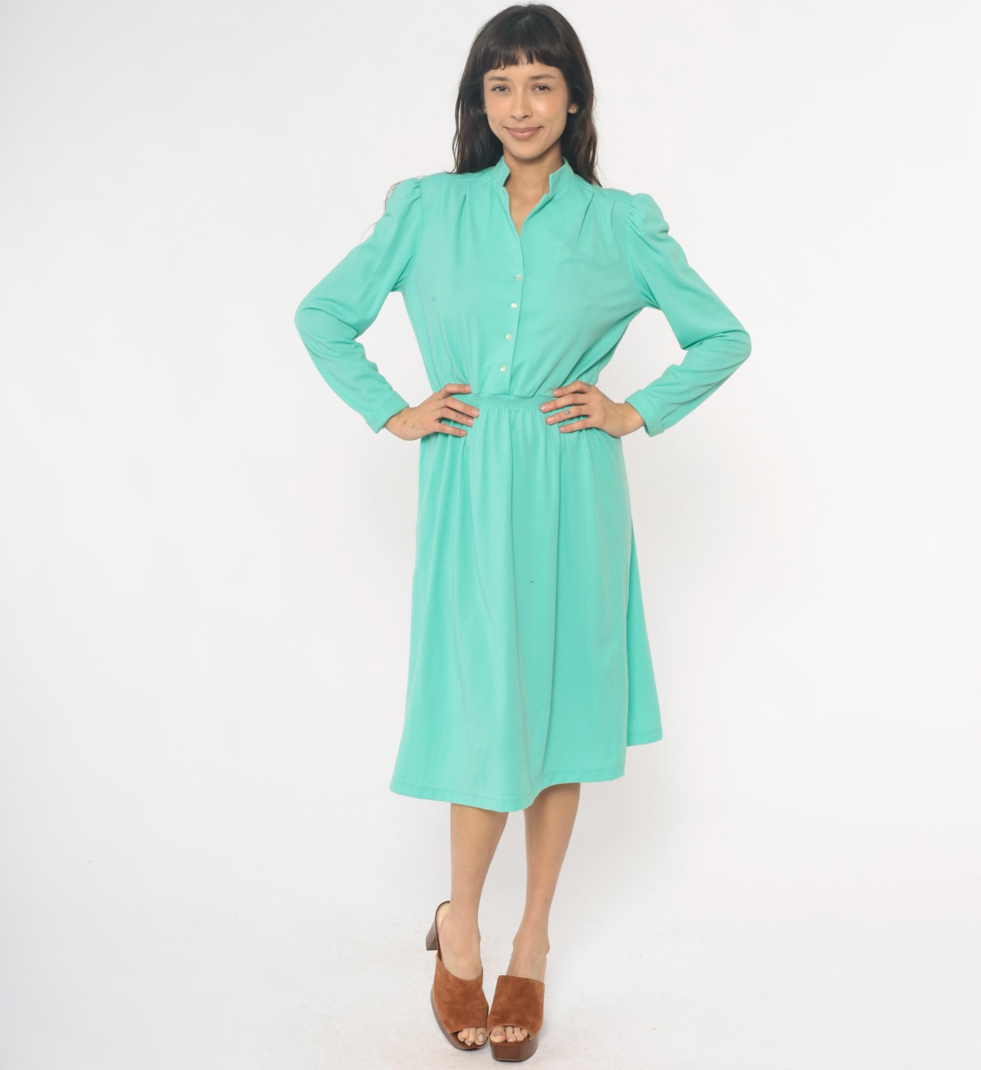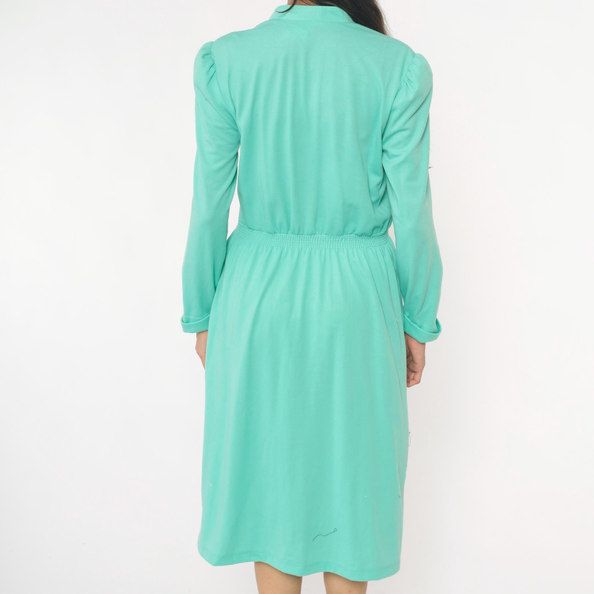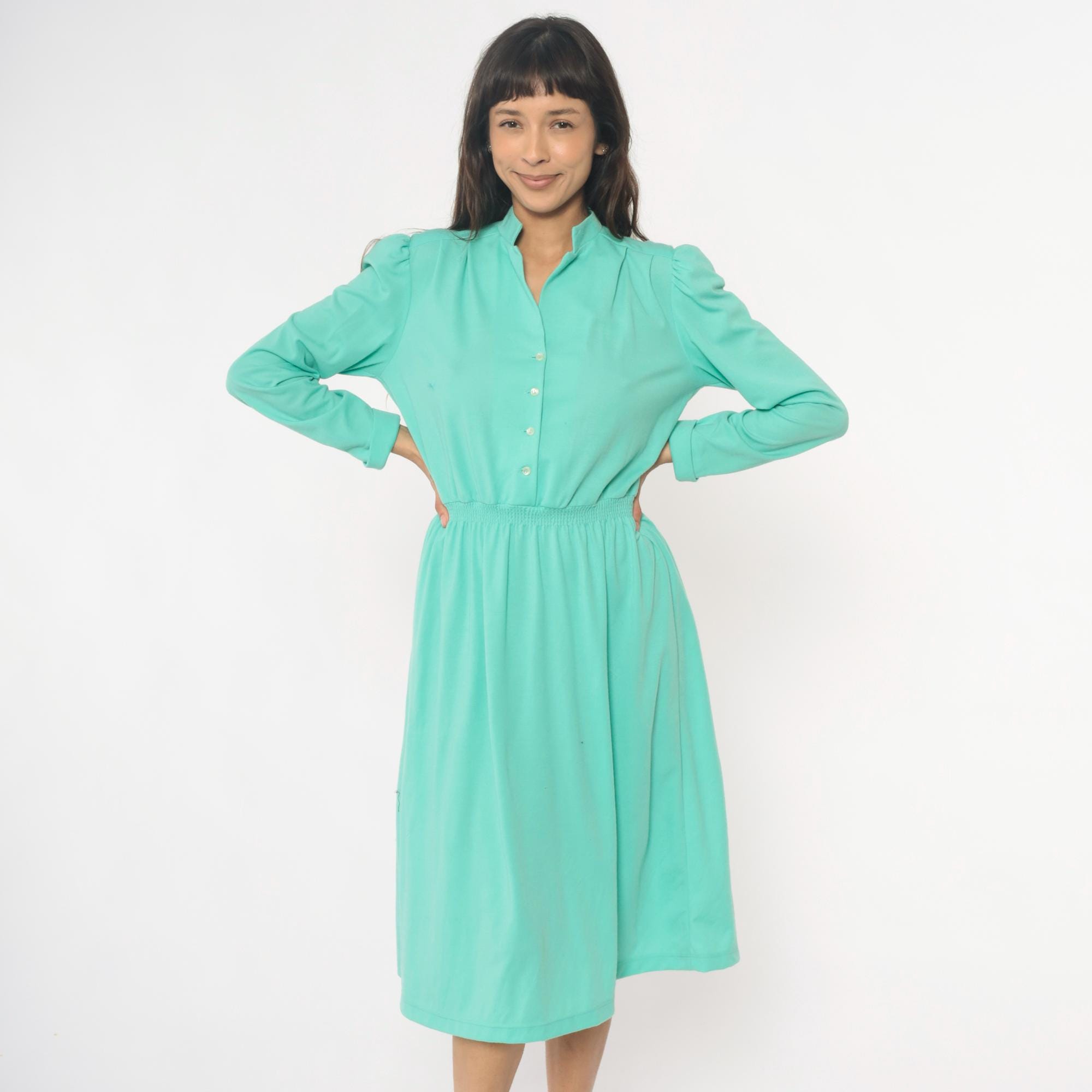 80s mint green shirtdress from lehigh with notched collar, button front closure, and long sleeves. Elastic gathered waistband between bodice and knee-length skirt, puffed shoulder detail.