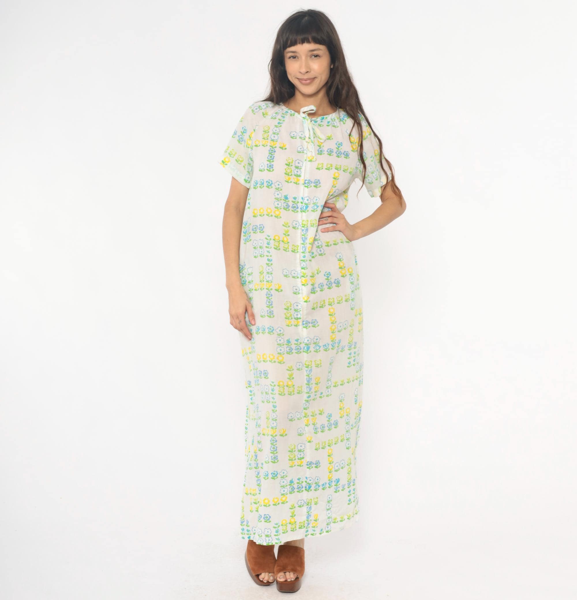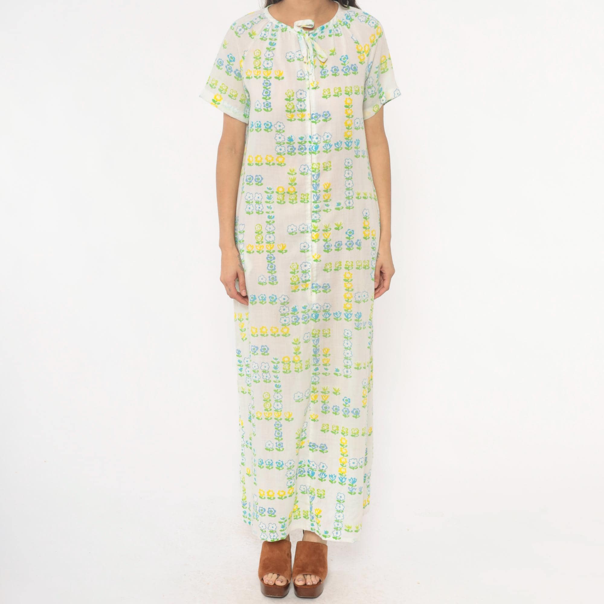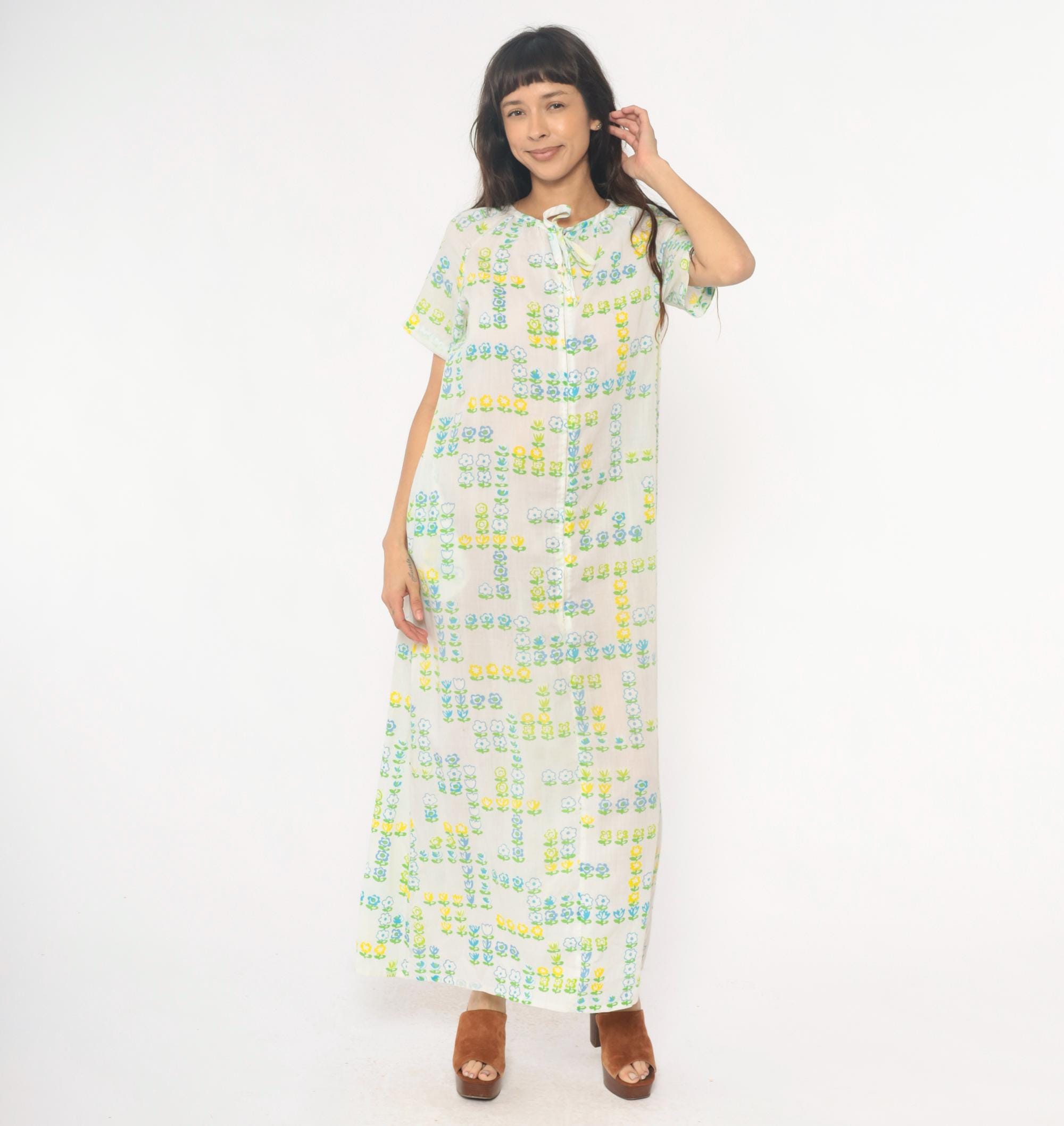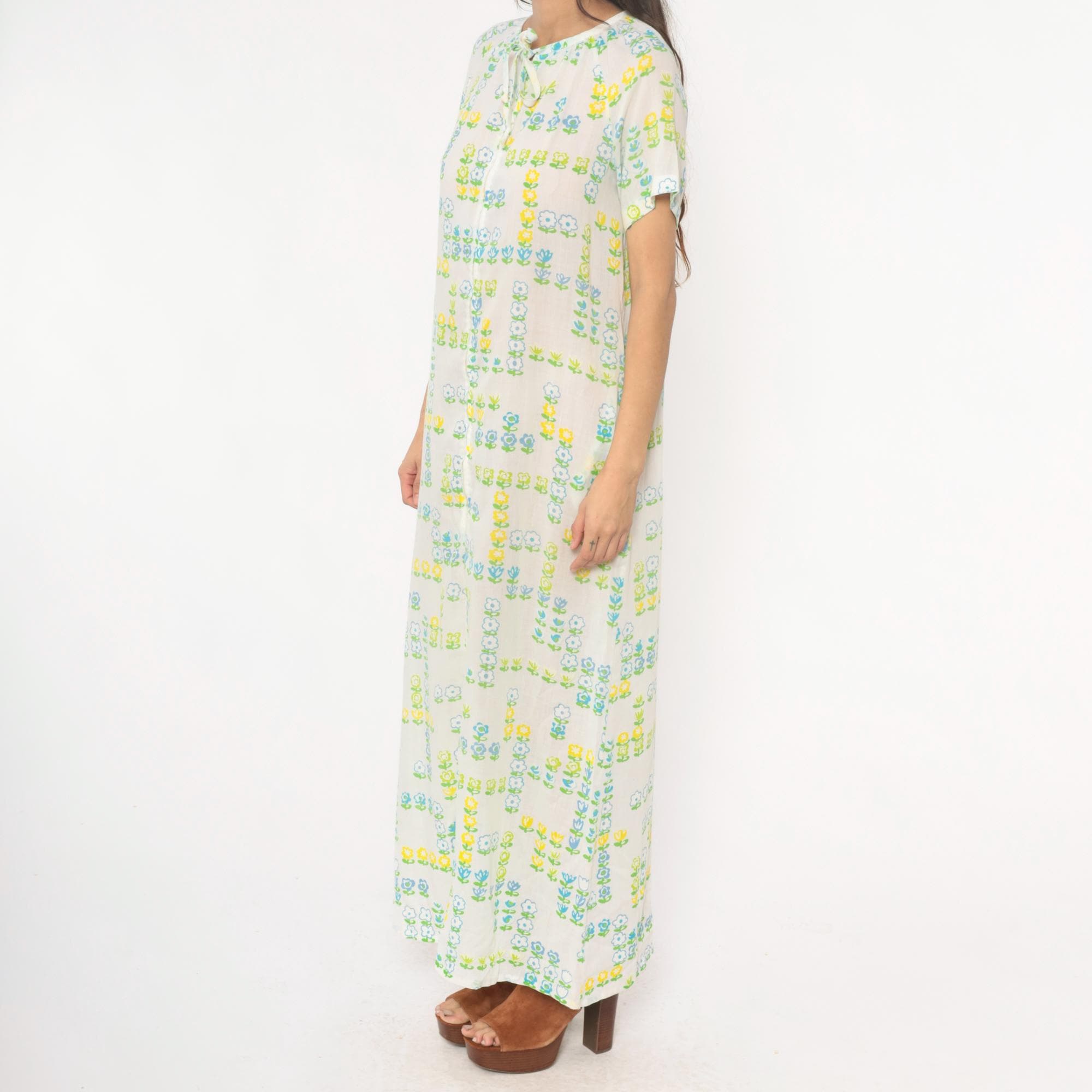 70s white floral maxi dress from Saybury with tie neck closure and button front. Blue, yellow, and green flowers arranged in vertical rows across the fabric. Short sleeves, fitted bodice, gathered waist.