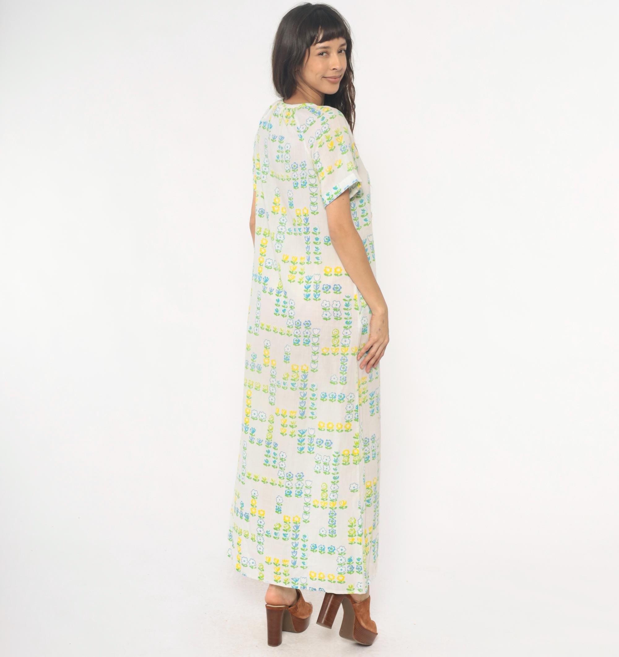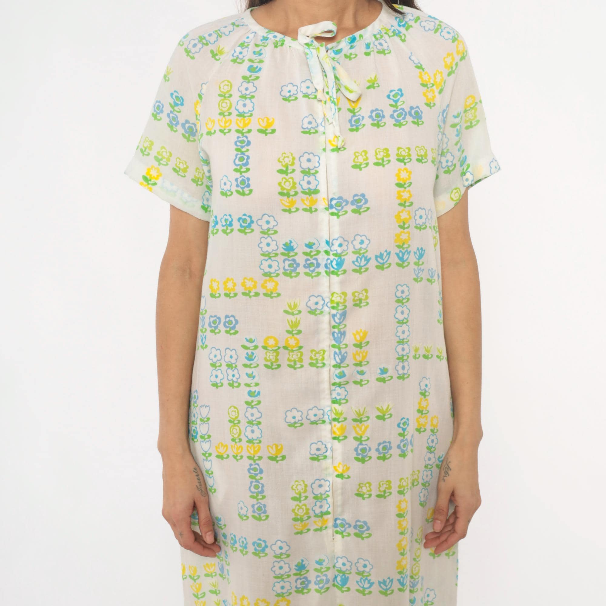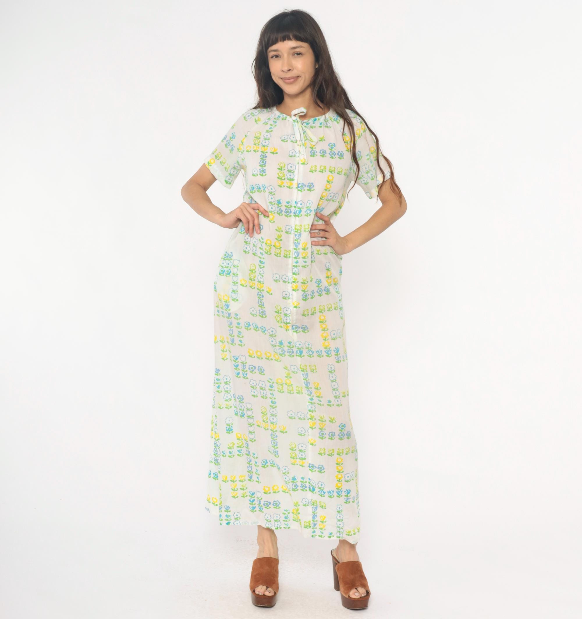 70s white floral maxi dress from Saybury with tie neck closure and button front. Blue, yellow, and green flowers arranged in vertical rows across the fabric. Short sleeves, fitted bodice, gathered waist.