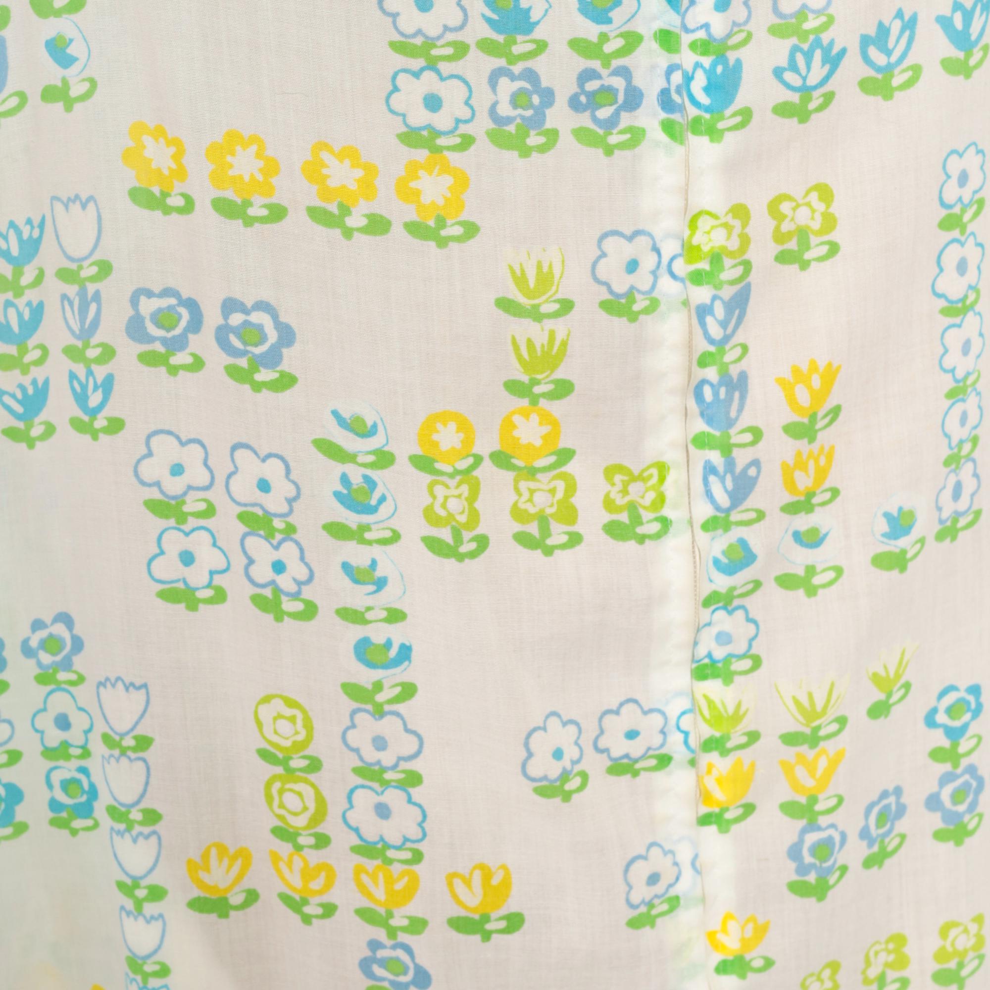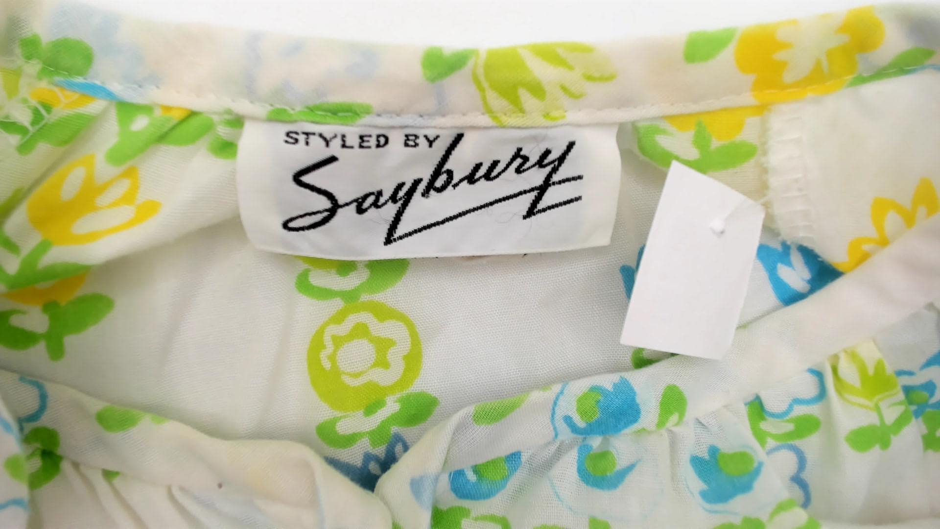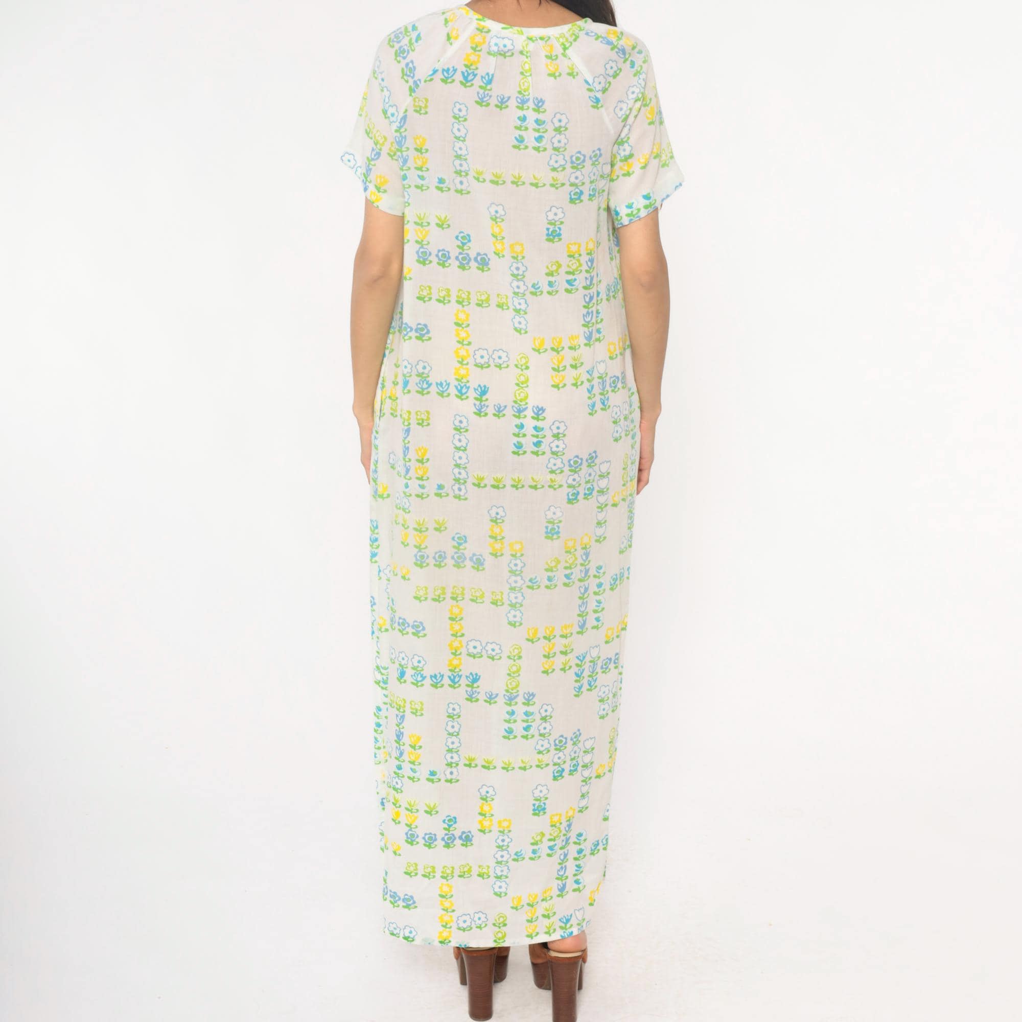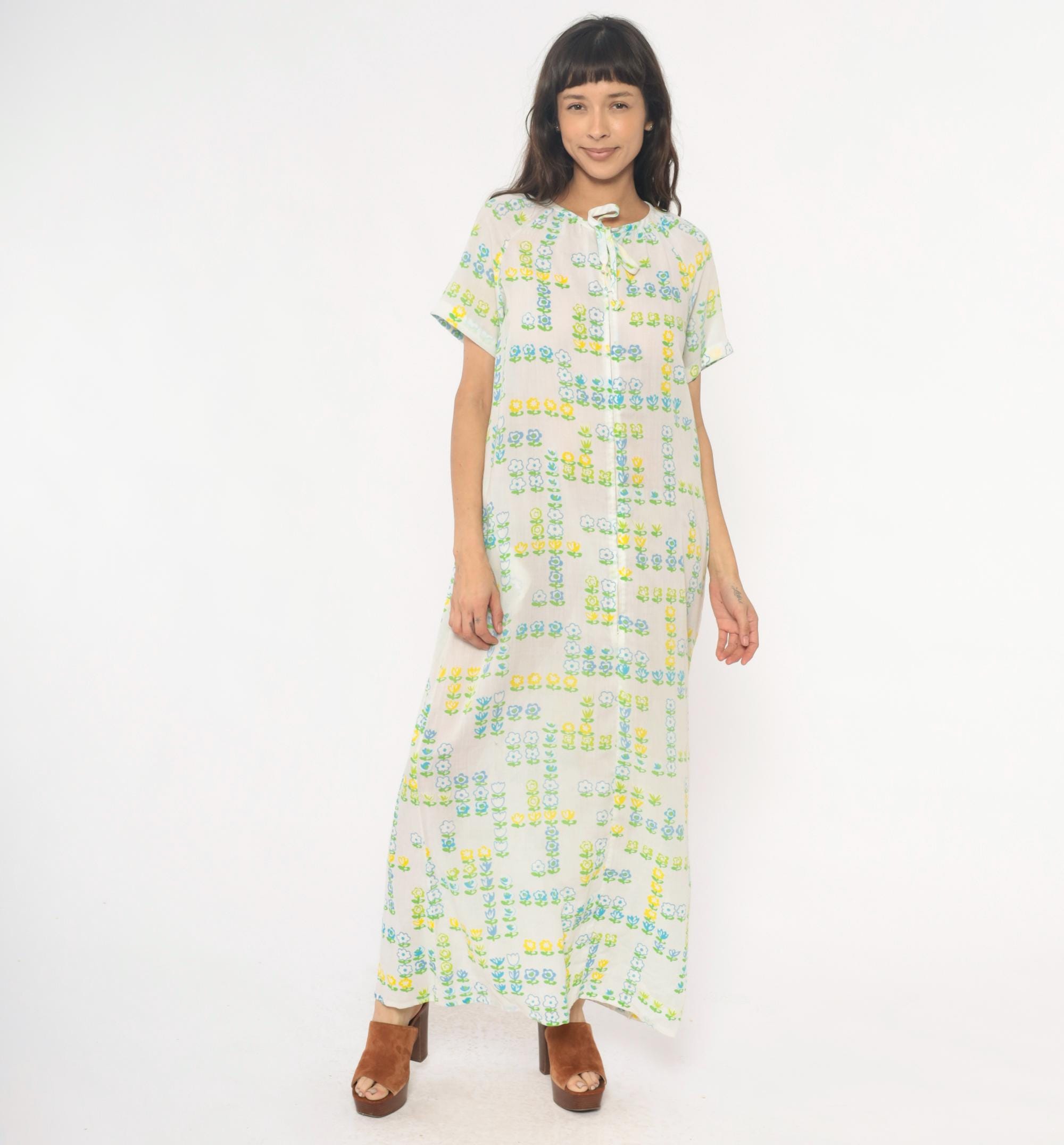 70s white floral maxi dress from Saybury with tie neck closure and button front. Blue, yellow, and green flowers arranged in vertical rows across the fabric. Short sleeves, fitted bodice, gathered waist.
