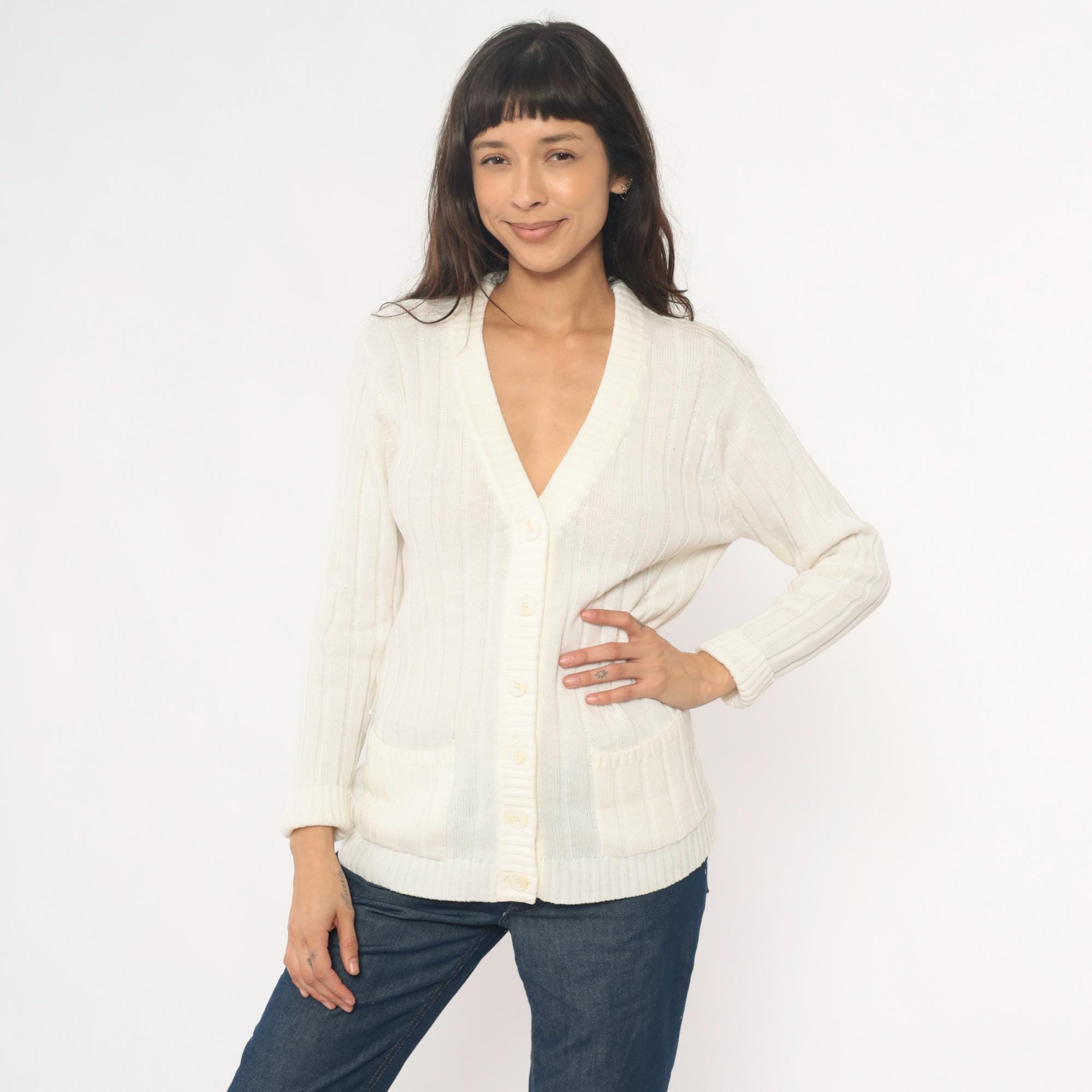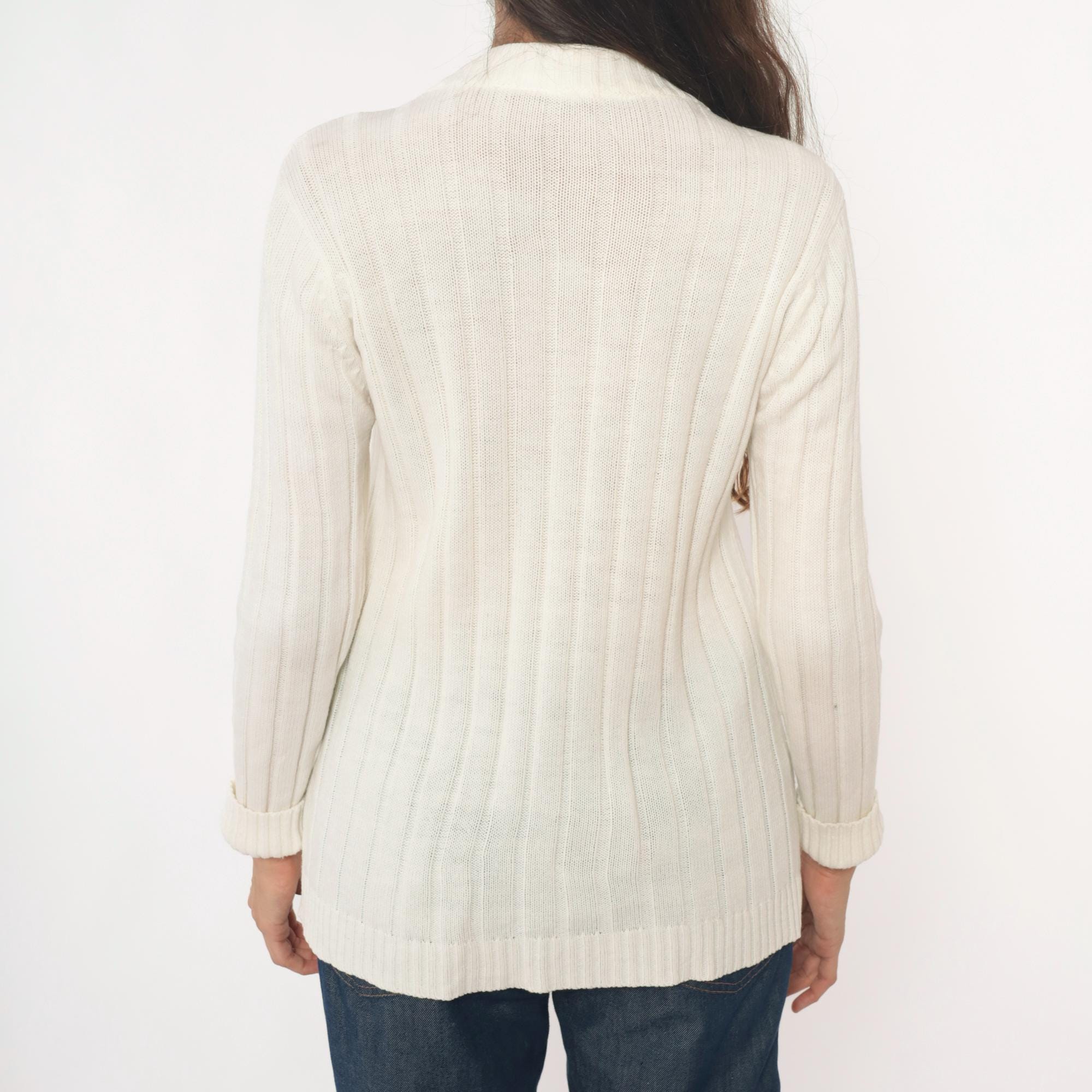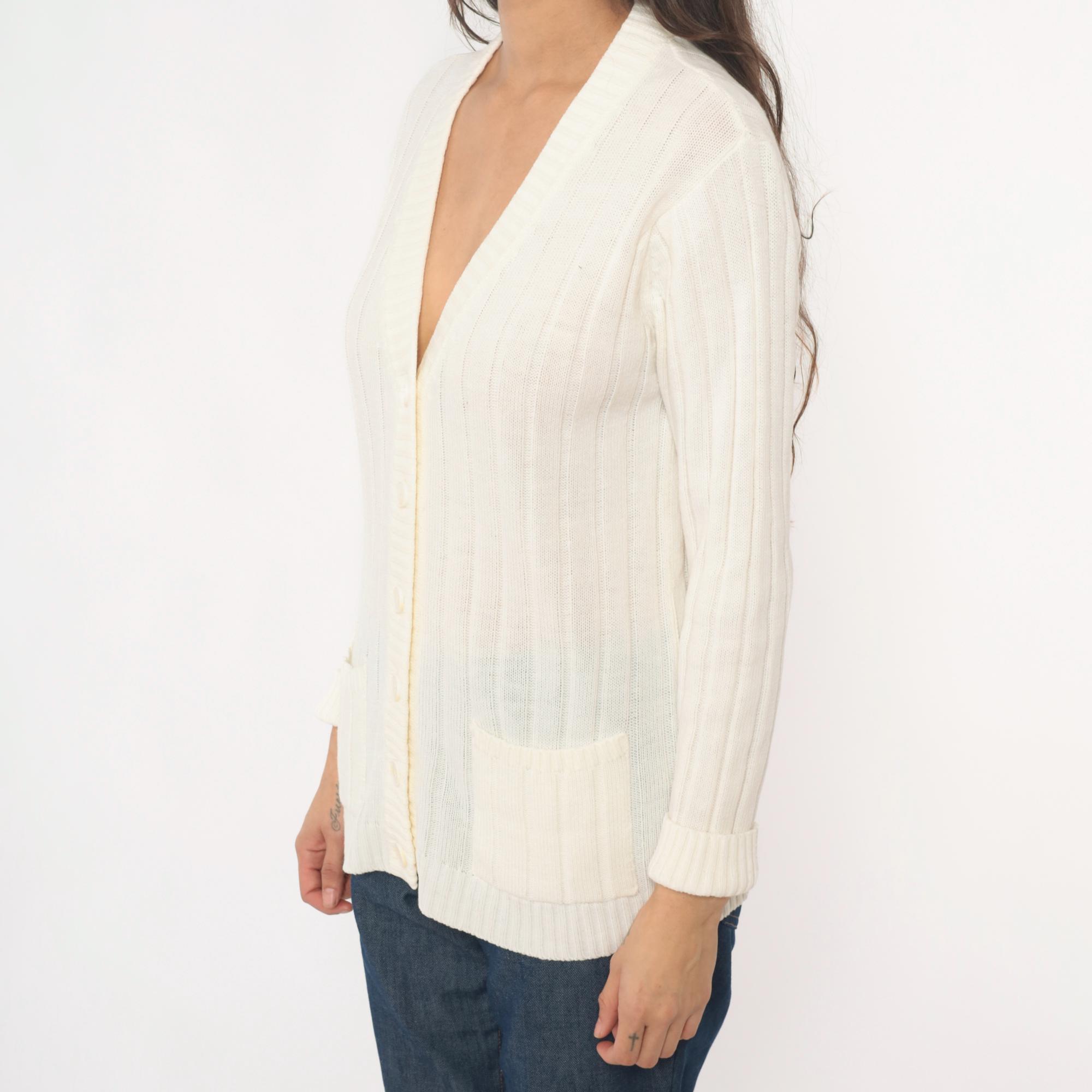 70s cream cable knit cardigan from zayre with V-neck, button front closure, and ribbed trim at neckline, cuffs, and hem.