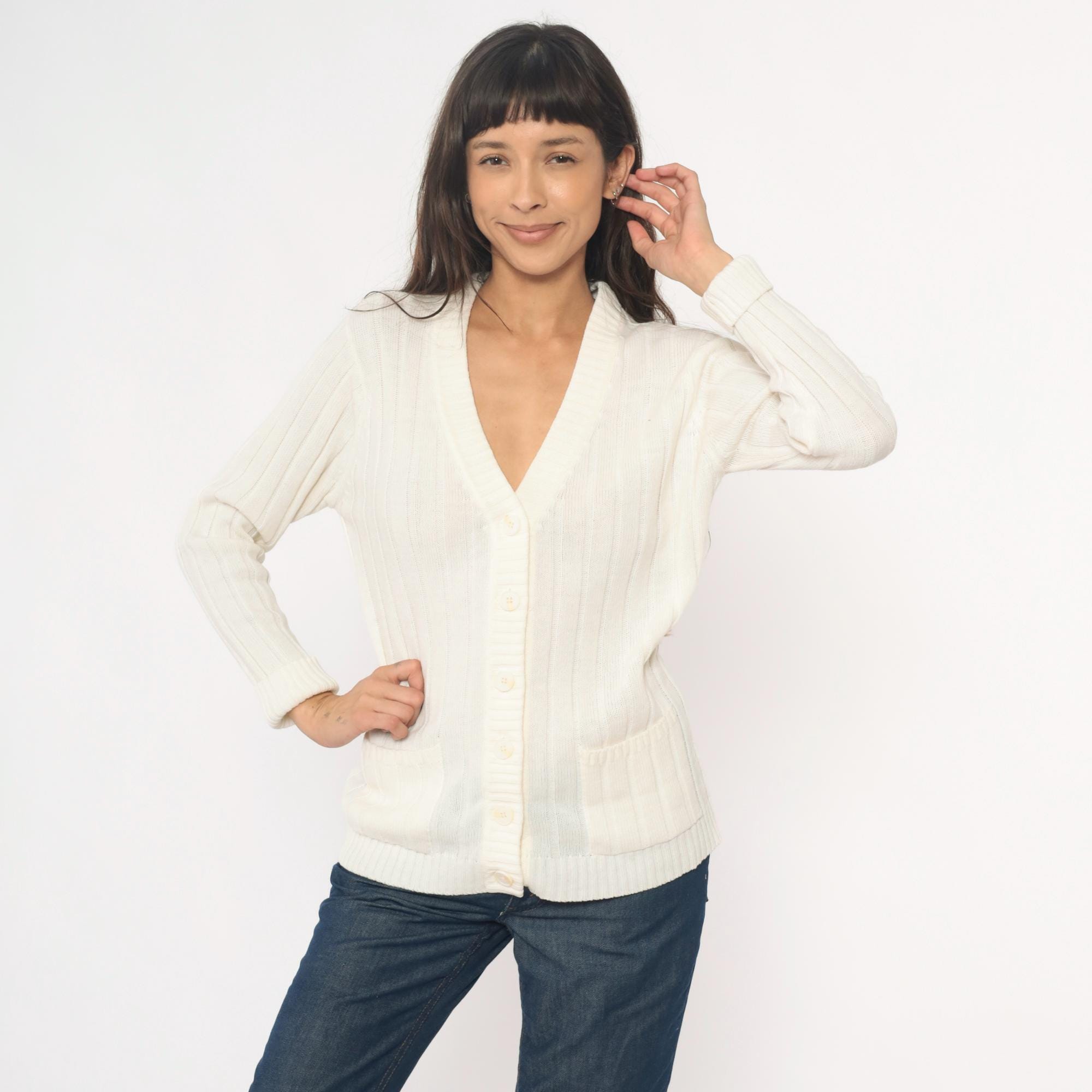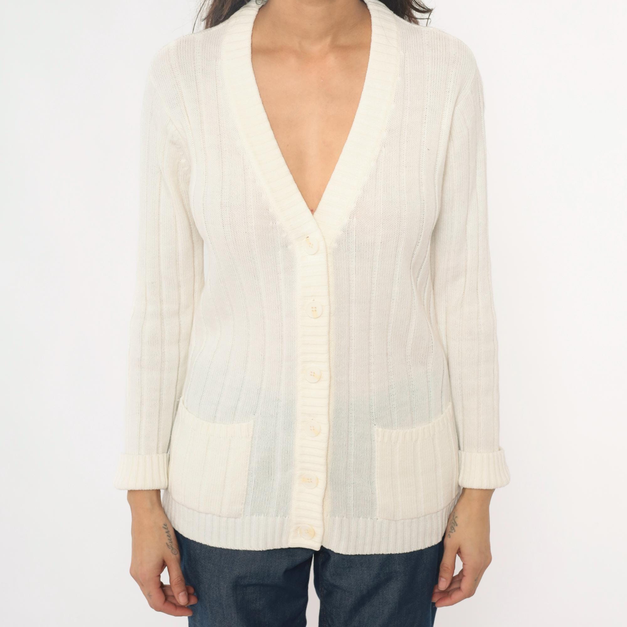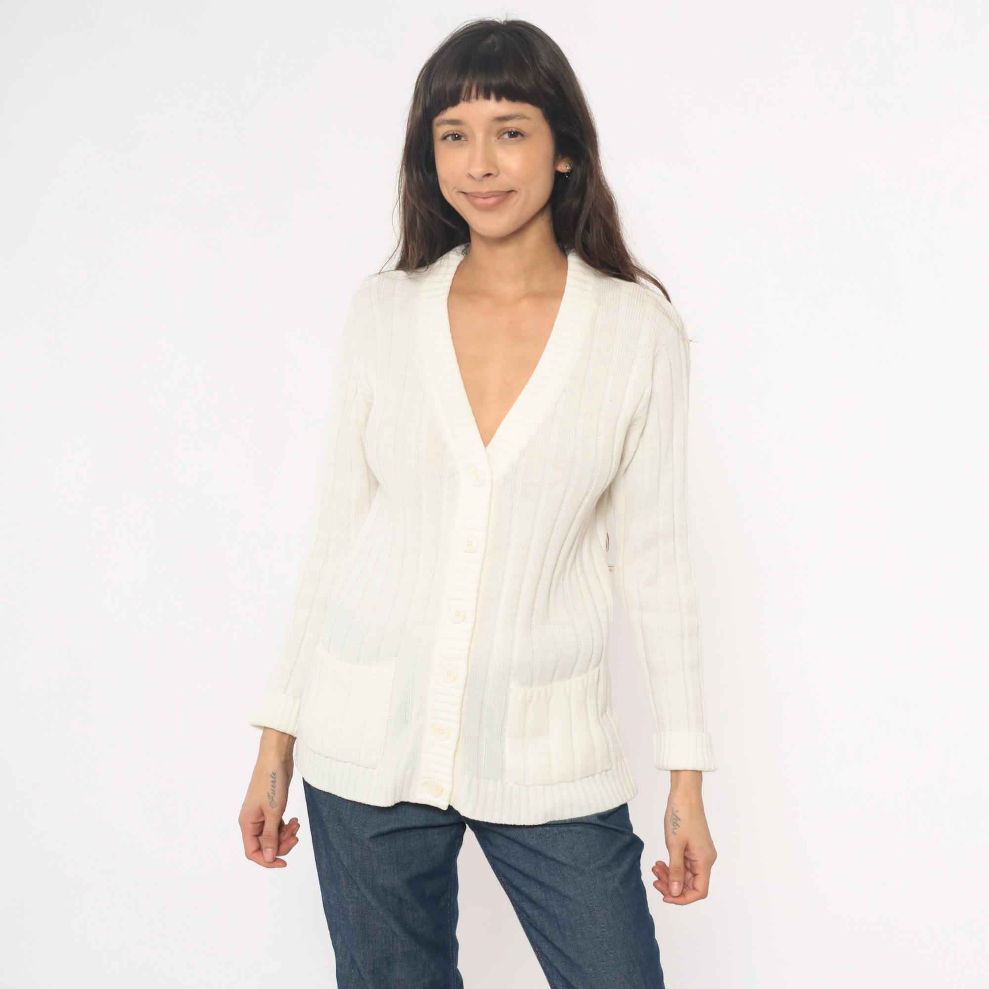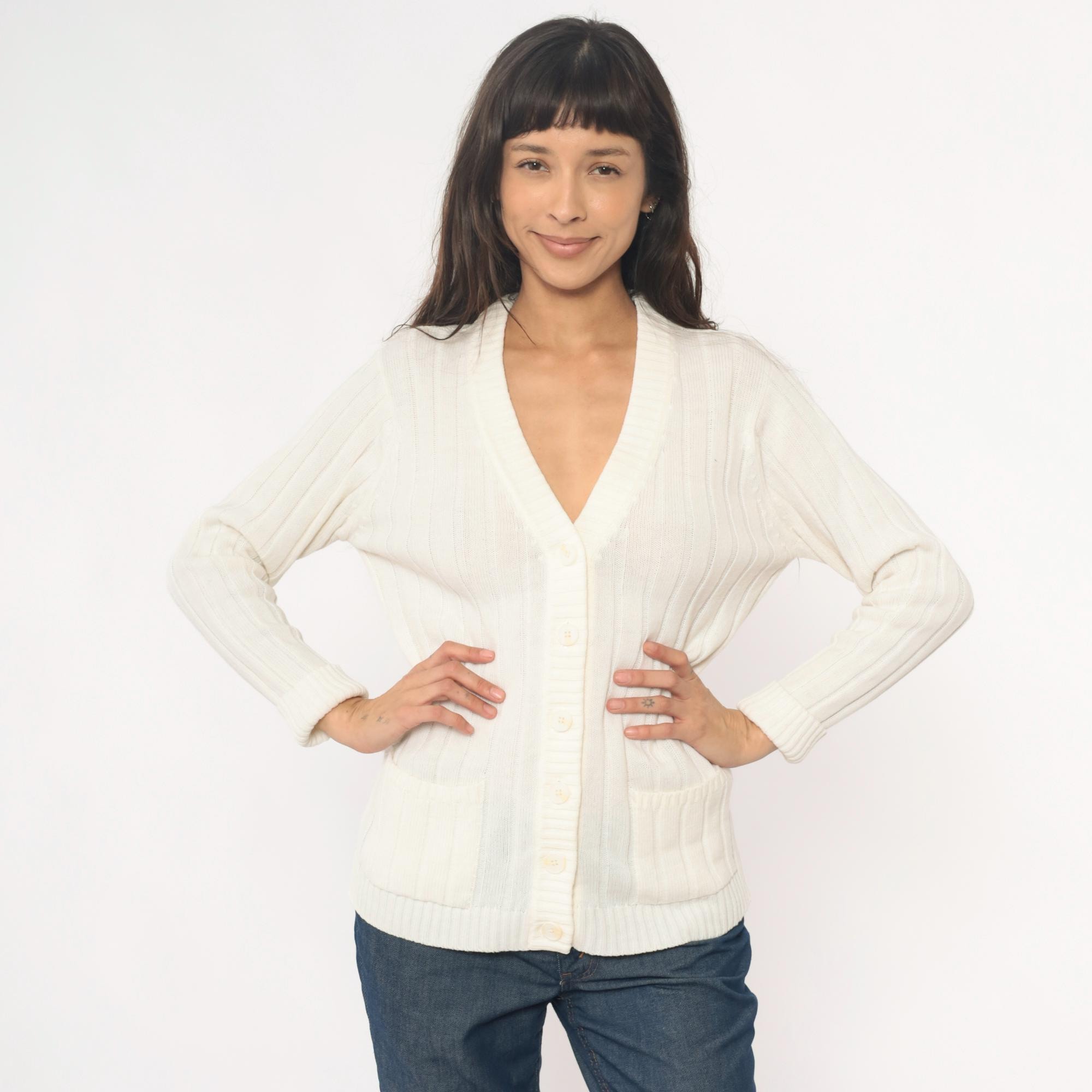 70s cream cable knit cardigan from zayre with V-neck, button front closure, and ribbed trim at neckline, cuffs, and hem.