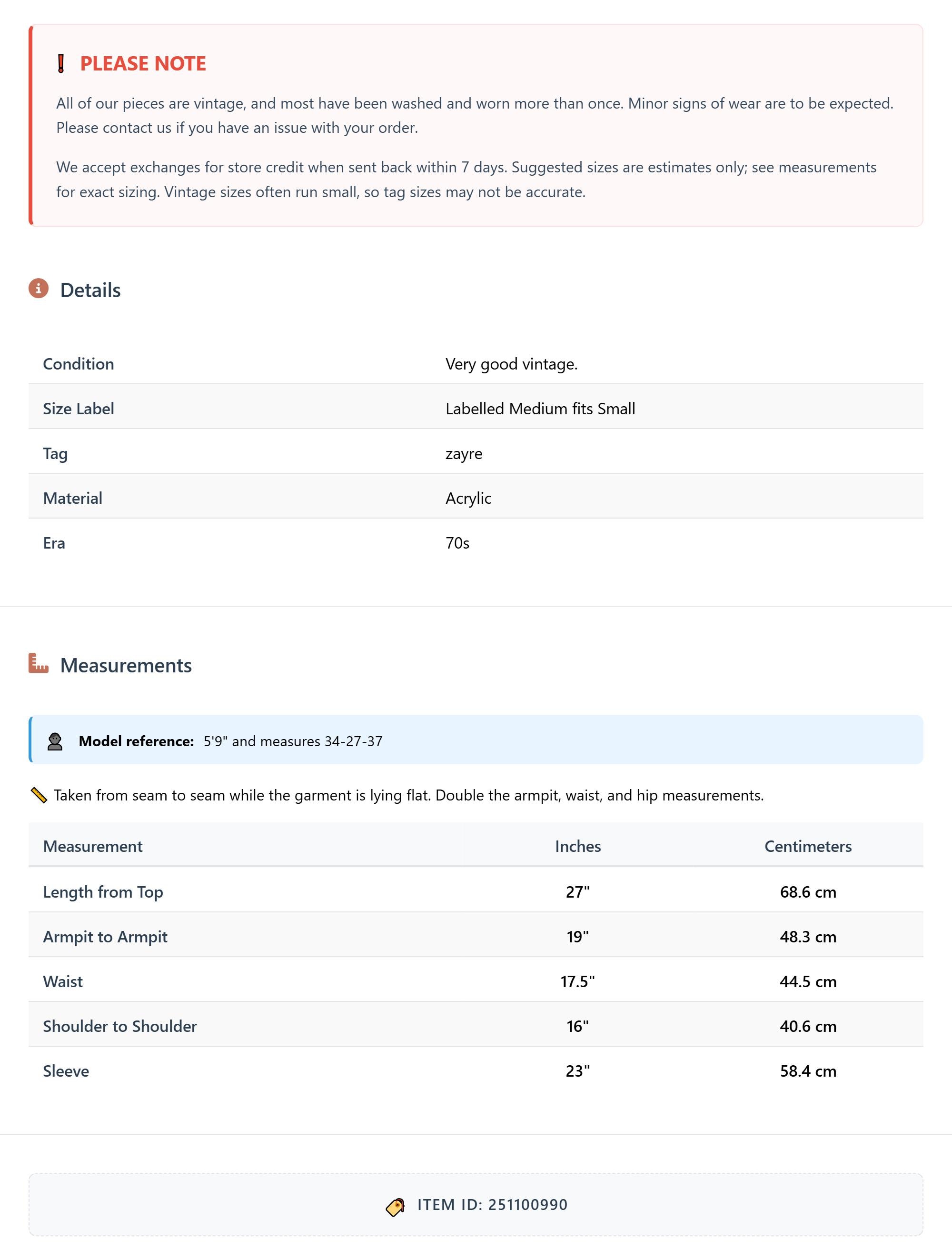 All of our pieces are vintage, and most have been washed and worn more than once. Minor signs of wear are to be expected. Please contact us if you have an issue with your order. We accept exchanges for store credit when sent back within 7 days.