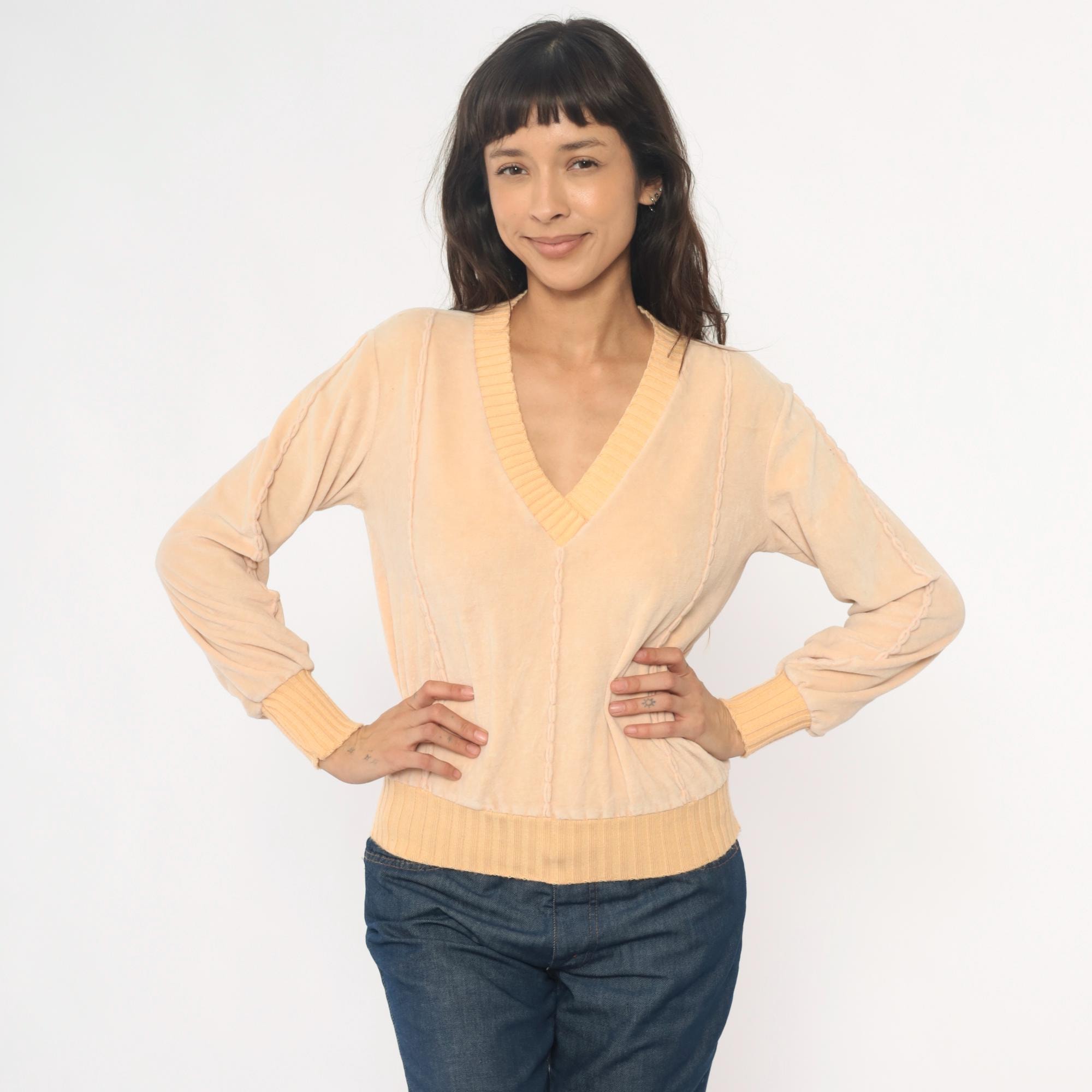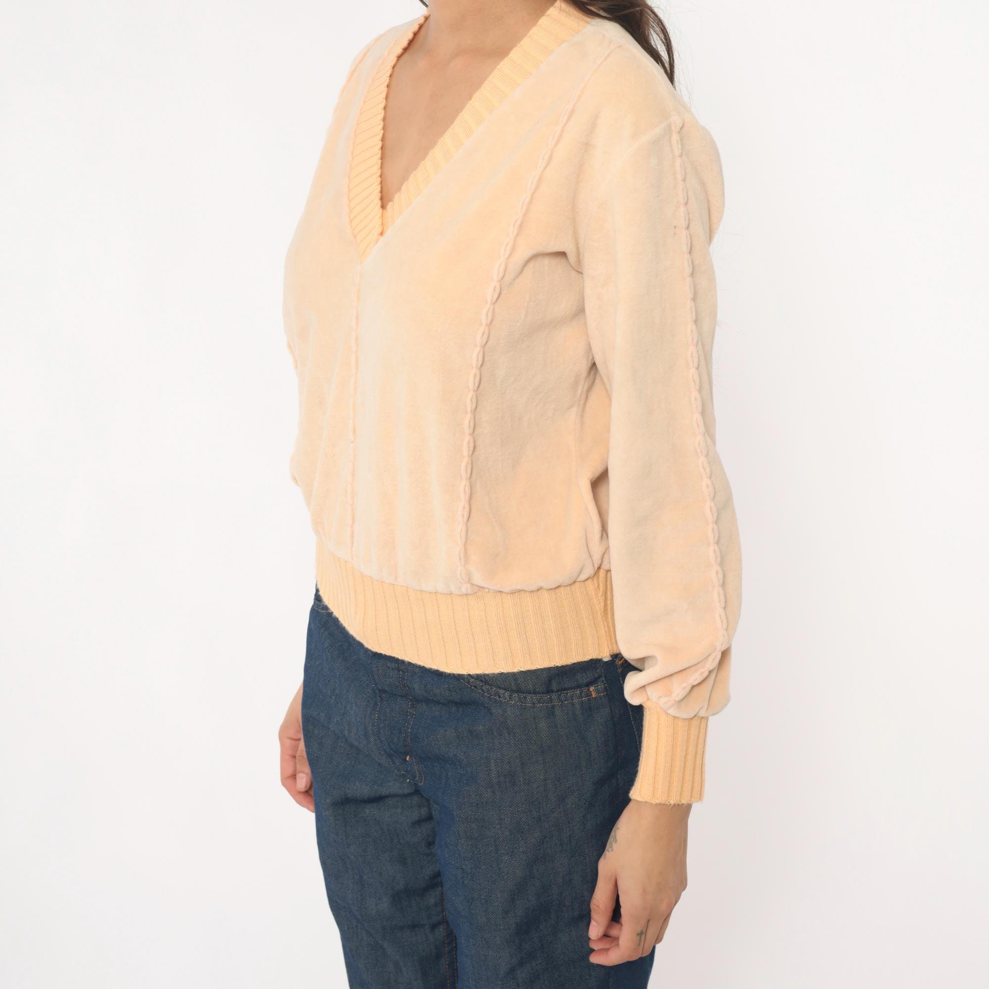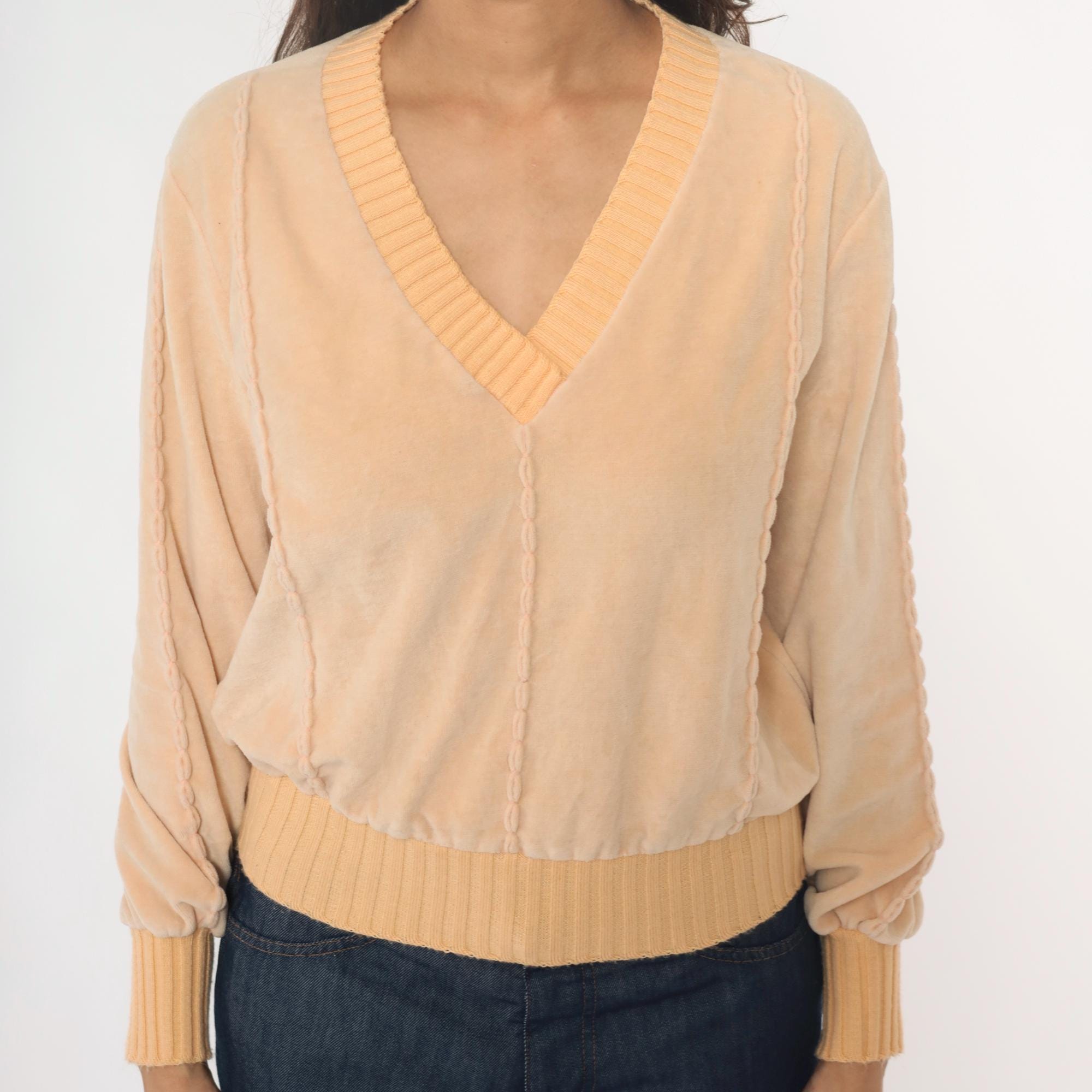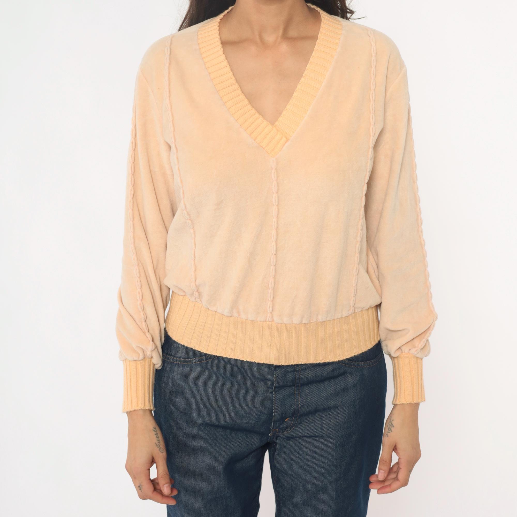 80s cream velour pullover from comosport with V-neck and ribbed knit trim at collar, cuffs, and waist in a lighter cream tone. Long sleeves with fitted ribbed cuffs, relaxed fit through body.