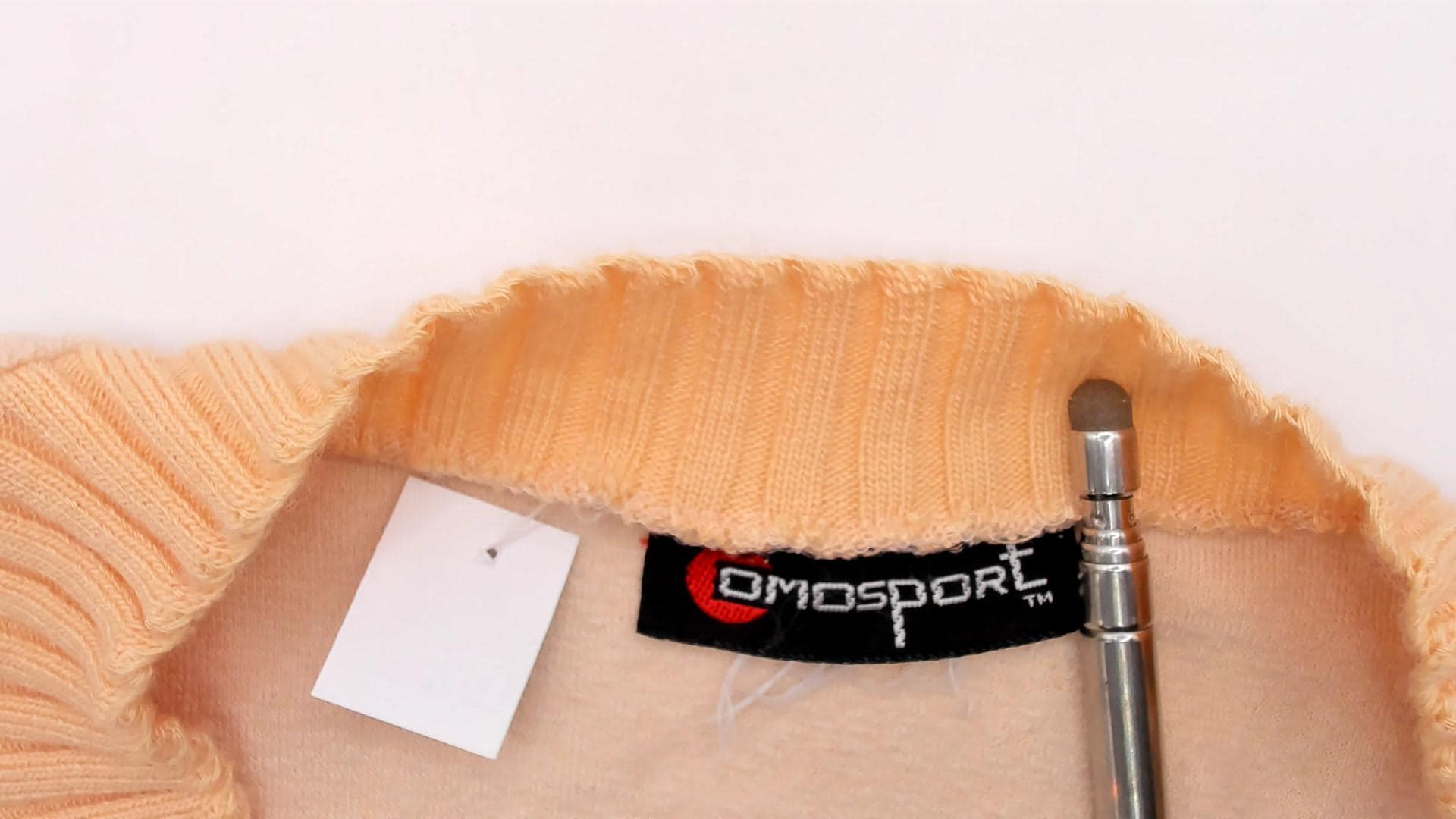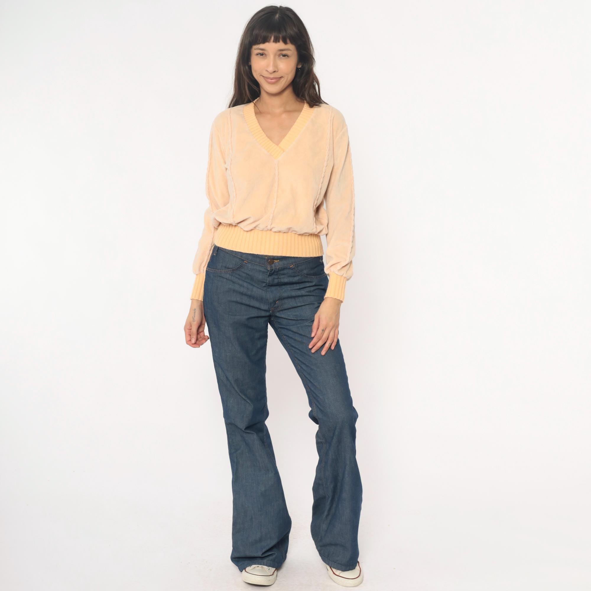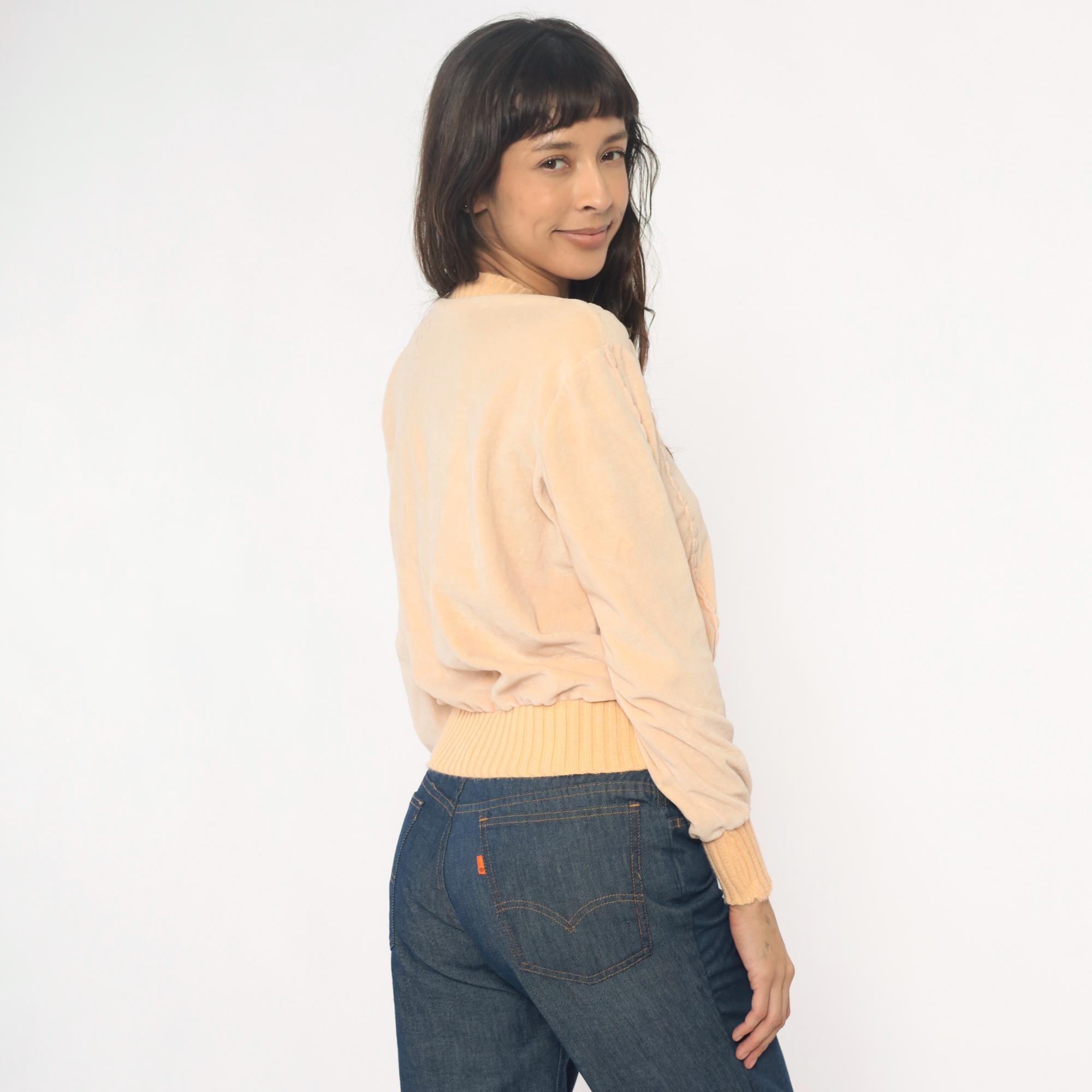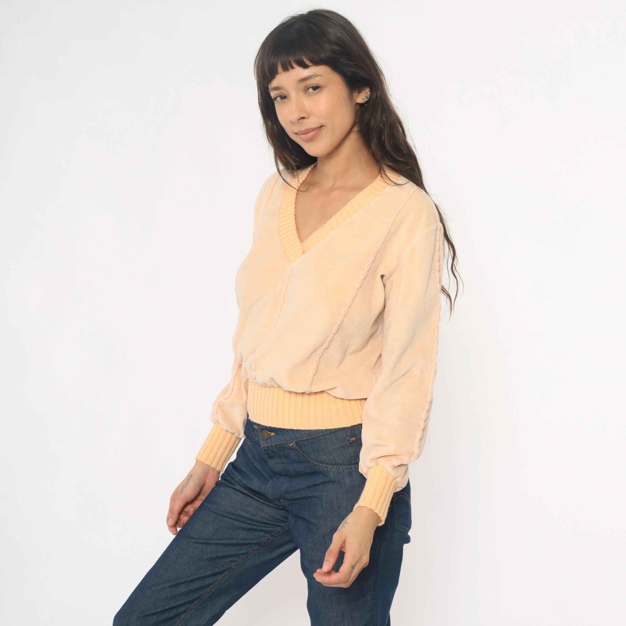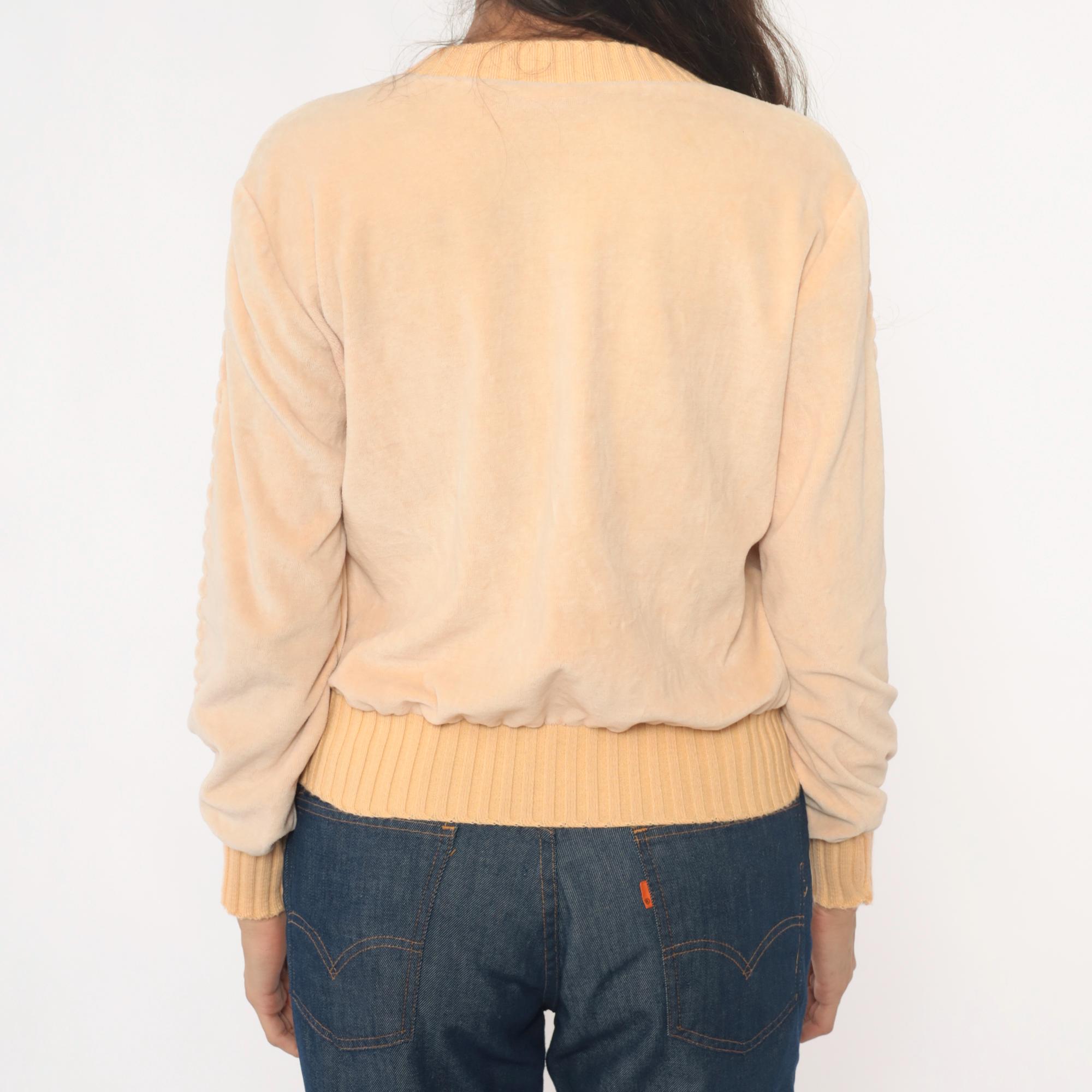 80s cream velour pullover from comosport with V-neck and ribbed knit trim at collar, cuffs, and waist in a lighter cream tone. Long sleeves with fitted ribbed cuffs, relaxed fit through body.