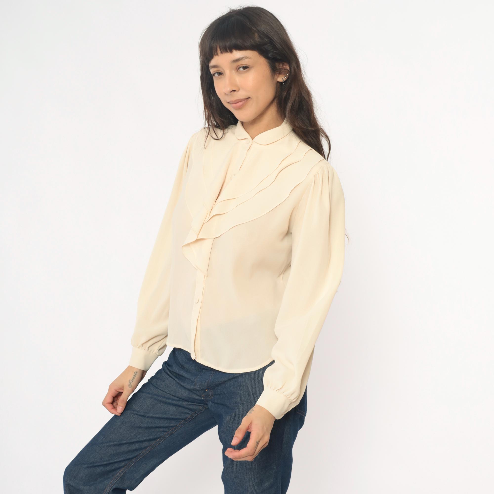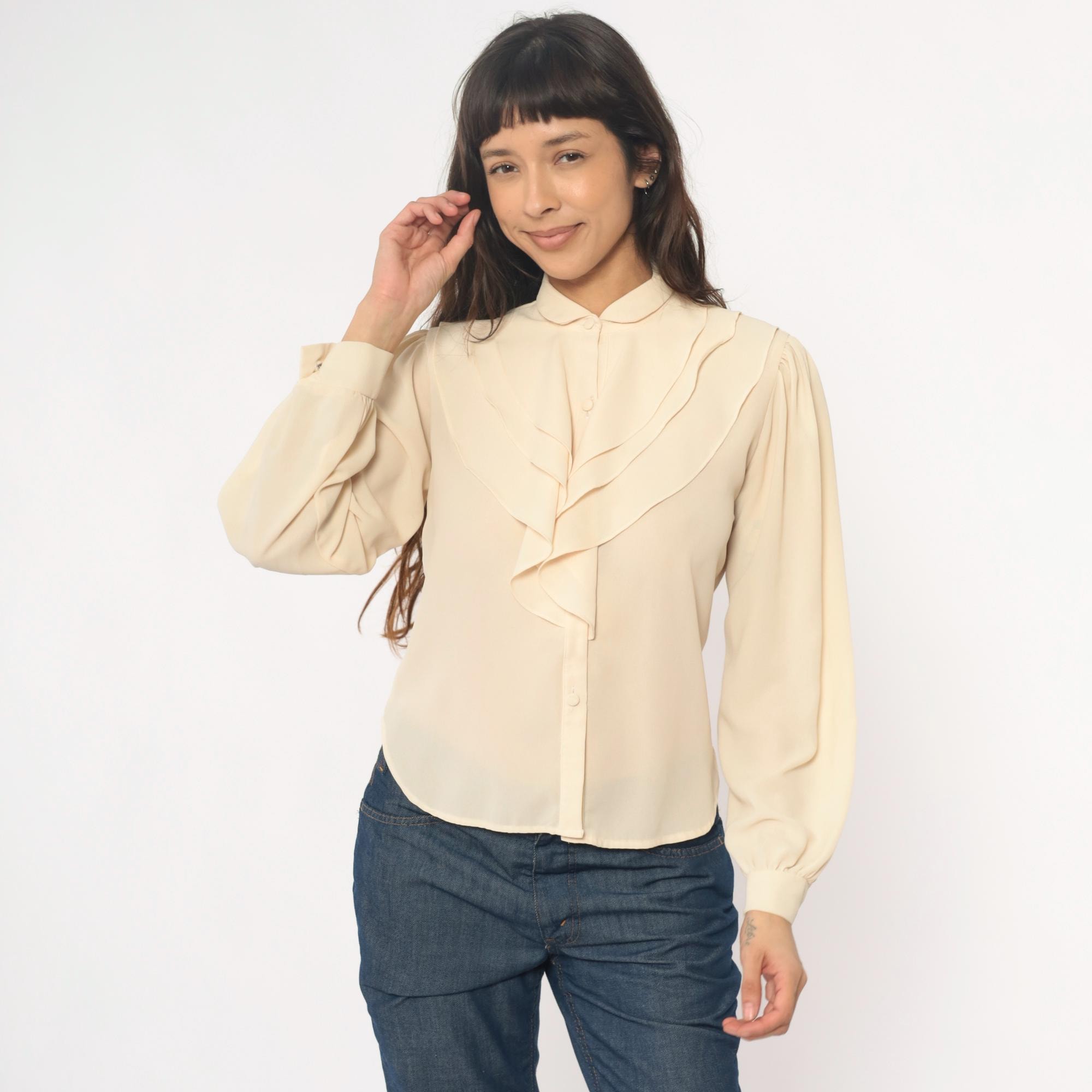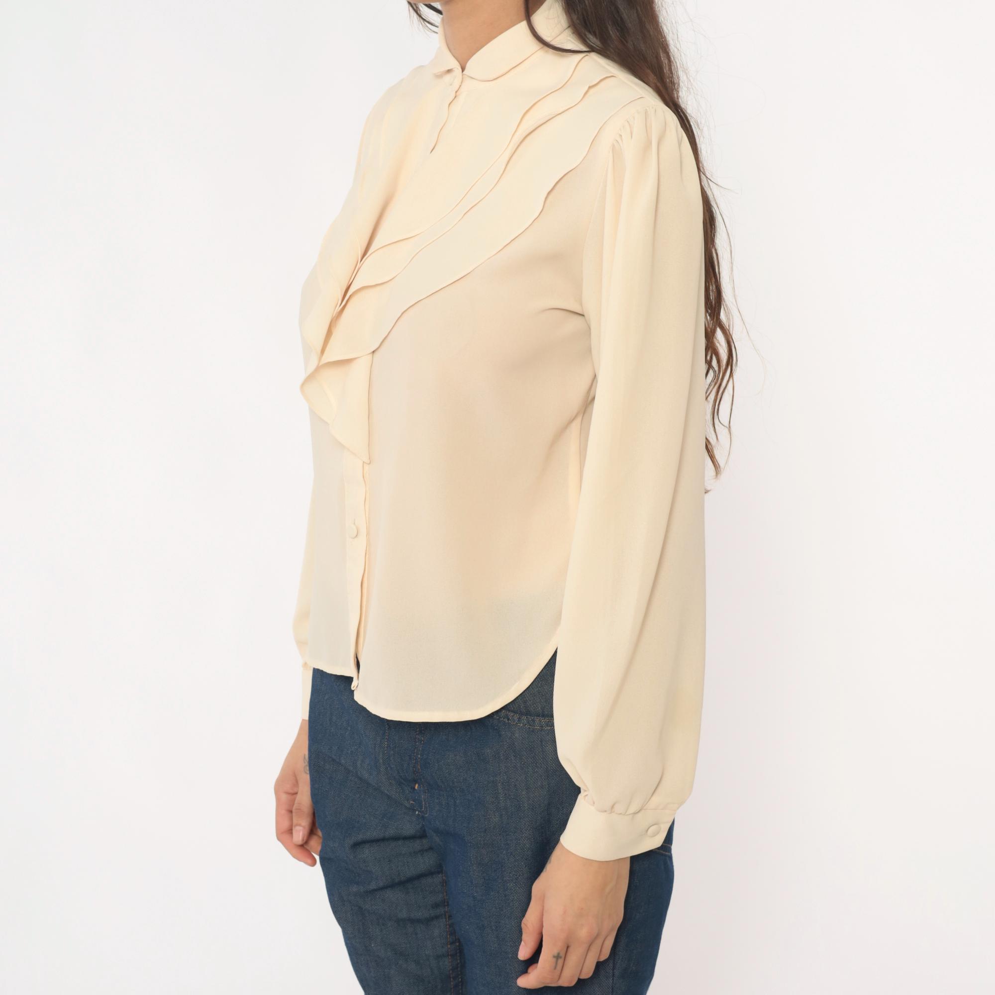 70s cream blouse with peter pan collar and zigzag ruffle detail down the front button closure. Long sleeves with elastic cuffs, puffed shoulders with gathering.