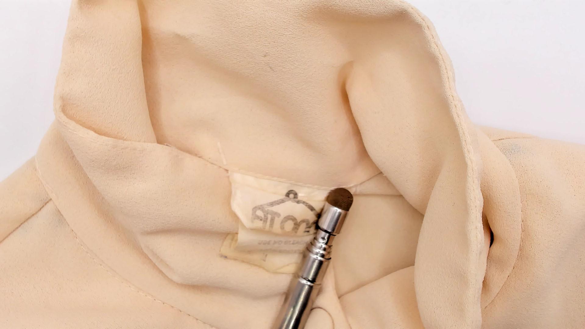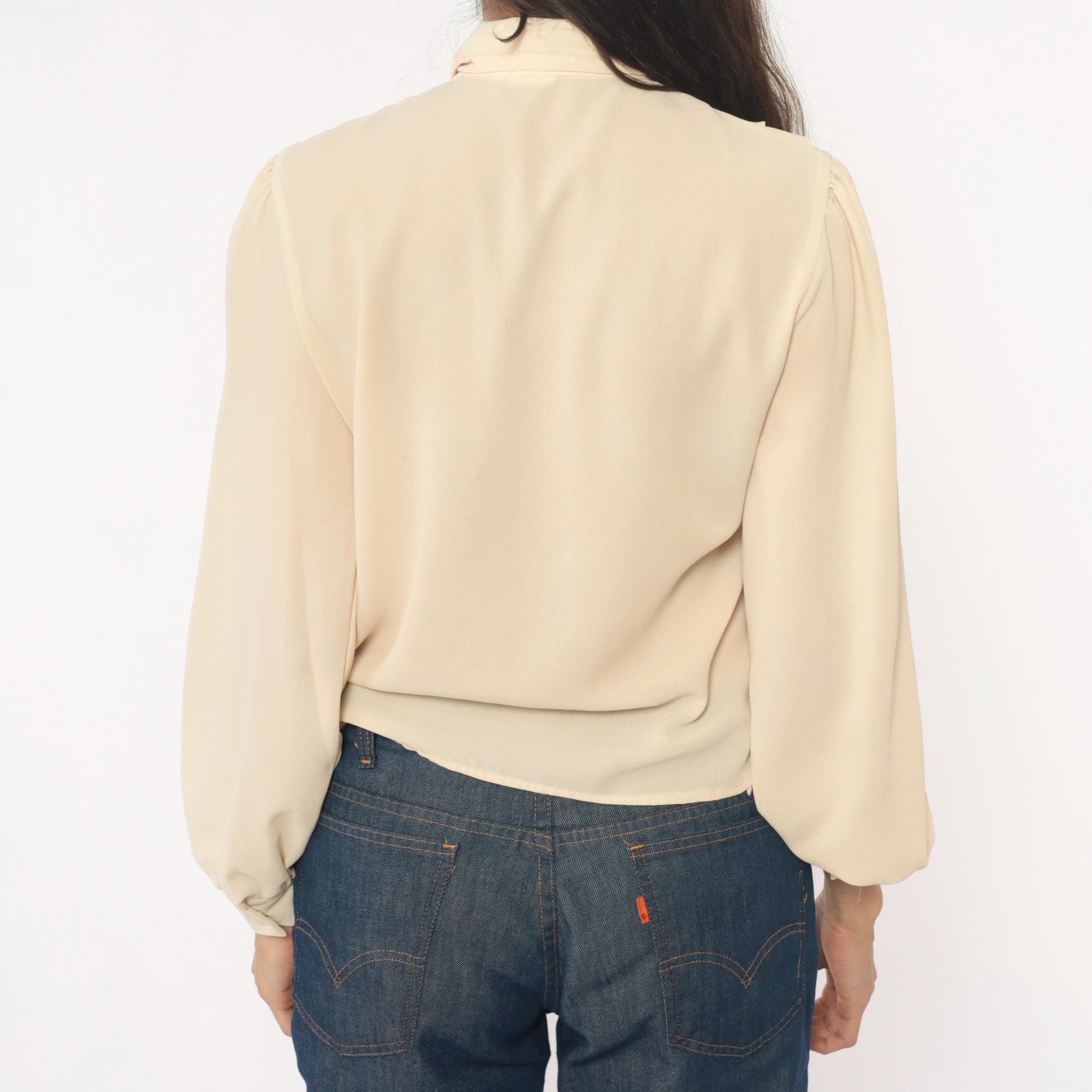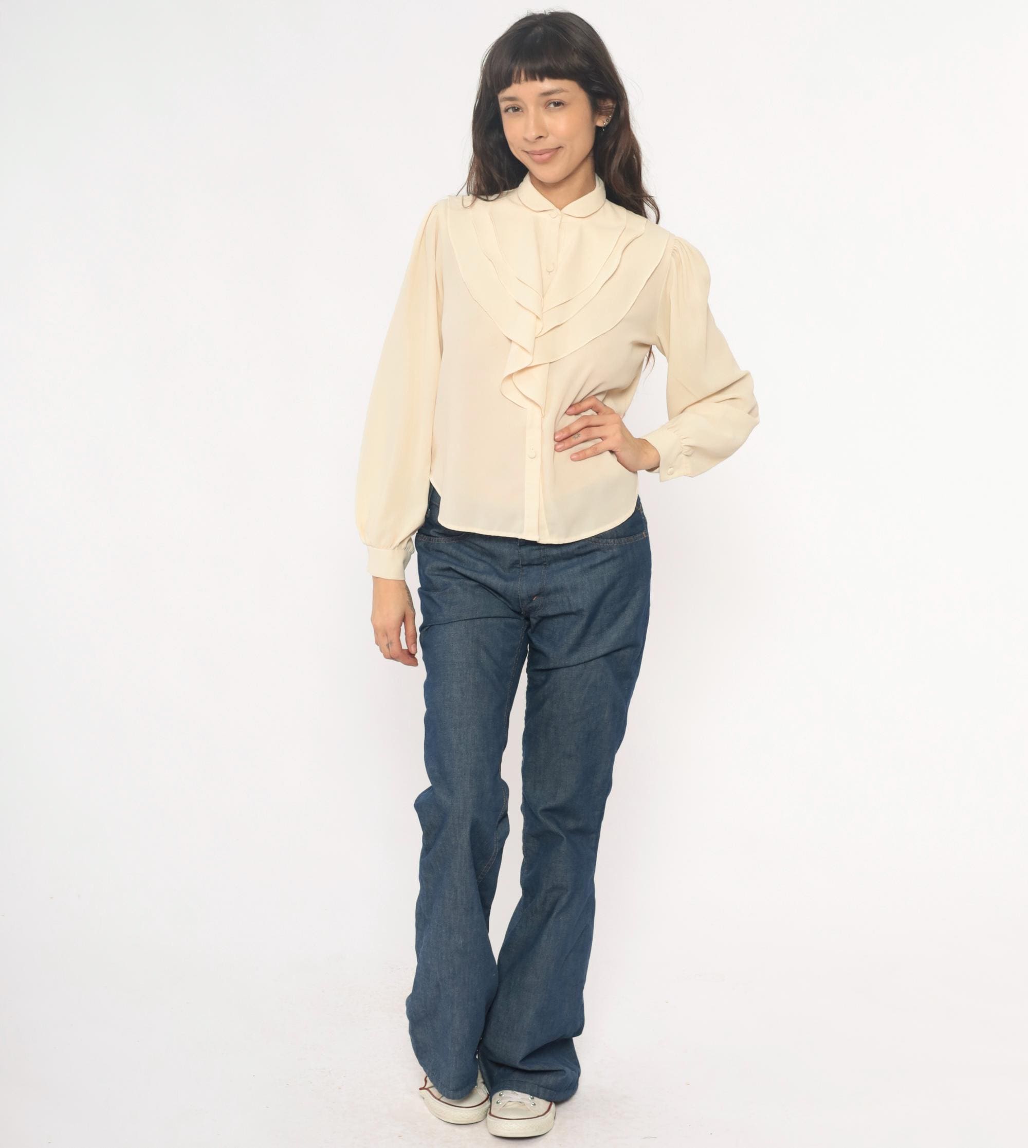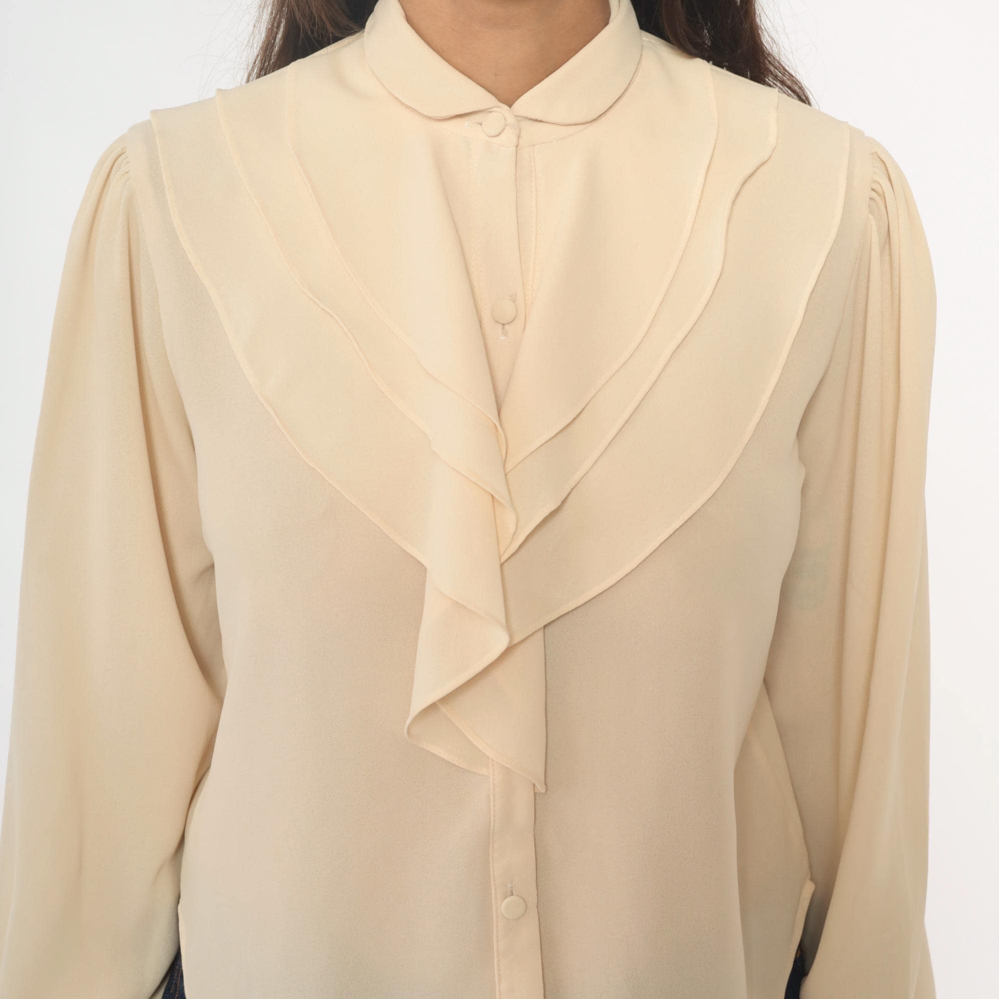 70s cream blouse with peter pan collar and zigzag ruffle detail down the front button closure. Long sleeves with elastic cuffs, puffed shoulders with gathering.
