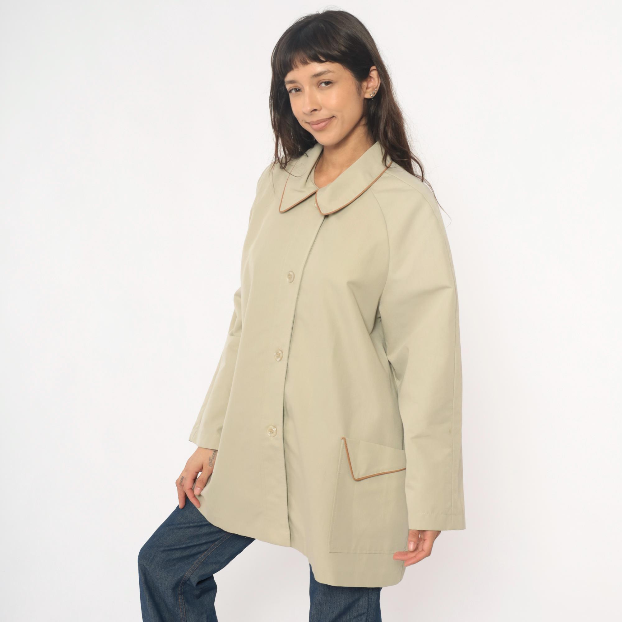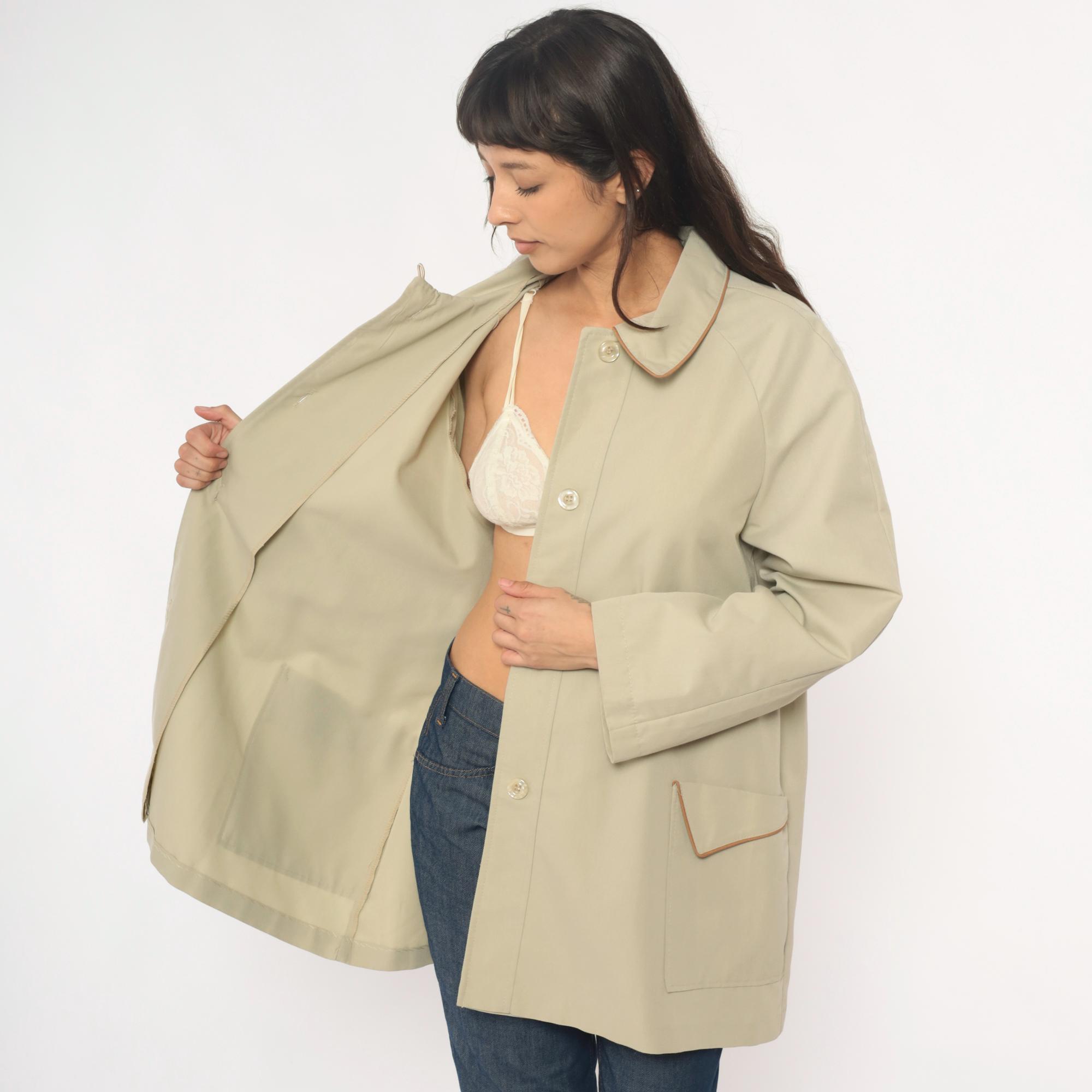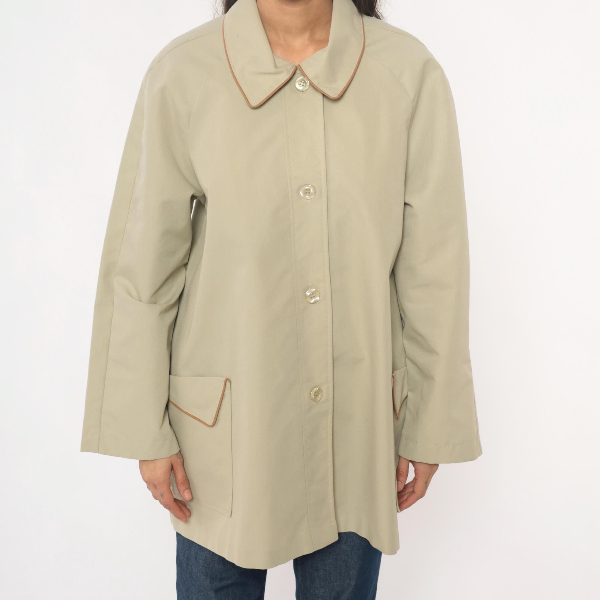 80s beige all-weather coat with brown leather piping trim along the rounded collar, pocket edges, and front placket. Button front closure with four visible buttons, two front pockets, long sleeves. Hip-length cut with brown trim detailing throughout.