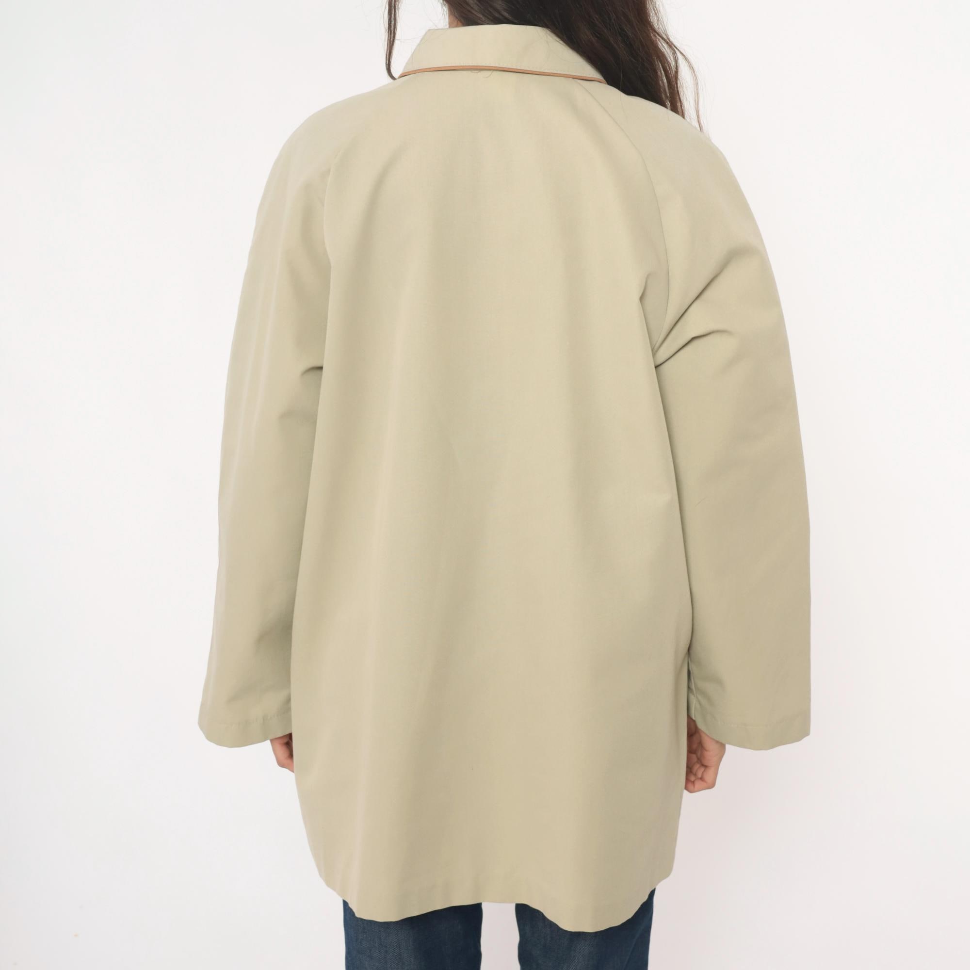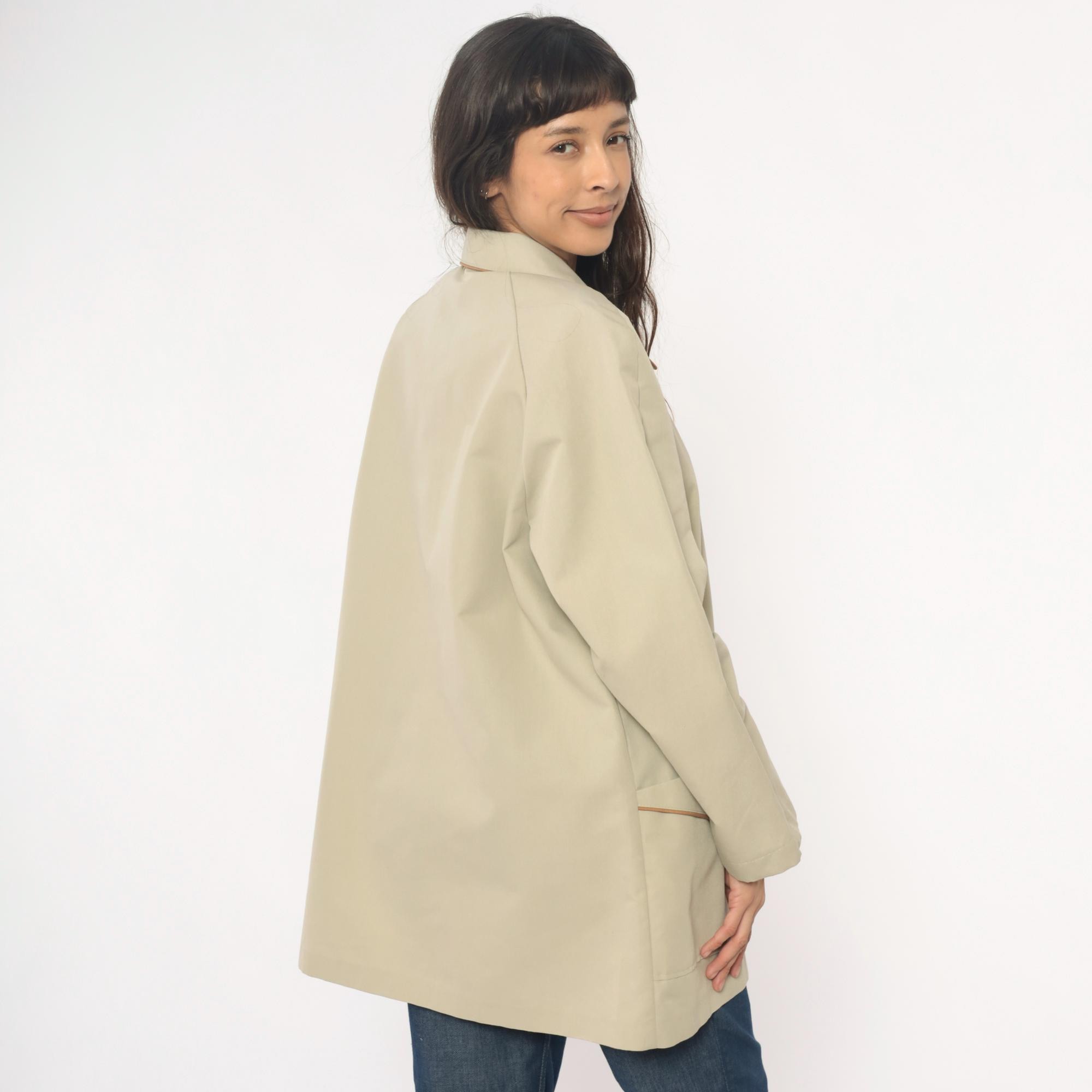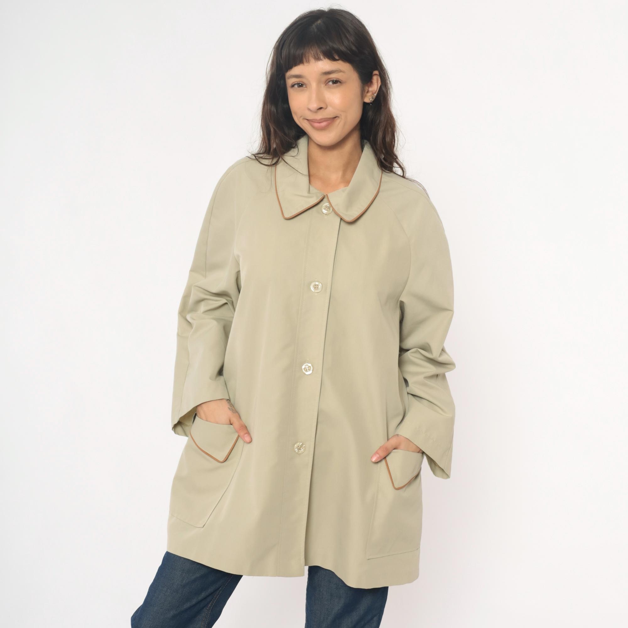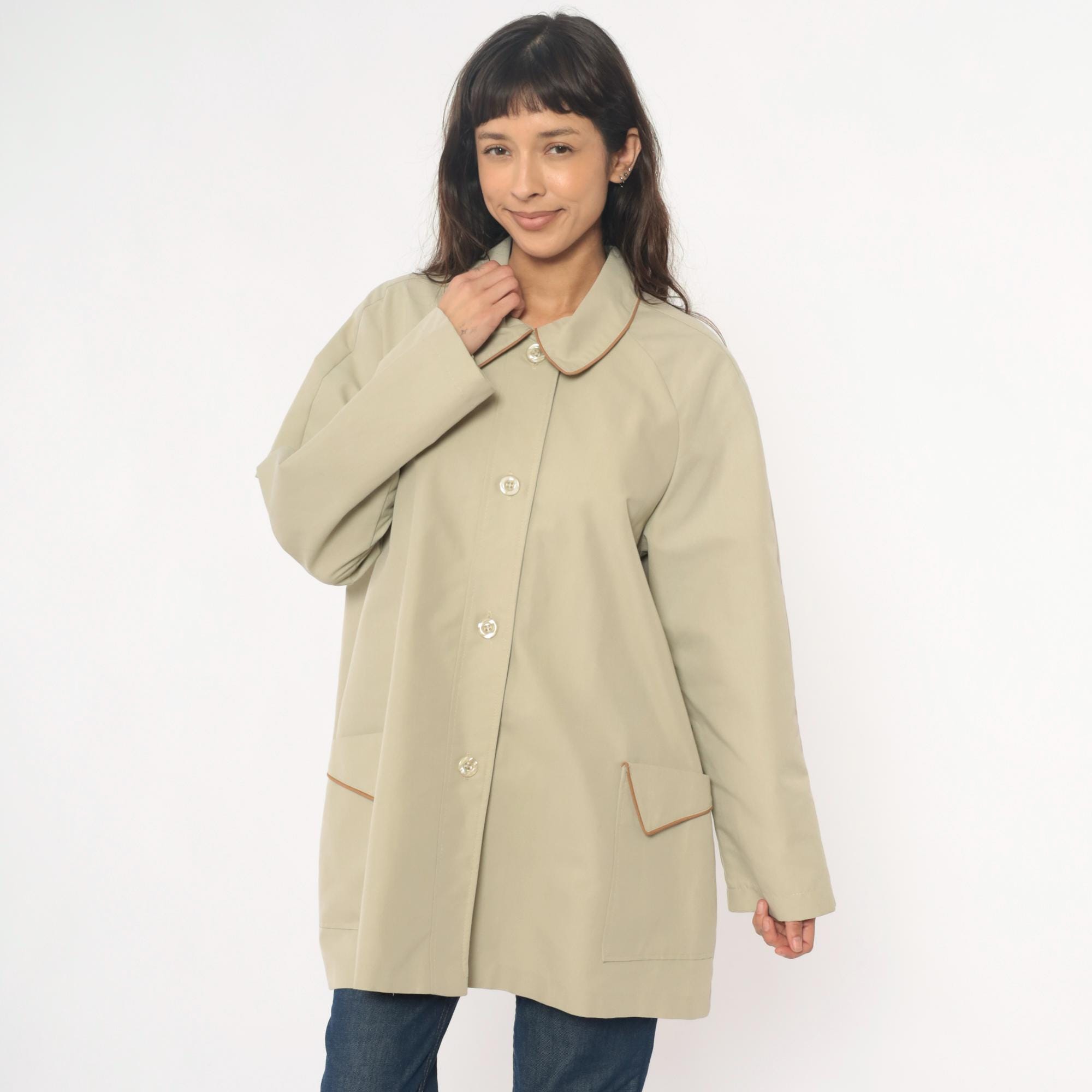 80s beige all-weather coat with brown leather piping trim along the rounded collar, pocket edges, and front placket. Button front closure with four visible buttons, two front pockets, long sleeves. Hip-length cut with brown trim detailing throughout.