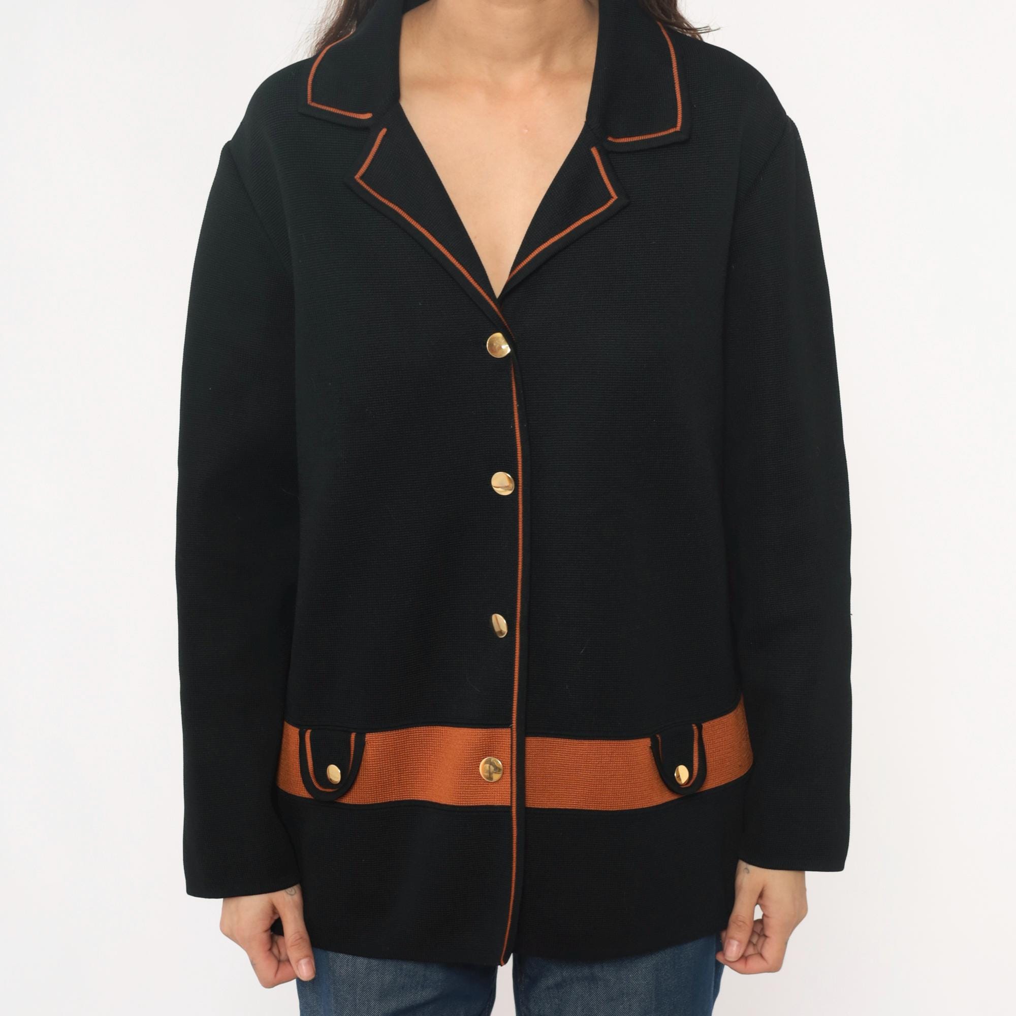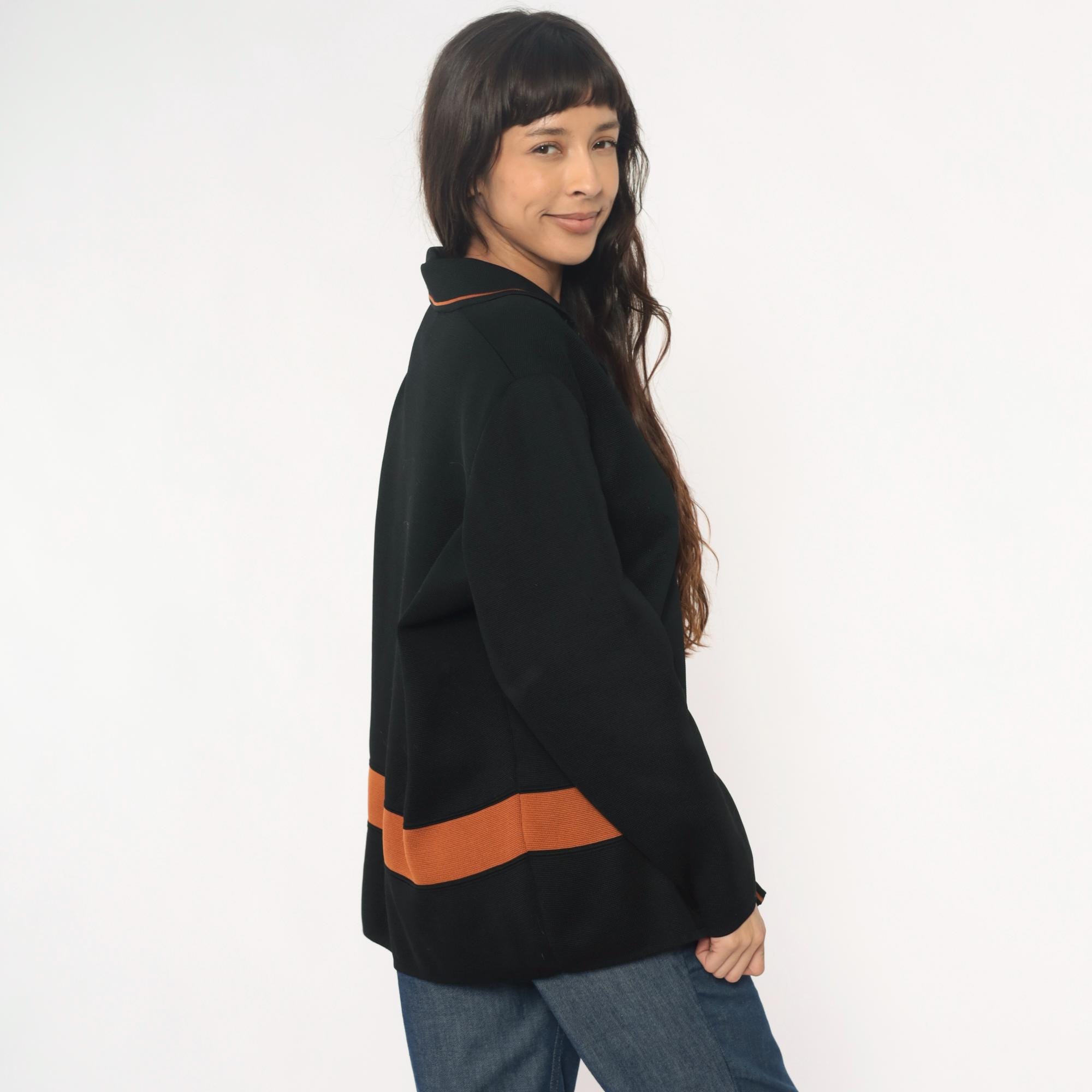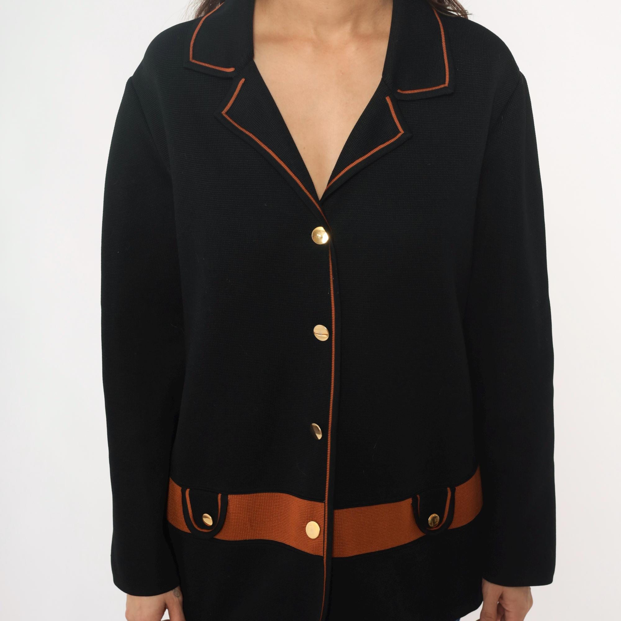 70s black blazer with rust orange contrast trim along the collar, front placket, cuffs, and hem band. Notched collar, button front closure with gold buttons, long sleeves. Orange waistband with decorative gold button tabs at front.