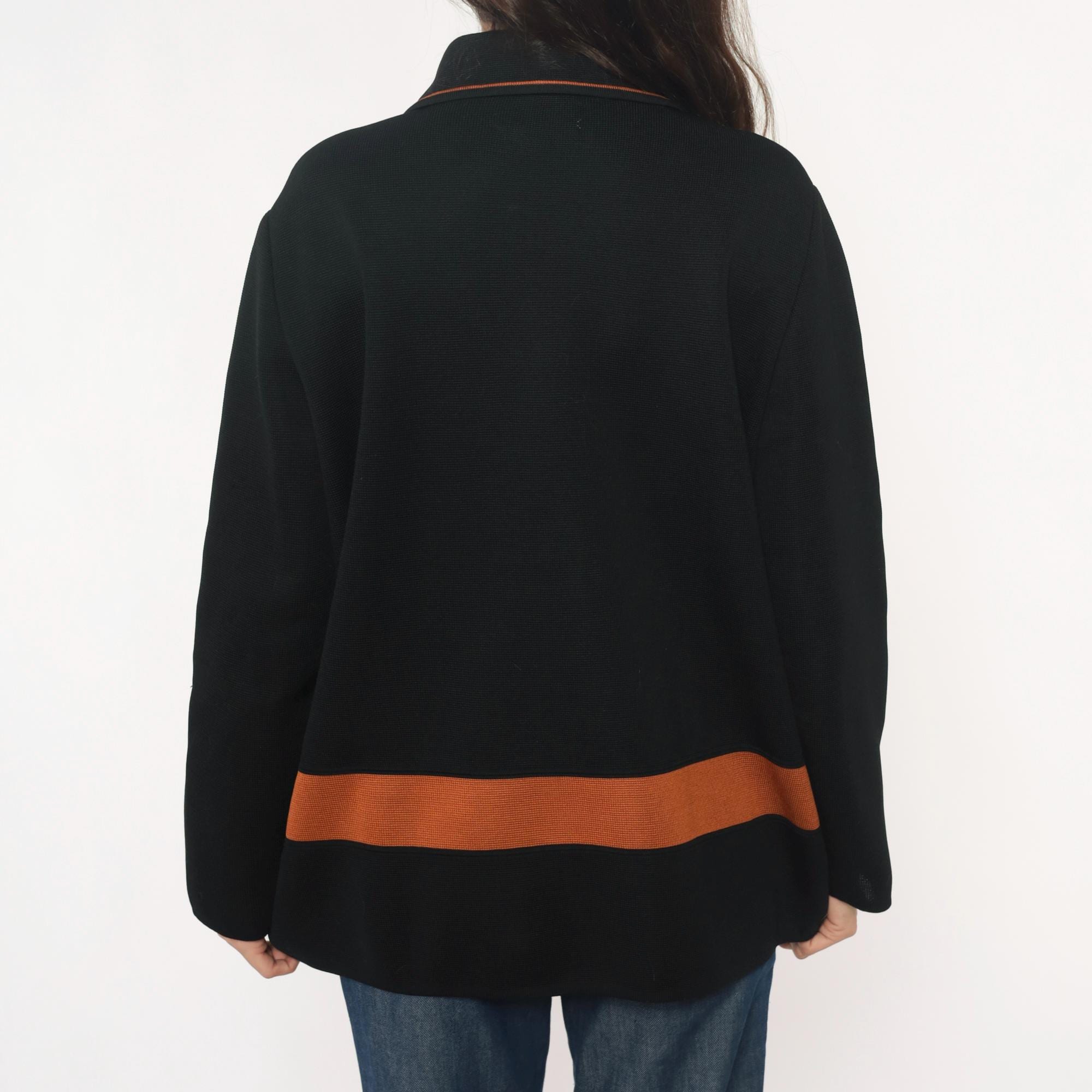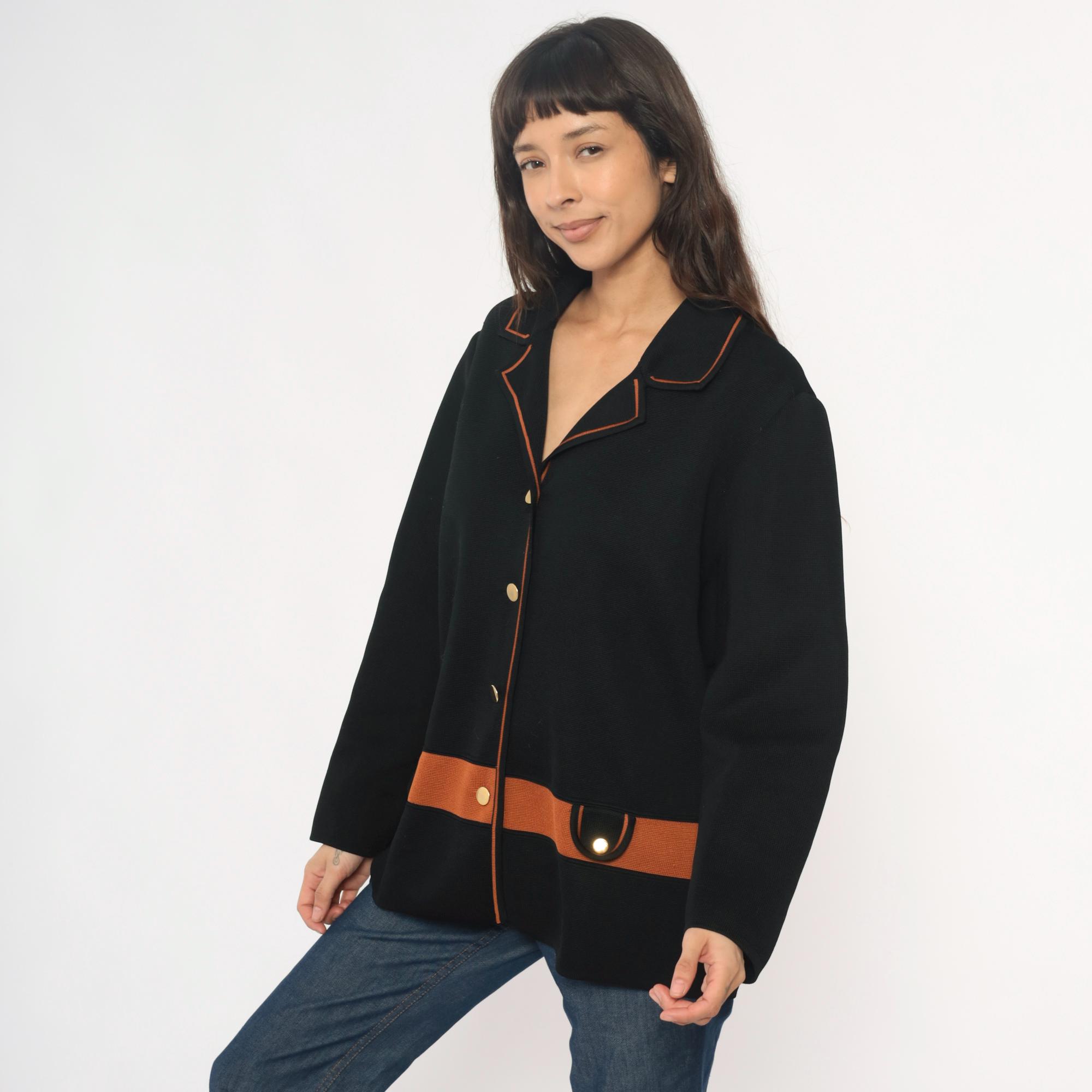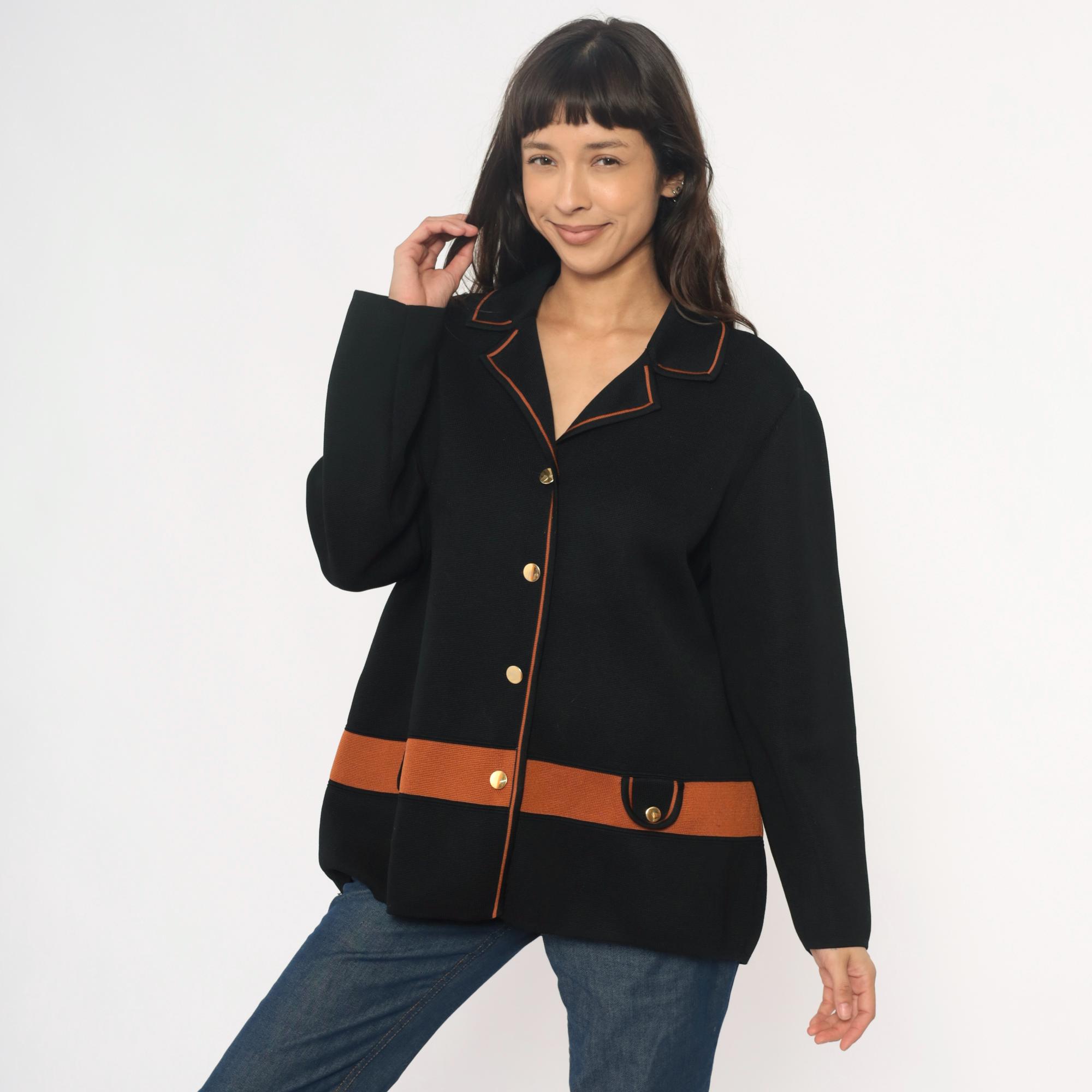 70s black blazer with rust orange contrast trim along the collar, front placket, cuffs, and hem band. Notched collar, button front closure with gold buttons, long sleeves. Orange waistband with decorative gold button tabs at front.