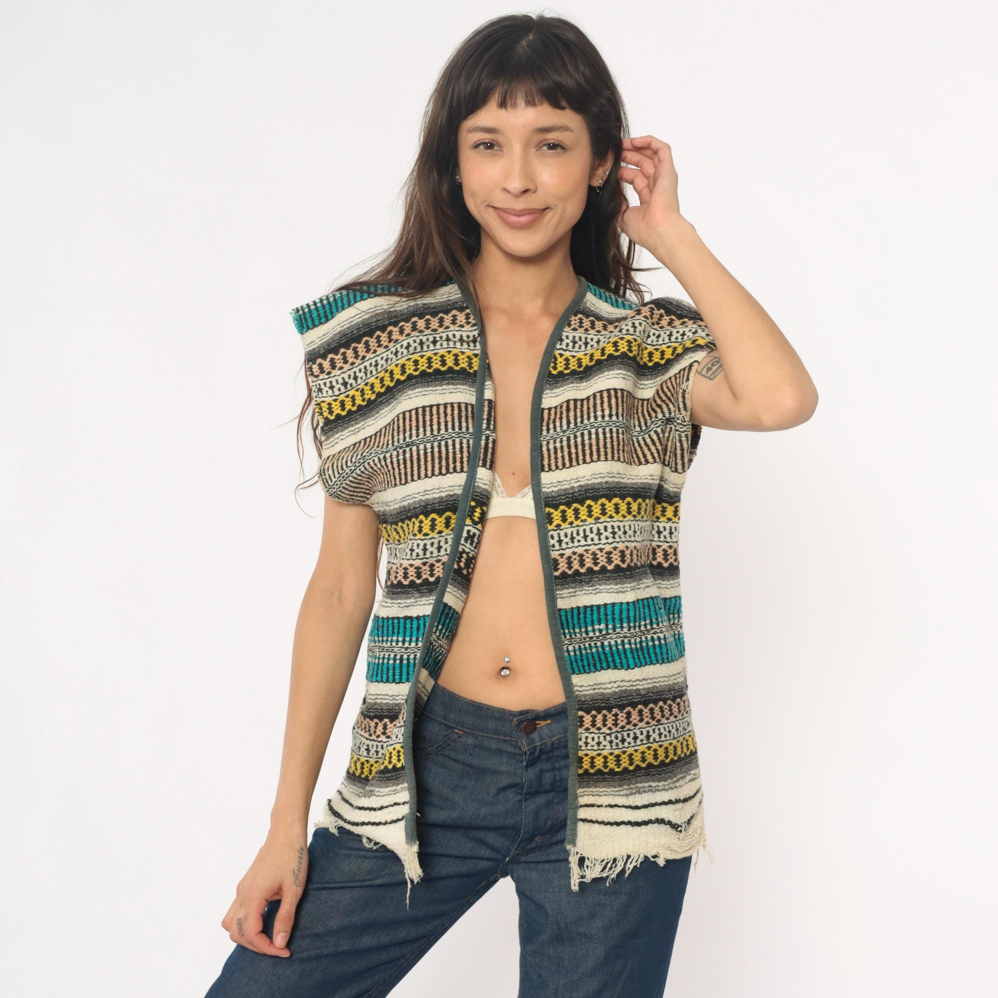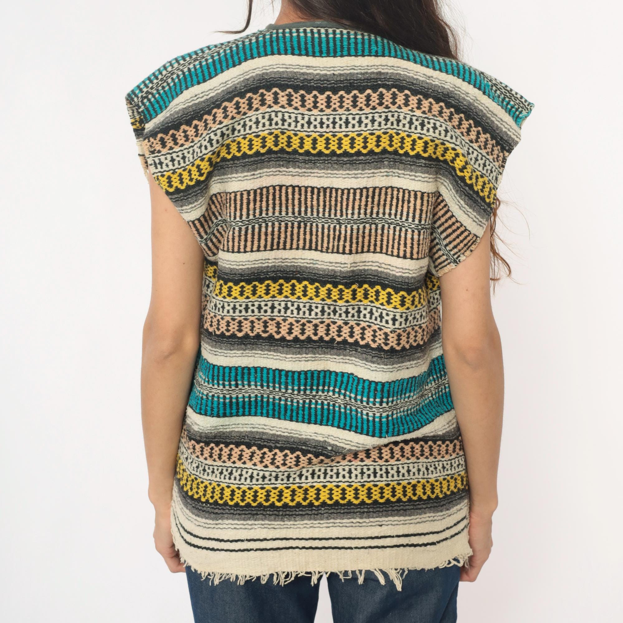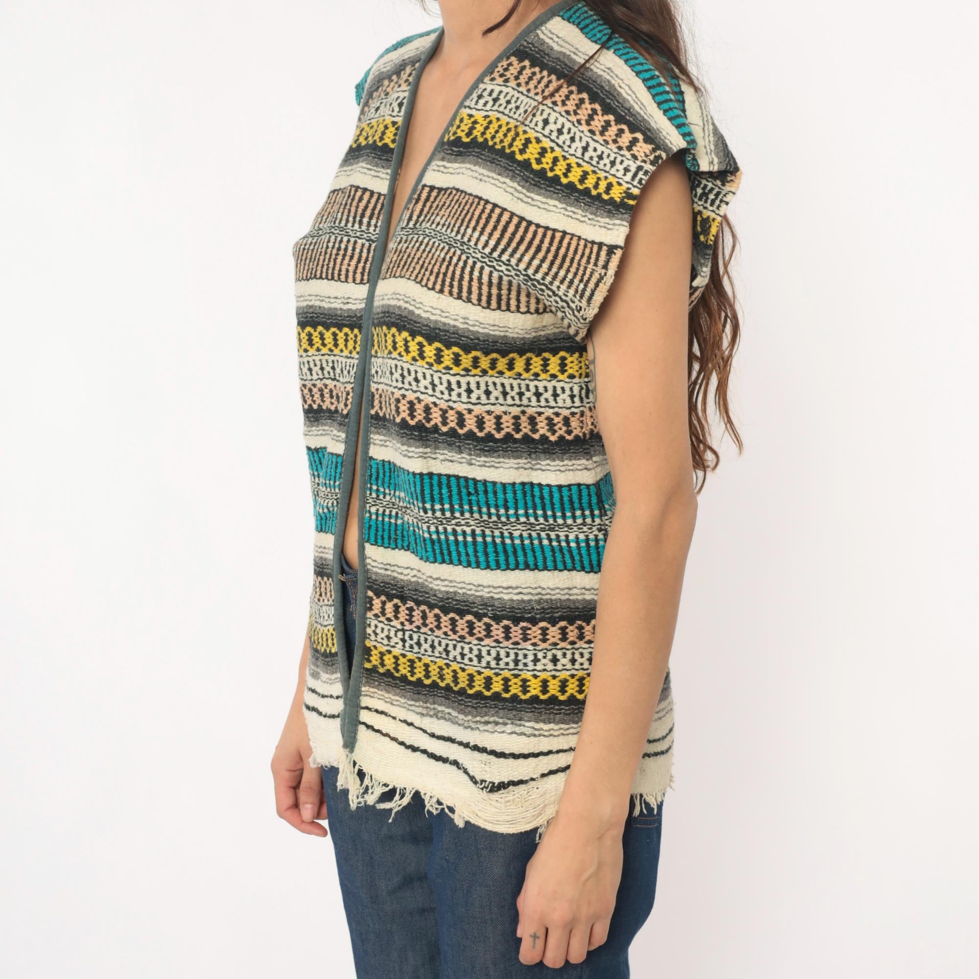 70s open front woven vest in a multicolor horizontal striped pattern with teal, turquoise, yellow, brown, black, ivory, and gray bands throughout. Cap sleeves with olive-toned fabric binding along the front edges and V-neckline, blanket-style Southwestern weave construction. Raw frayed hem along the bottom edge.