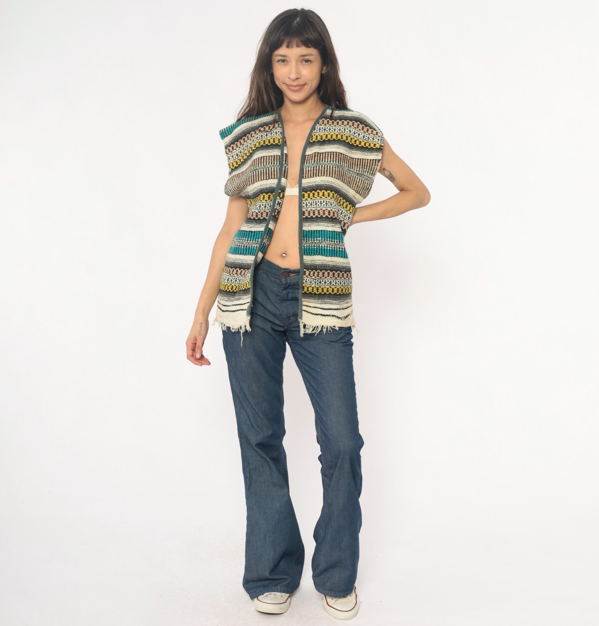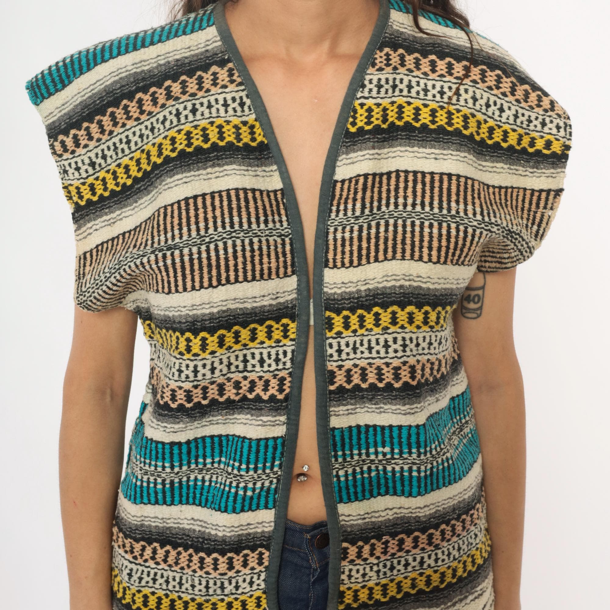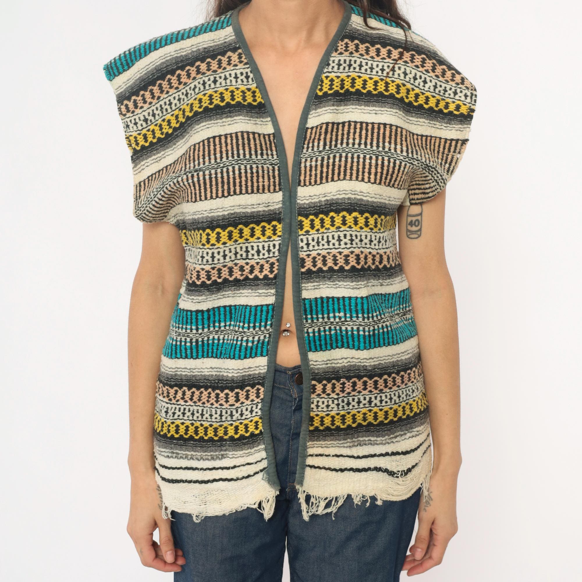 70s open front woven vest in a multicolor horizontal striped pattern with teal, turquoise, yellow, brown, black, ivory, and gray bands throughout. Cap sleeves with olive-toned fabric binding along the front edges and V-neckline, blanket-style Southwestern weave construction. Raw frayed hem along the bottom edge.